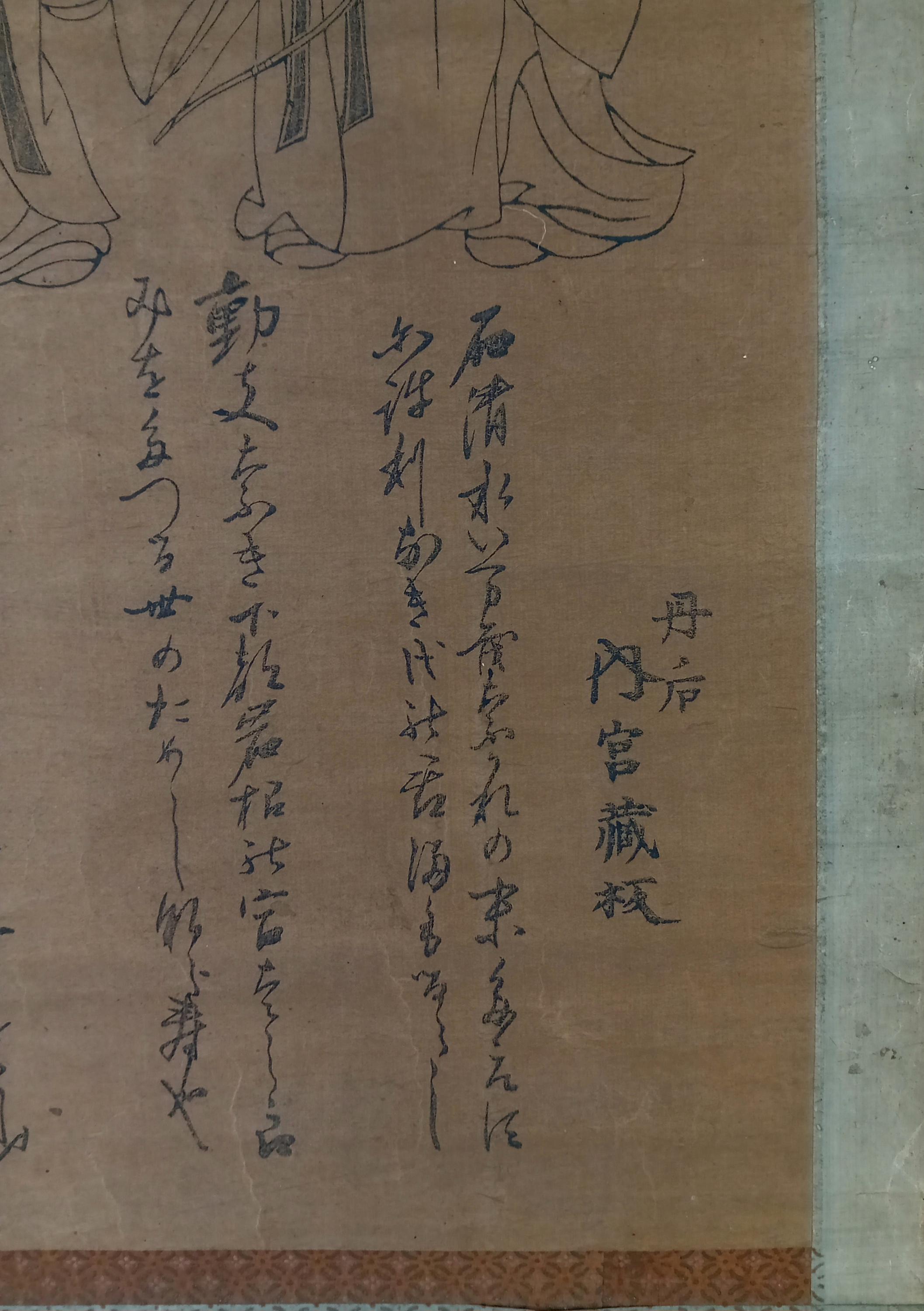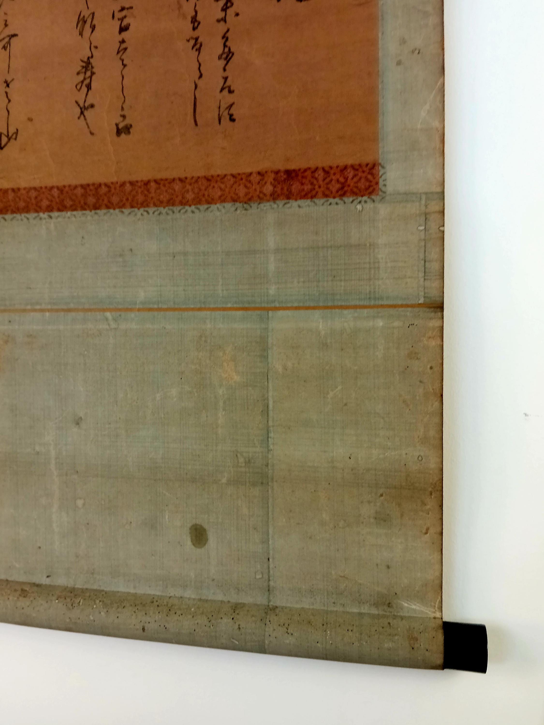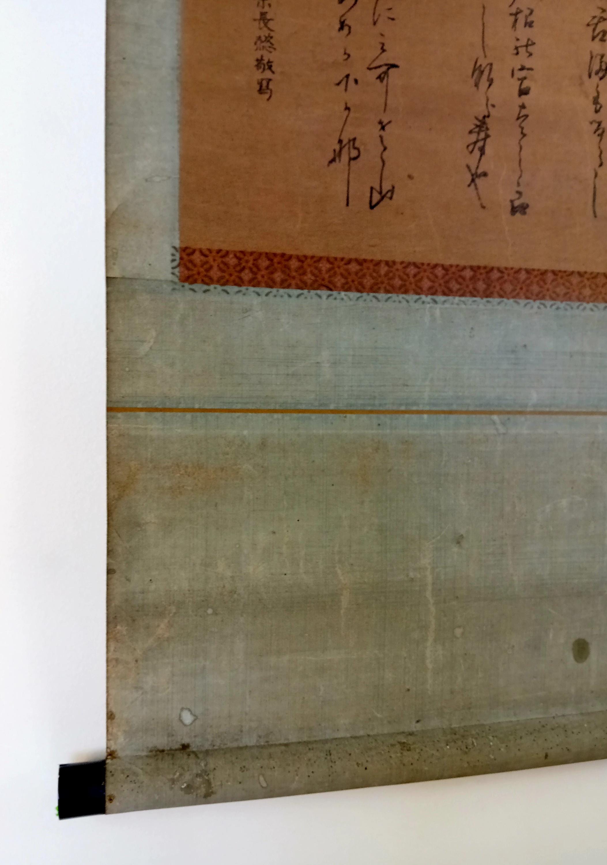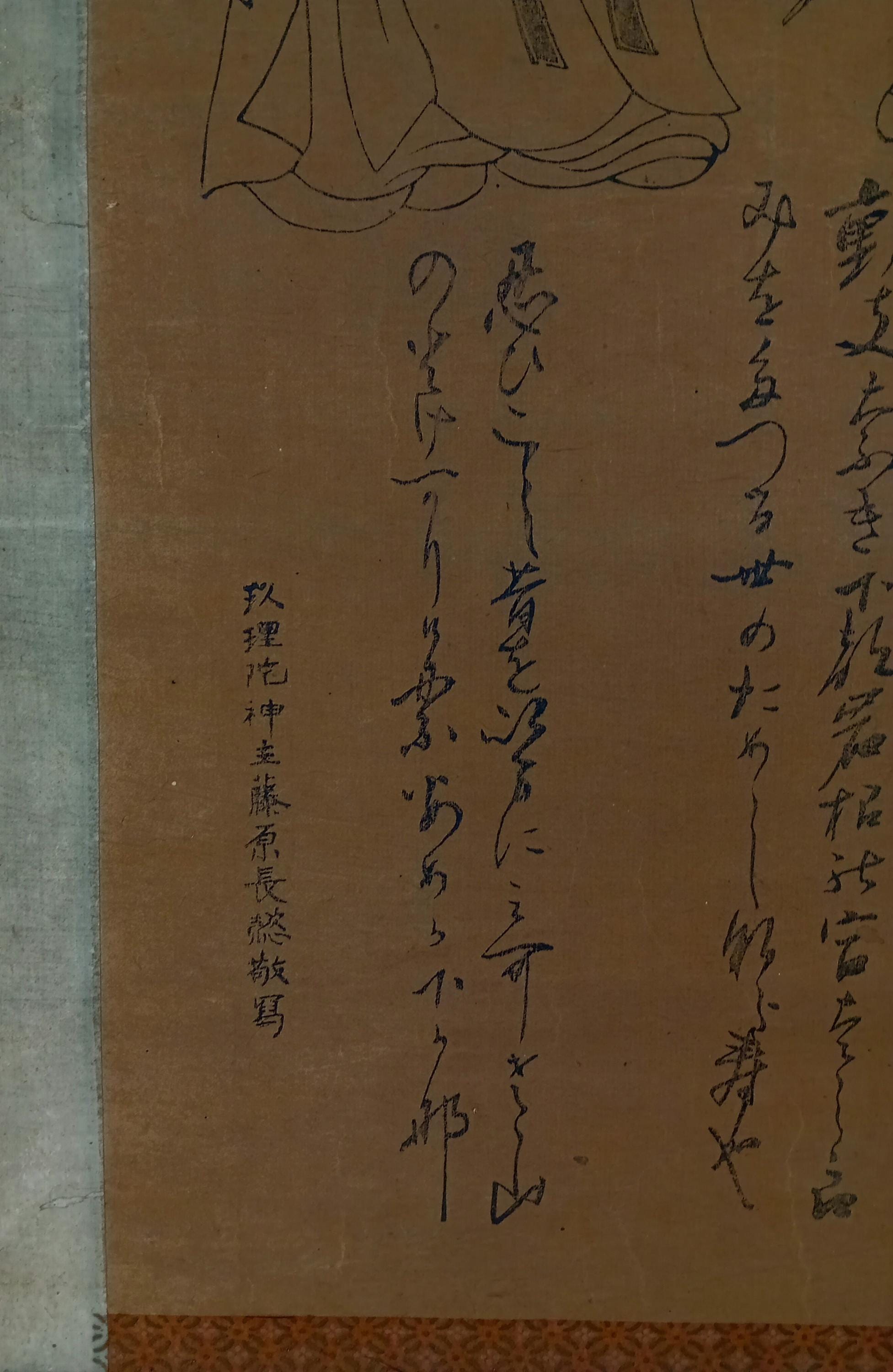 The scroll is signed by Fujiwara no Nagatsuna, chief priest (kamunushi) of the Kumin Shrine in Tanba province.