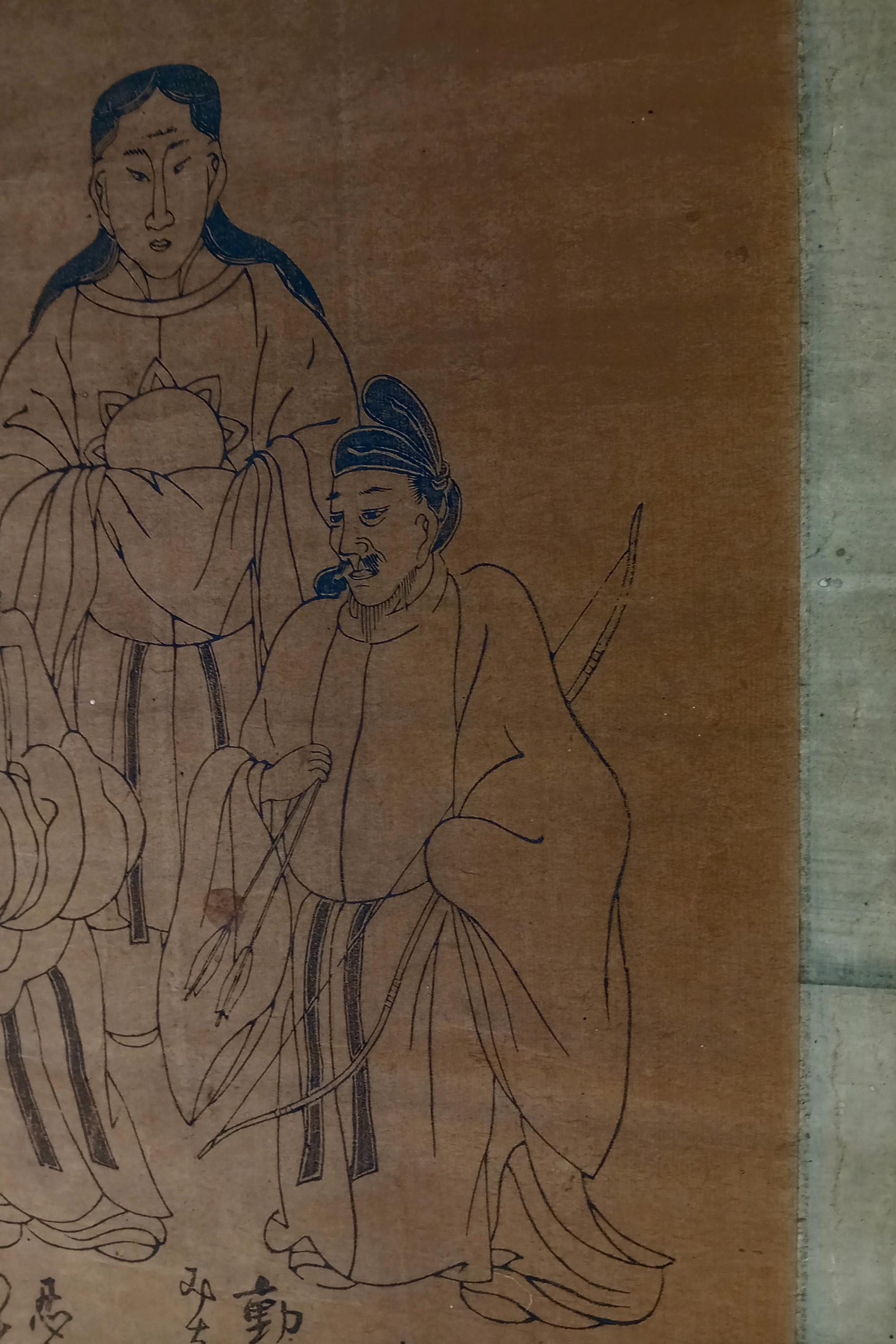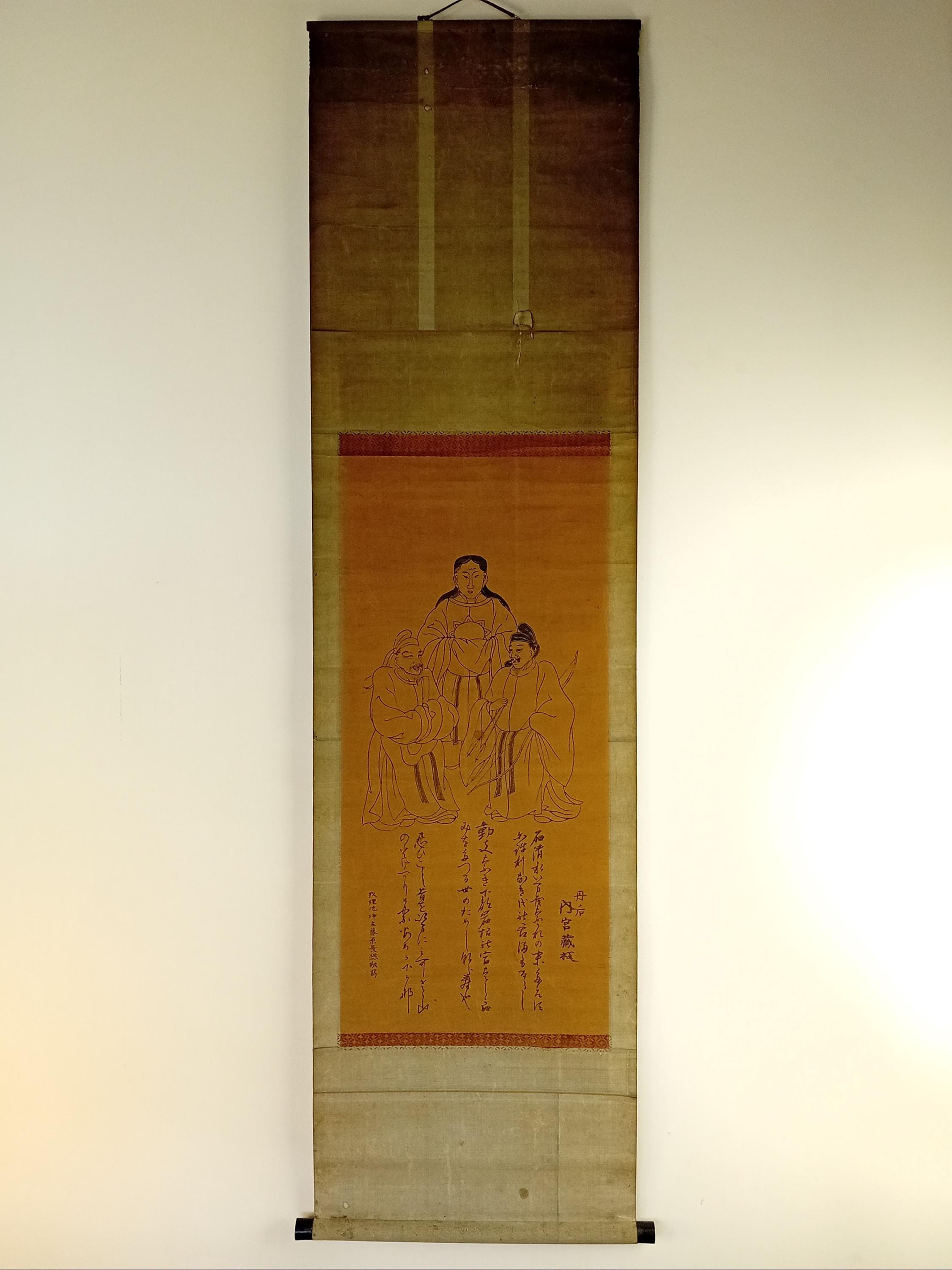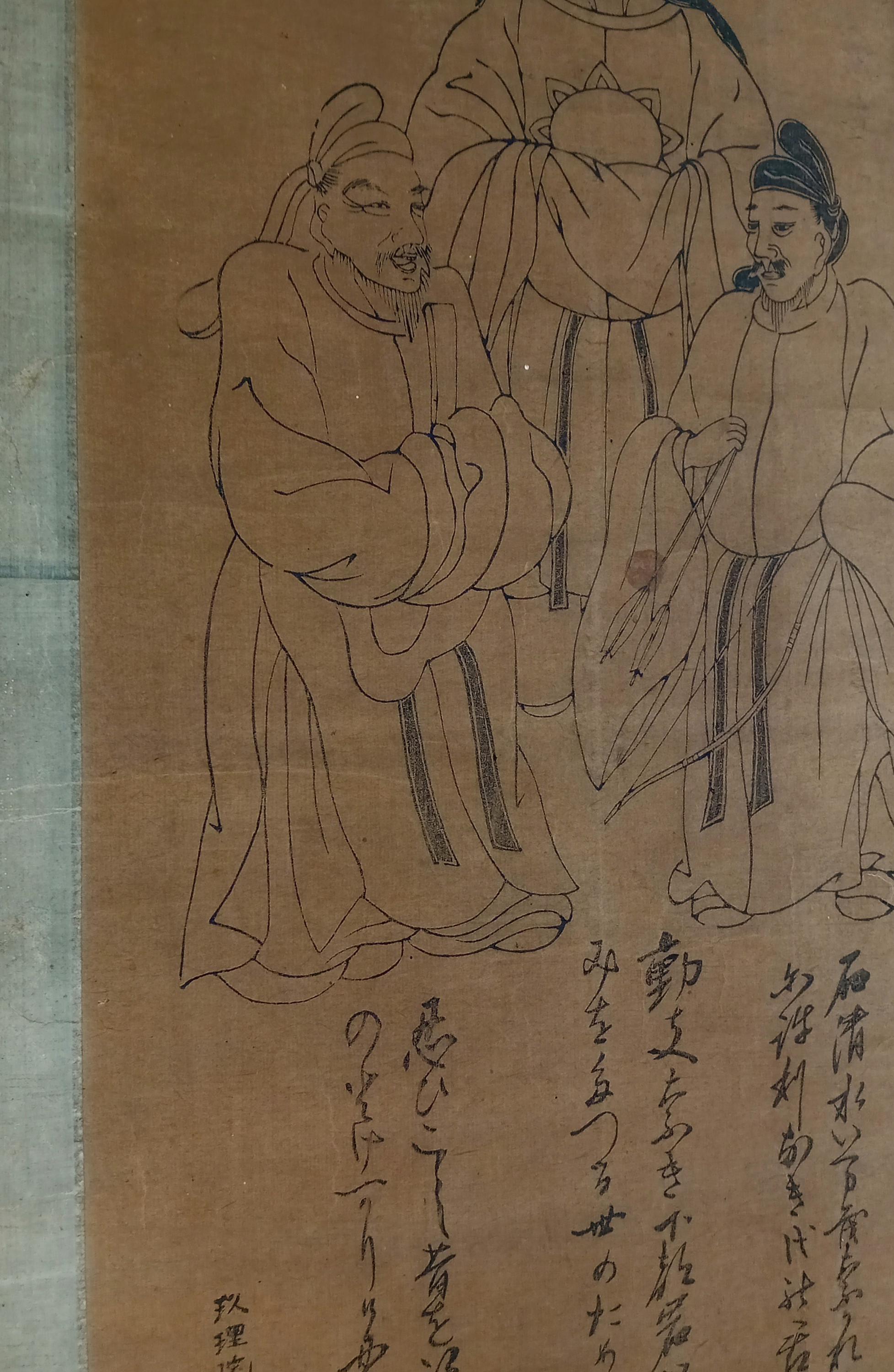 A rare and powerful devotional scroll from the late Edo period, depicting a sacred triad: a central deity, flanked by a wise elder and a warrior. Drawn in expressive ink lines on handmade Japanese washi paper, the scene reflects the harmony of divine order, wisdom, and strength.