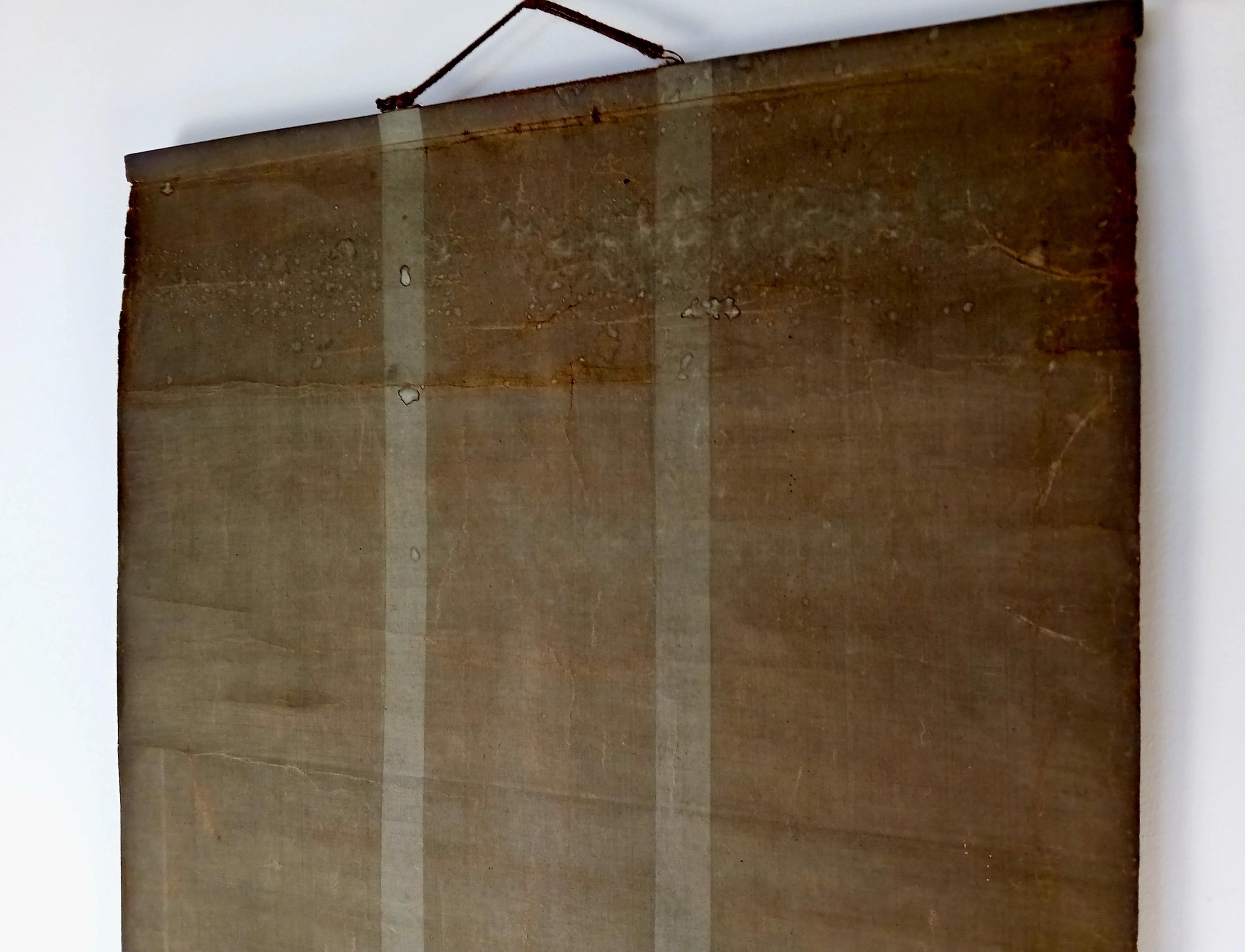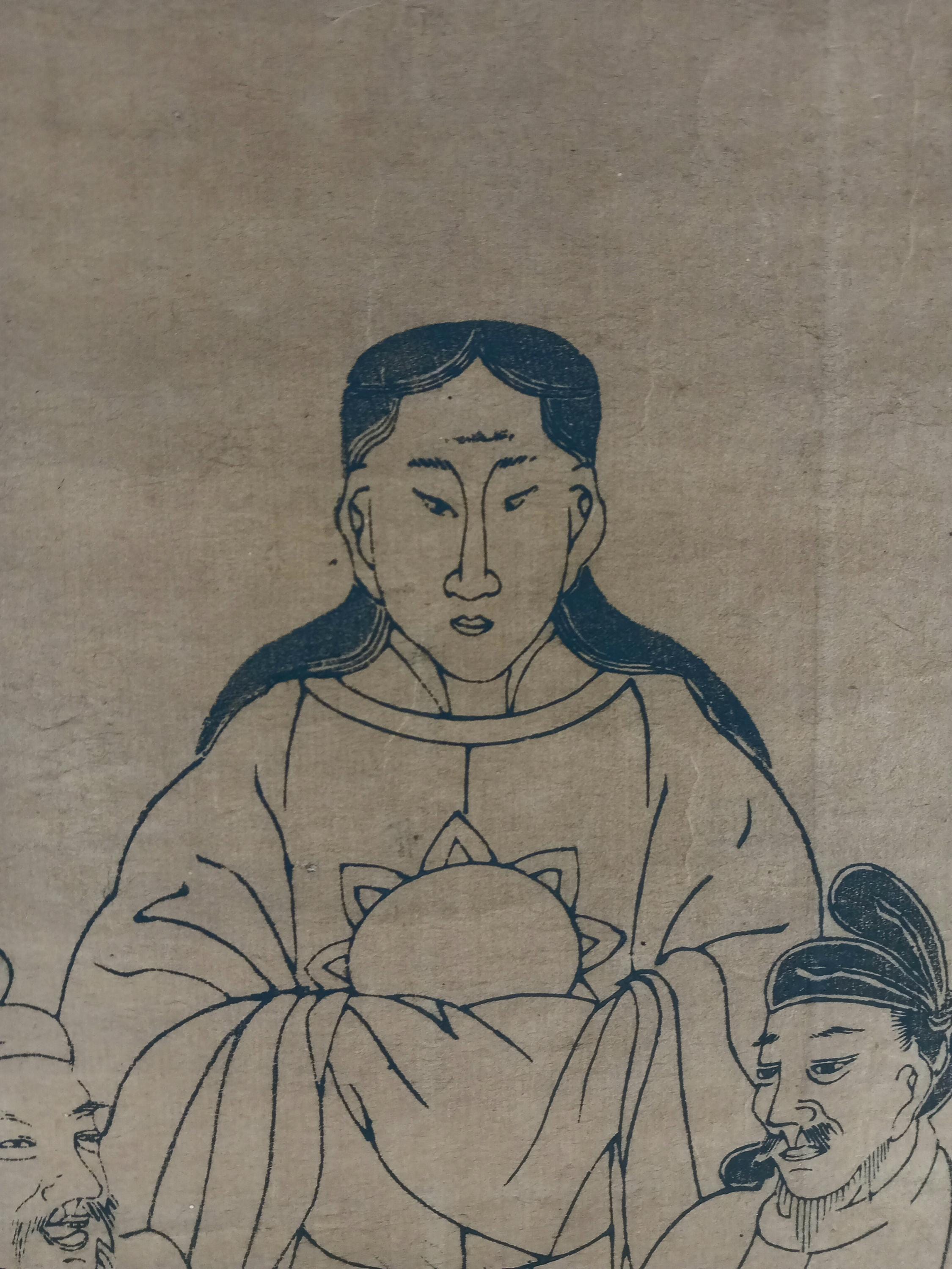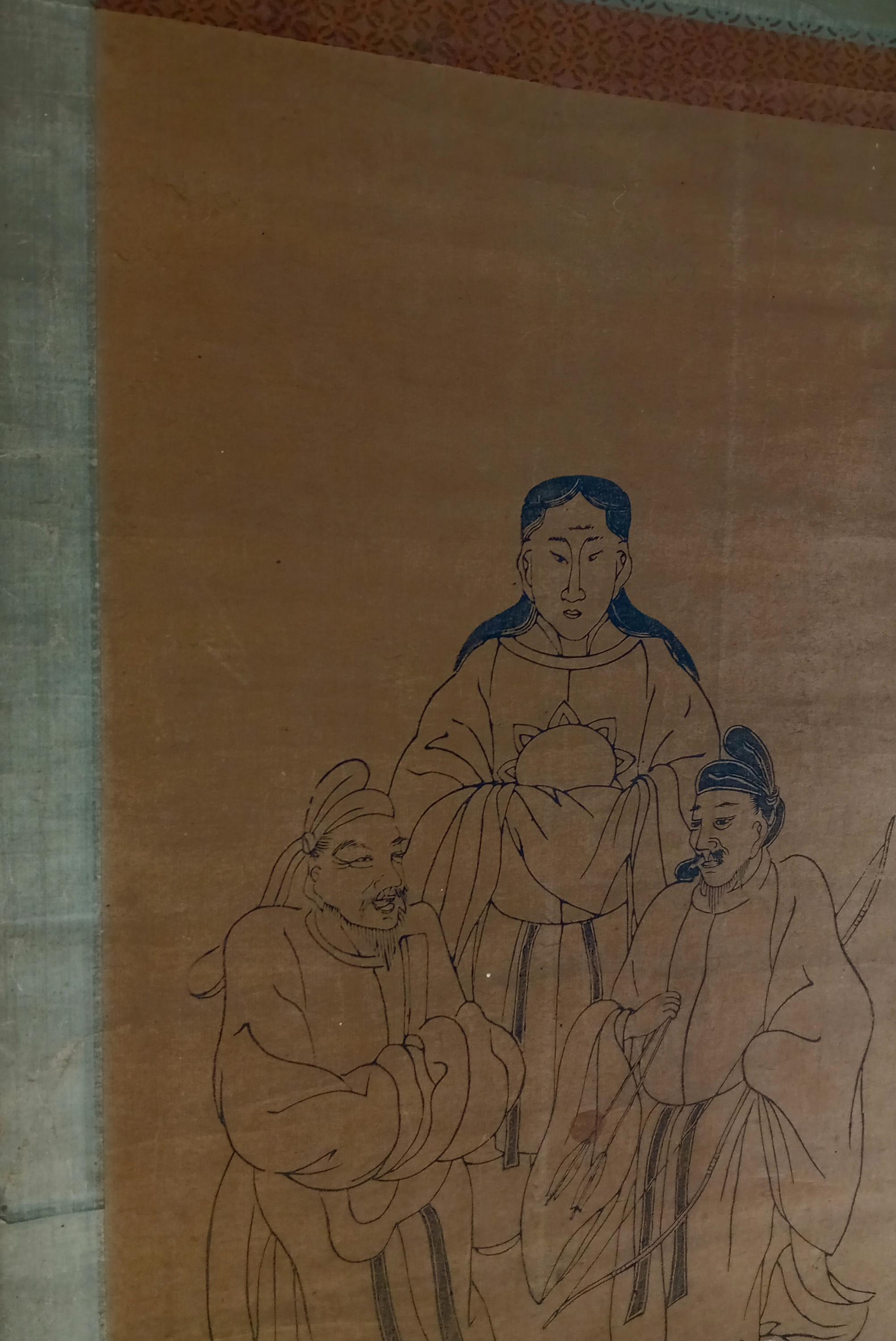 A rare and powerful devotional scroll from the late Edo period, depicting a sacred triad: a central deity, flanked by a wise elder and a warrior. Drawn in expressive ink lines on handmade Japanese washi paper, the scene reflects the harmony of divine order, wisdom, and strength.