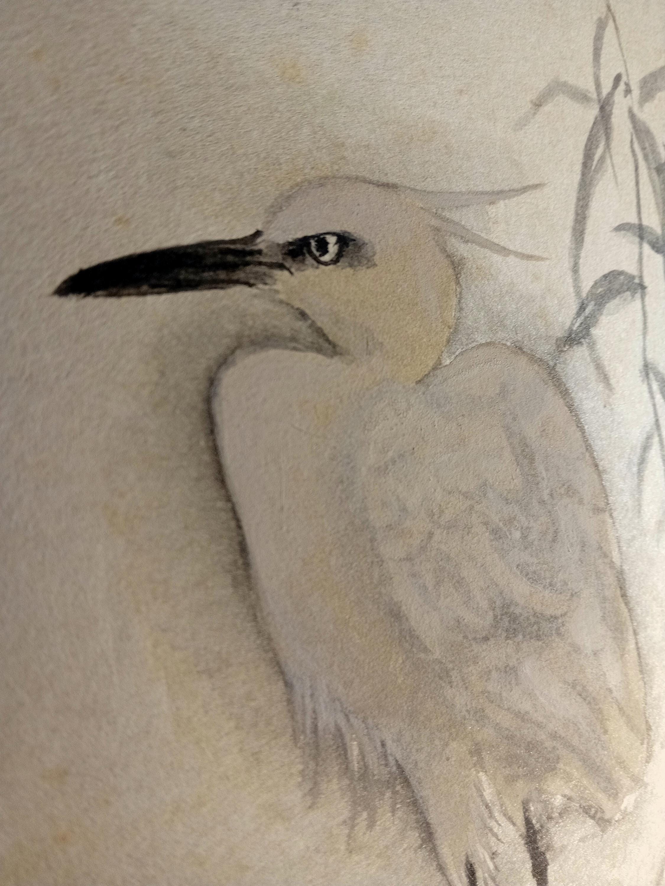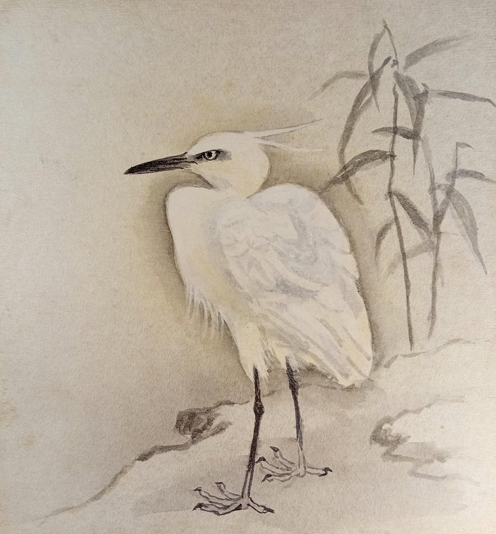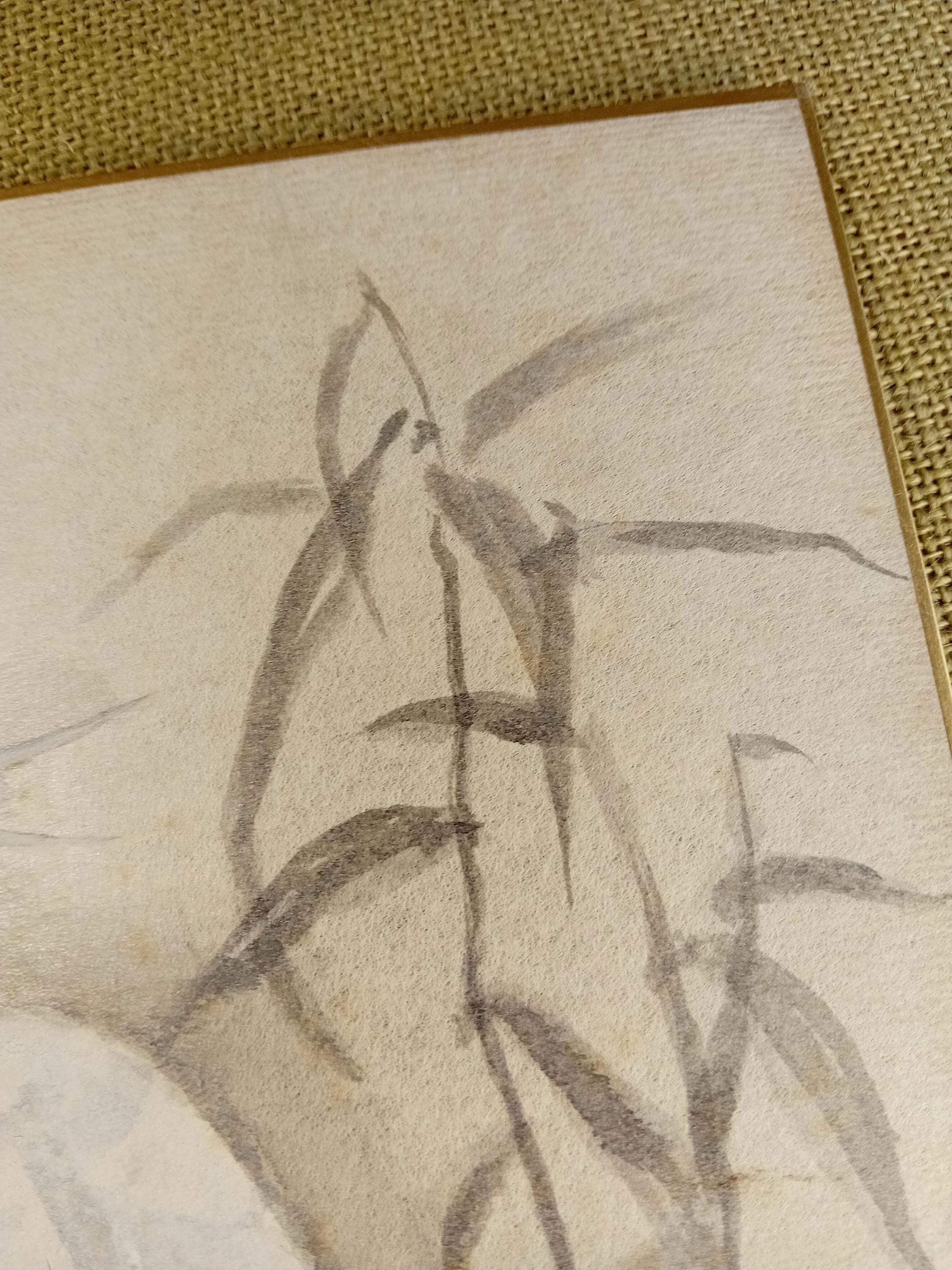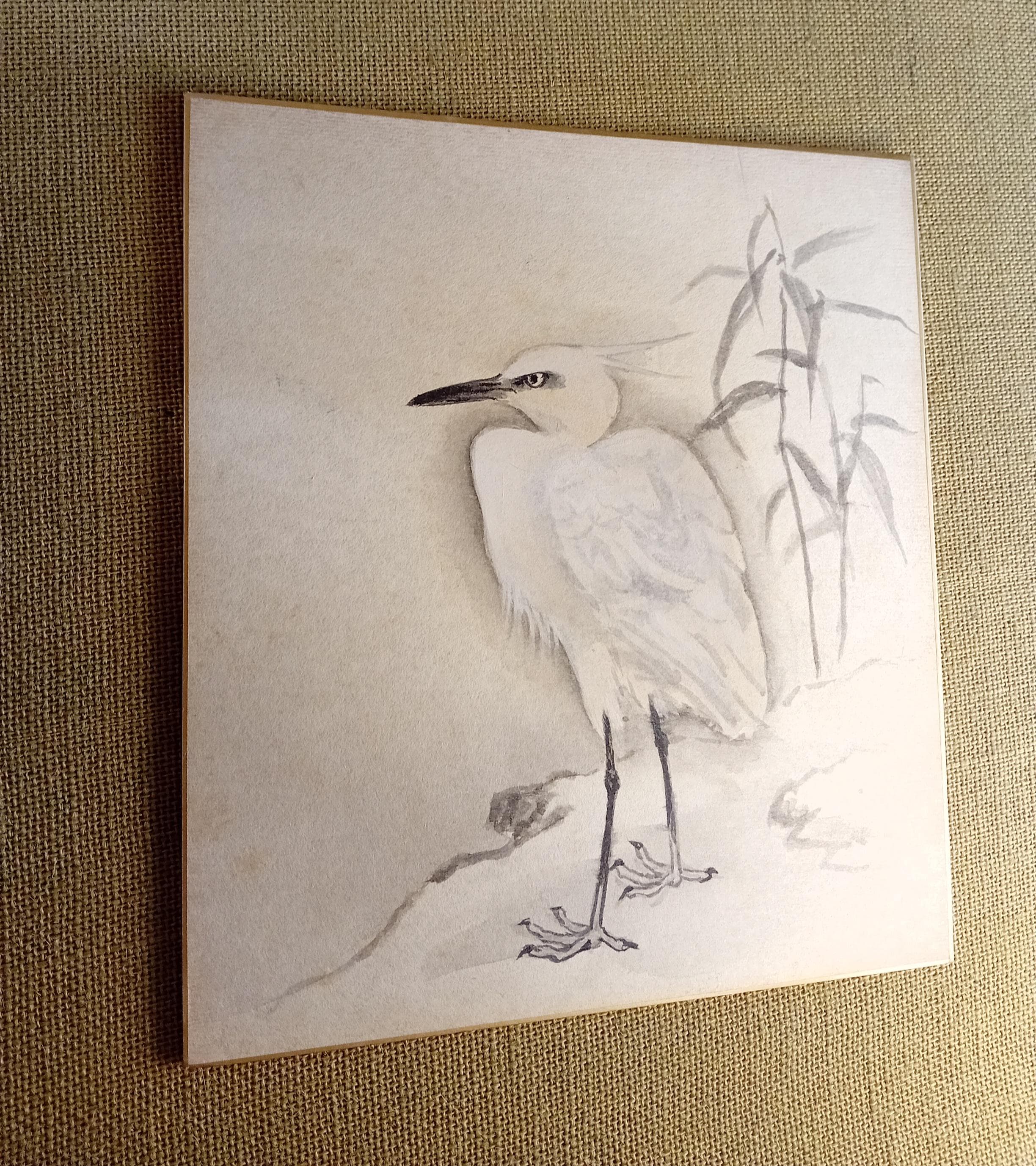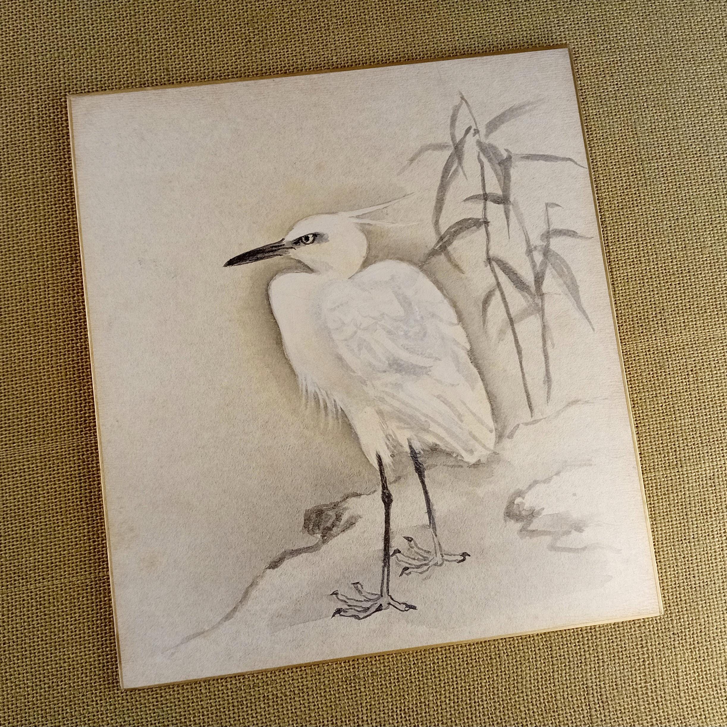 Vintage Japanese shikishi painted in ink during the Shōwa period. The composition follows the suibokuga tradition: soft grey–black ink, clear lines and a calm tonal balance creating a sense of quiet presence.