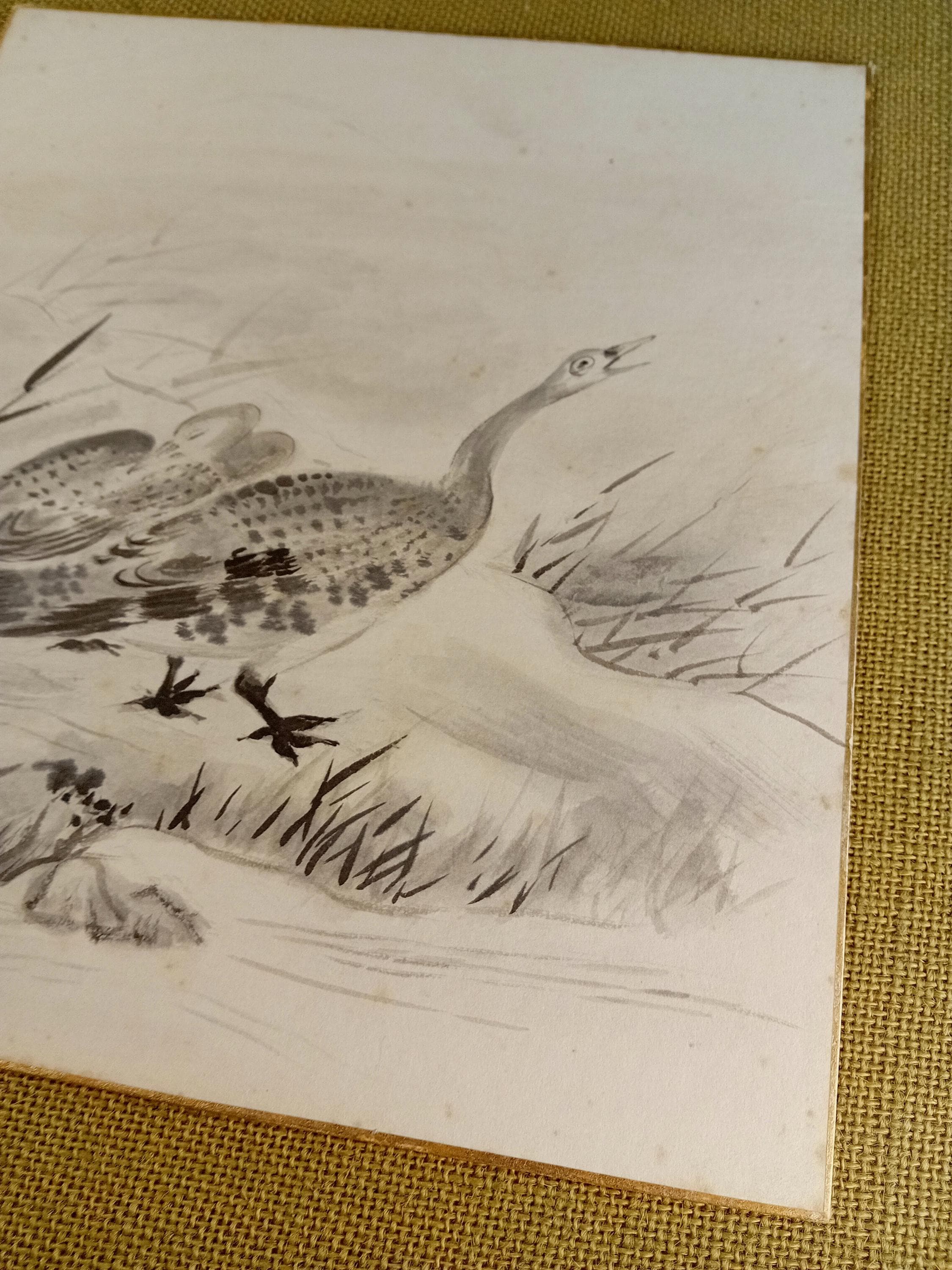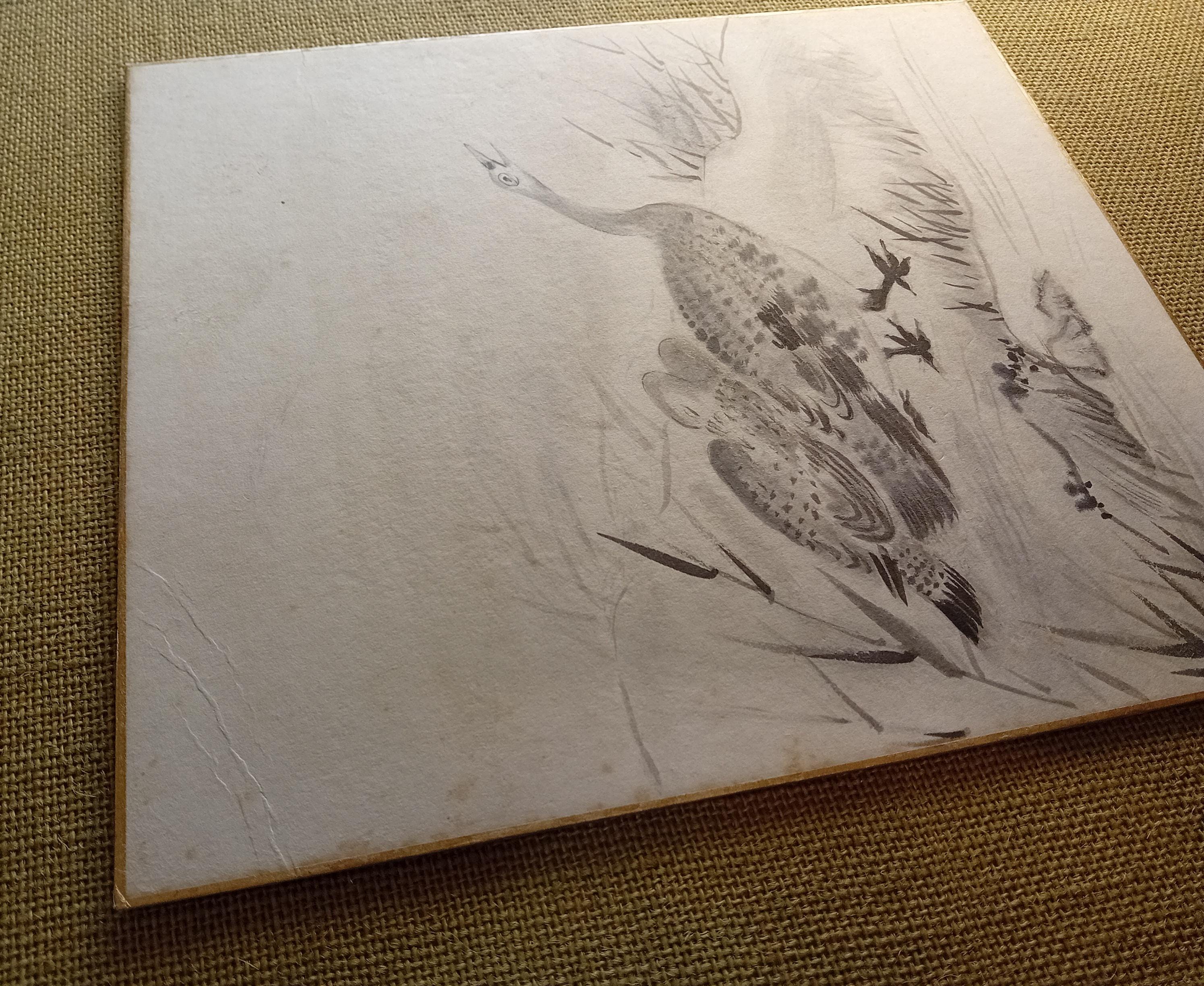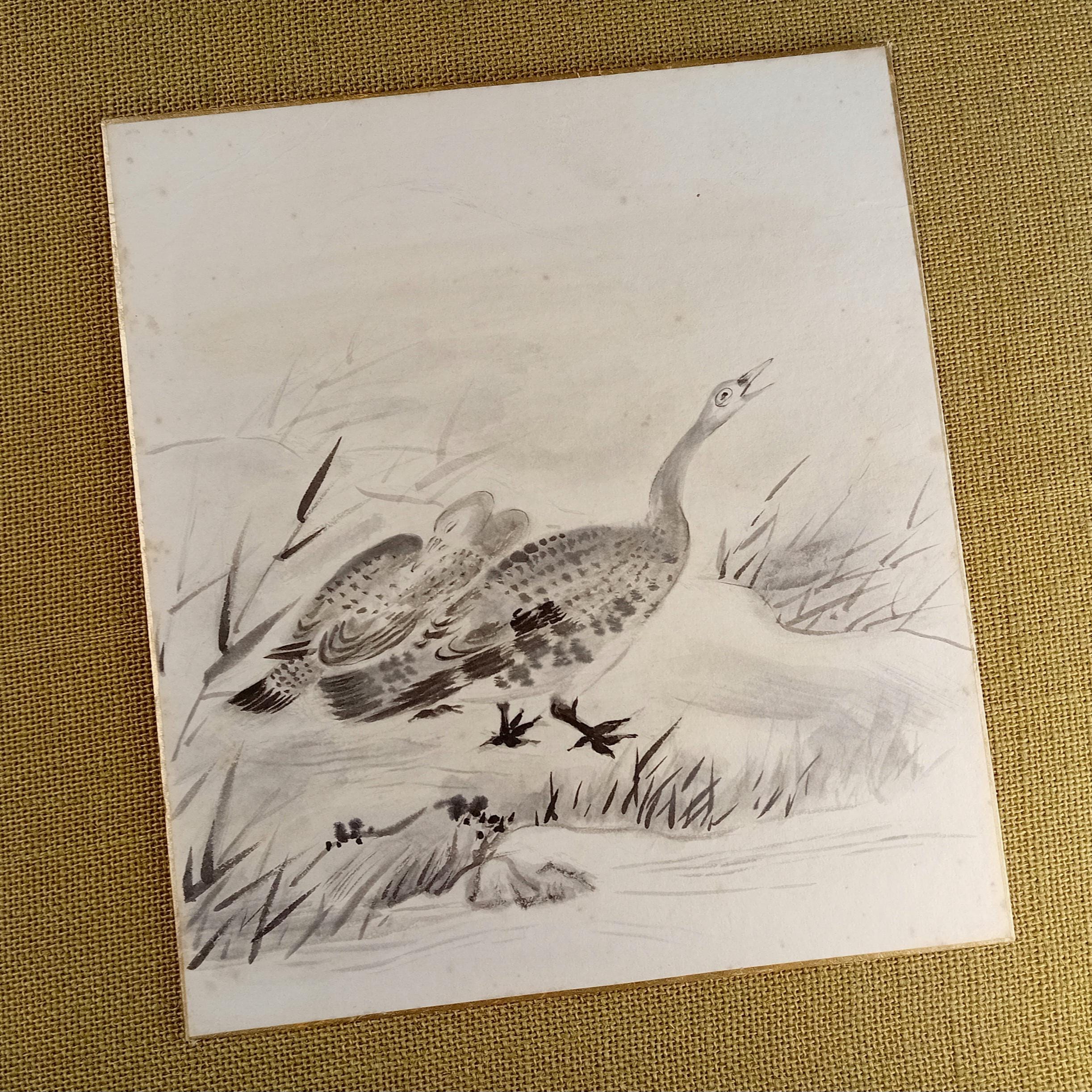 Vintage Japanese shikishi painted in ink during the Shōwa period. The work depicts a goose in a quiet landscape, rendered with soft gradations of sumi ink and characteristic Shōwa brushwork. Traditional shikishi board with gold edging.
