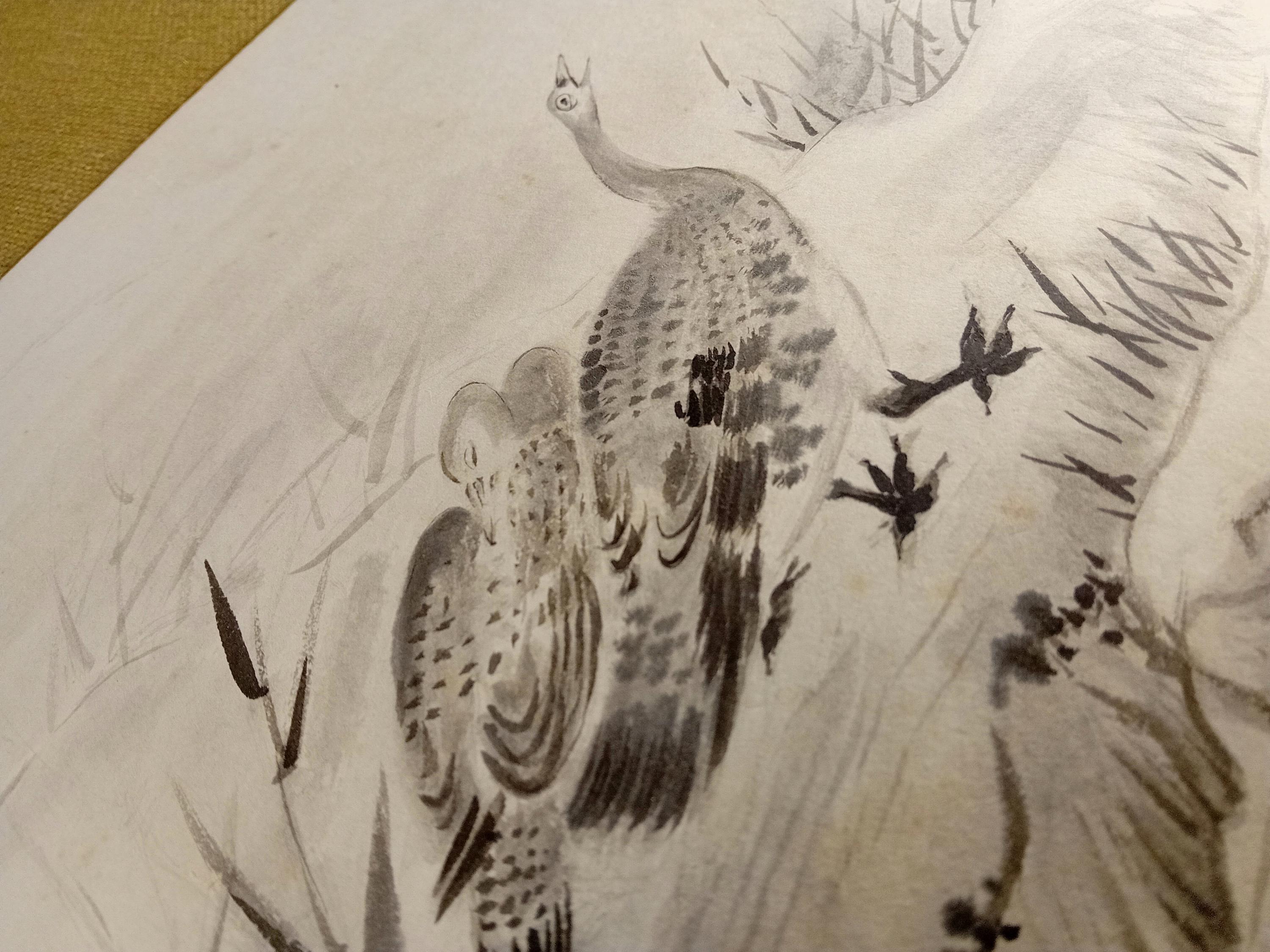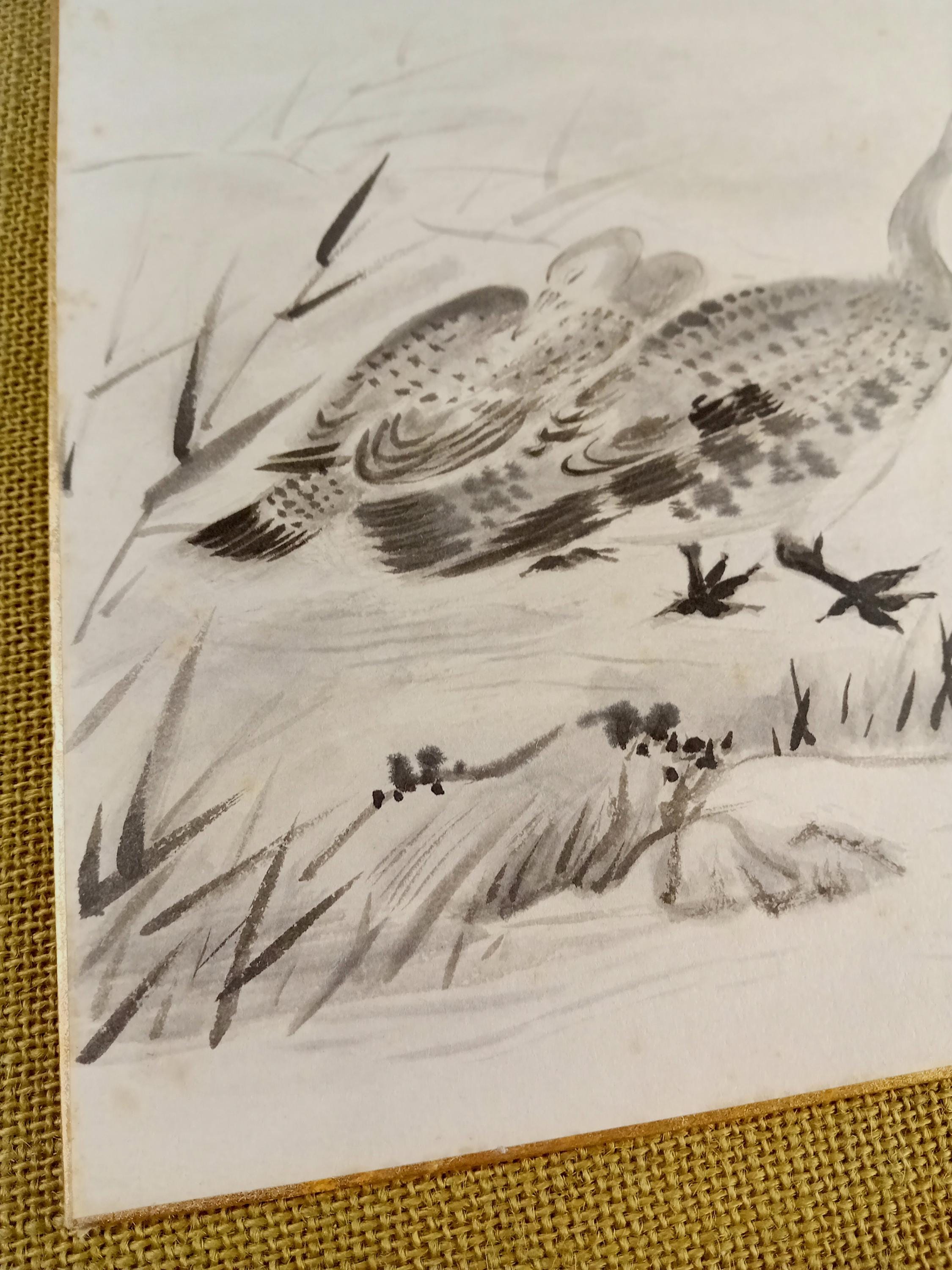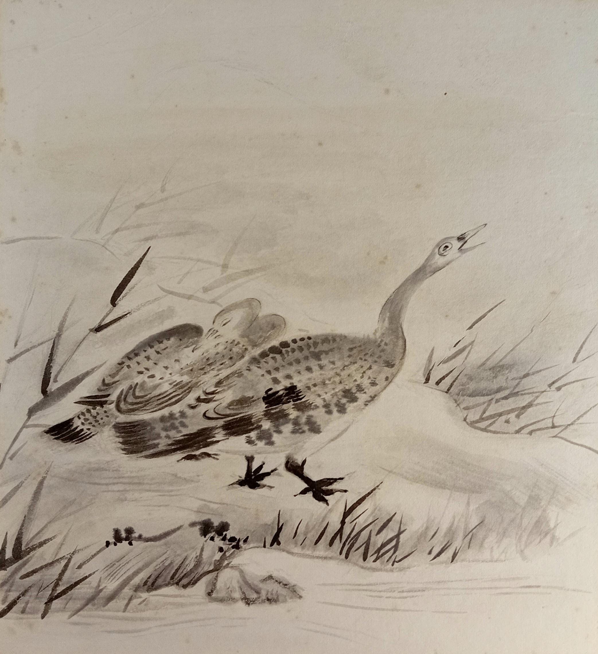 Vintage Japanese shikishi painted in ink during the Shōwa period. The work depicts a goose in a quiet landscape, rendered with soft gradations of sumi ink and characteristic Shōwa brushwork. Traditional shikishi board with gold edging.
