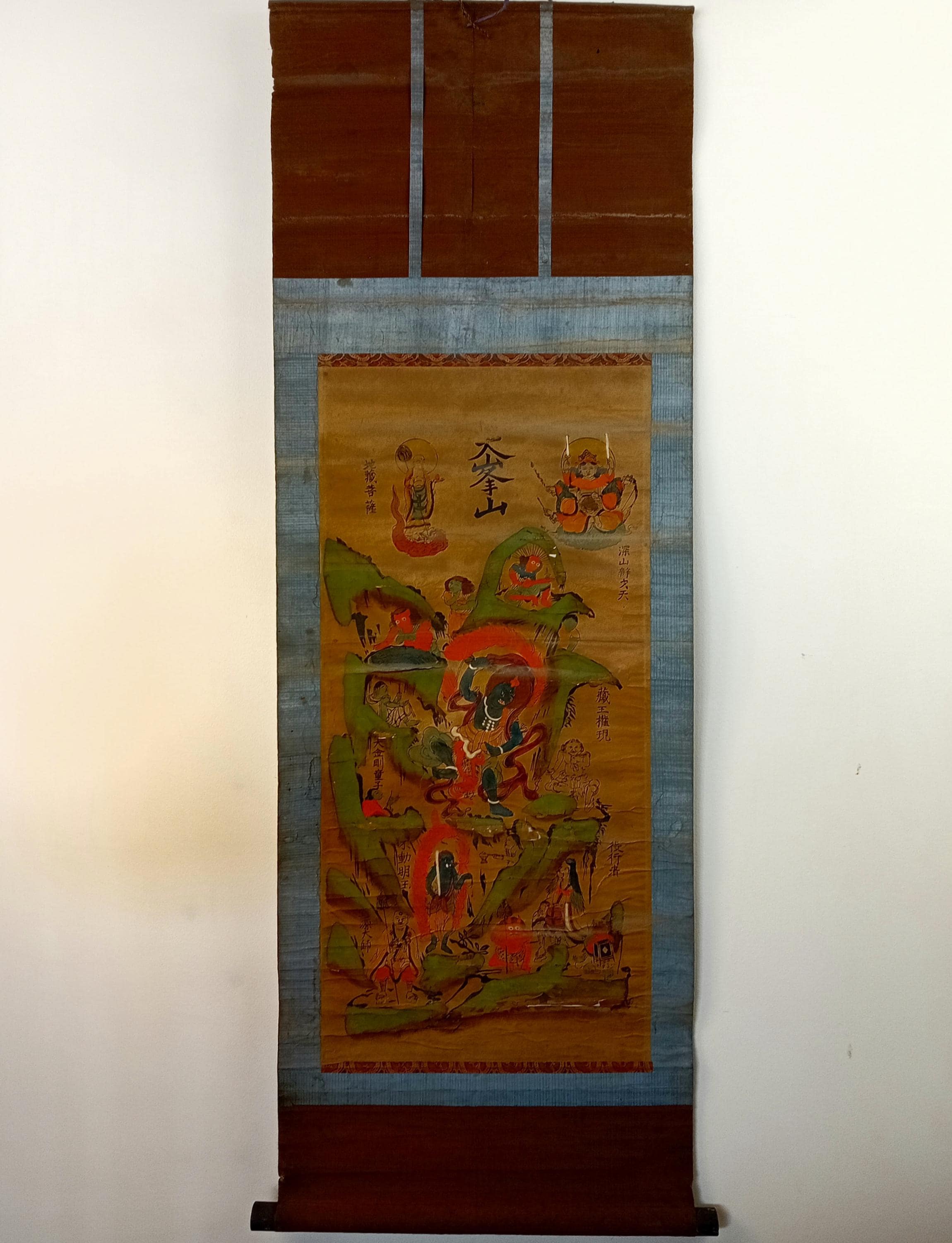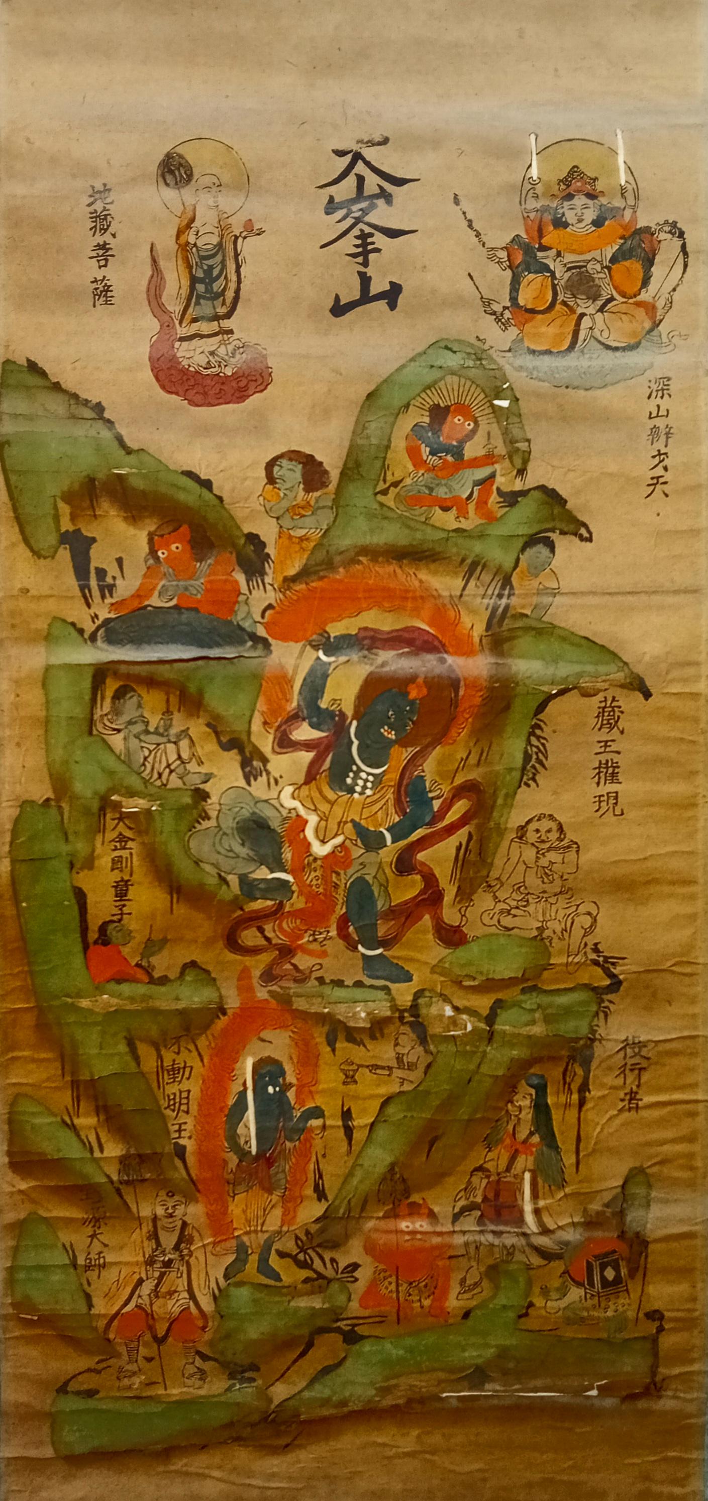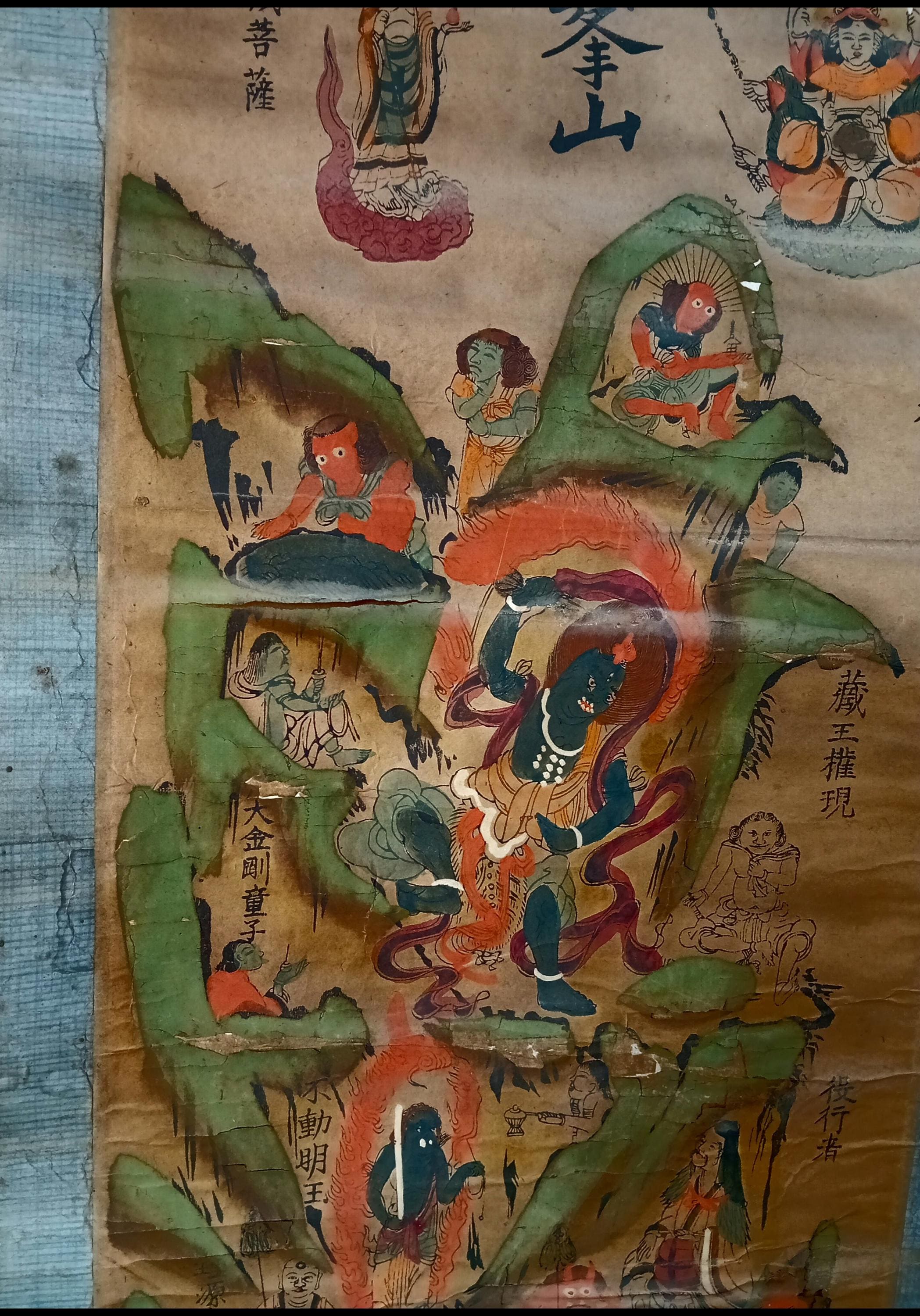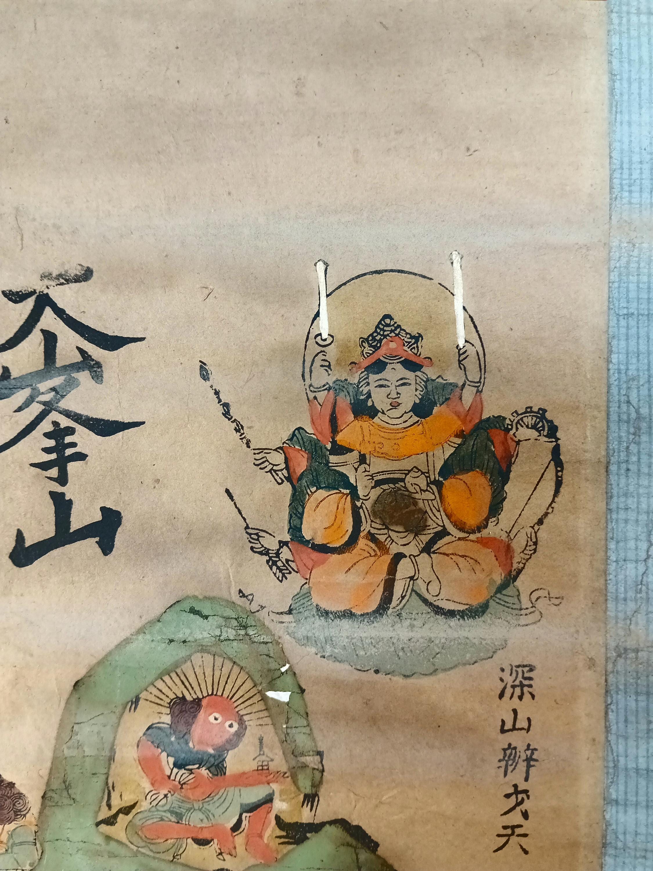 Antique Japanese hanging scroll (kakejiku), depicting the sacred mountain Ōmine (大峯山) and the Shugendō pantheon.