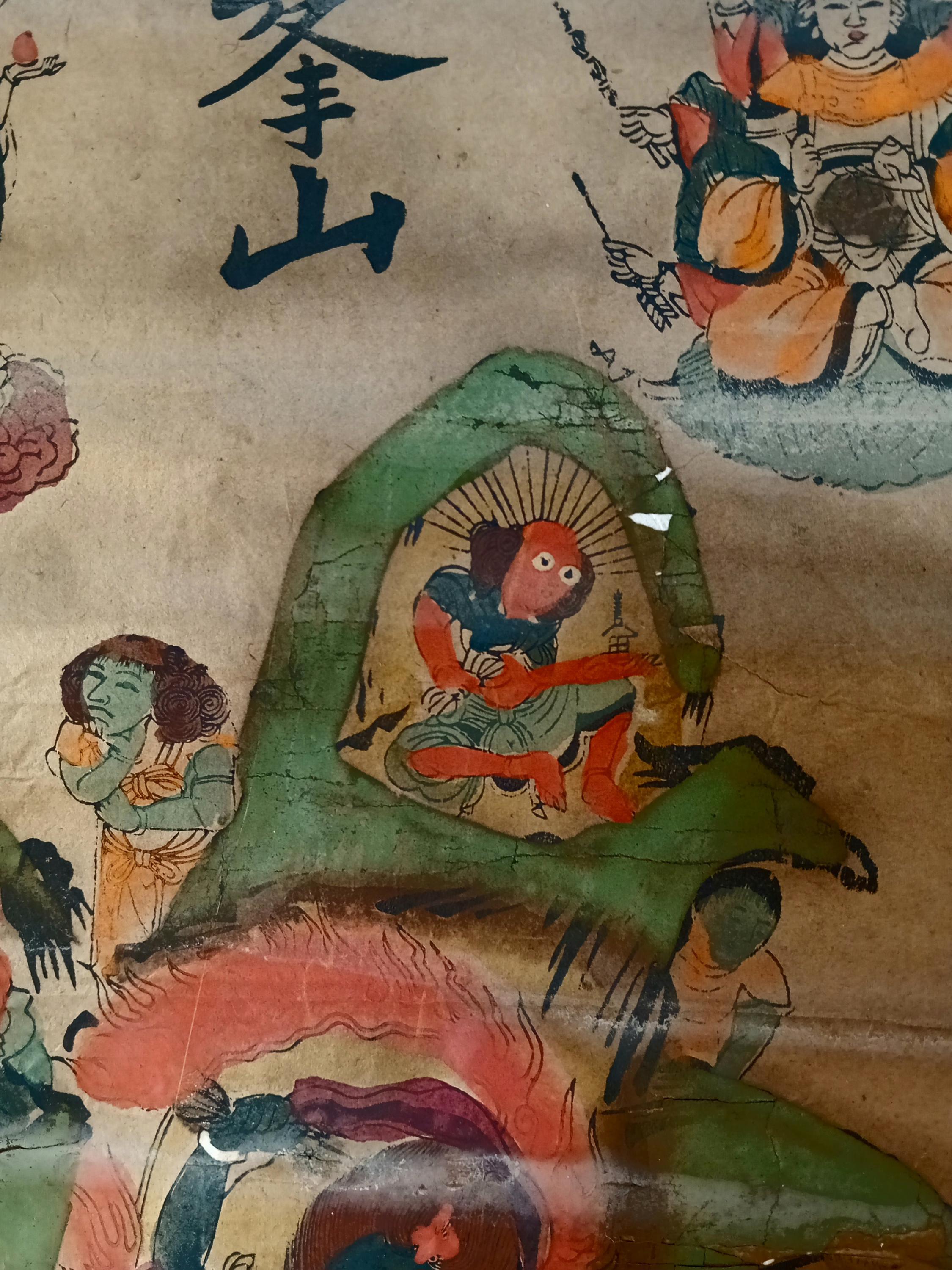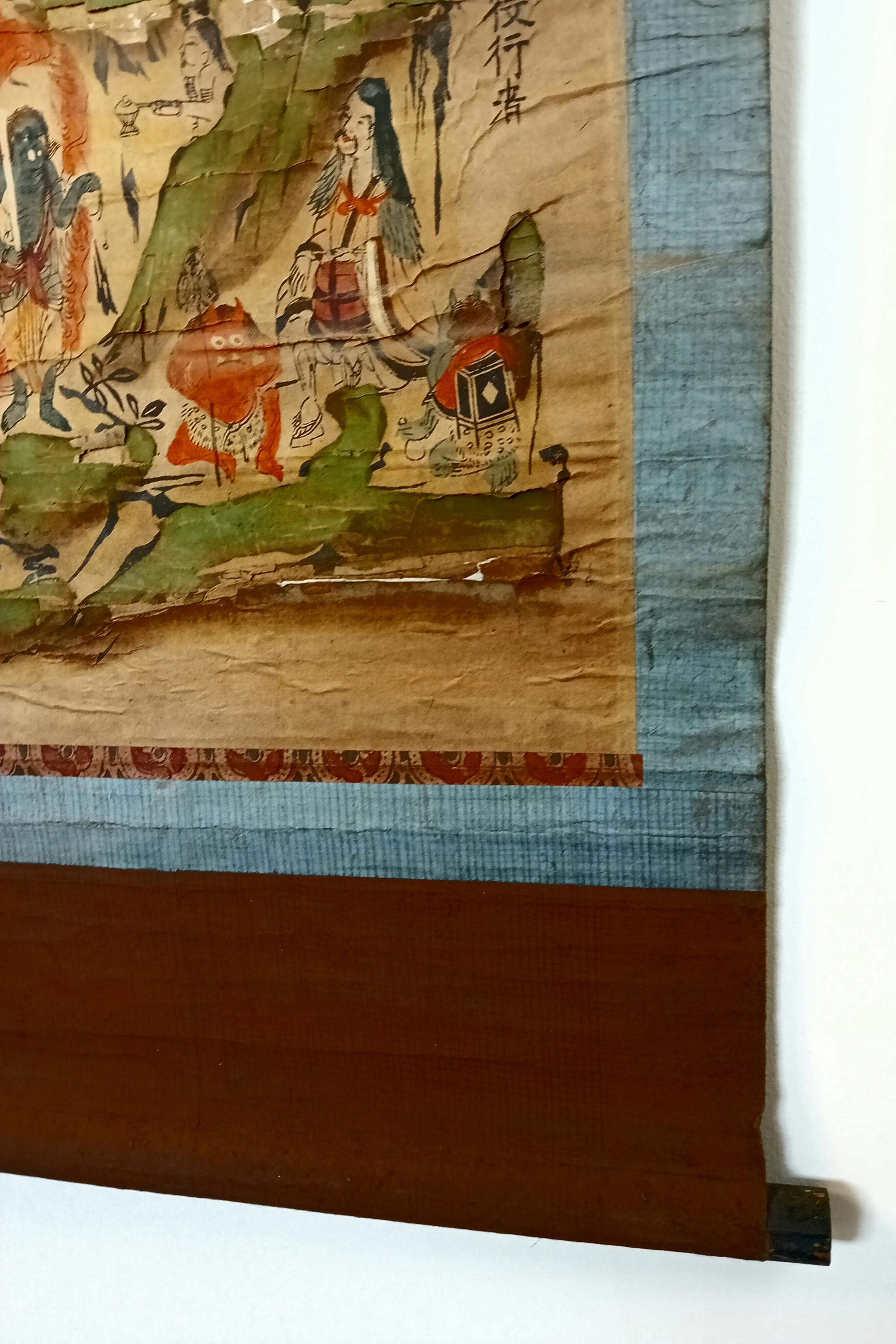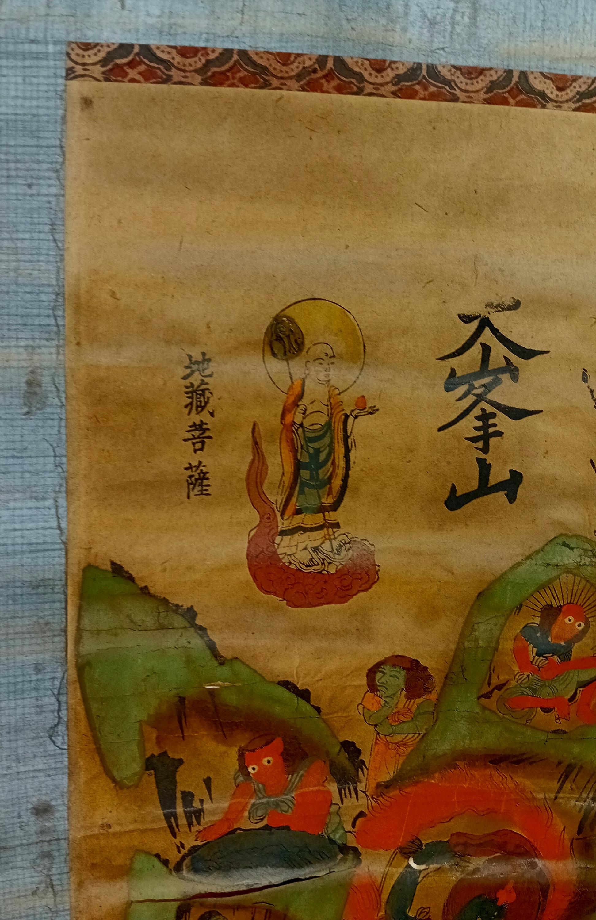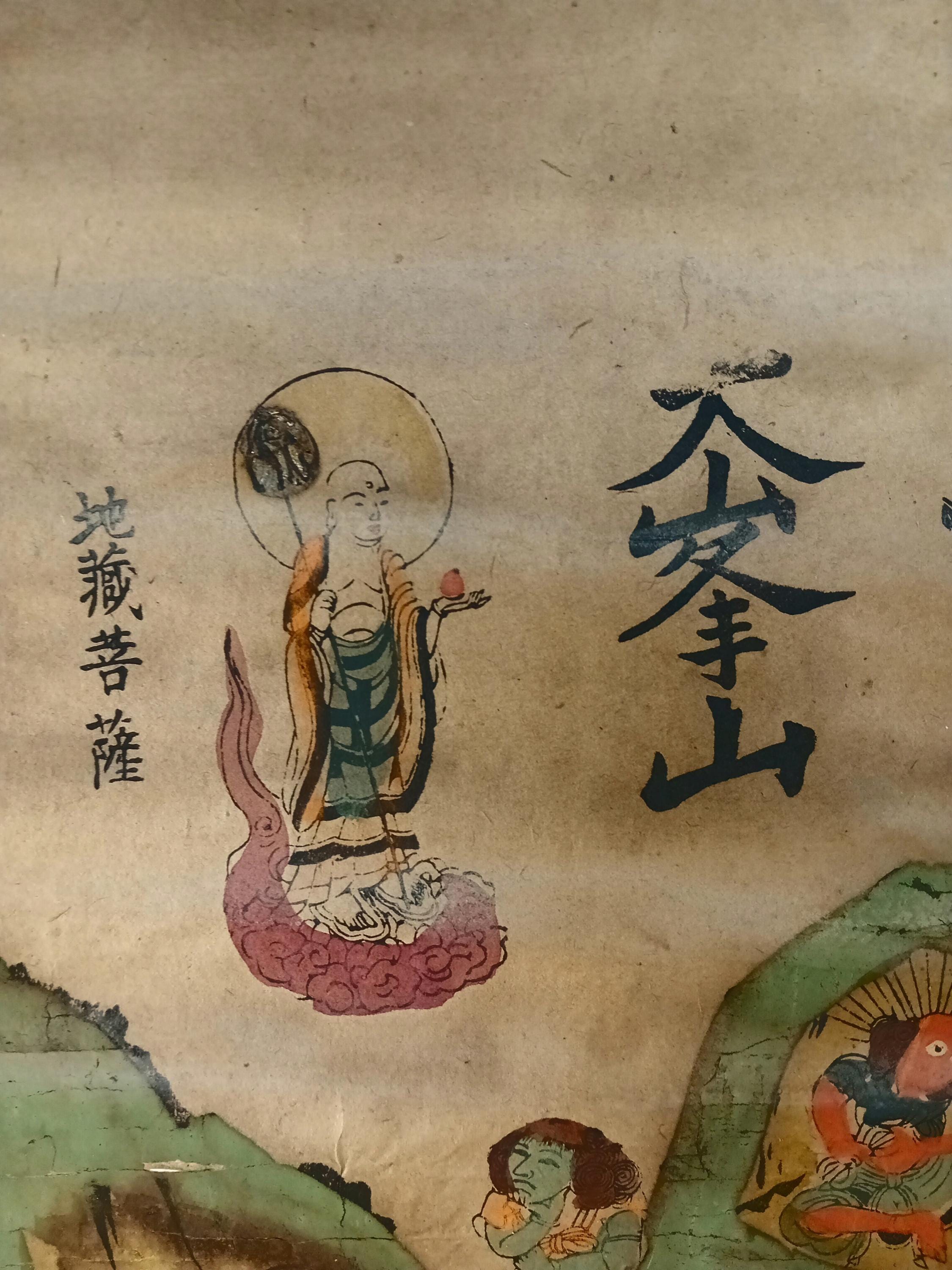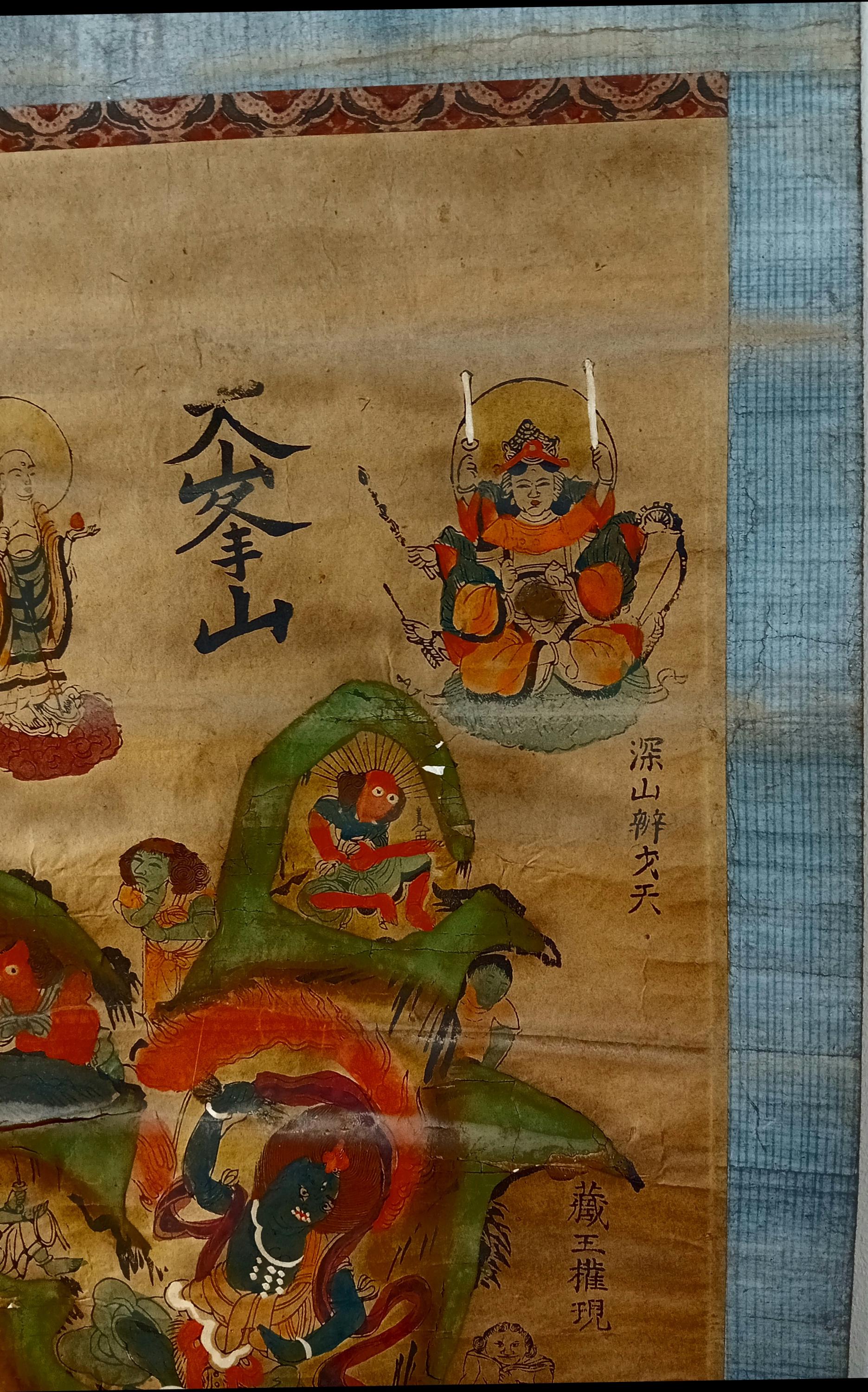 Antique Japanese hanging scroll (kakejiku), depicting the sacred mountain Ōmine (大峯山) and the Shugendō pantheon.