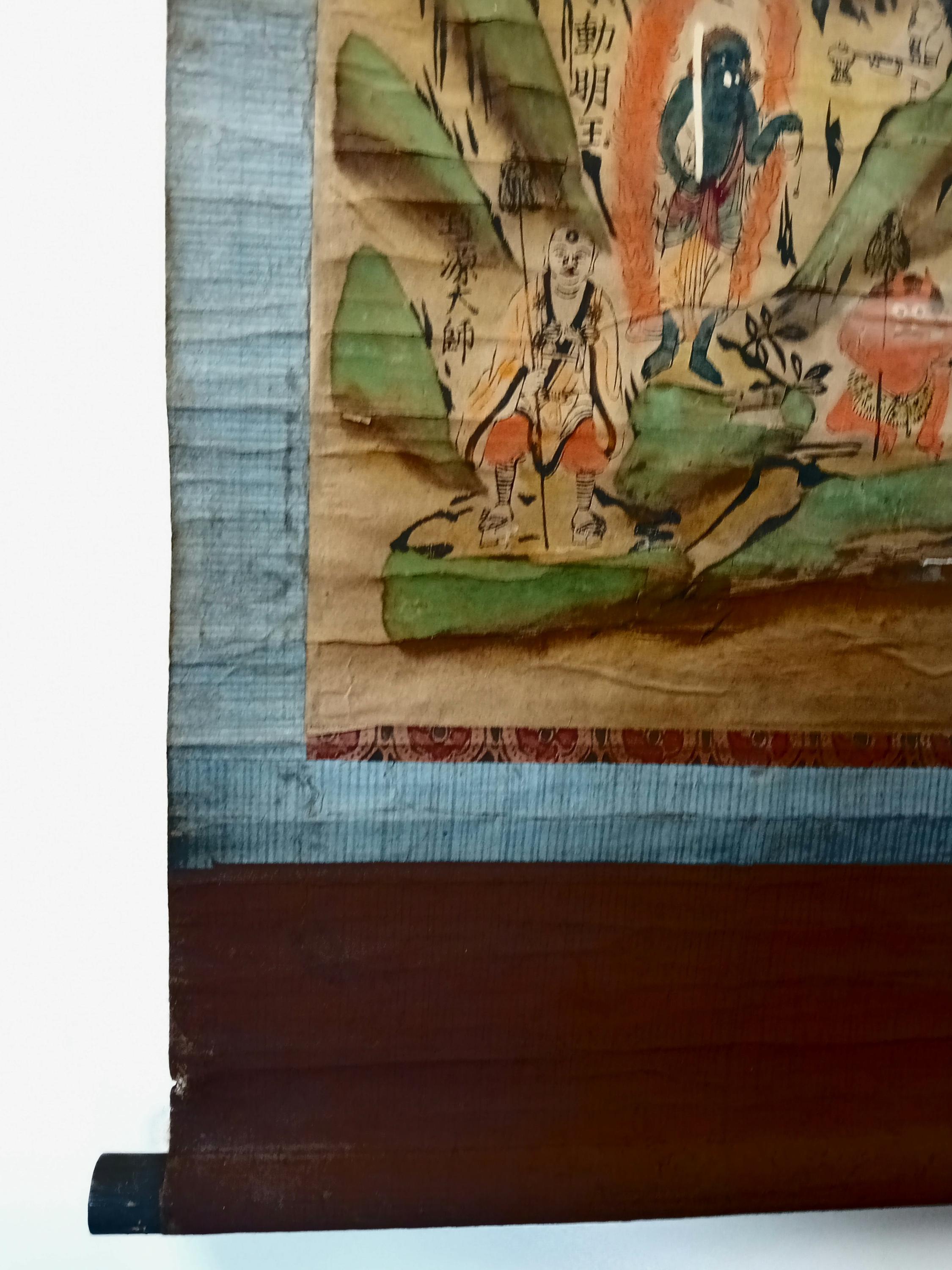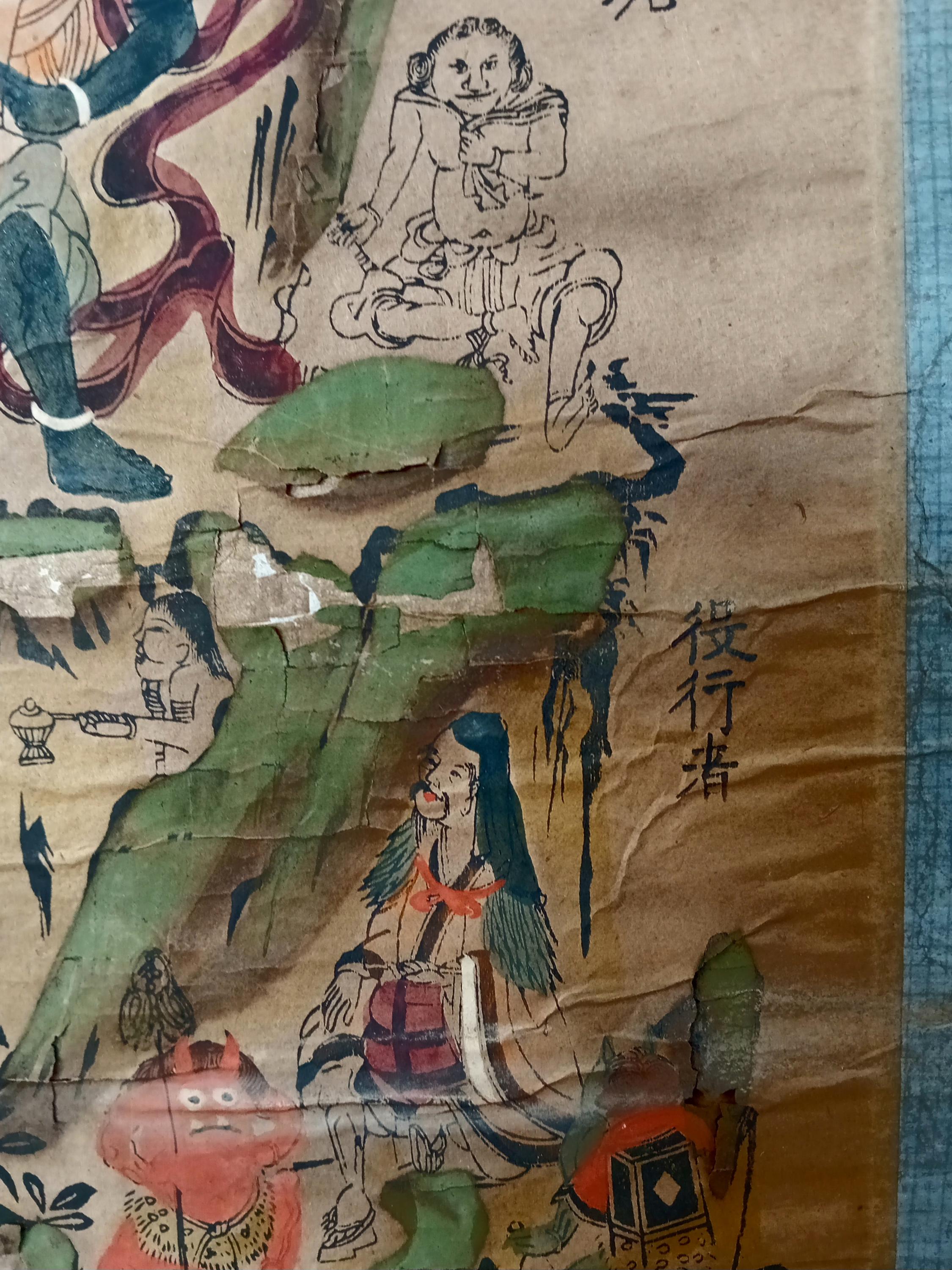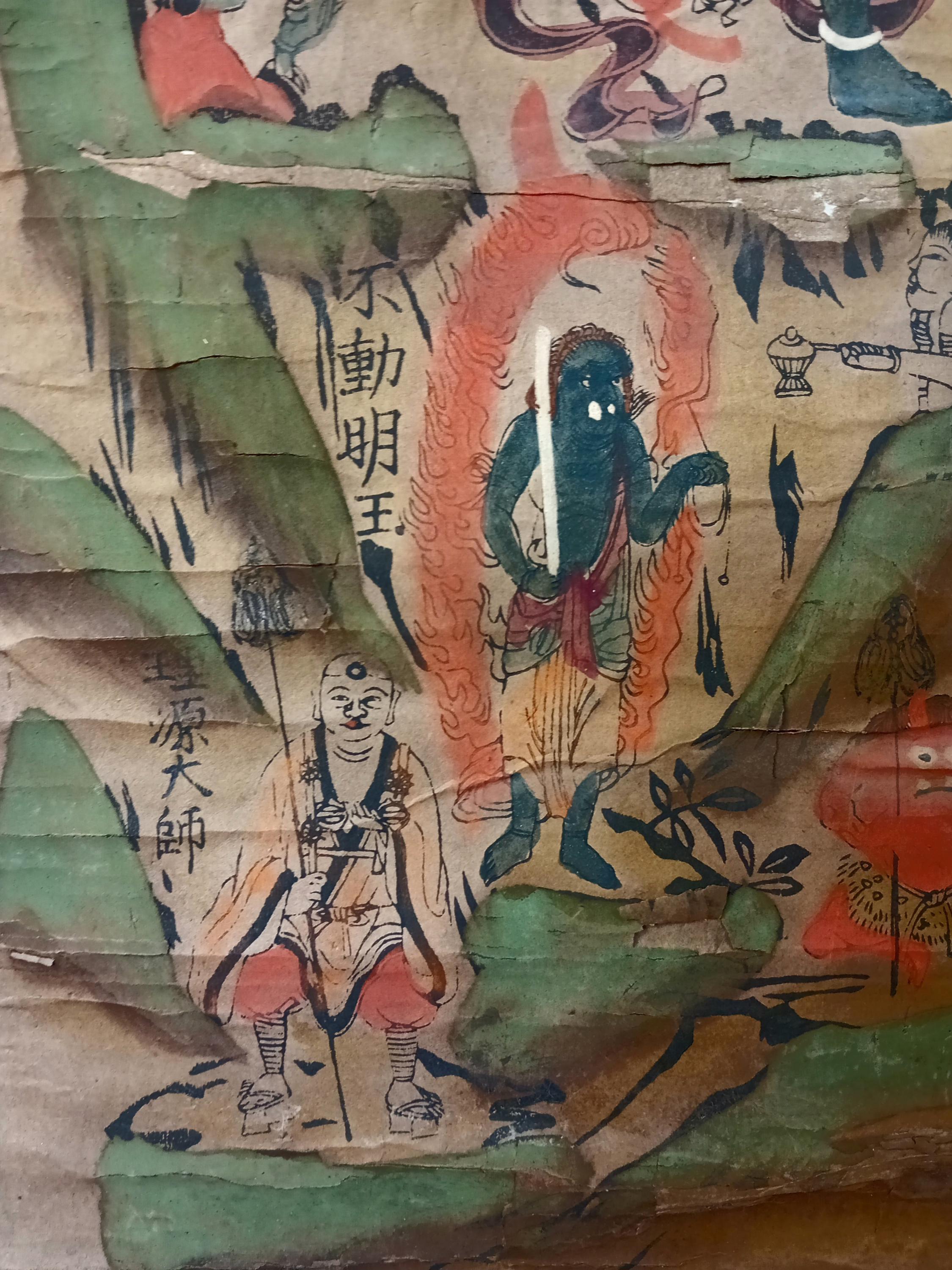 This mandara was created in 1839 (Tenpō 10, Edo period) as a pilgrimage scroll, purchased by a devotee after visiting the sacred Ōmine mountains. Such scrolls served as powerful talismans at home, combining Buddhist and Shinto traditions.