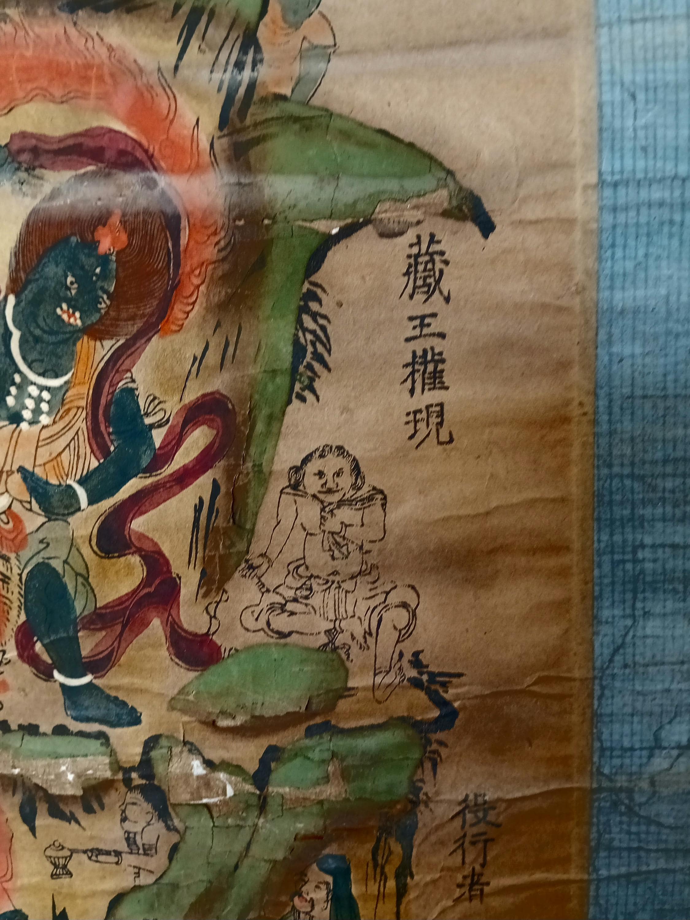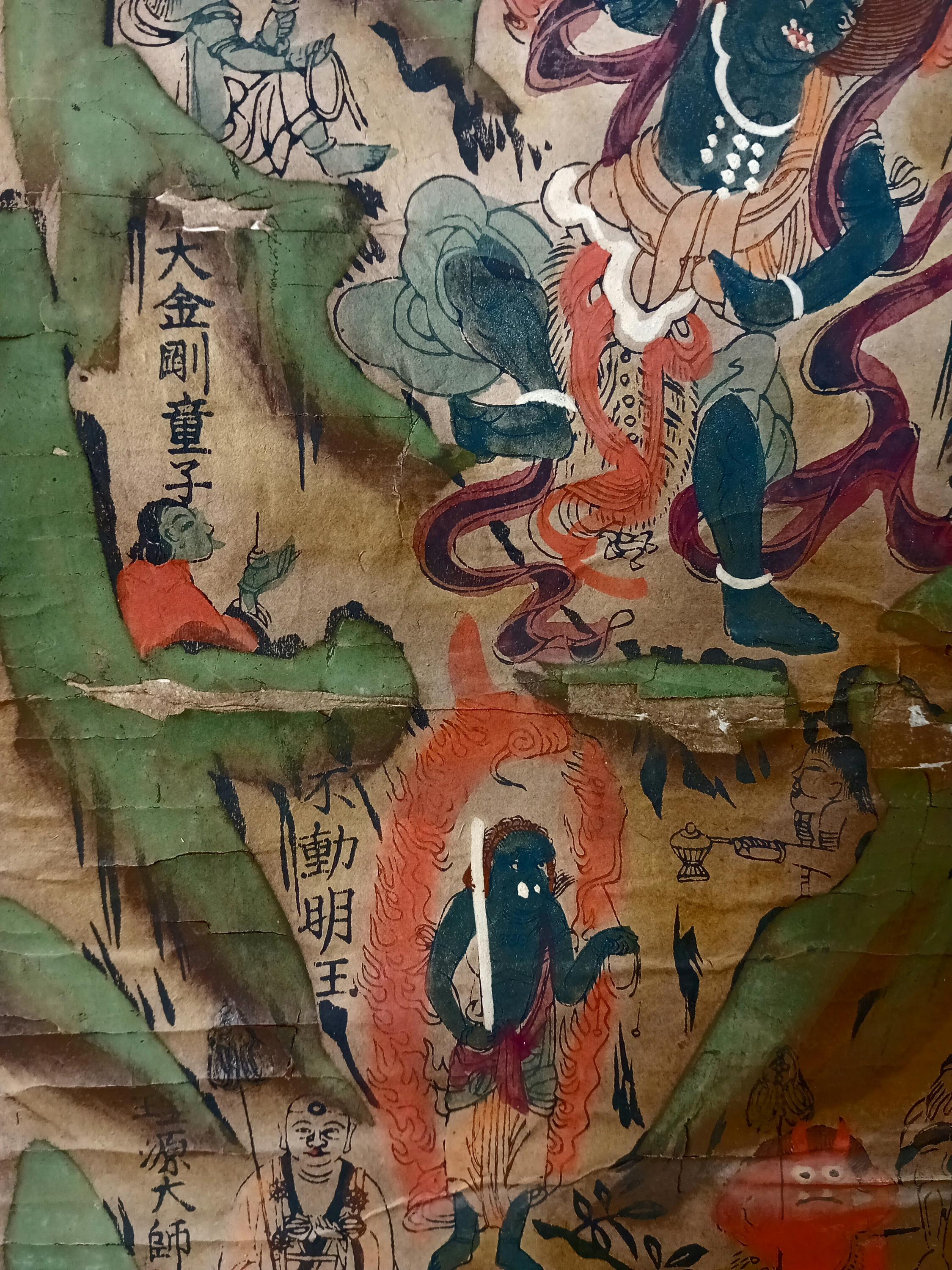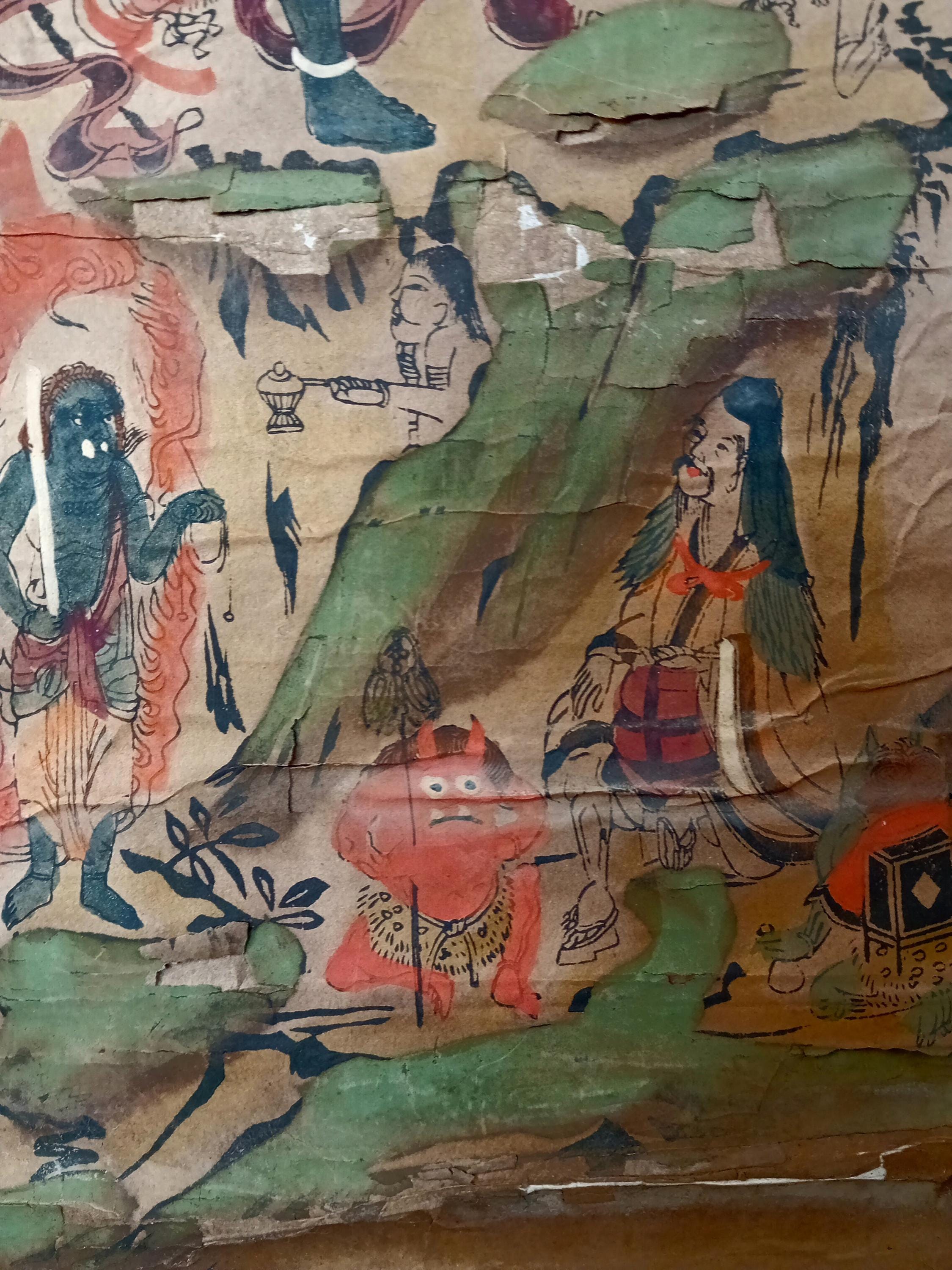 This mandara was created in 1839 (Tenpō 10, Edo period) as a pilgrimage scroll, purchased by a devotee after visiting the sacred Ōmine mountains. Such scrolls served as powerful talismans at home, combining Buddhist and Shinto traditions.