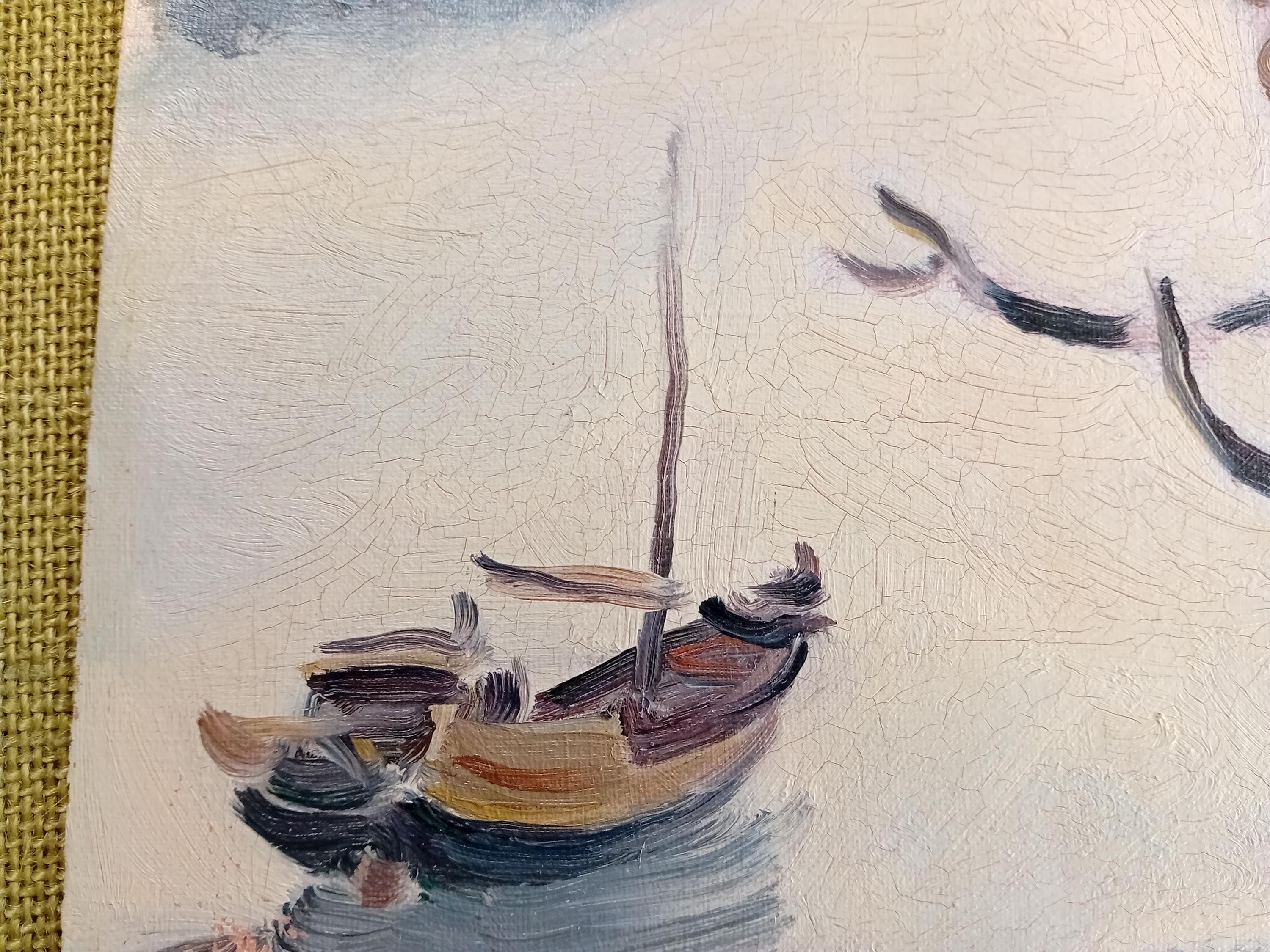 A vintage Shōwa-period work executed in oil on board. The format is a standalone painted panel depicting a coastal scene with boats, calm water, and branches in the foreground. The reverse side carries the original title and the date Shōwa 19 (1944), together with the artist’s signature and a red seal.