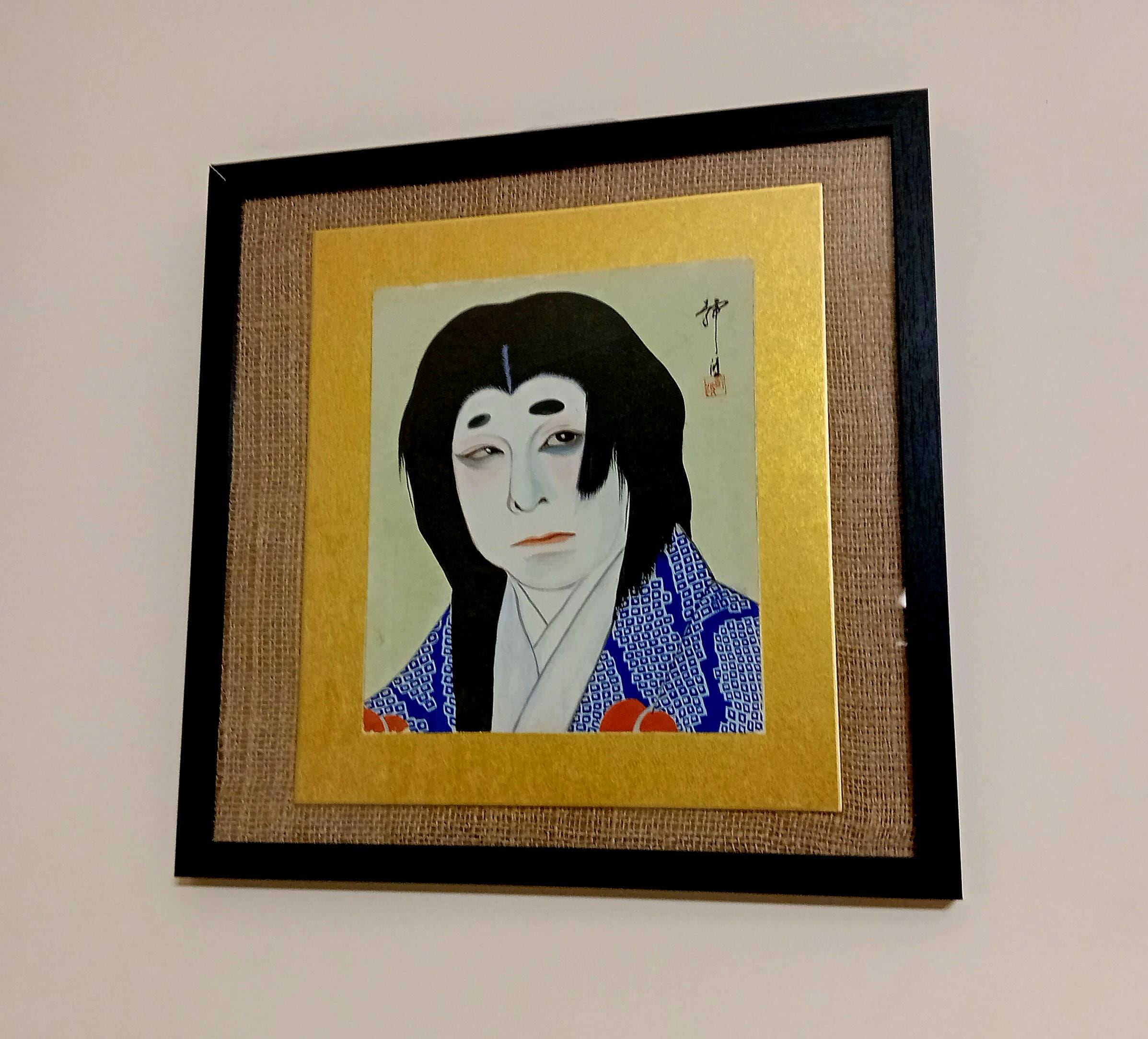 An authentic Japanese Yakusha-e (Kabuki actor portrait) painted on fine washi paper, mounted on traditional golden shikishi board (approx. 24 × 27 cm).