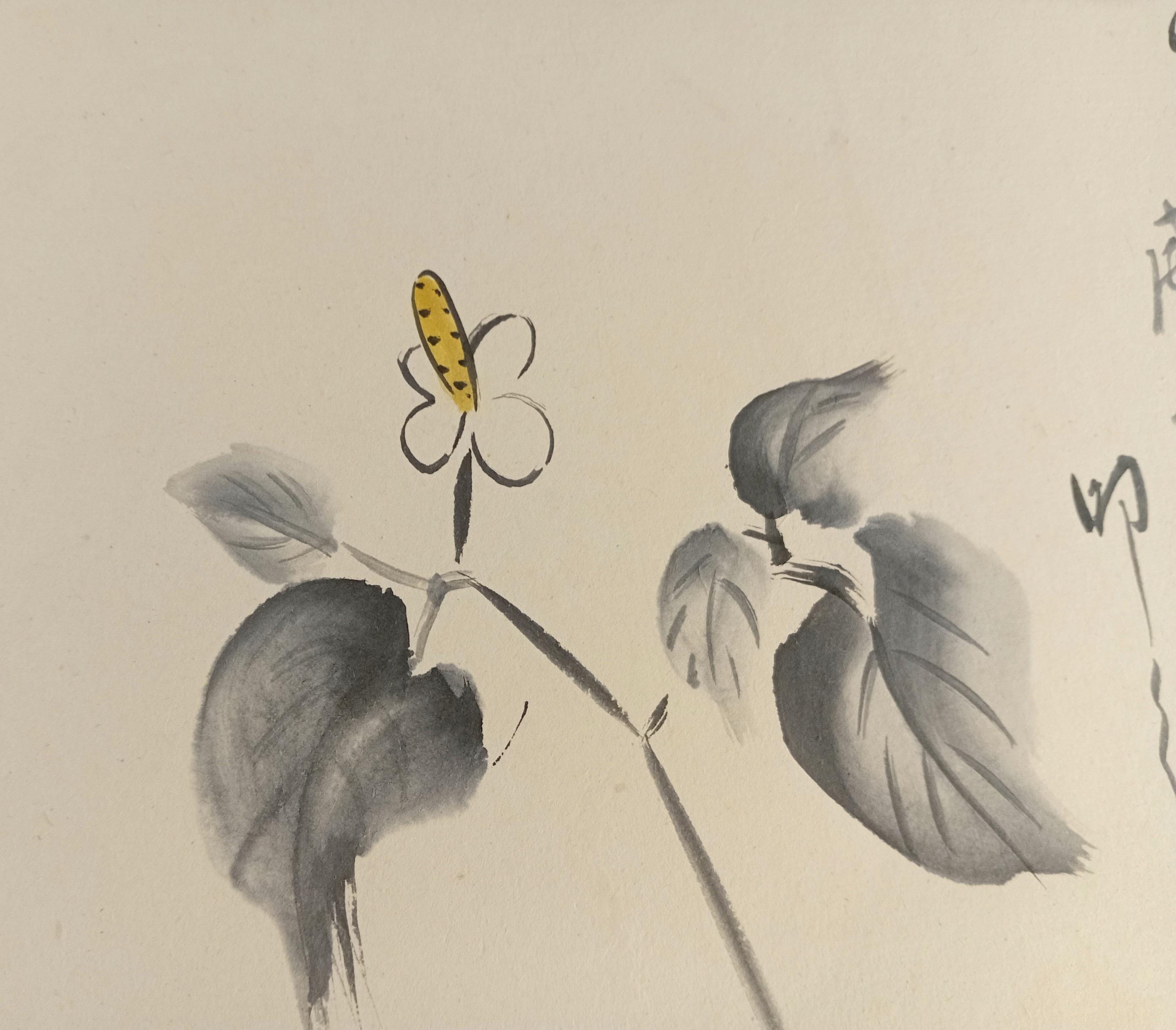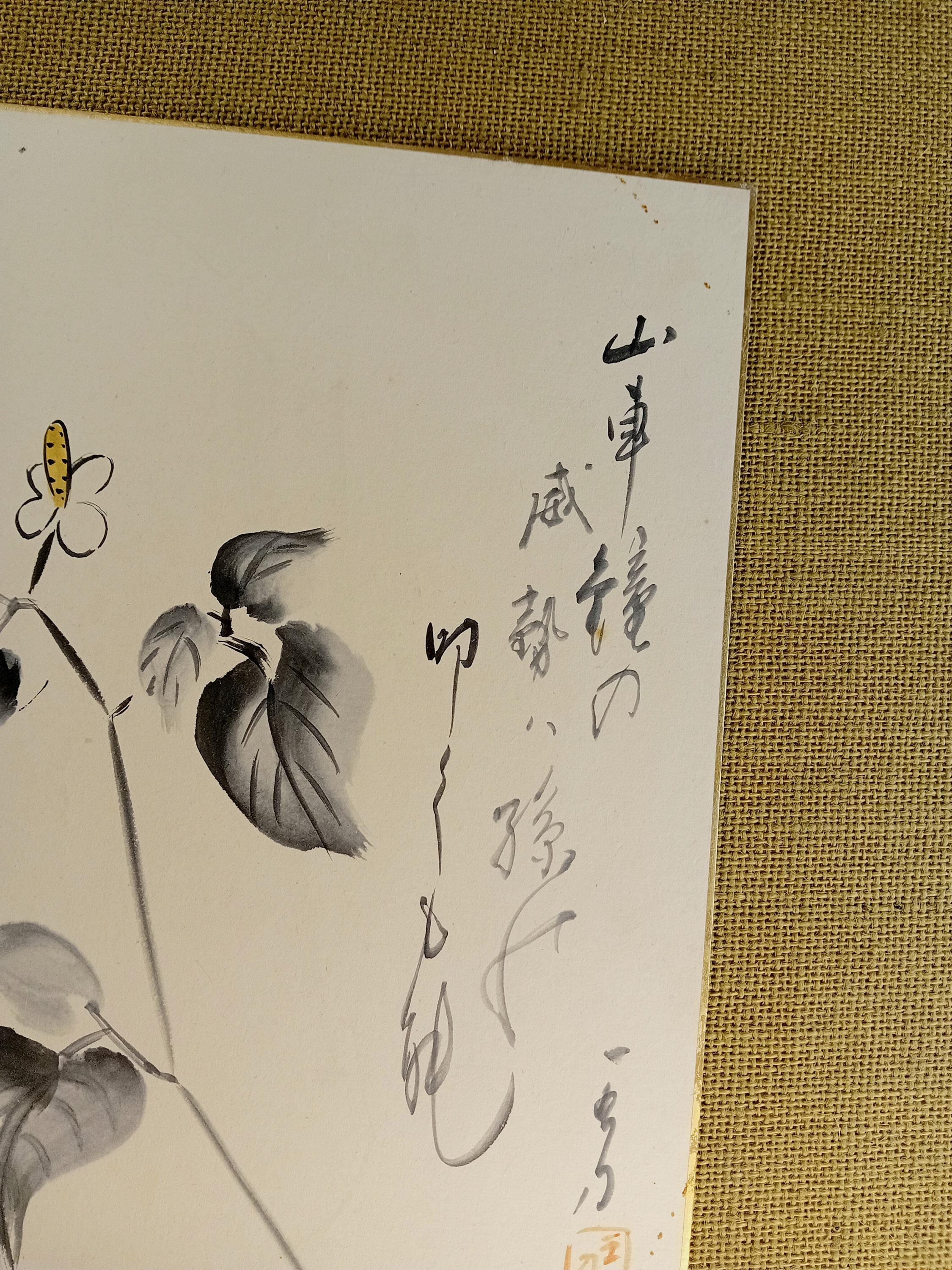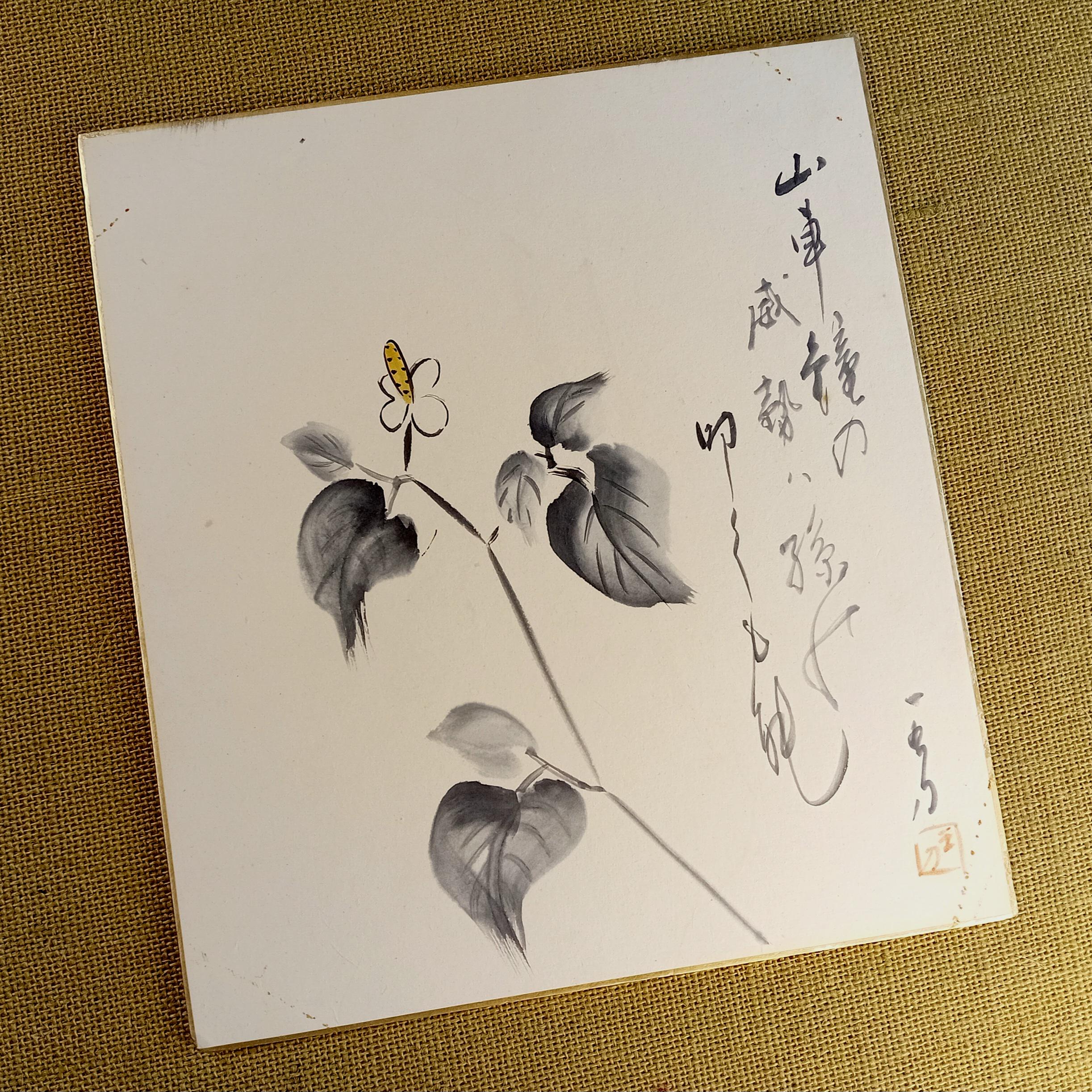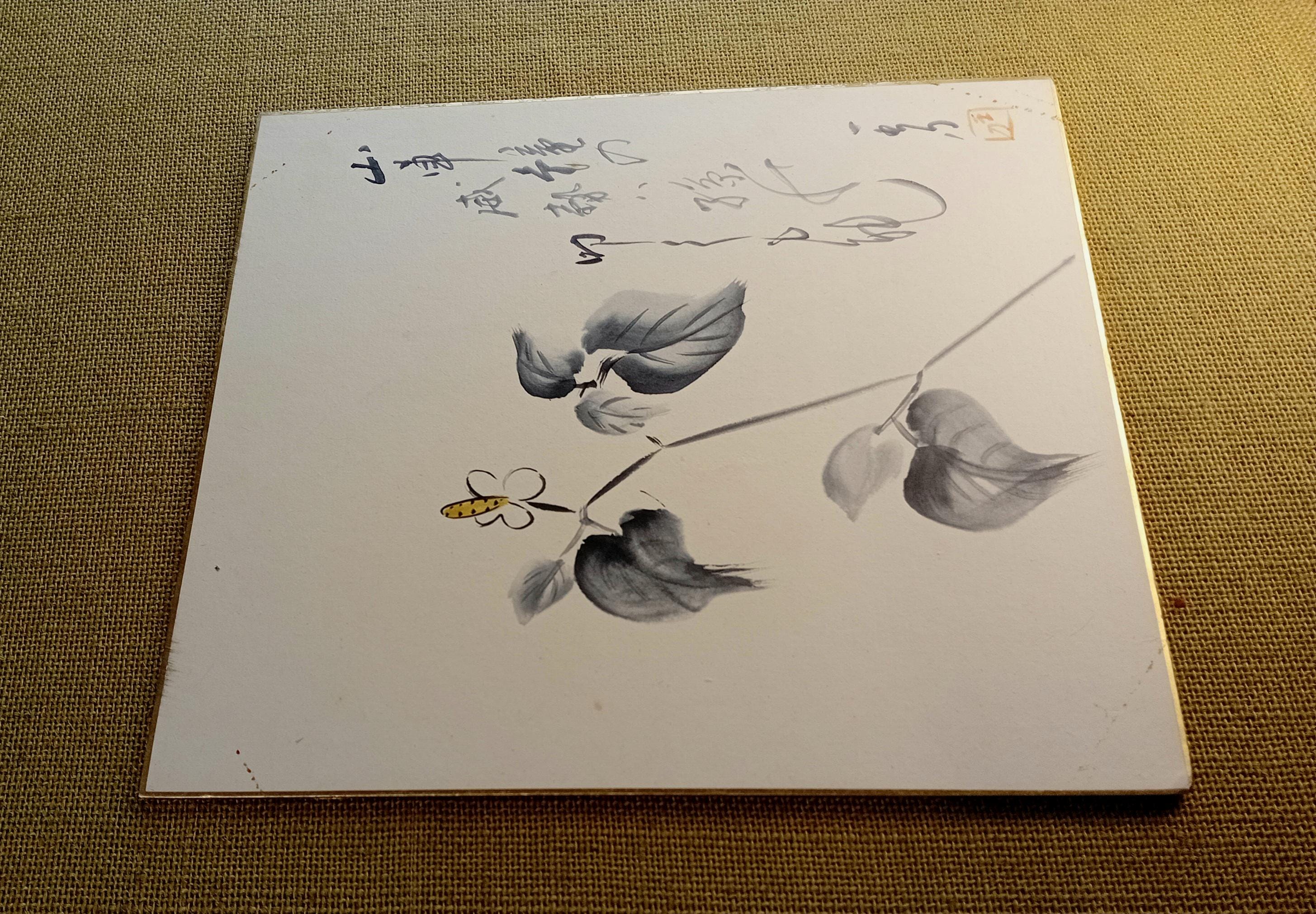A vintage shikishi from the late Shōwa period, painted with ink and a light color accent. The vertical inscription on the right is written in a free, flowing hand and relates to a reflective theme of gratitude and natural movement.