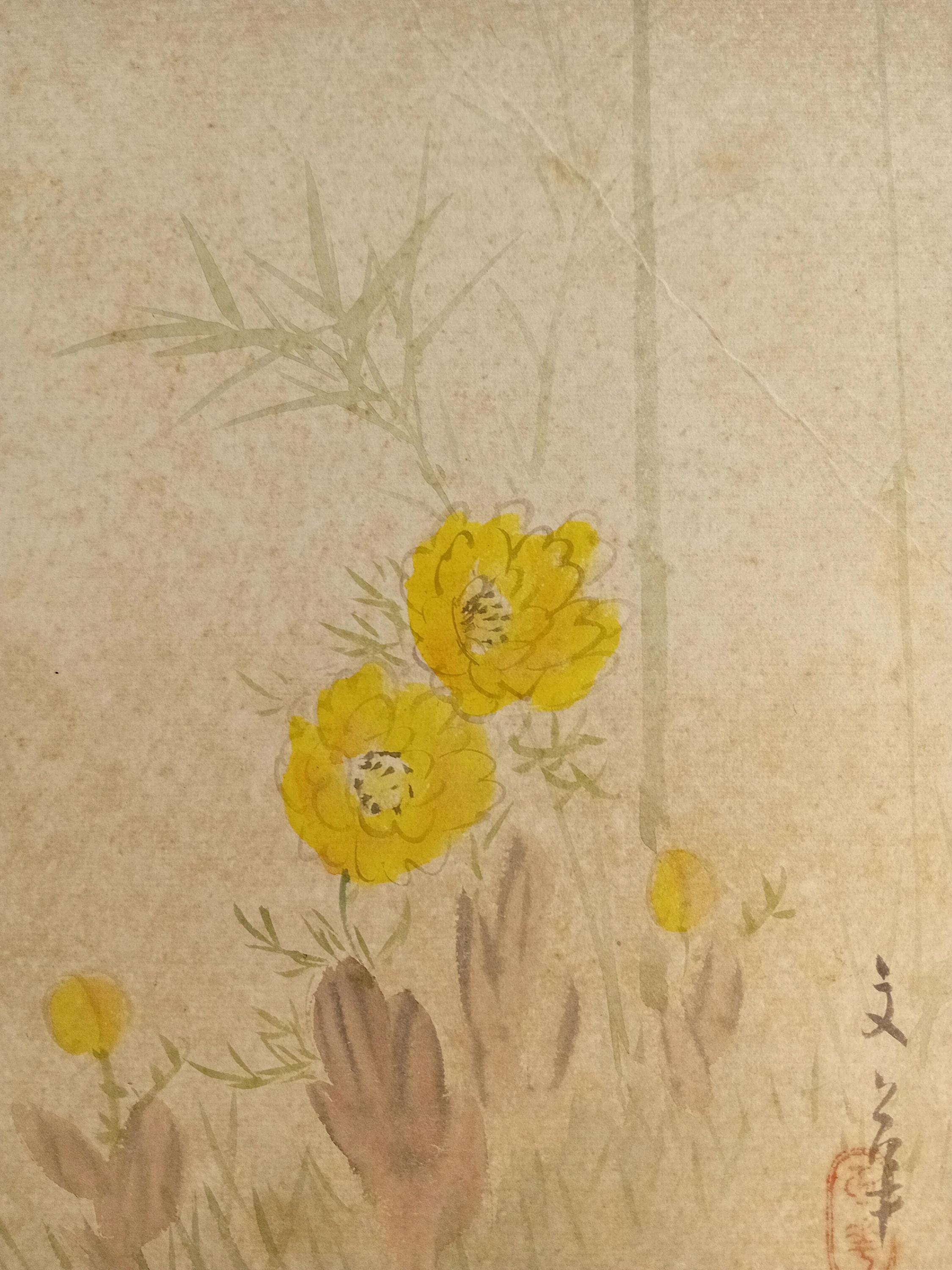 Vintage Japanese shikishi painted in watercolor and sumi ink, showing early spring flowers in a quiet botanical composition. Yellow buds open among young shoots, with soft background lines suggesting bamboo. The work reflects the early Shōwa approach to seasonal botanical studies. A signature and red seal by the artist are present. The surface remains in its natural vintage state, without restoration.