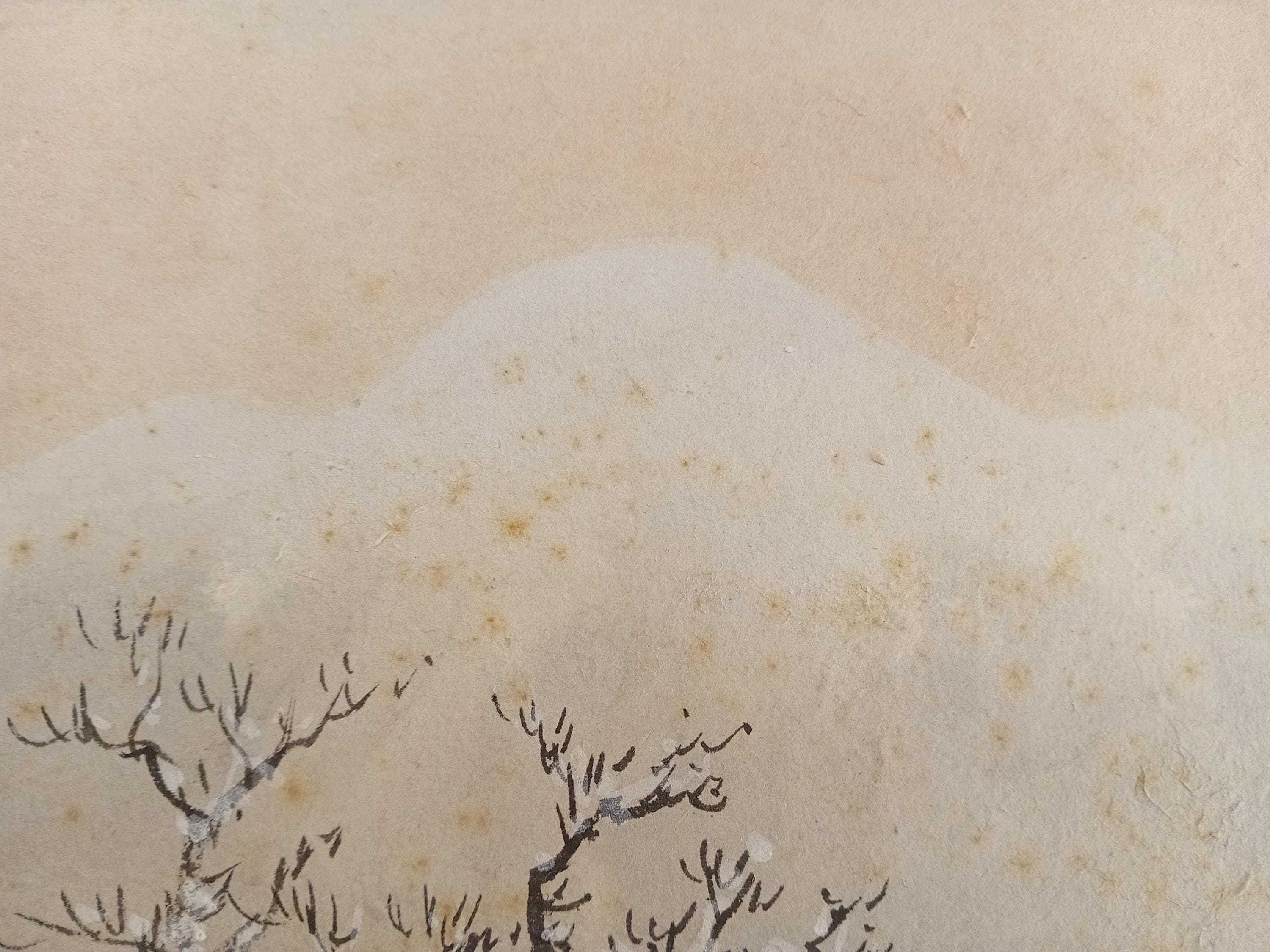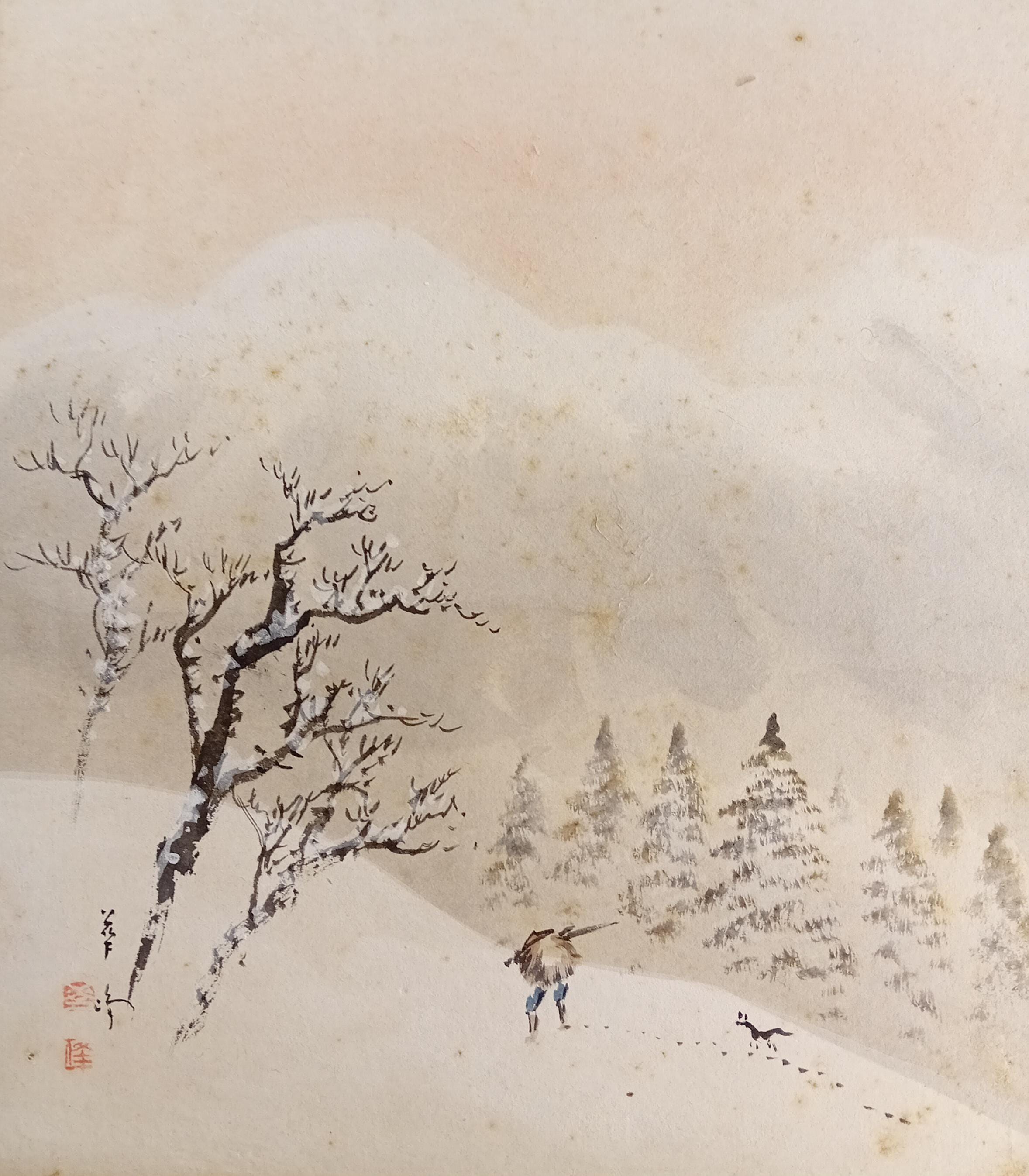 Sumi-e brushwork with a soft color tone, typical of small seasonal landscapes of the Taishō–Shōwa era.