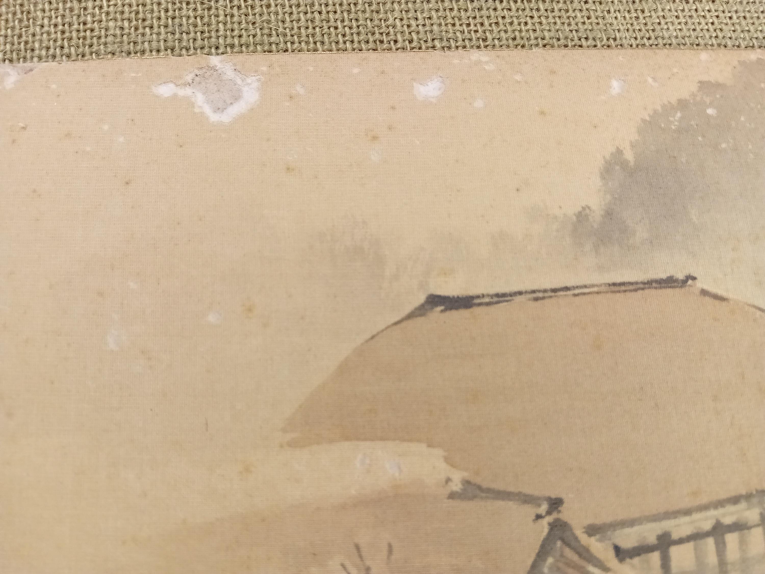 Minimalist Japanese ink landscape on silk with quiet architectural forms.