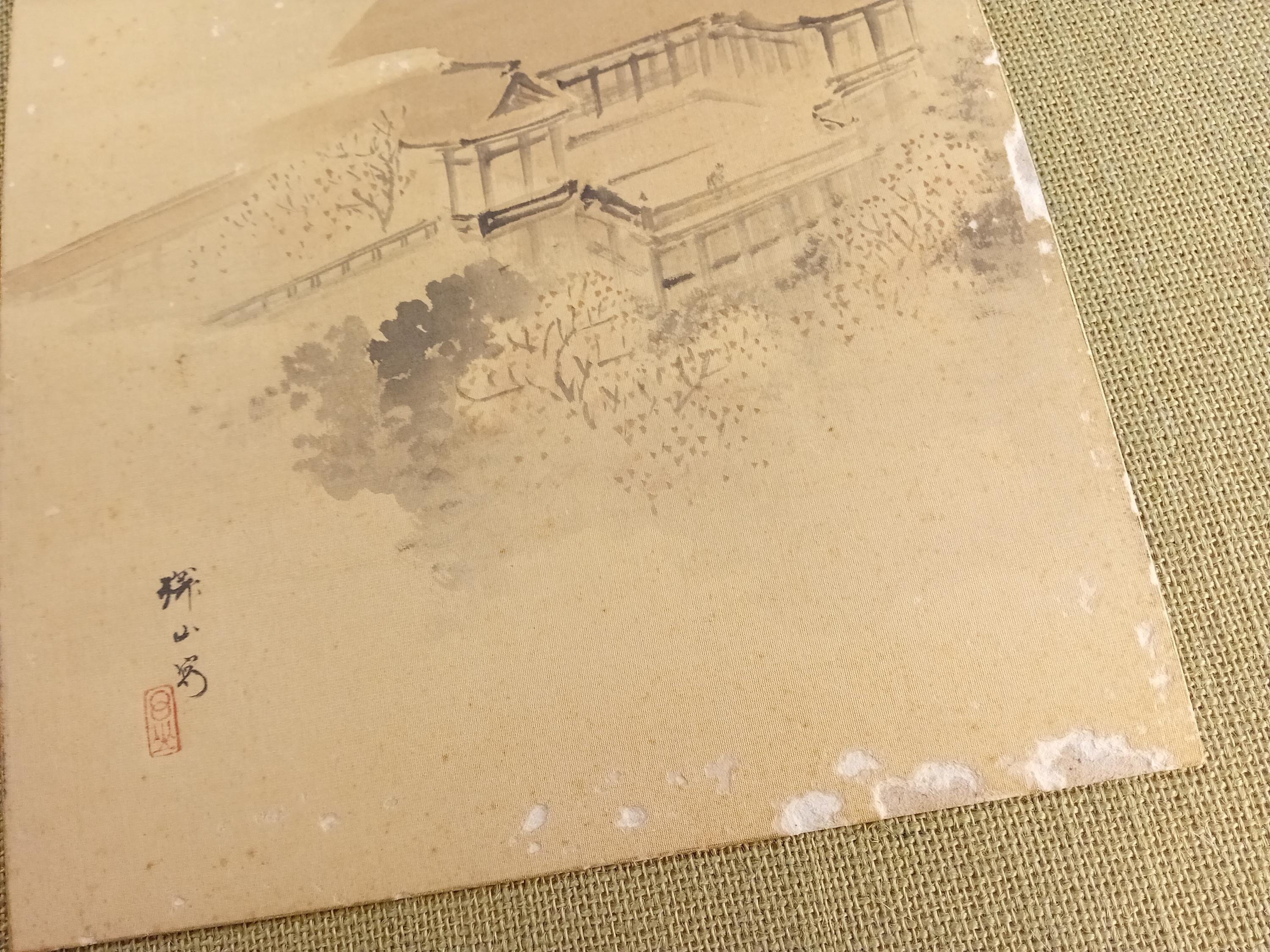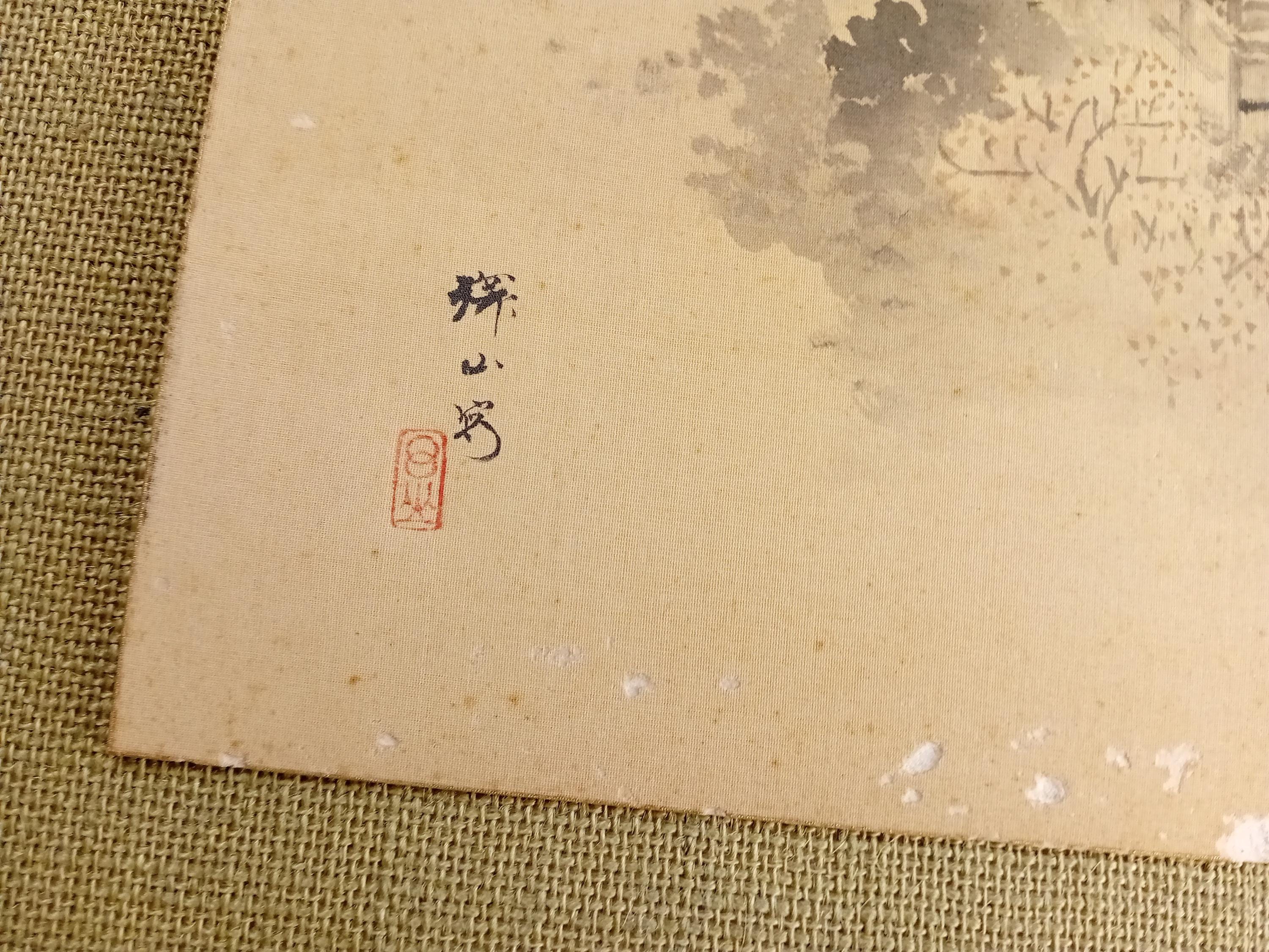 This shikishi is an antique Japanese ink work on silk from the Meiji–Taisho era. The composition shows an elevated architectural structure emerging through soft atmospheric mist, with light foreground vegetation rendered in restrained brushwork. The minimal monochrome technique reflects the calm spatial approach characteristic of the period. The work bears a signature and a red seal.