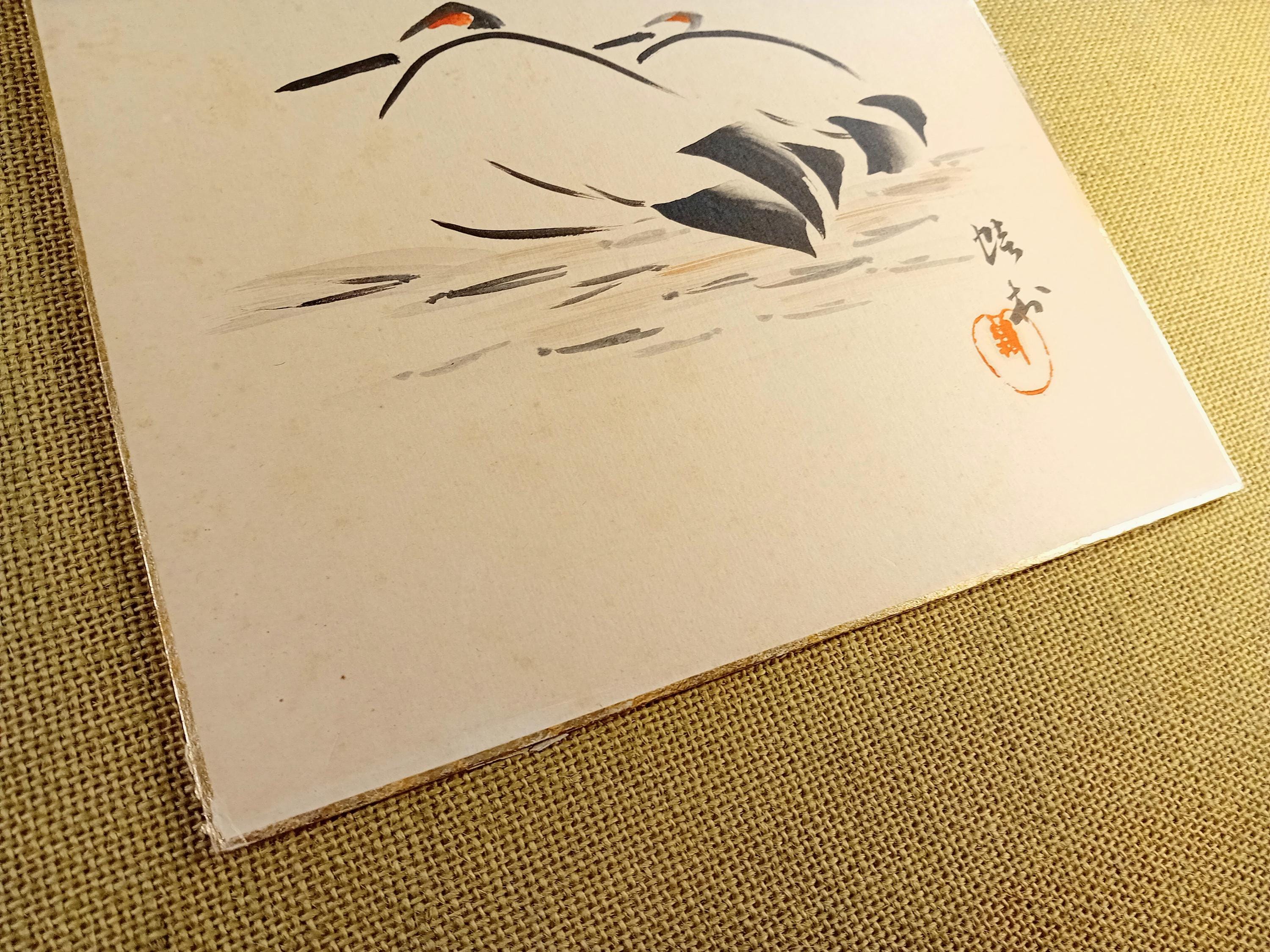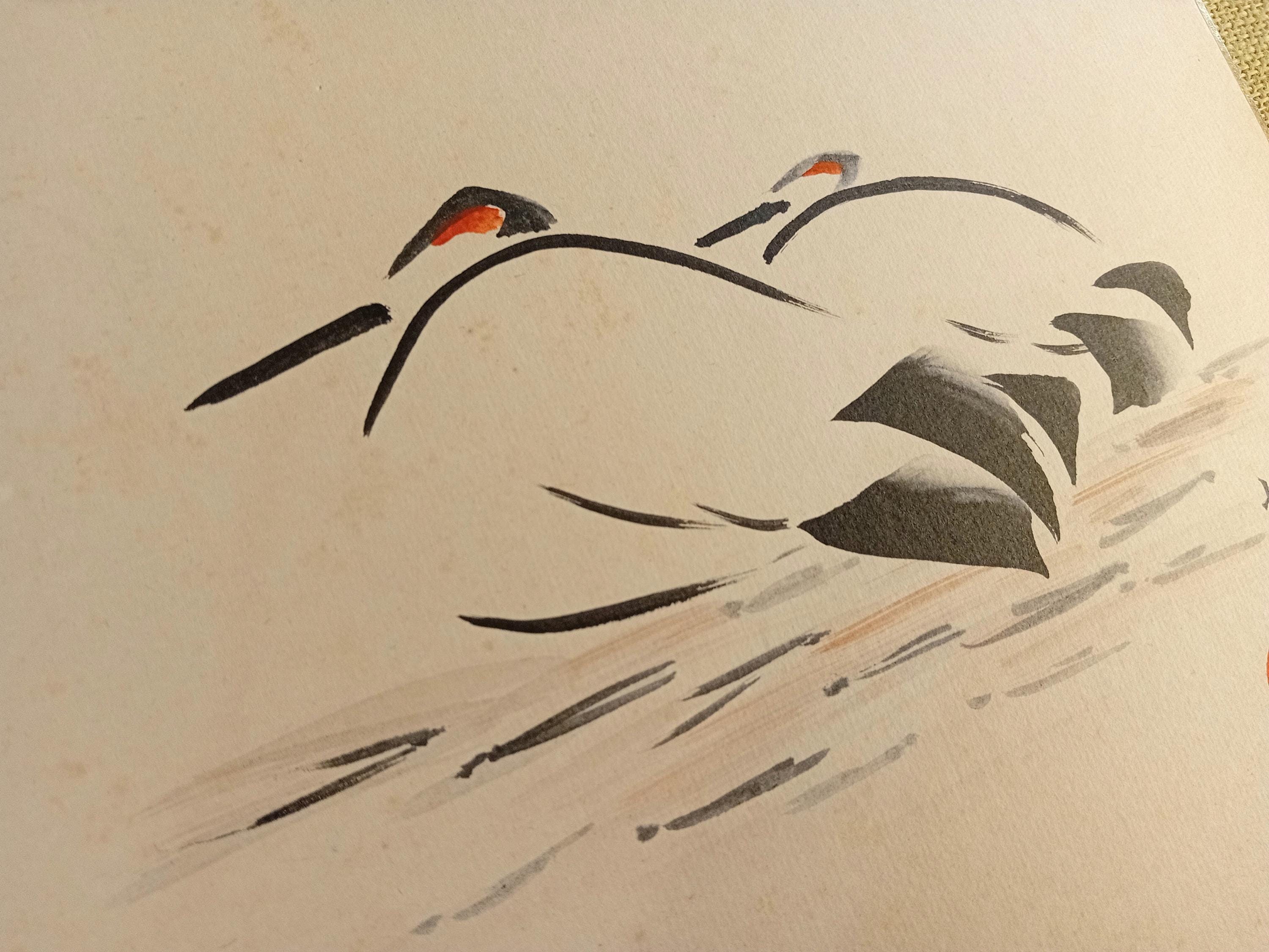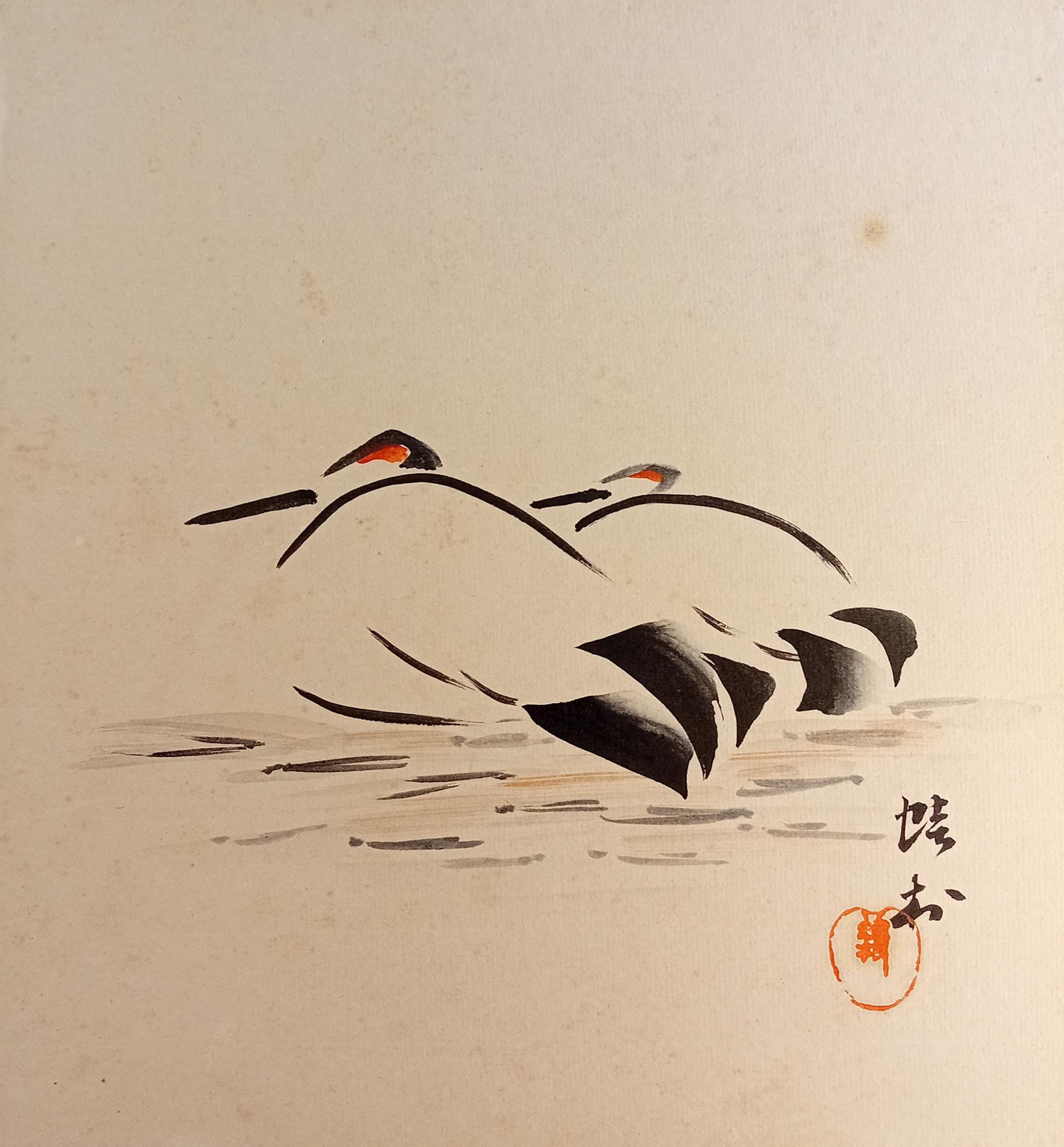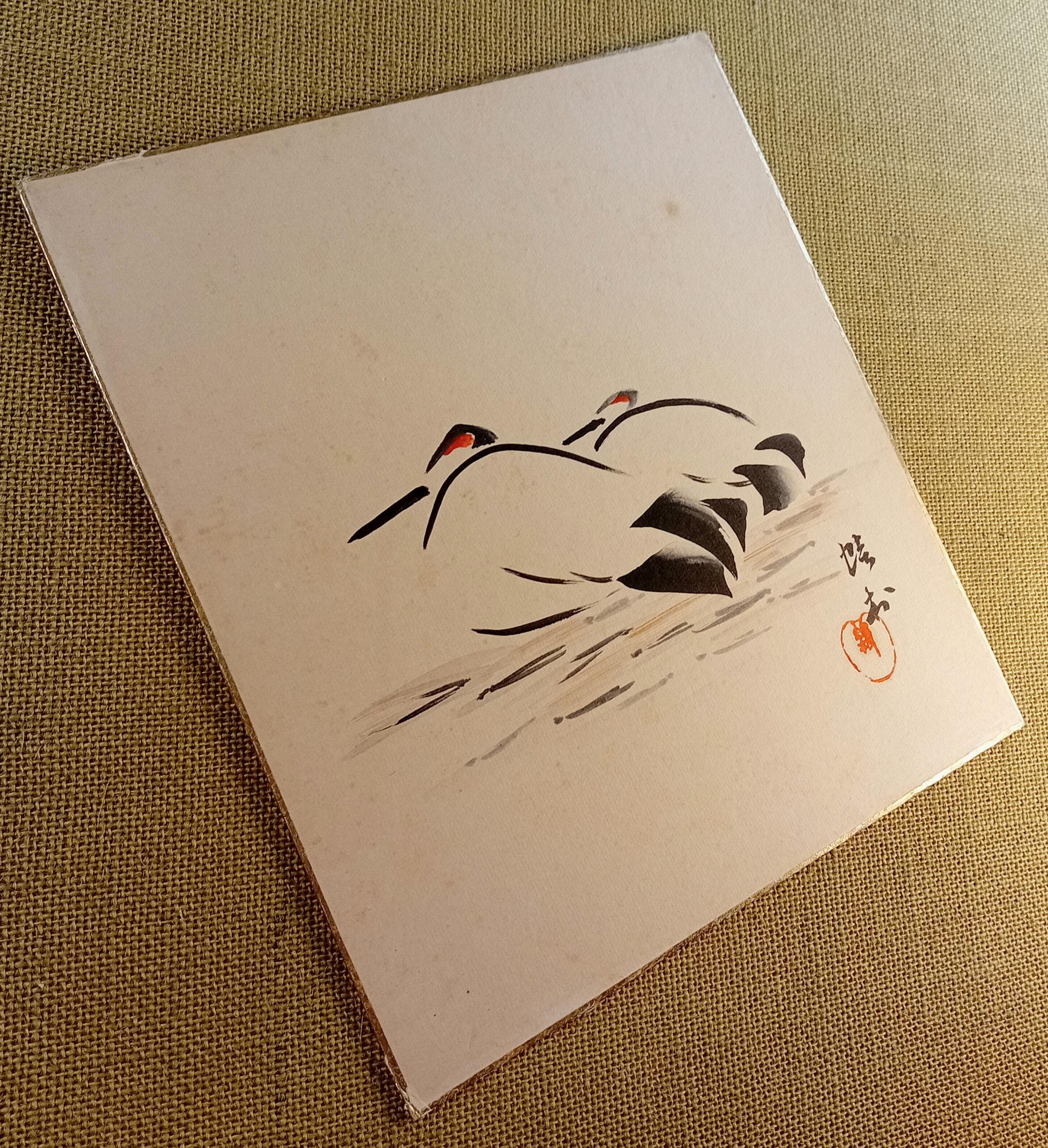 Ink work on shikishi from the Shōwa period, composed through two abstracted forms built from curved brushstrokes and minimal color accents. The composition relies on rhythm and gesture rather than depiction, reflecting the restrained sumi-e aesthetics of mid-20th-century Japan.