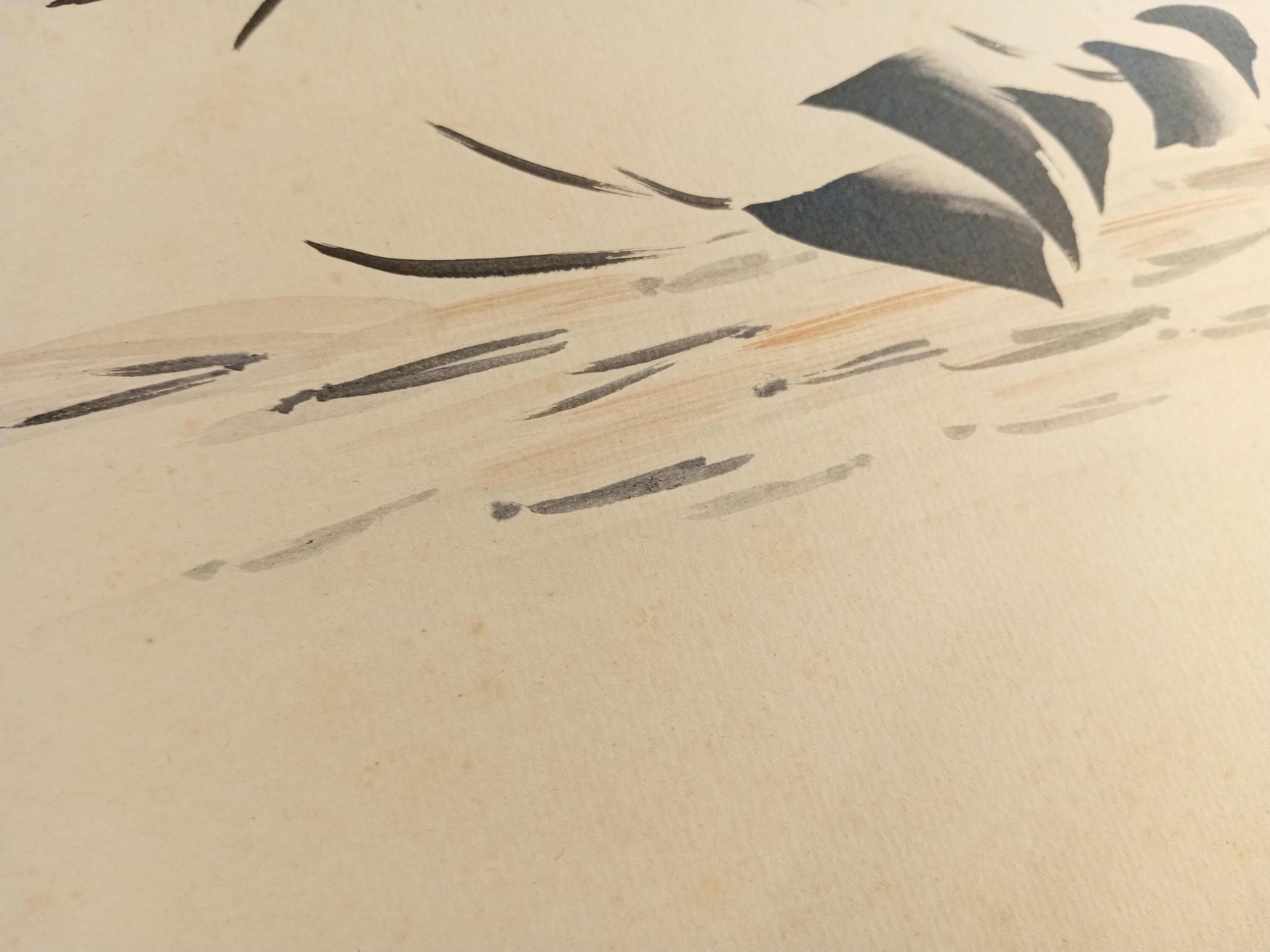 Minimal sumi-e with abstracted forms and restrained color.