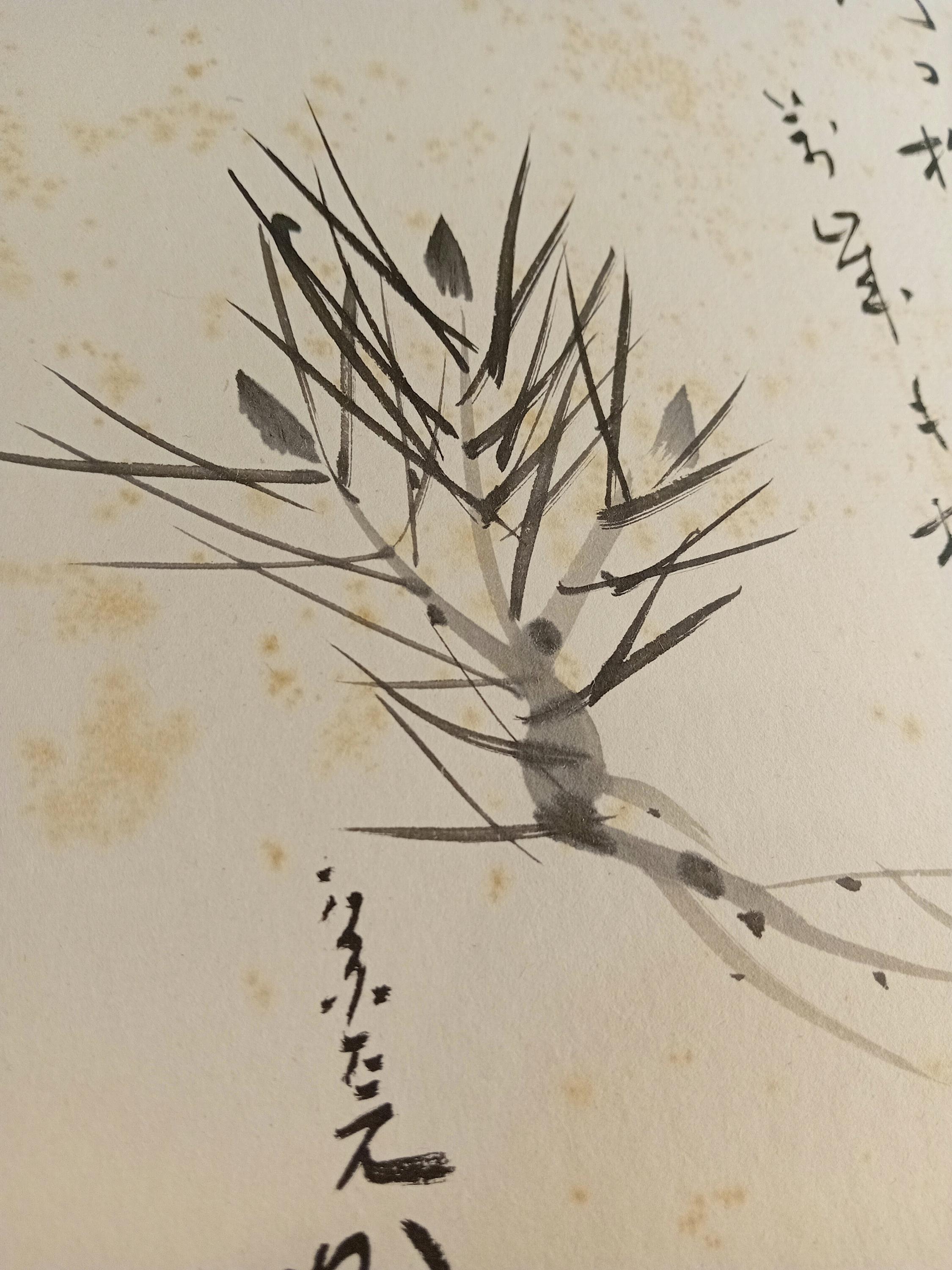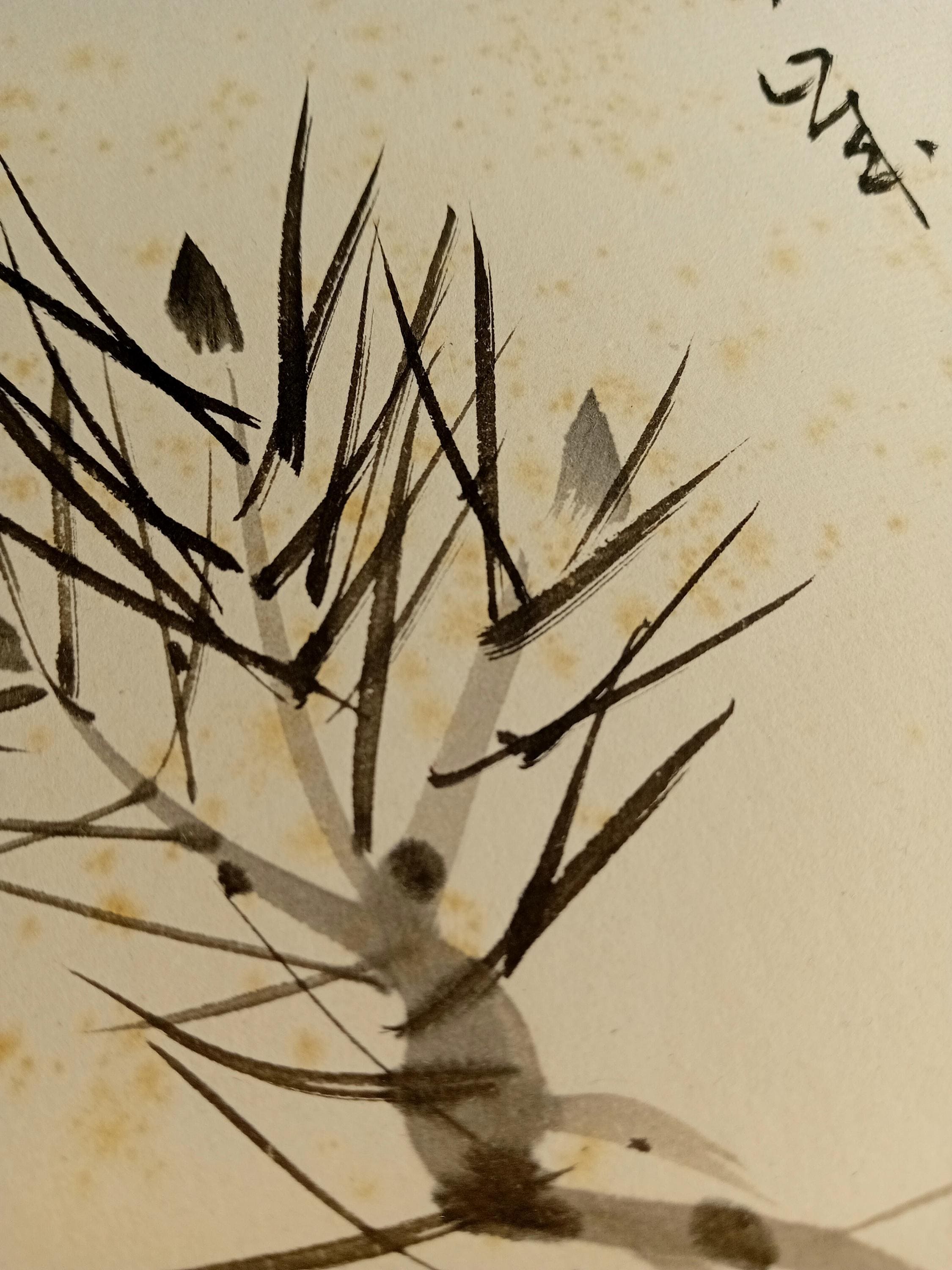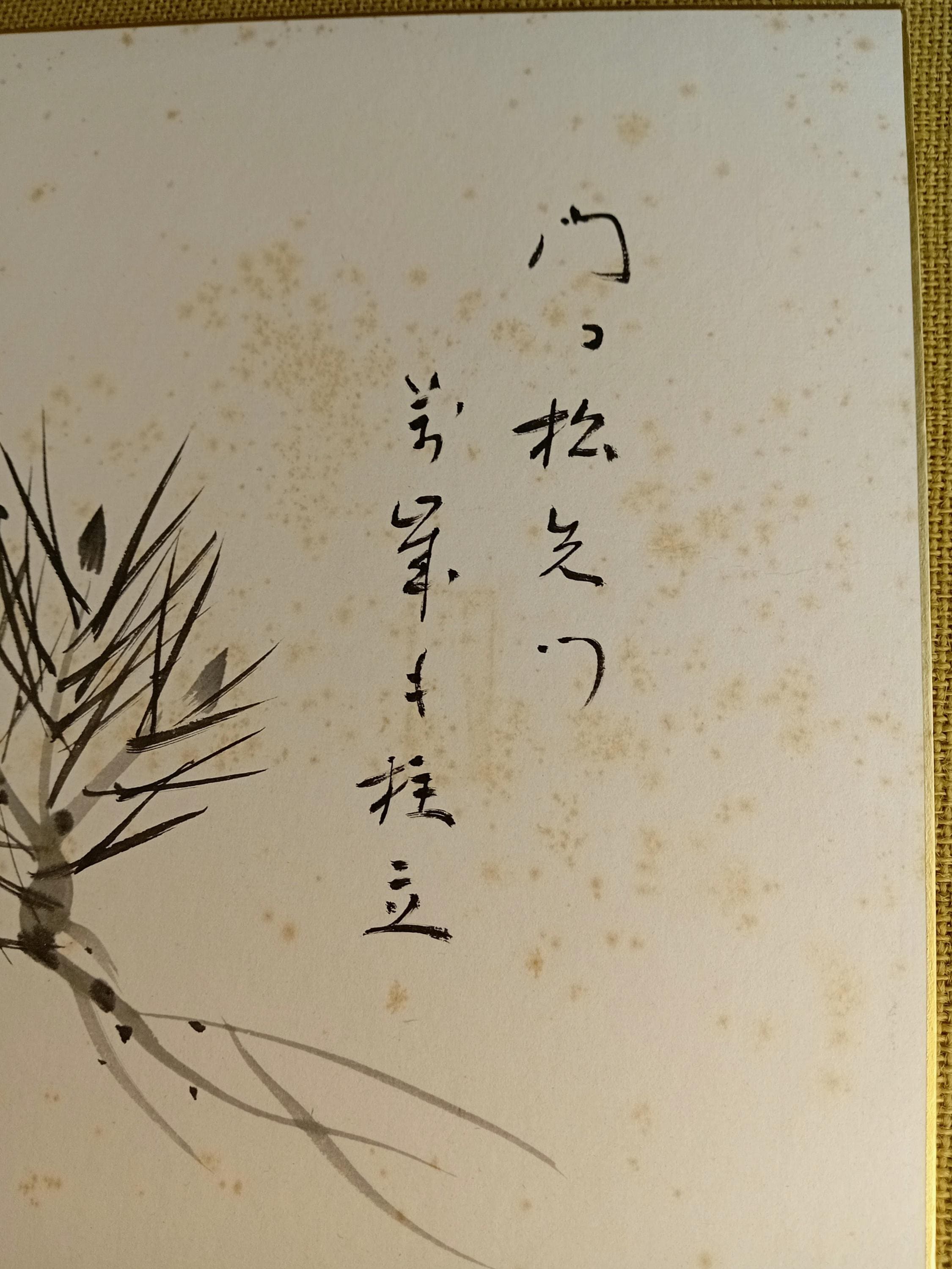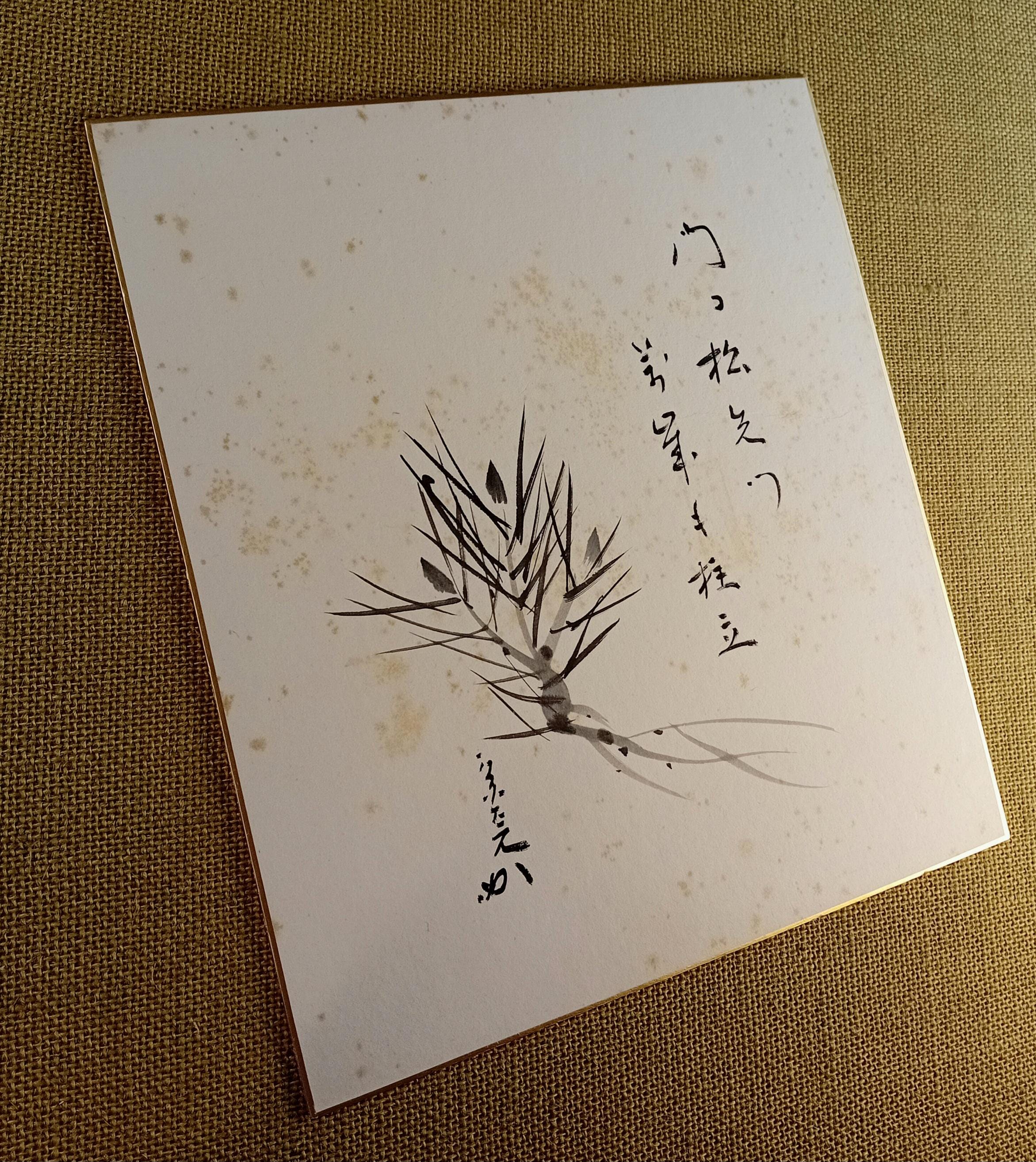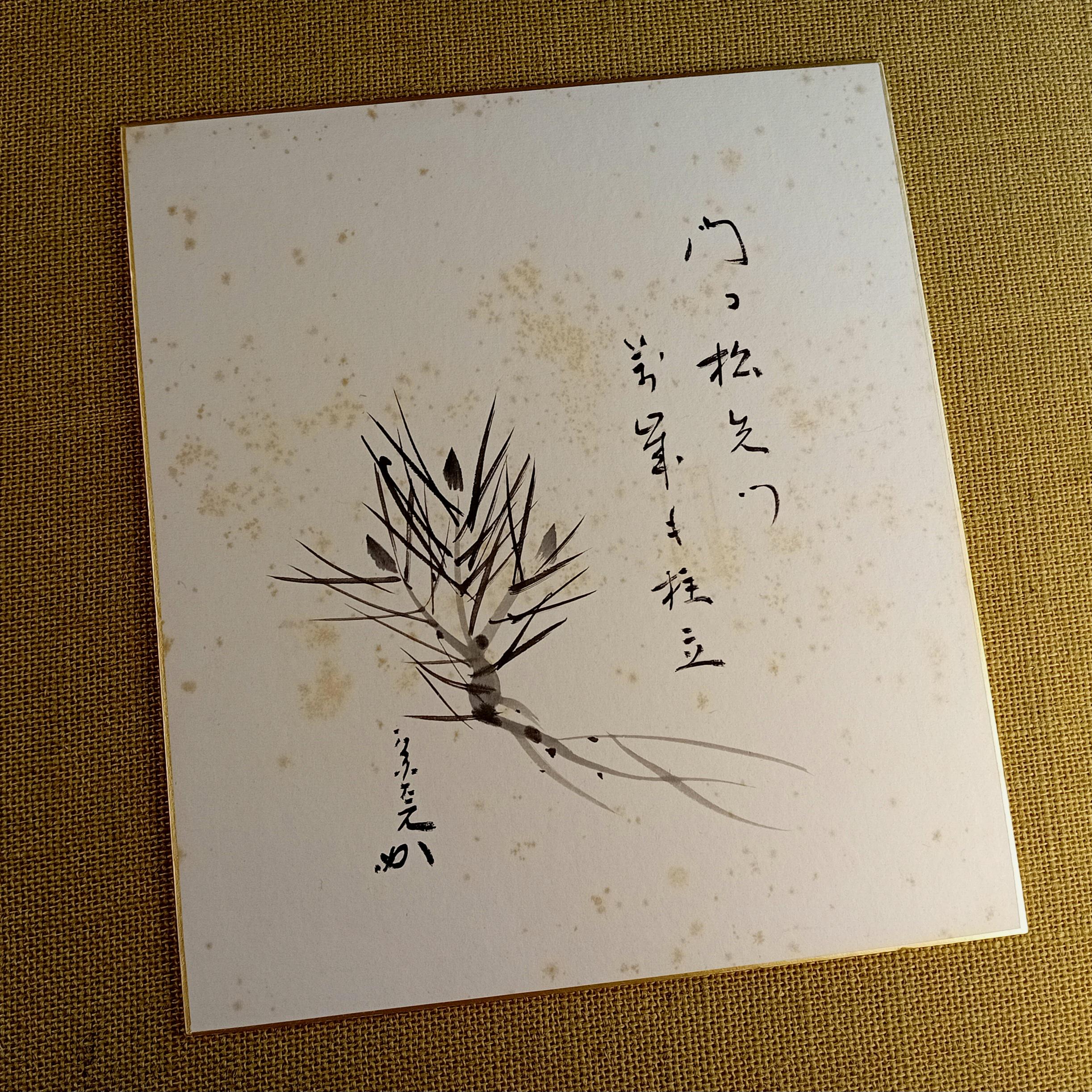 Ink painting on traditional shikishi. The work depicts a pine branch with young buds and a vertical calligraphic inscription written in a free semi-cursive manner. Pine motifs are a classic seasonal theme of the Shōwa period, associated with renewal and quiet resilience.
