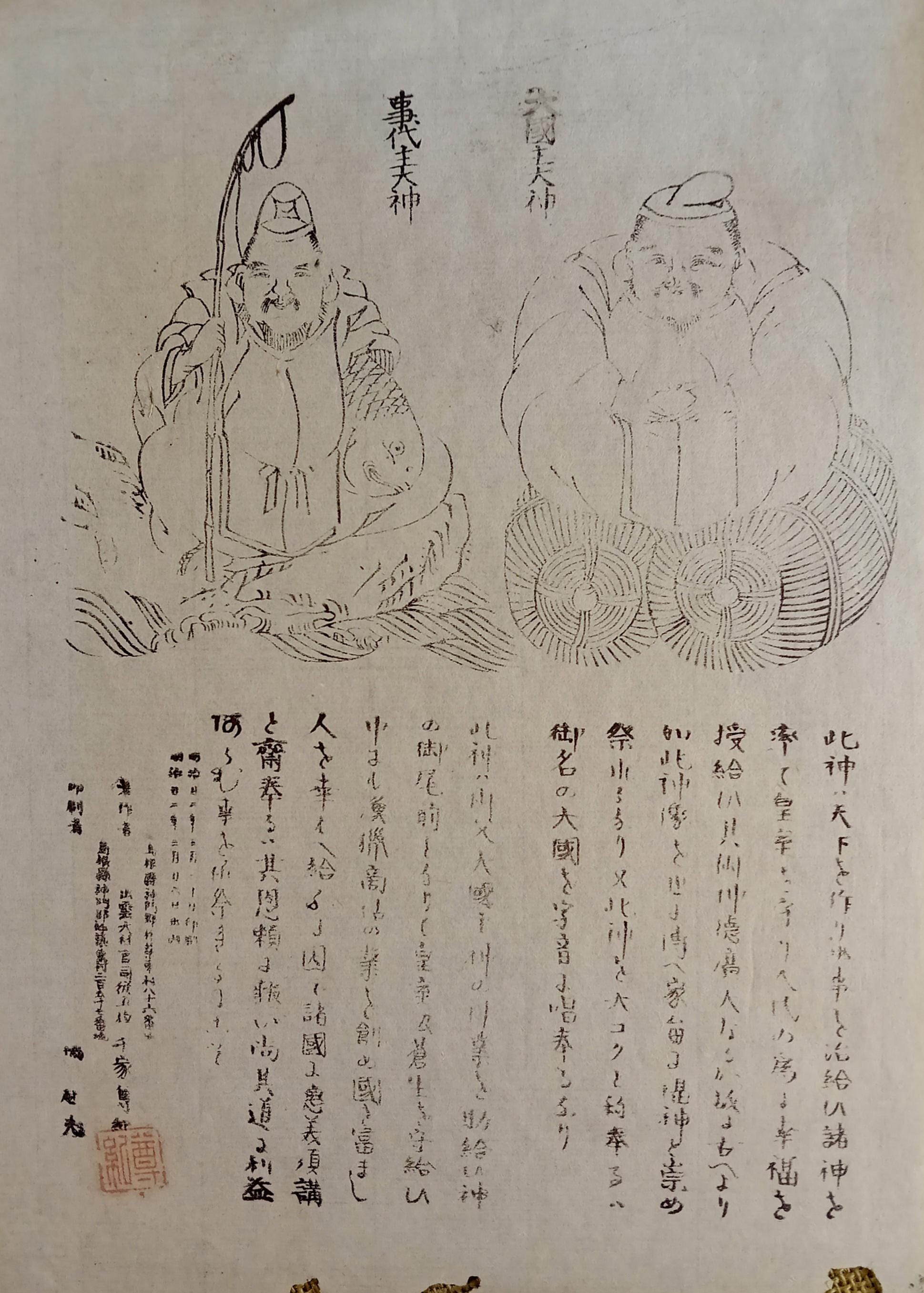 This sheet shows Ōkuninushi no kami (Daikoku) together with his son Kotoshironushi no kami (Ebisu), worshipped as paired gods of prosperity and protection.