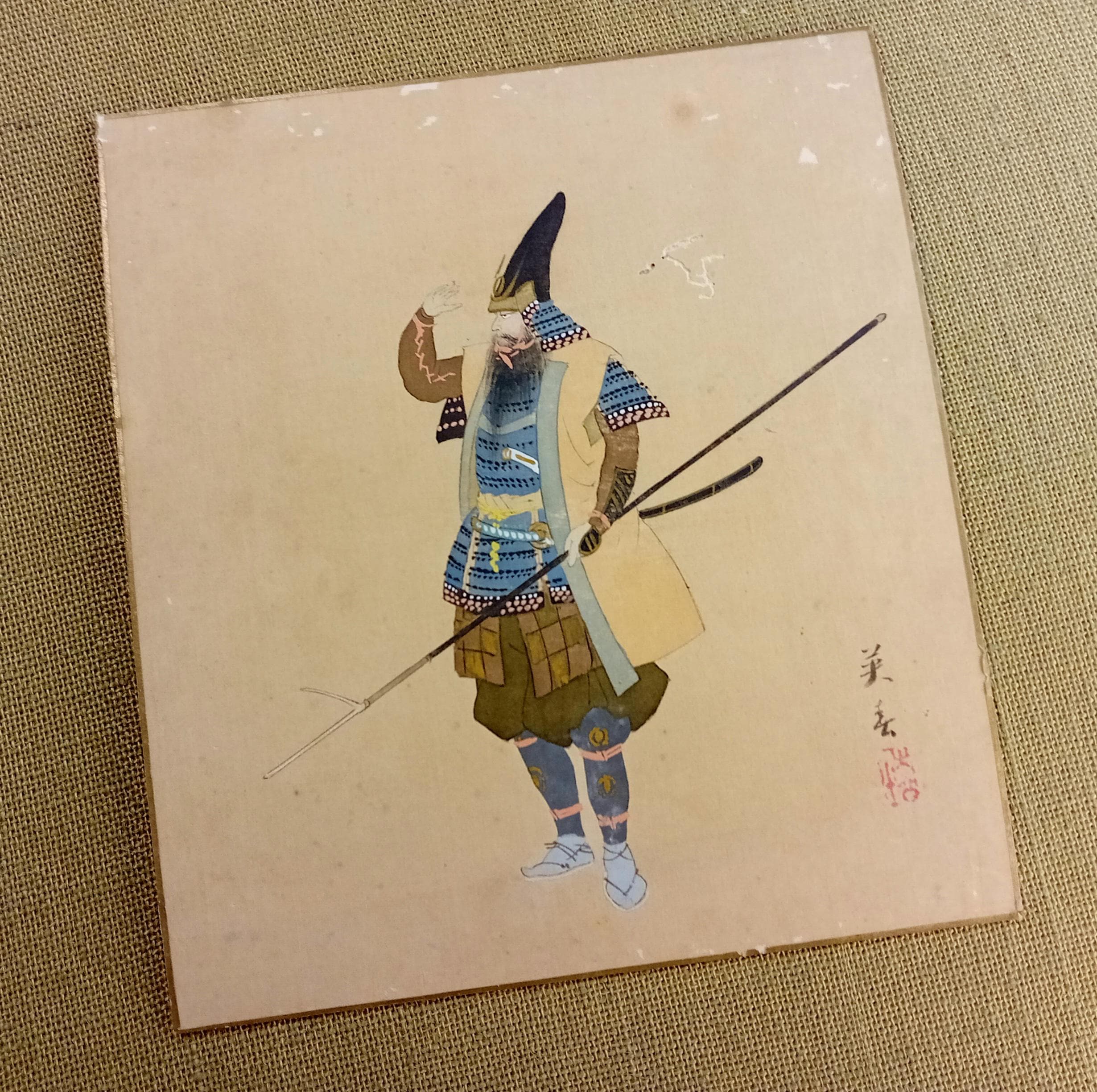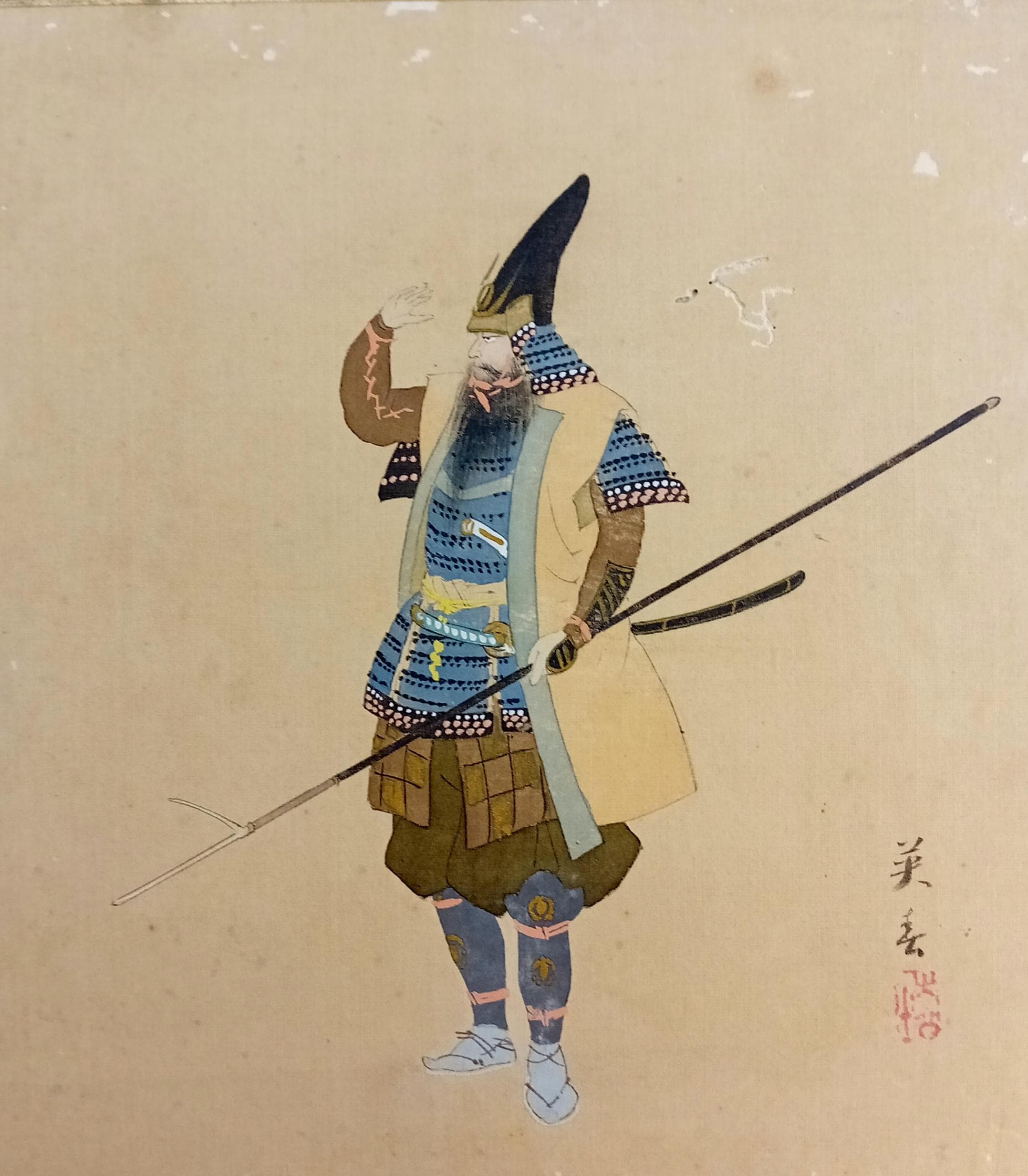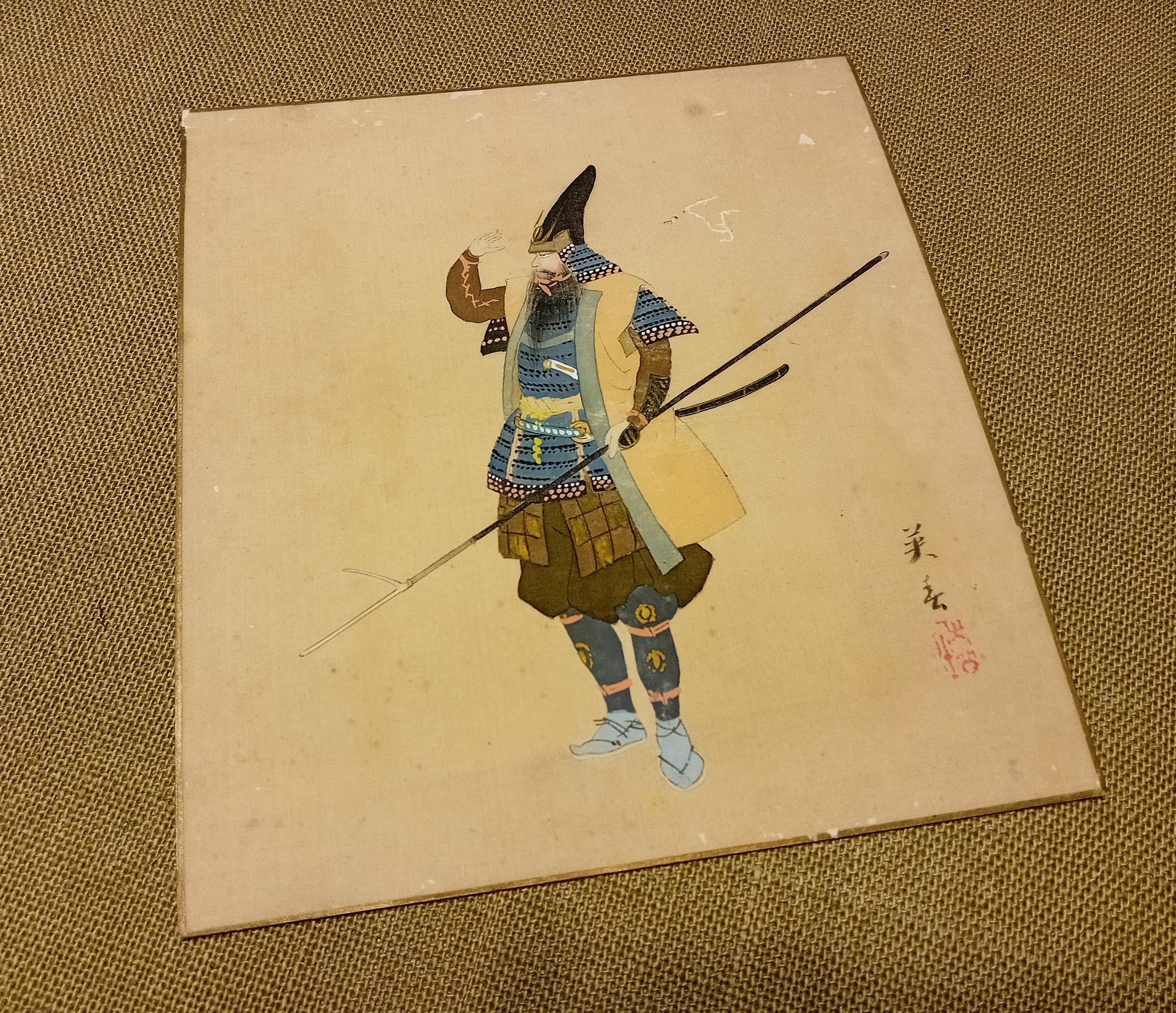 Japanese painting on silk shikishi depicting a samurai in full ō-yoroi armor with a naginata. The ceremonial eboshi-style hat and detailed armor suggest a historical or theatrical portrayal from the Heian–Muromachi tradition, painted in the Nihonga style around 1900–1920.