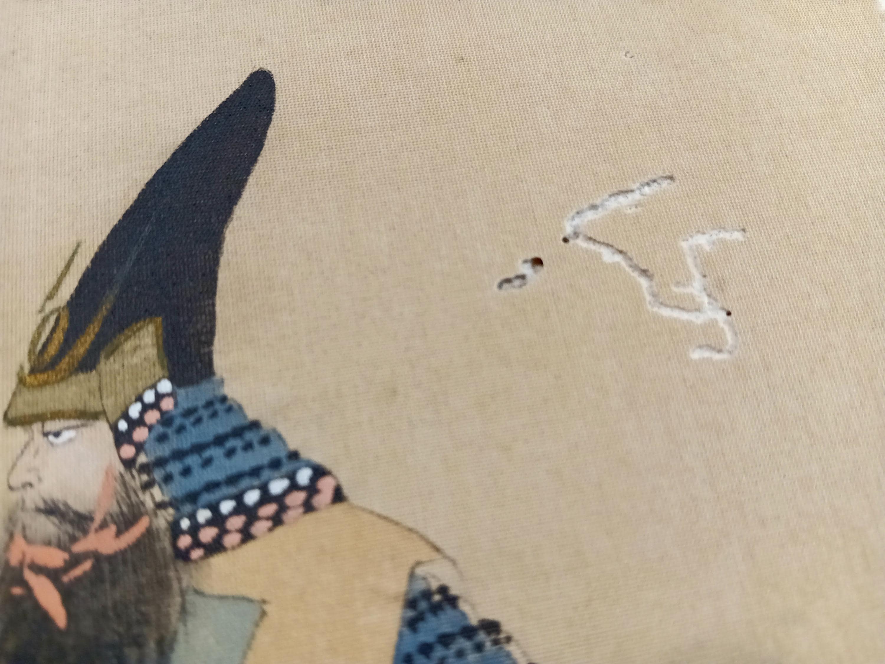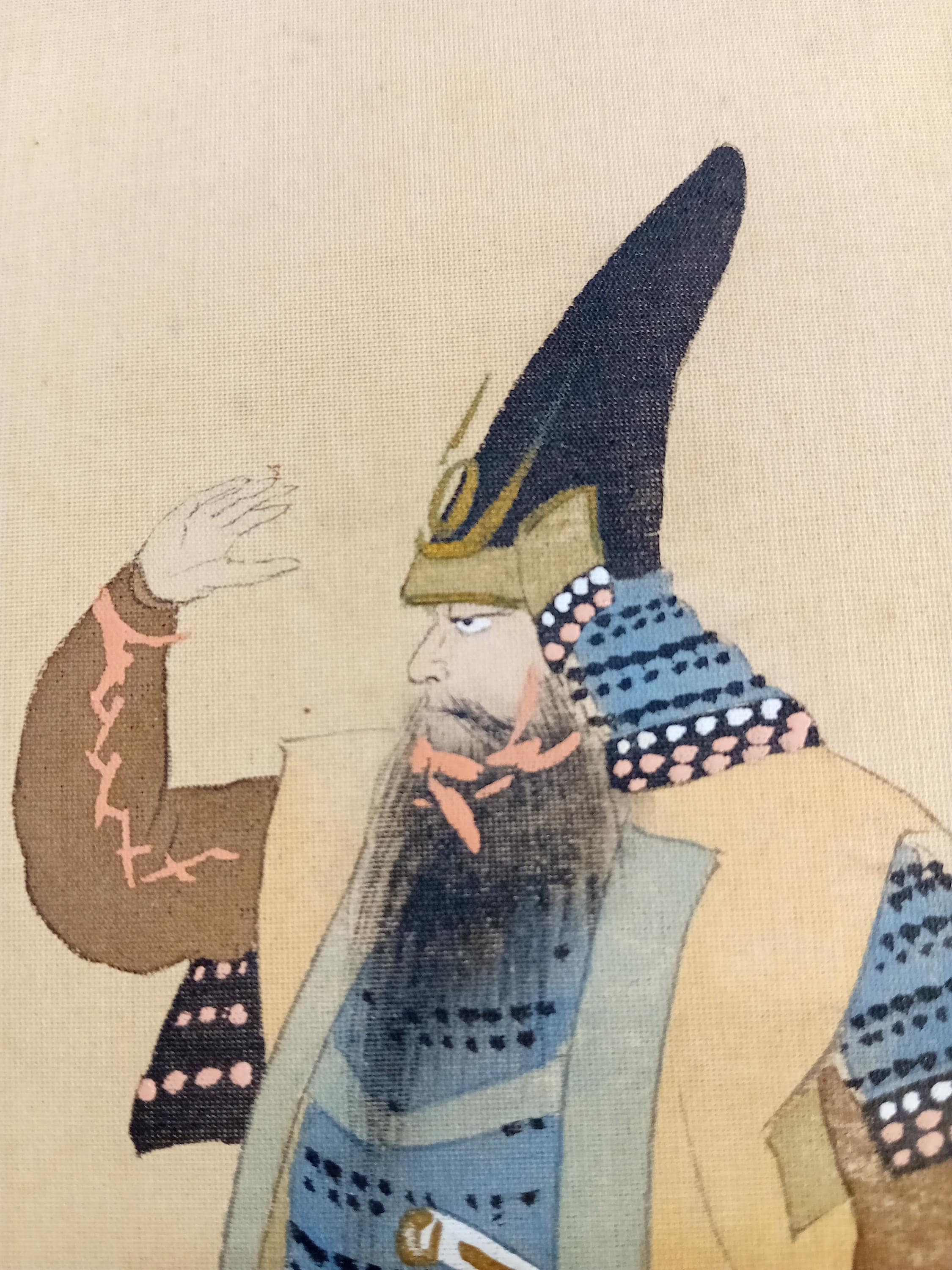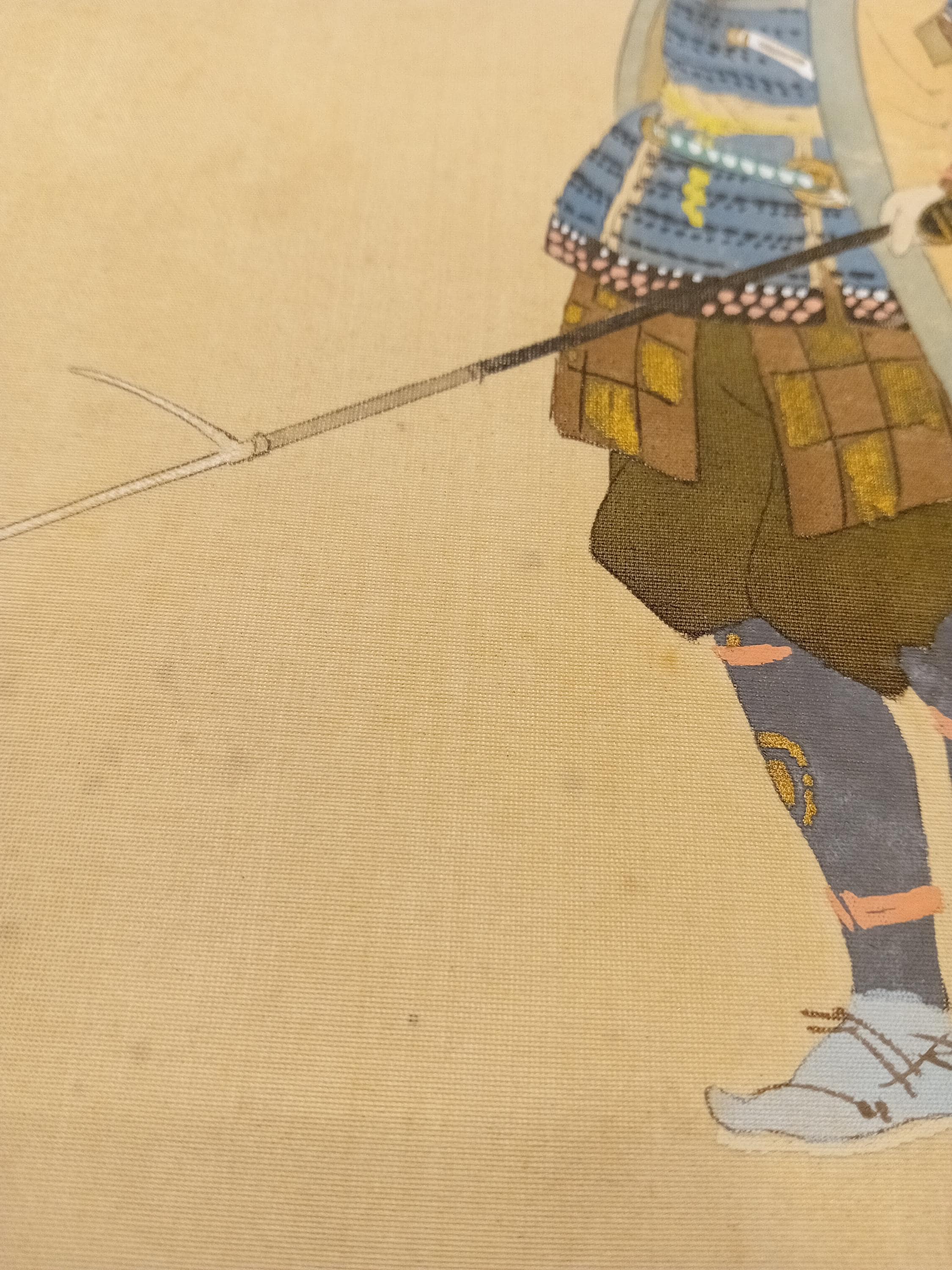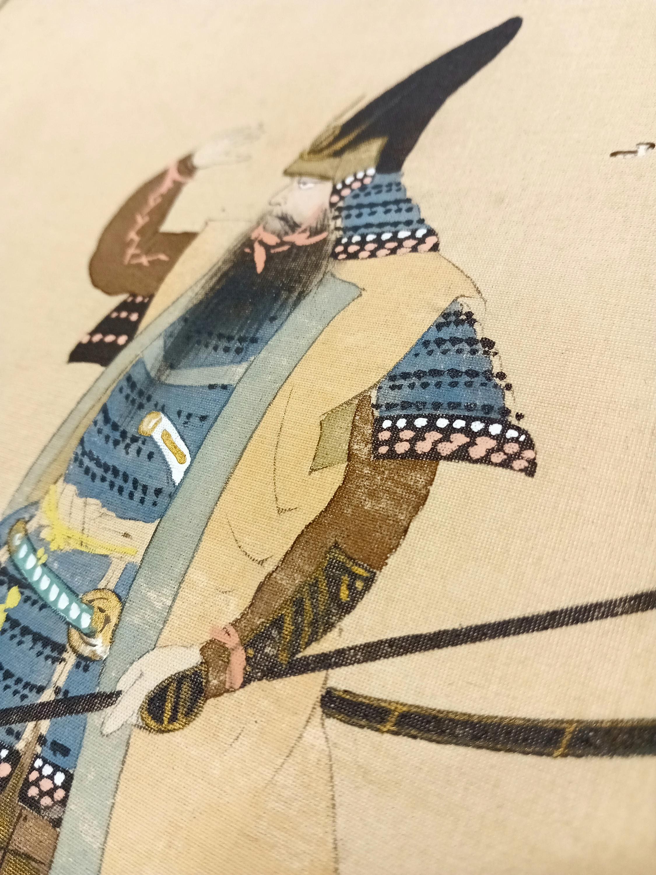 Japanese painting on silk shikishi depicting a samurai in full ō-yoroi armor with a naginata. The ceremonial eboshi-style hat and detailed armor suggest a historical or theatrical portrayal from the Heian–Muromachi tradition, painted in the Nihonga style around 1900–1920.