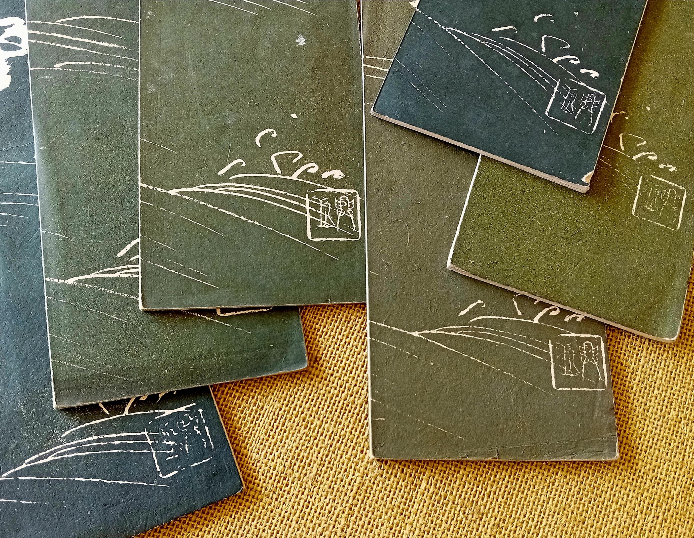 The covers share a unified style — matte paper with delicate white designs (waves, branches, mist) and calligraphic titles.
