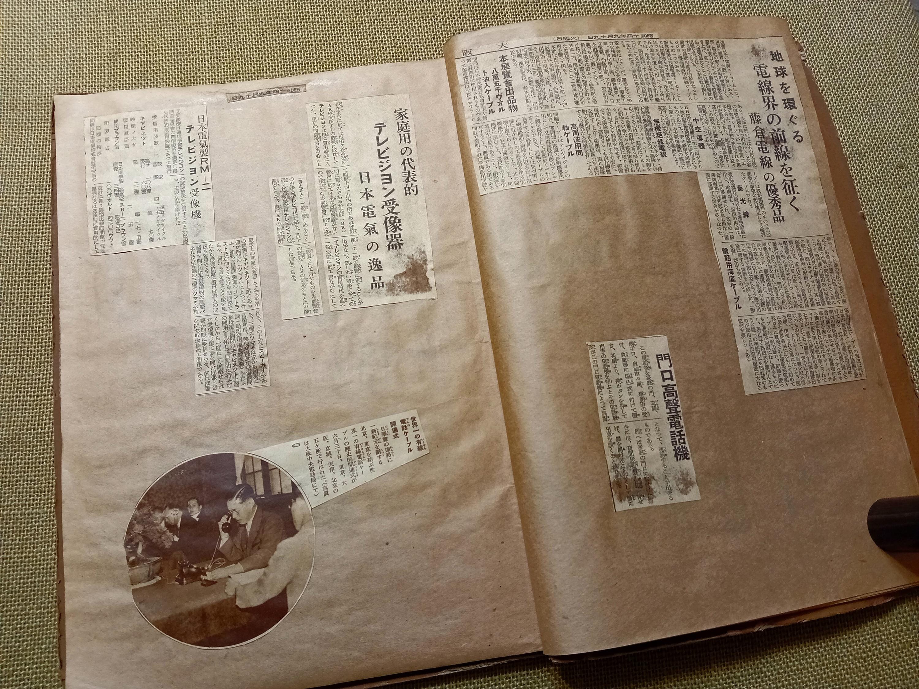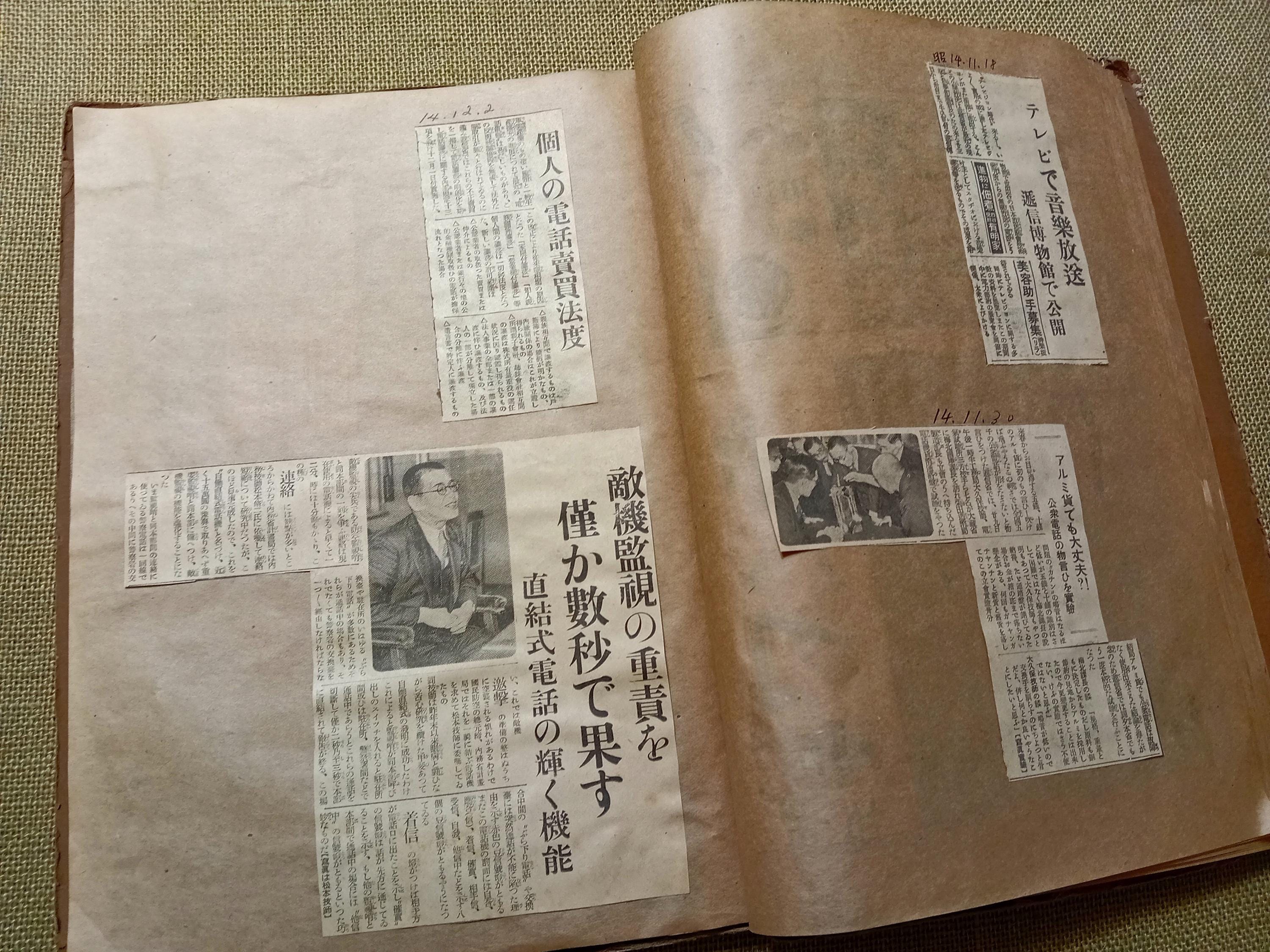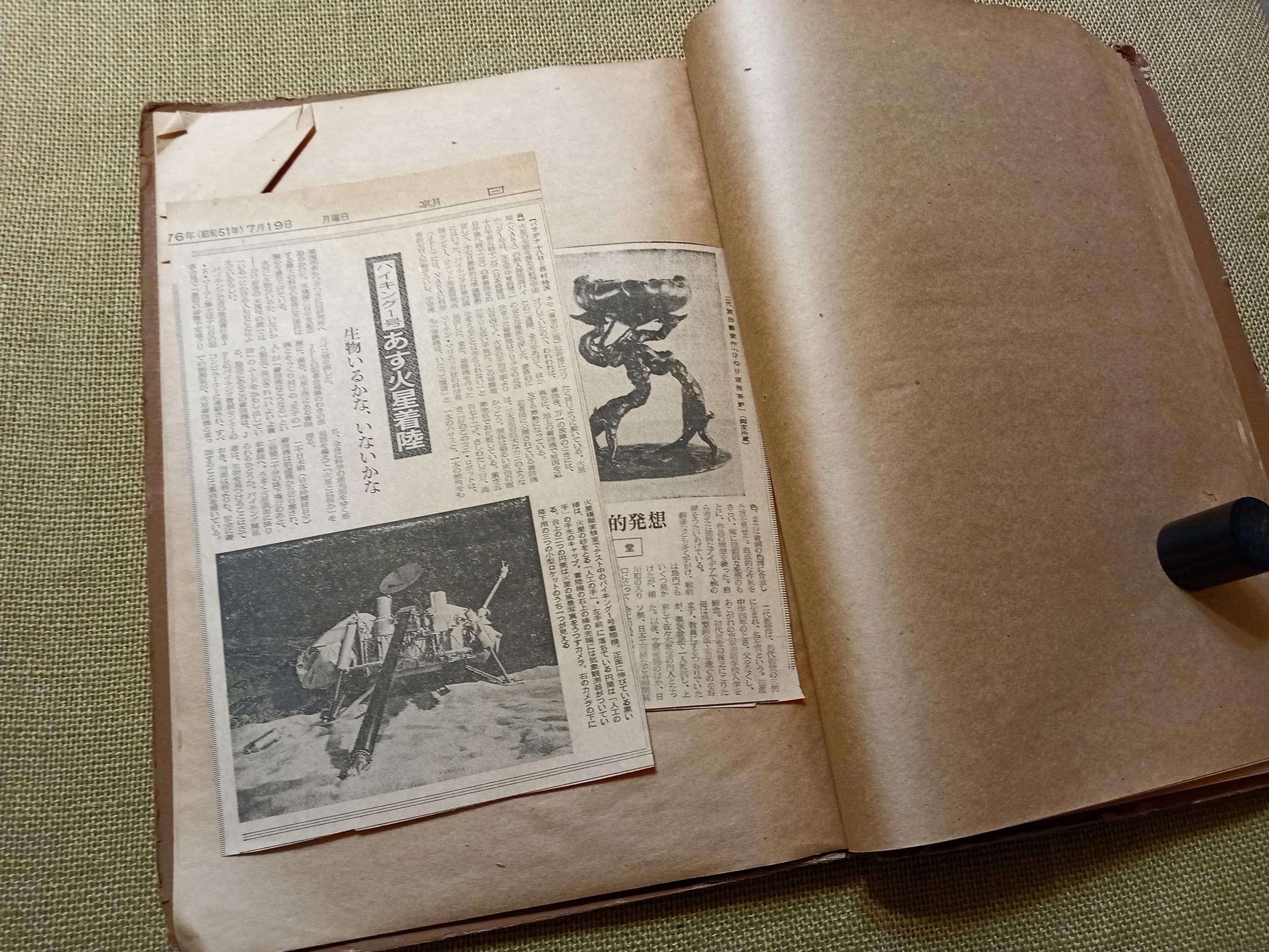 Created by a former engineer or collector, it includes over 70 pages of newspaper clippings, photos, and diagrams covering telephones, switchboards, NHK broadcasting, and NASA’s Viking 1 Mars landing.