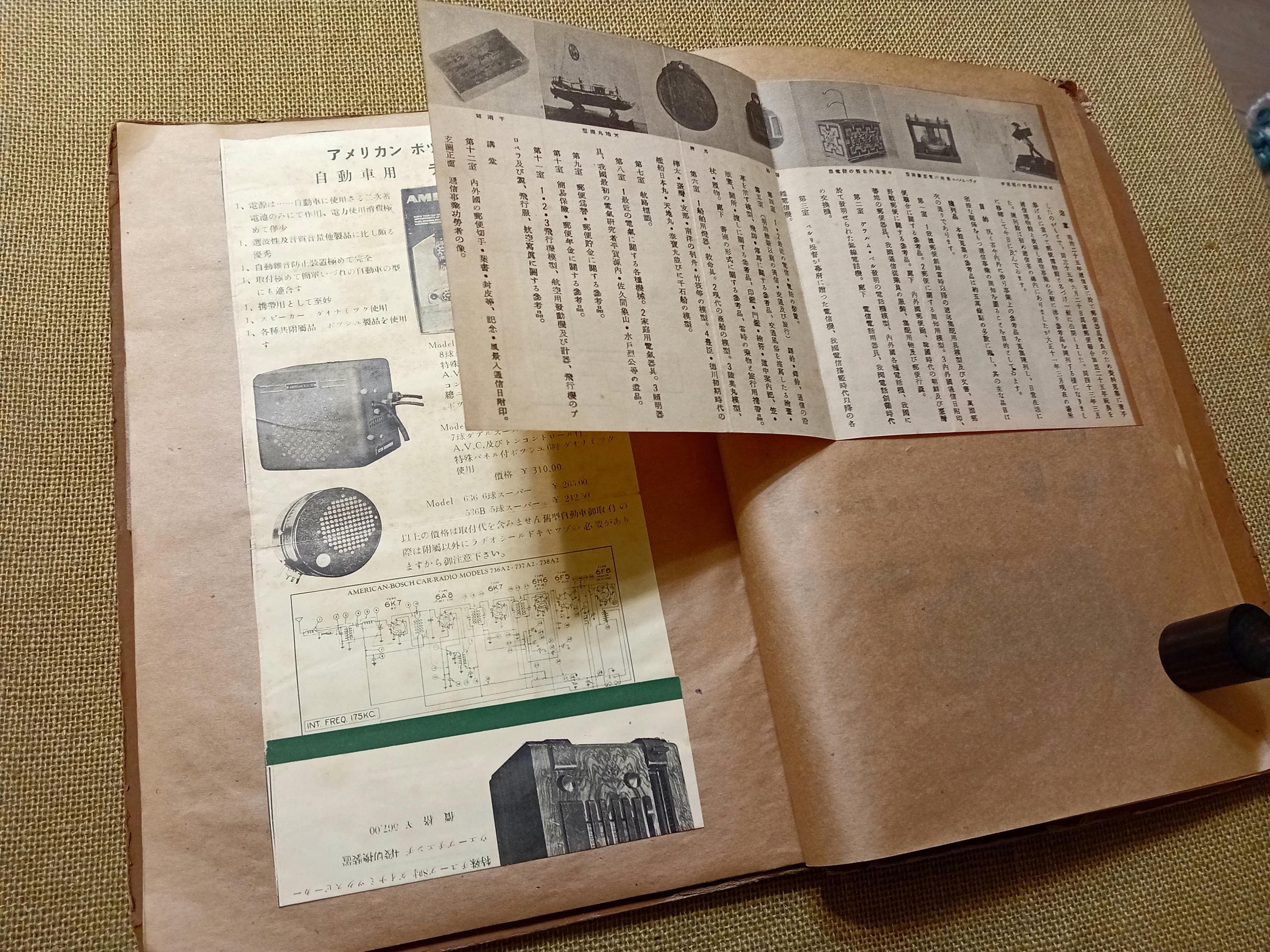 Features early Meiji–Shōwa newspaper typography, diagrams of rotary dial telephones, rare American Bosch car-radio circuit, and a 1954 broadcast tower photo.