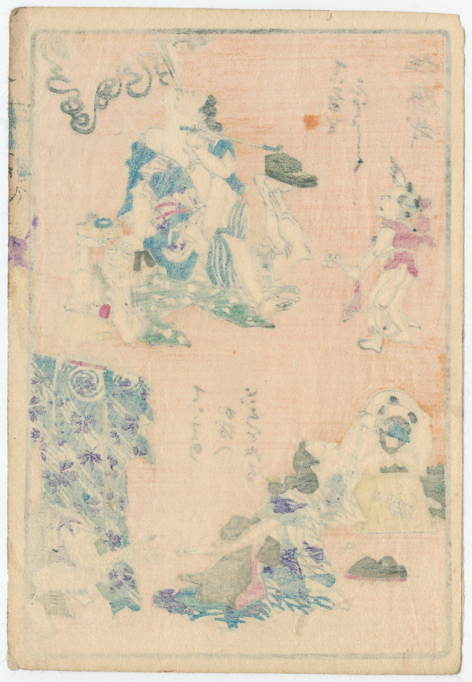 The series One Hundred Pictures by Kyosai was published twice in the 19th century: first in the 1860s and later in the 1880s. We tend to attribute this impression to the first edition (ca. 1863–1866), characterized by vivid color, fine linework, and lively brush energy.