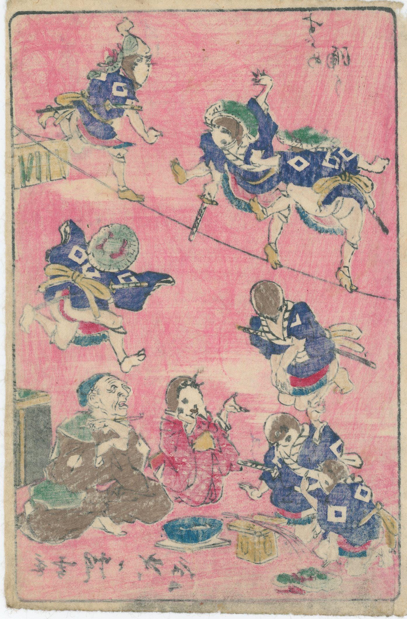 Kyosai captures popular festival theatre as comic pageant: quick sparrow-like steps, rhythmic poses and playful masks turn everyday entertainment into a satirical vignette about exuberance, fatigue and the bustle of urban pleasure. It is a quintessential Hyakuzu moment where folk culture meets sharp observation.