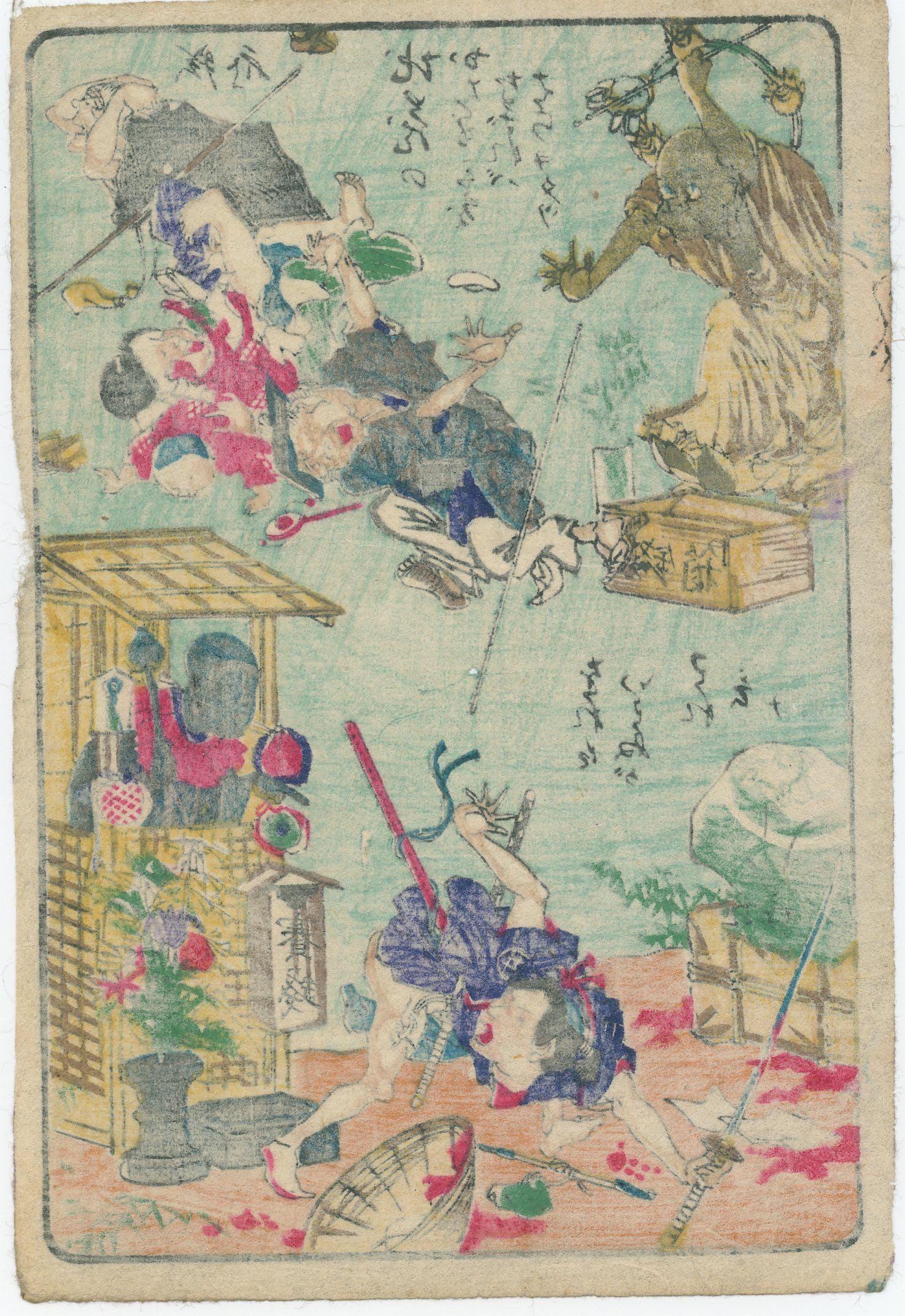 The proverb means that even the most patient person has limits. Kyosai transforms this moral teaching into grotesque humor, parodying human insolence toward faith and divine restraint.