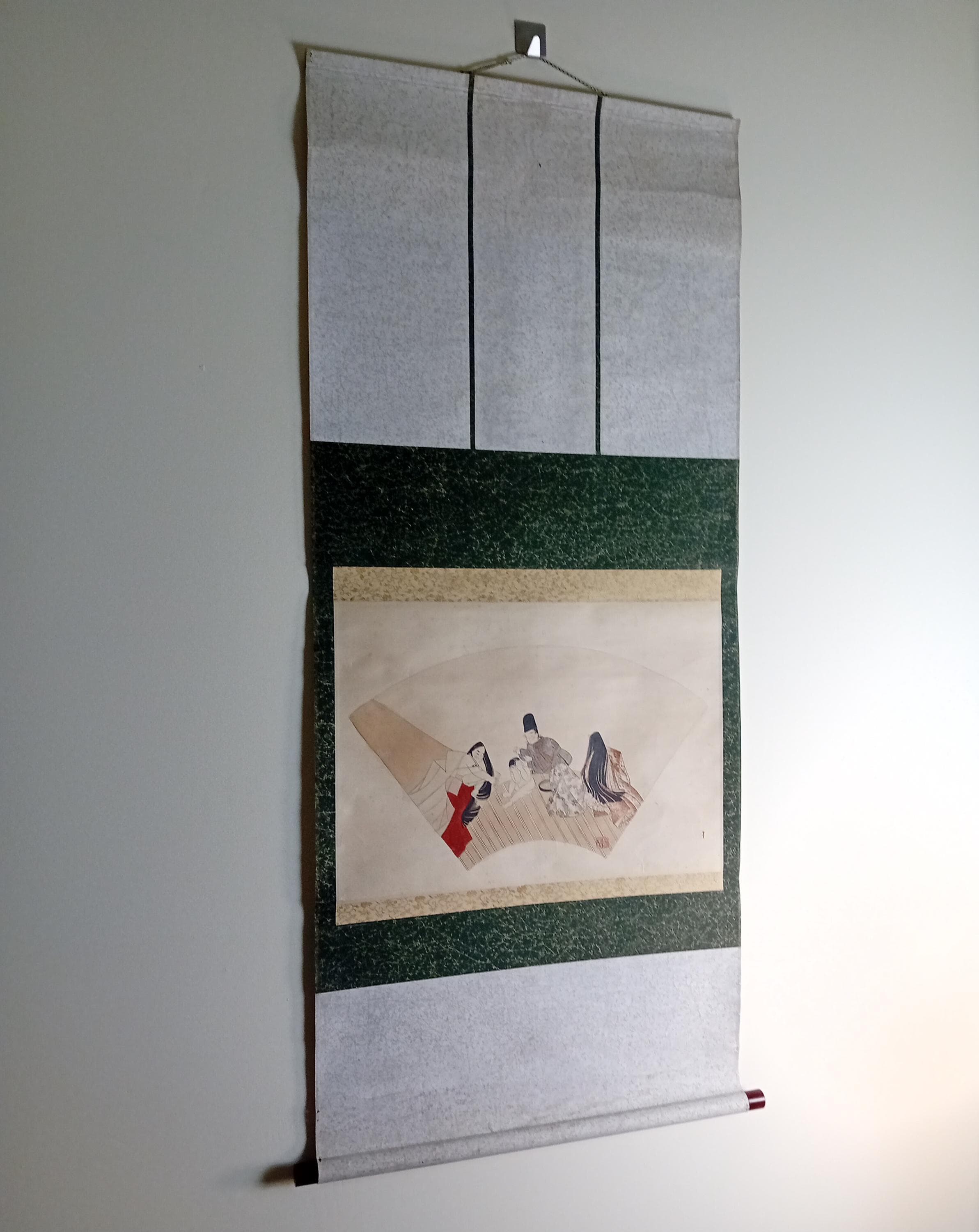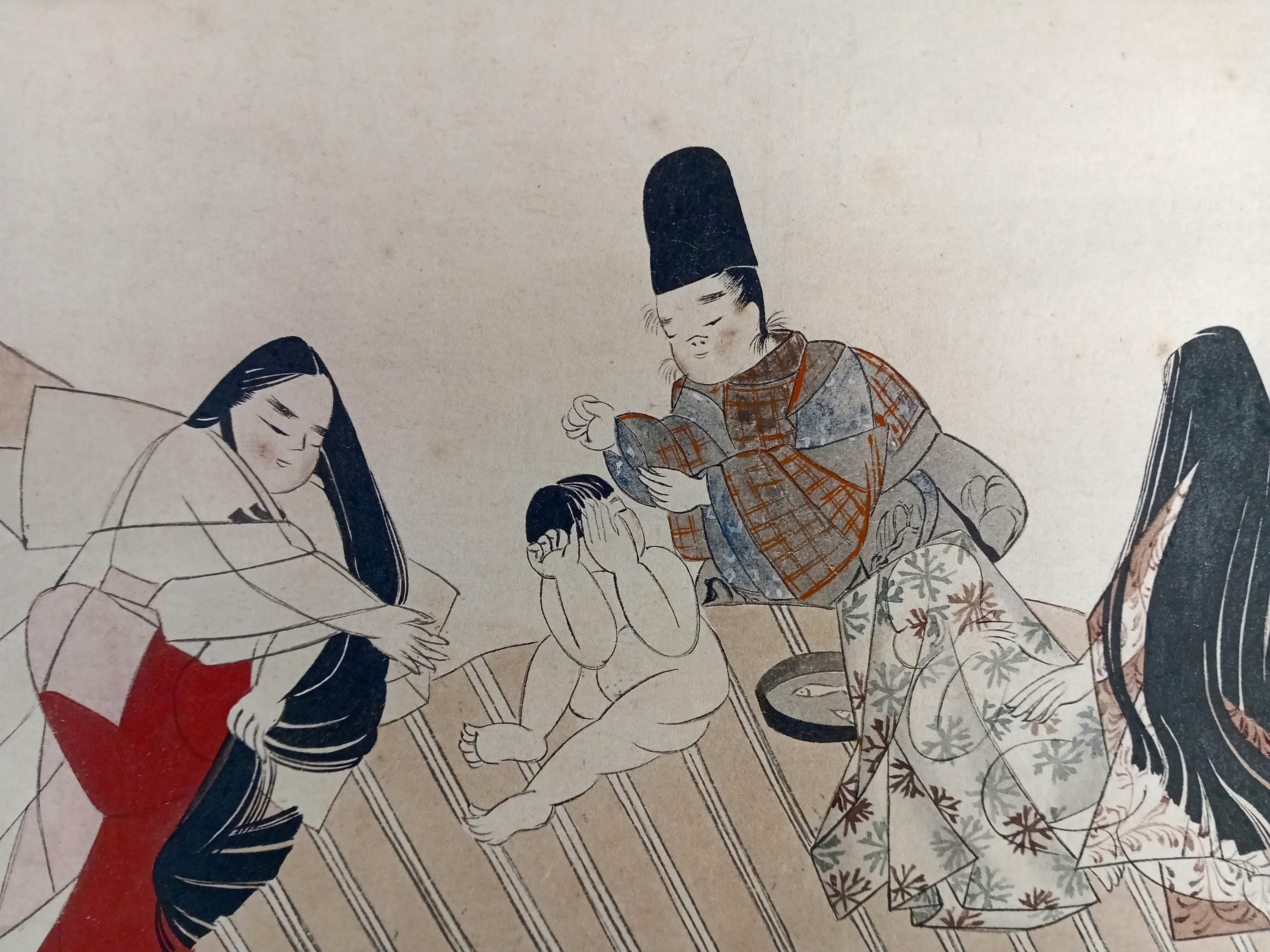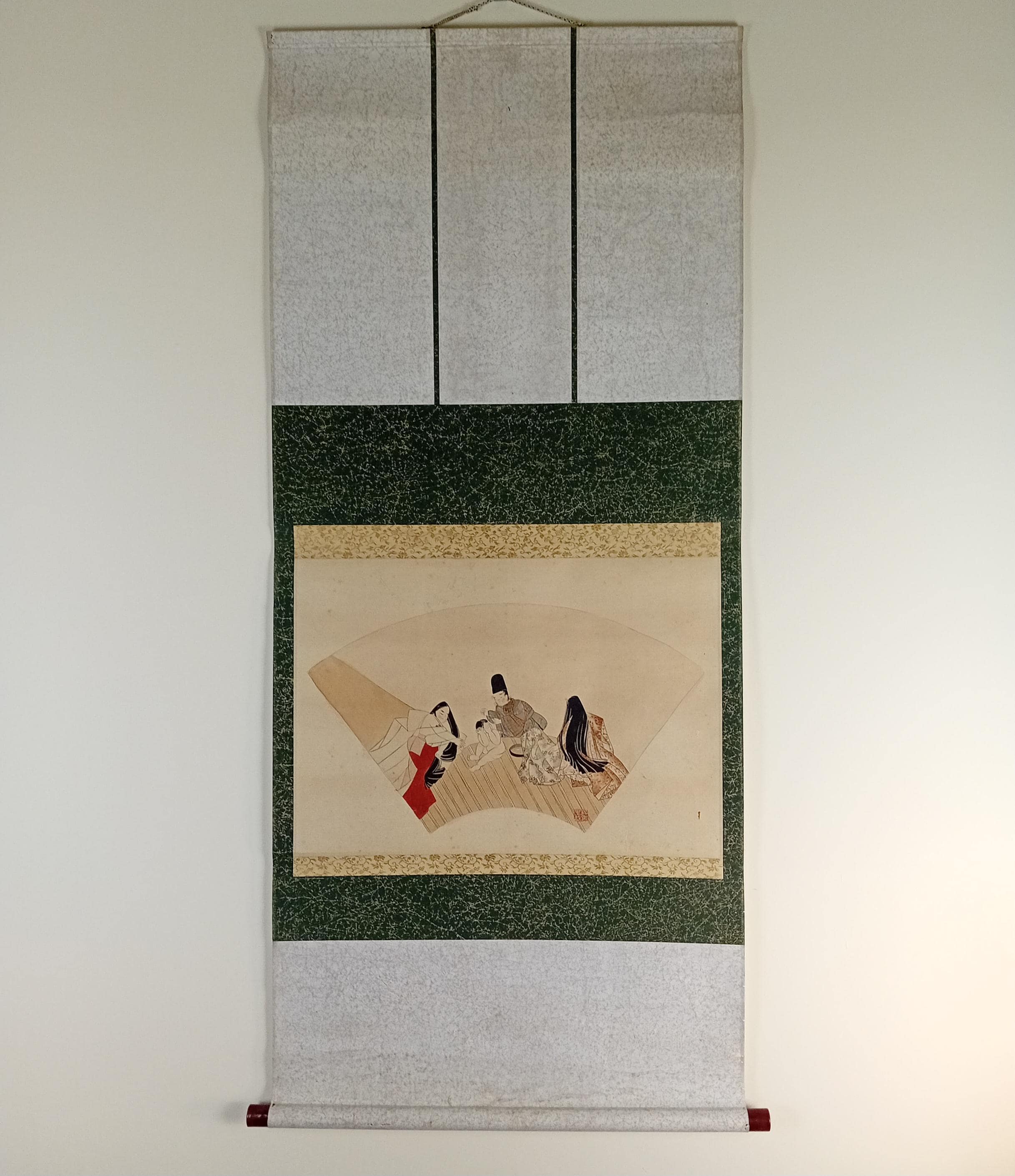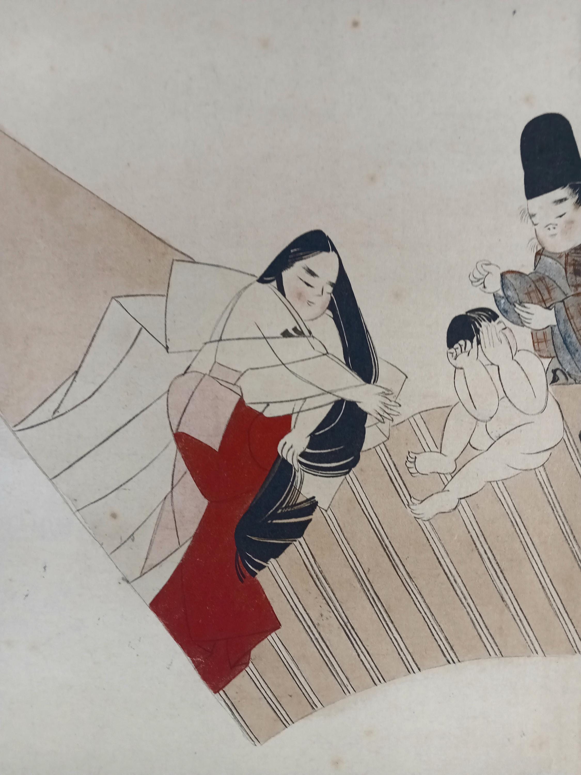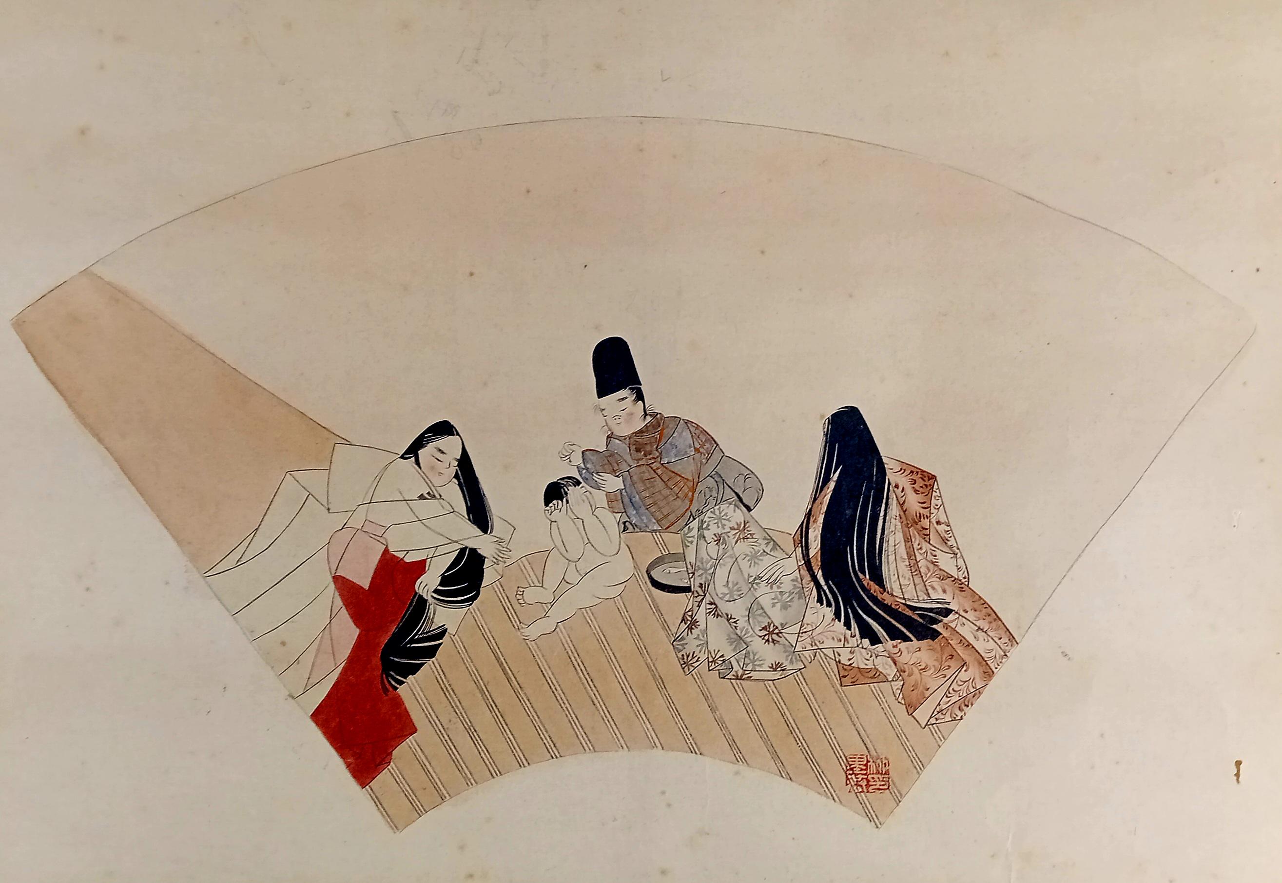 Fan-shaped scene of Heian-style courtly life, painted by Yanagi Riun (art-name Unrin). Depicting a noble family and a child in a peaceful domestic moment, this refined work embodies the Kyoto Yamato-e revival of the early Shōwa period (ca. 1920–1935). Executed with mineral pigments on washi paper, it shows the artist’s delicate sense of balance and detail. Under close light, the initial child sketch (shitagaki) is faintly visible beneath the kimono layer — a rare and poetic trace of the creative process.