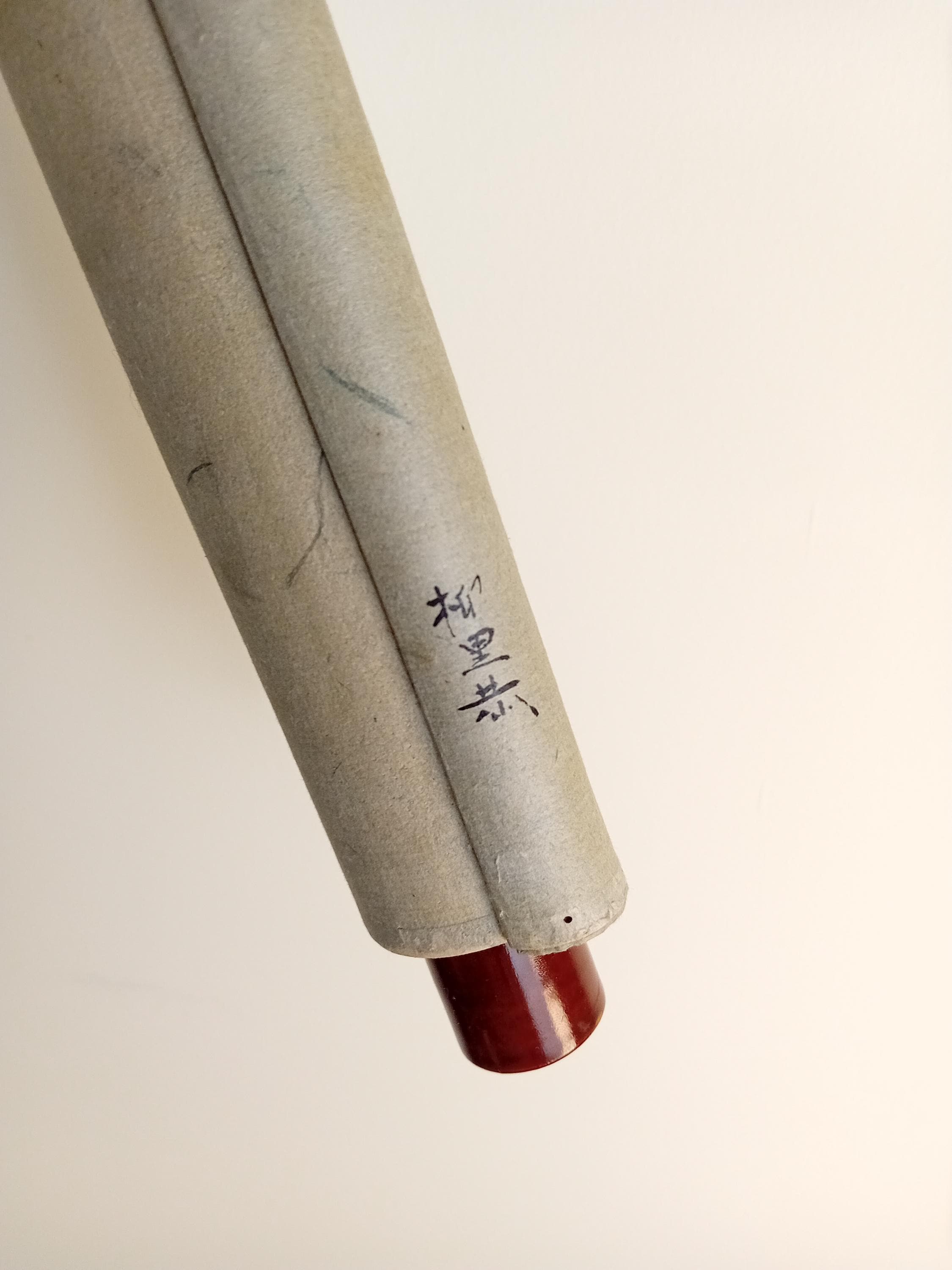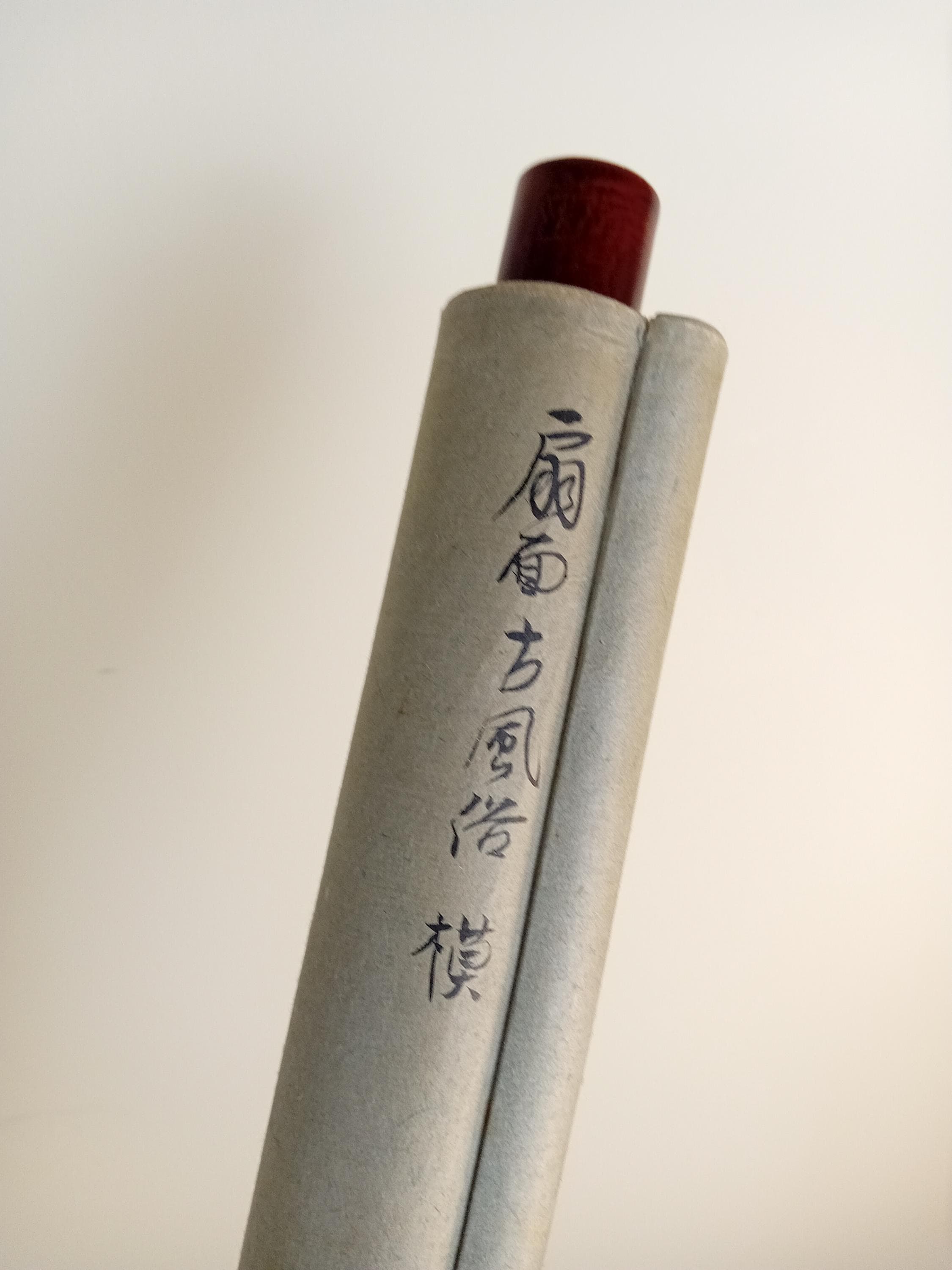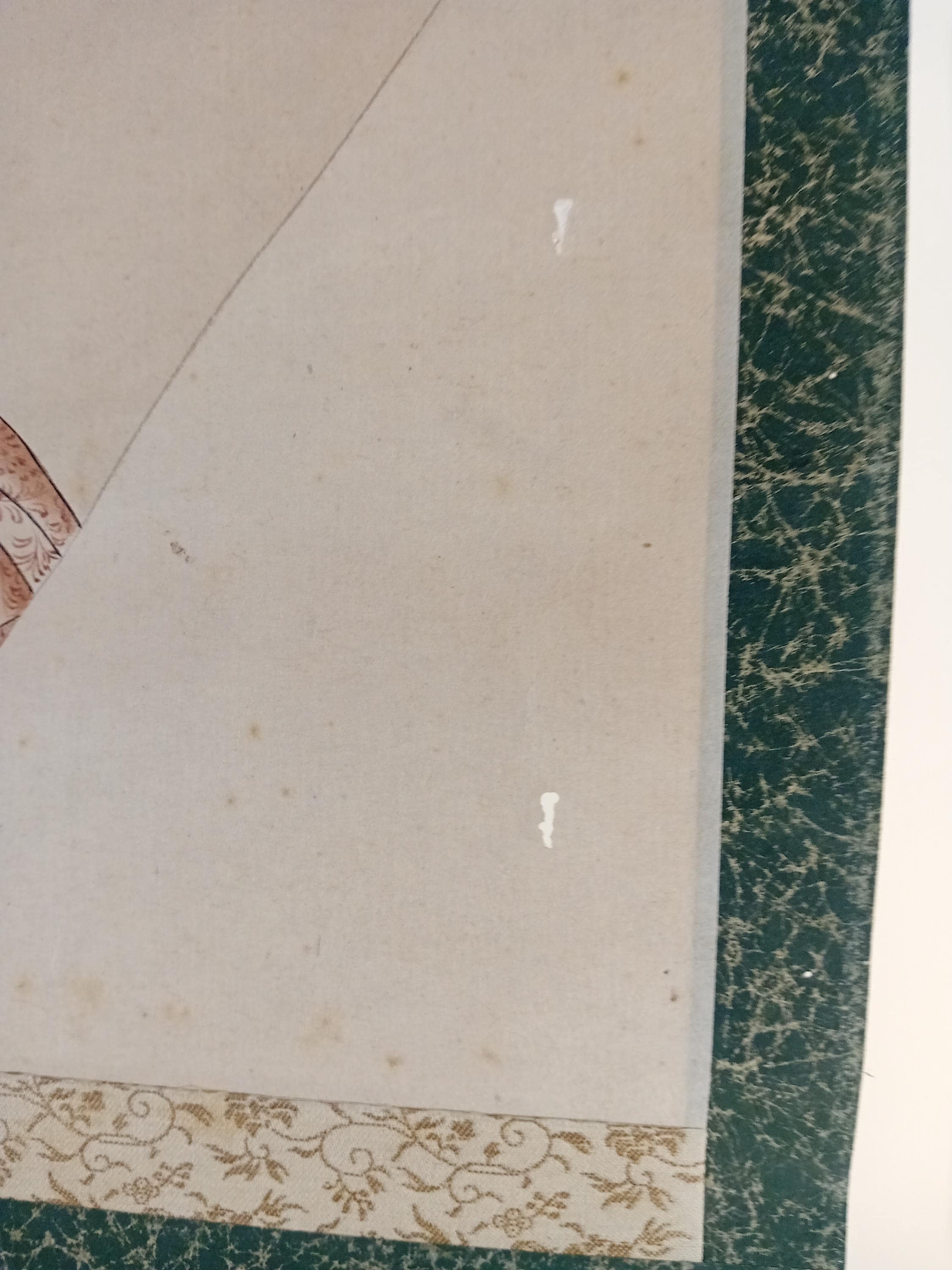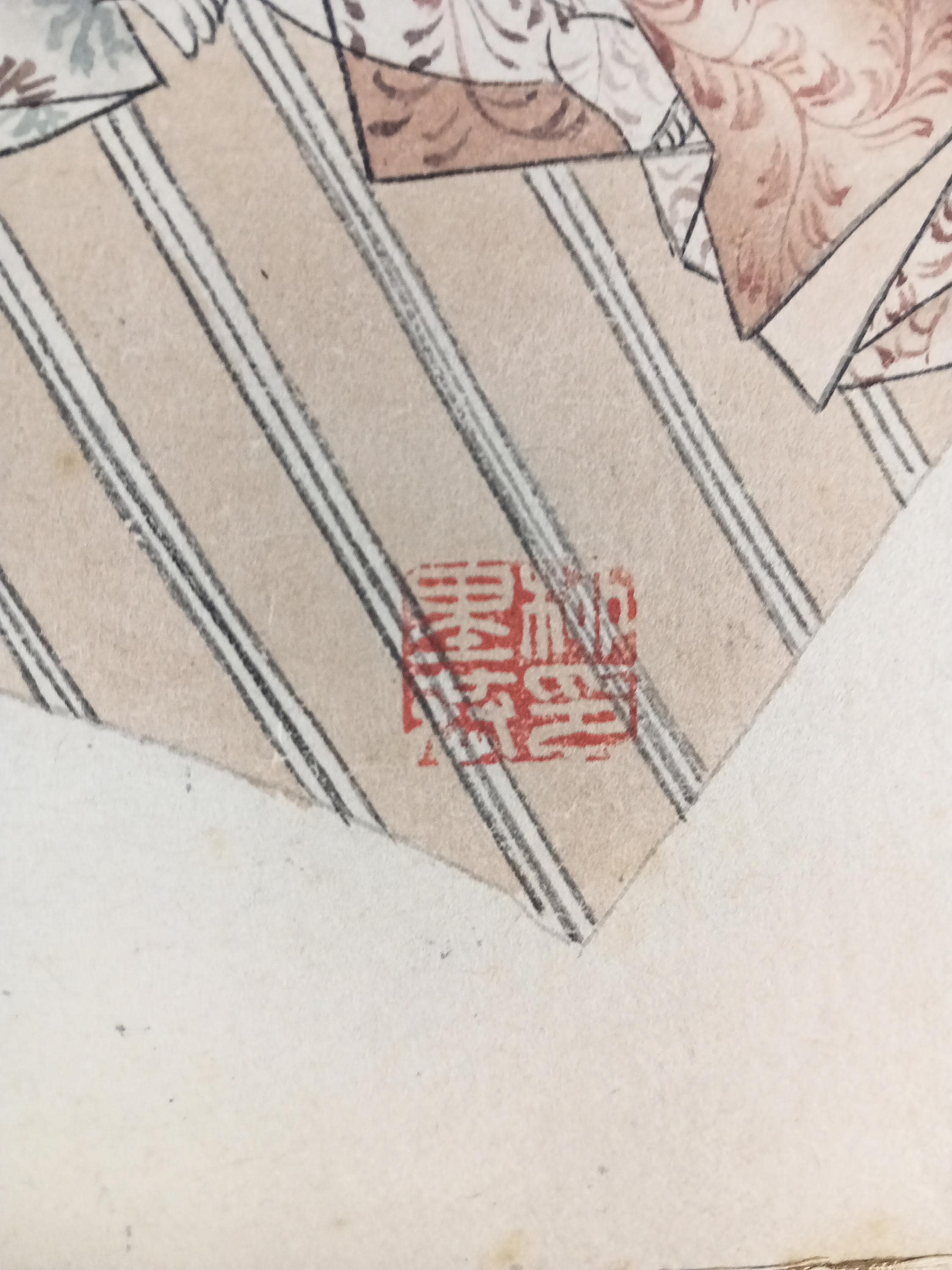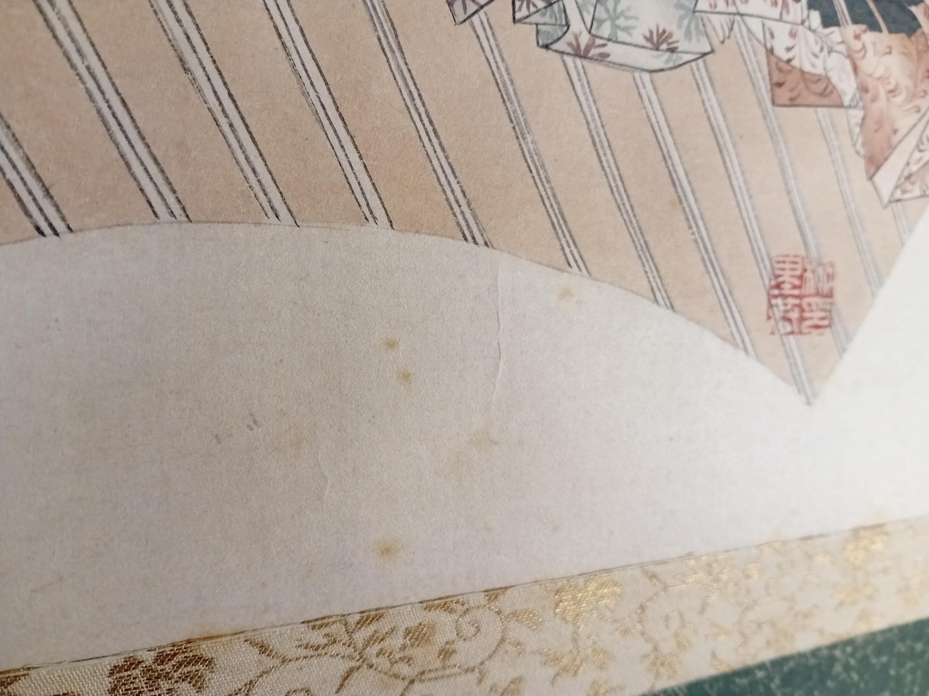 Fan-shaped scene of Heian-style courtly life, painted by Yanagi Riun (art-name Unrin). Depicting a noble family and a child in a peaceful domestic moment, this refined work embodies the Kyoto Yamato-e revival of the early Shōwa period (ca. 1920–1935). Executed with mineral pigments on washi paper, it shows the artist’s delicate sense of balance and detail. Under close light, the initial child sketch (shitagaki) is faintly visible beneath the kimono layer — a rare and poetic trace of the creative process.