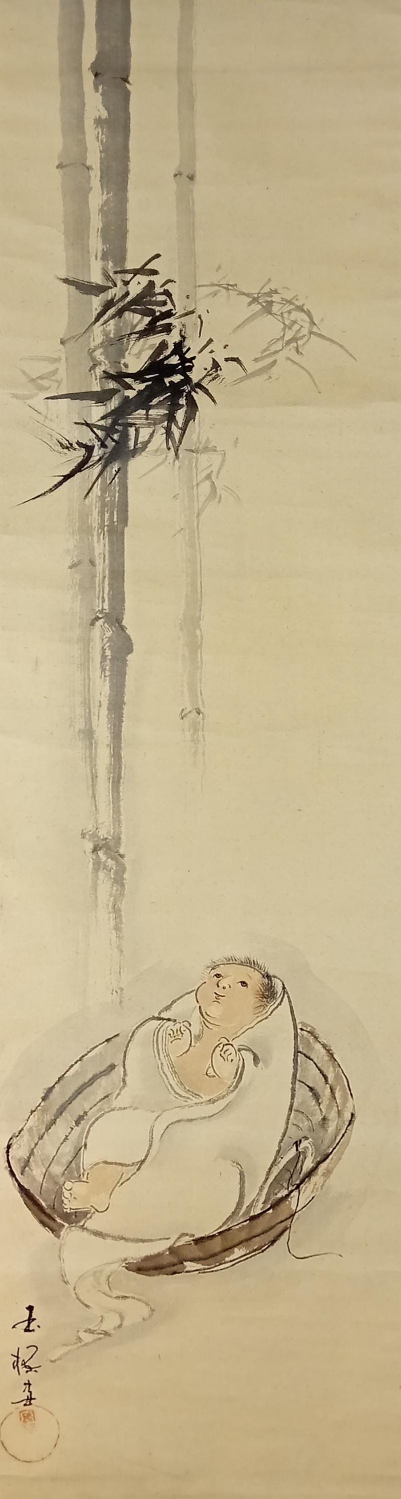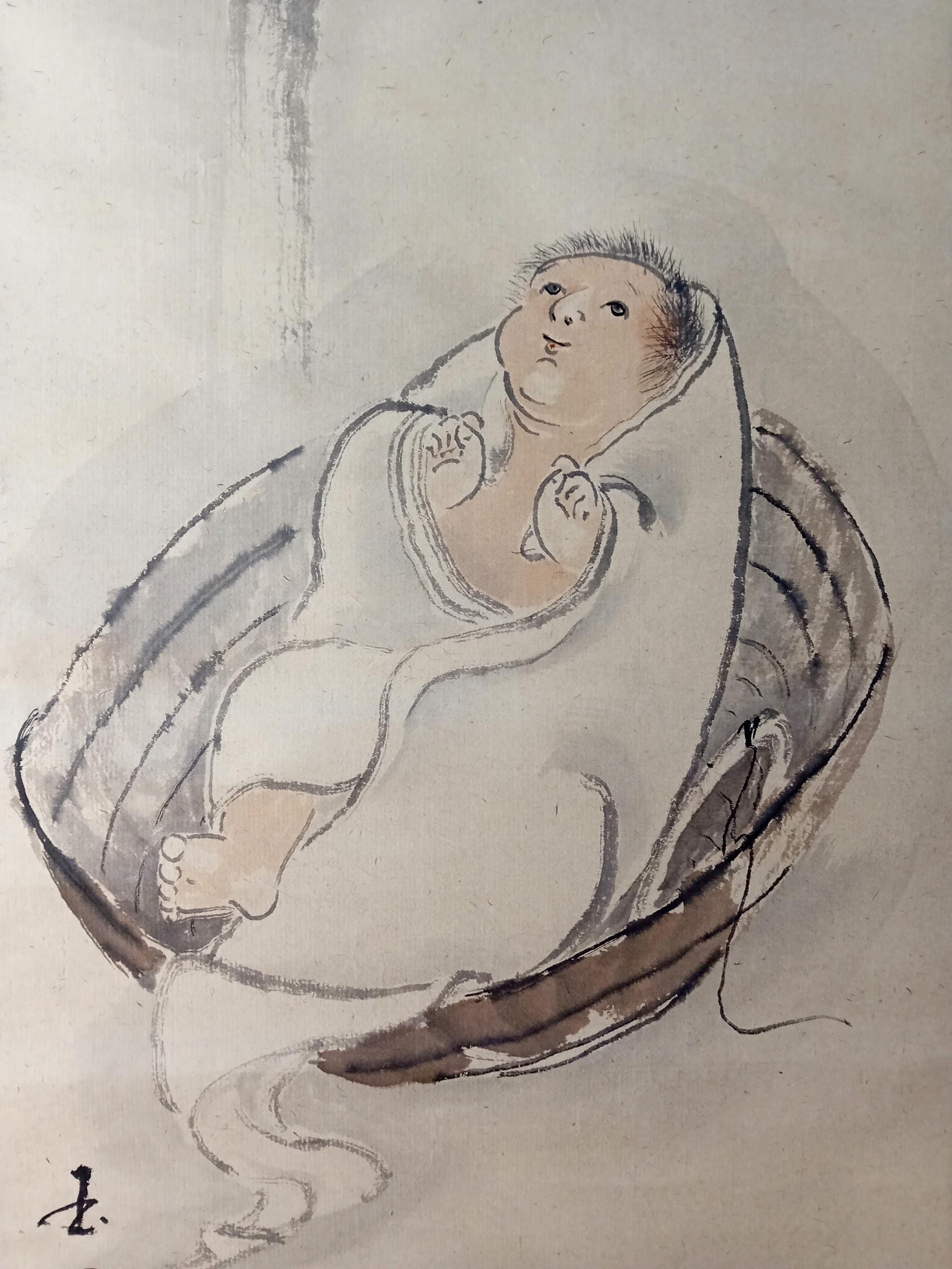 Ink painting with a light wash on paper. A quiet composition: a newborn wrapped in cloth lies in a round basket next to bamboo stalks. The line is soft and free, in the traditional sumi-e manner.