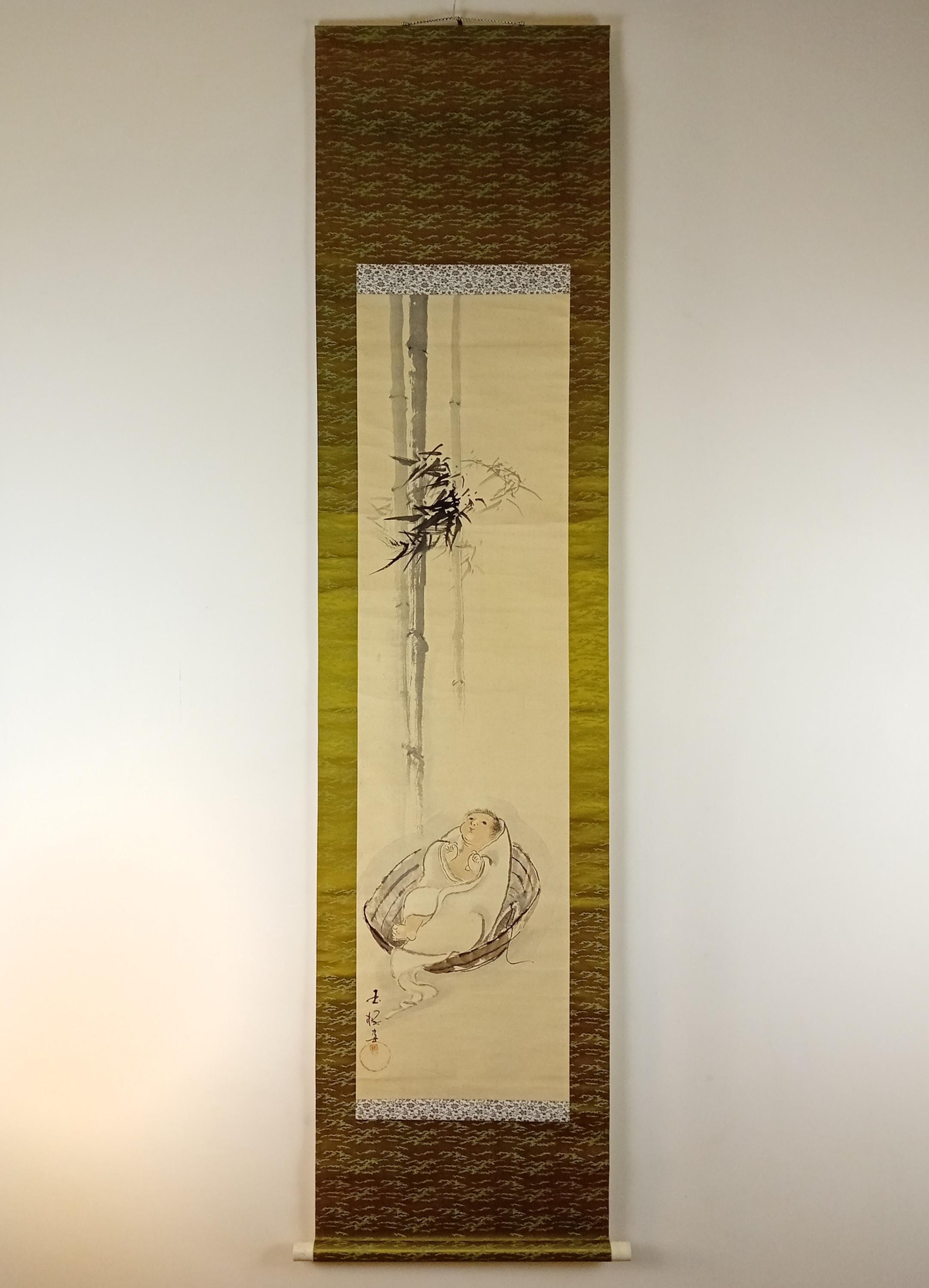 The scene refers to the birth motif of Princess Kaguya from the classic Tale of the Bamboo Cutter (Taketori Monogatari), where a child appears among bamboo and is found cradled in a vessel. Presented here in a gentle, domestic interpretation.