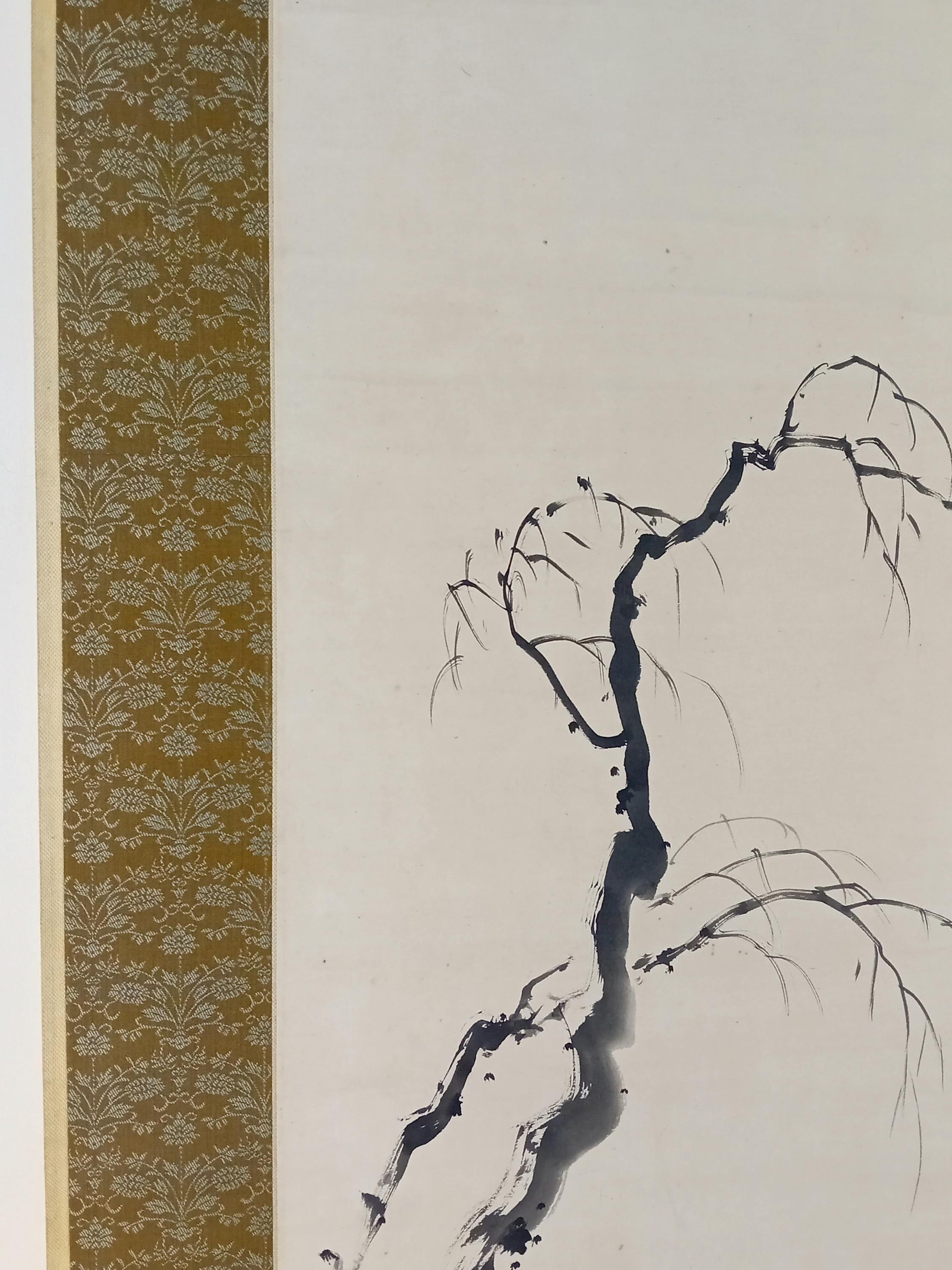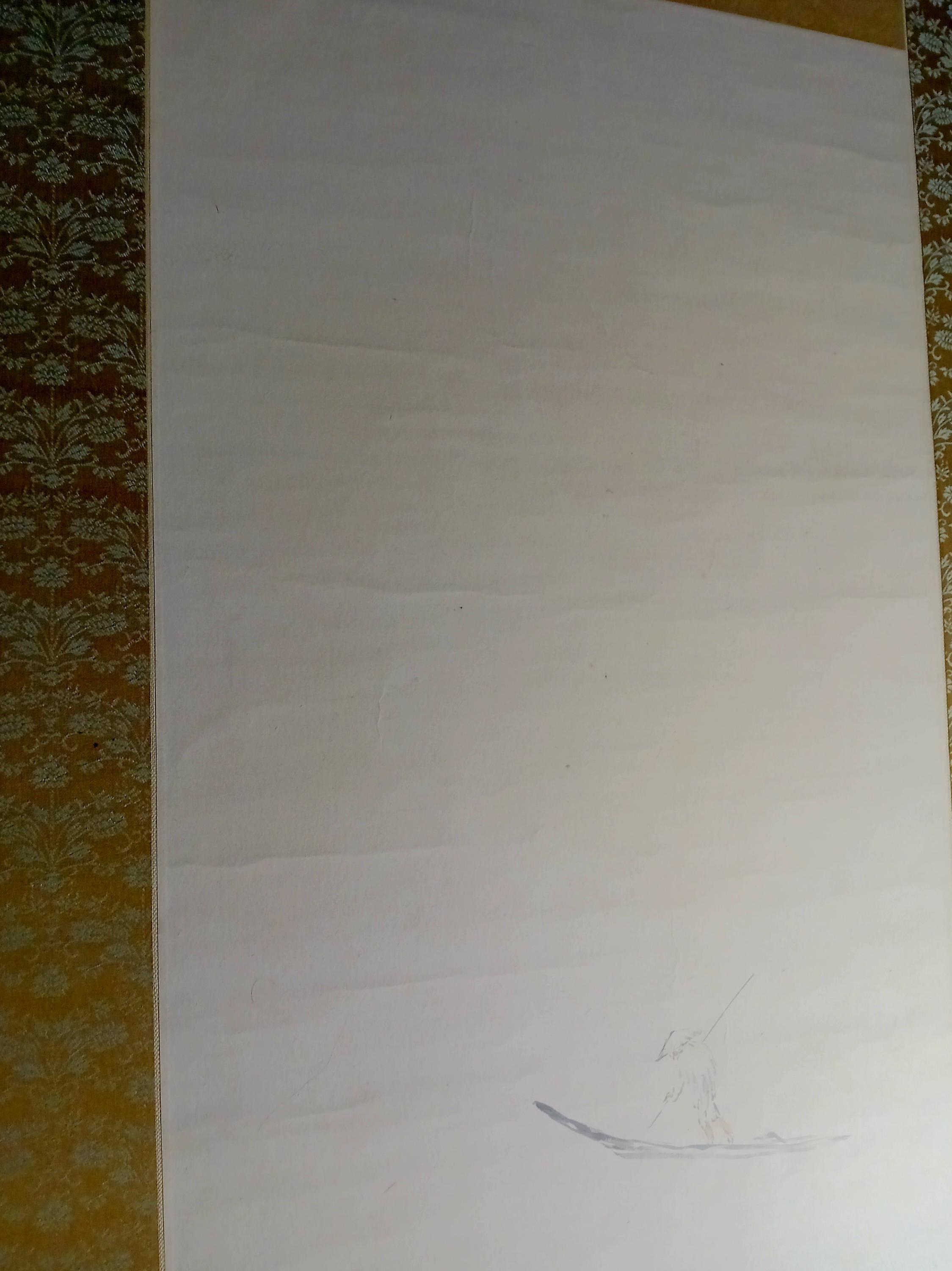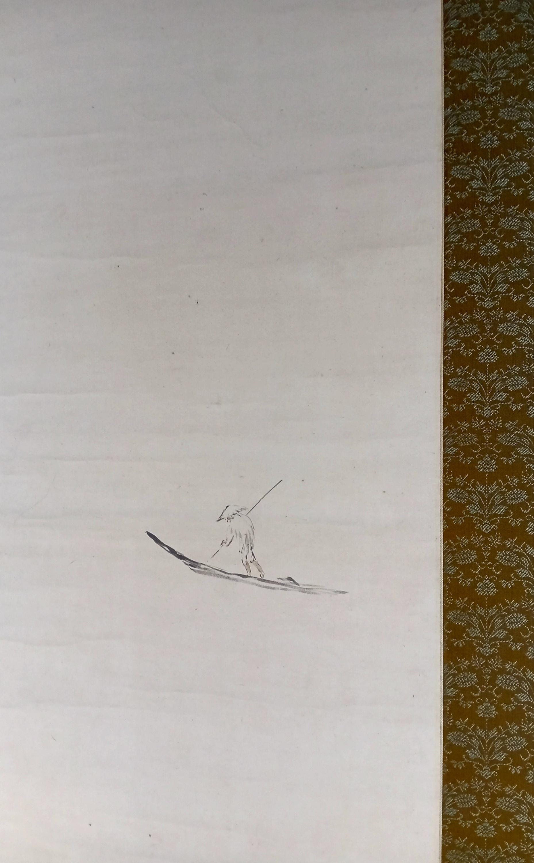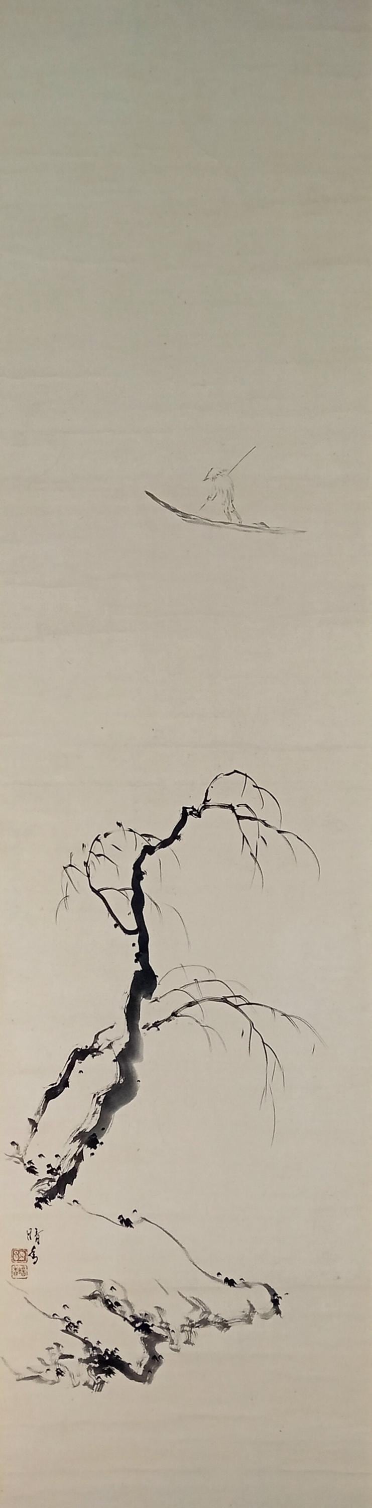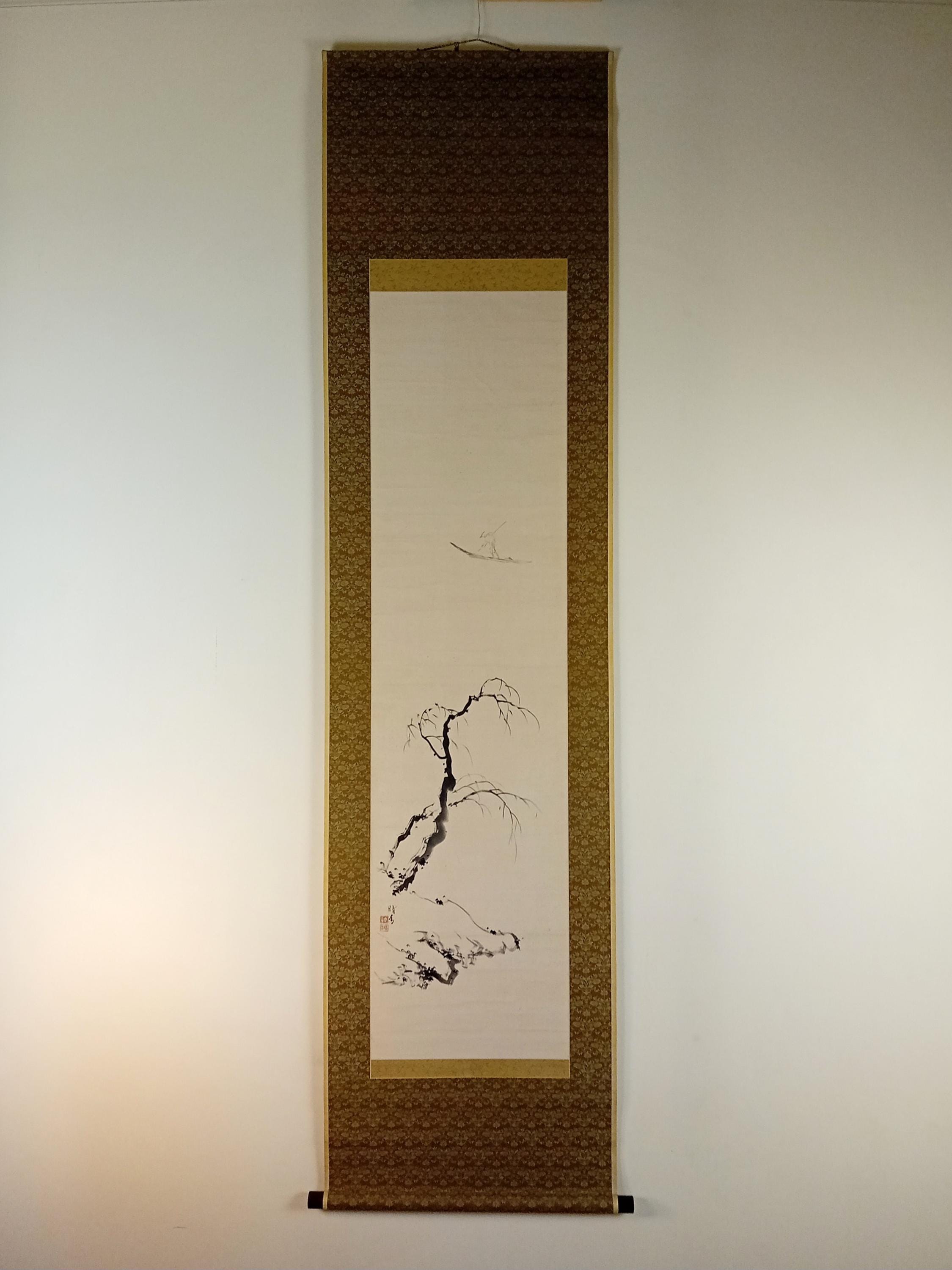 Ink on paper scroll, created in the mid-Shōwa period. A composition built on quiet space and restrained brushwork: a solitary fisherman and a winter branch suggest a moment of stillness and seasonal calm. Minimal detail, soft ink gradation, and a focus on breath, line, and silence.