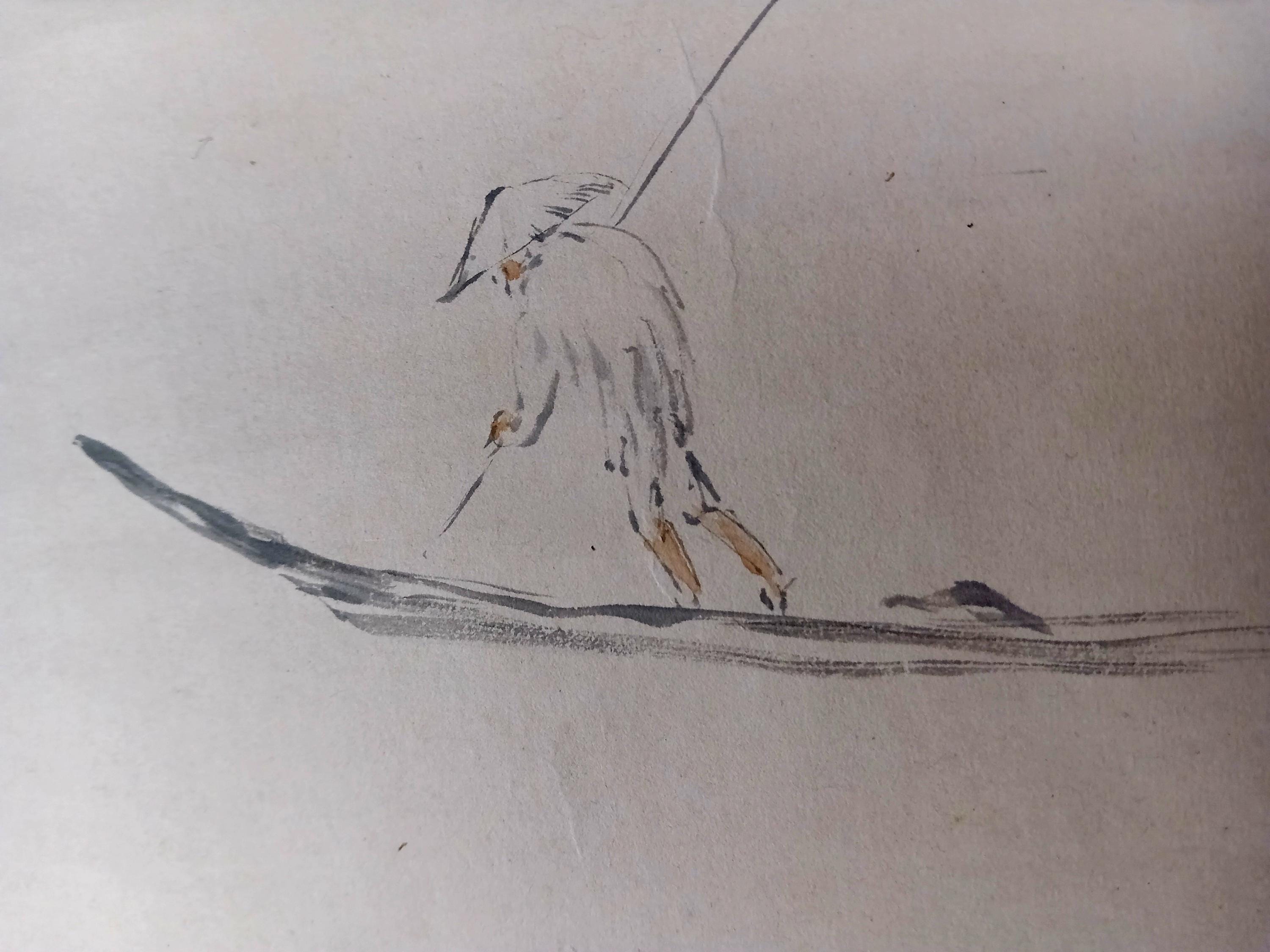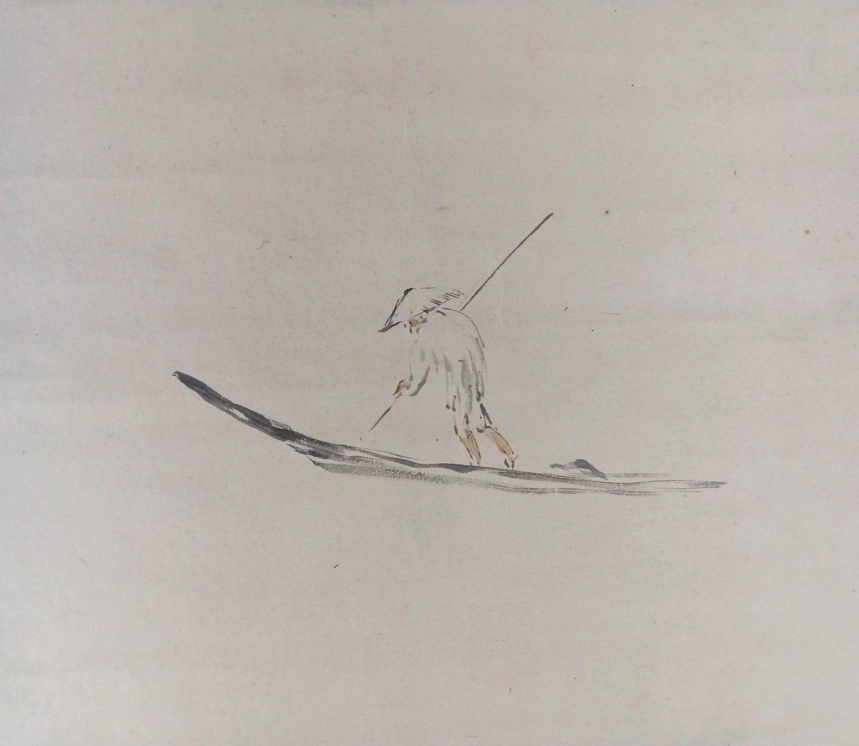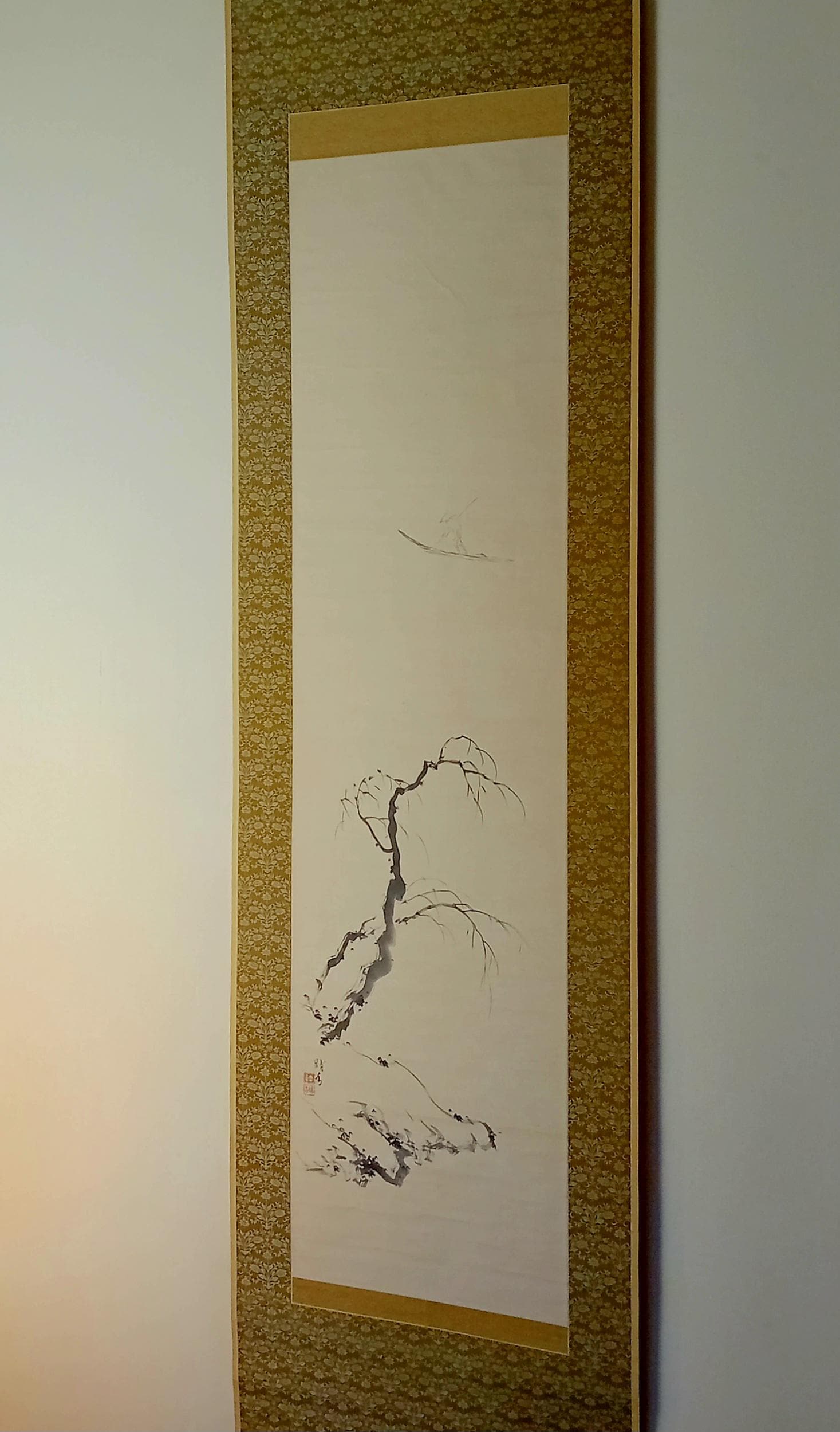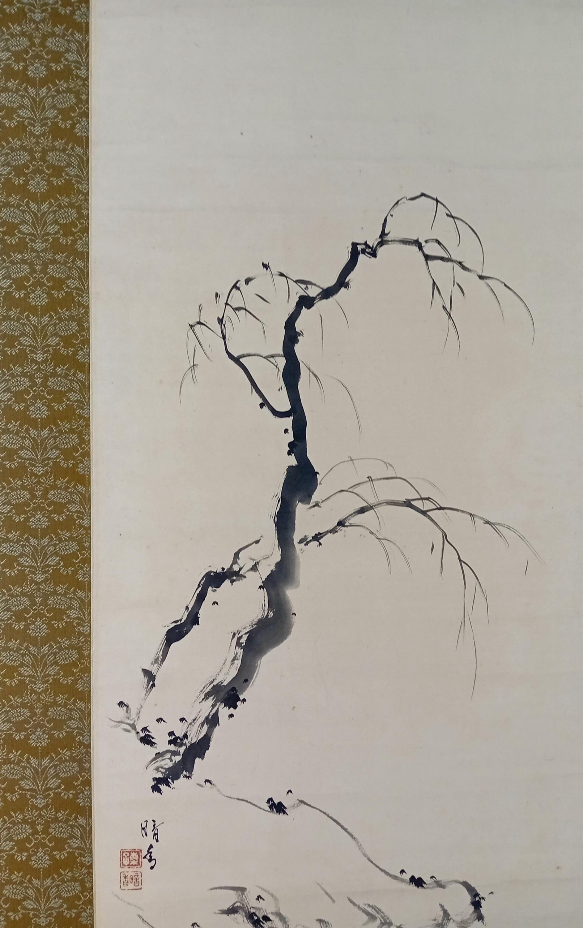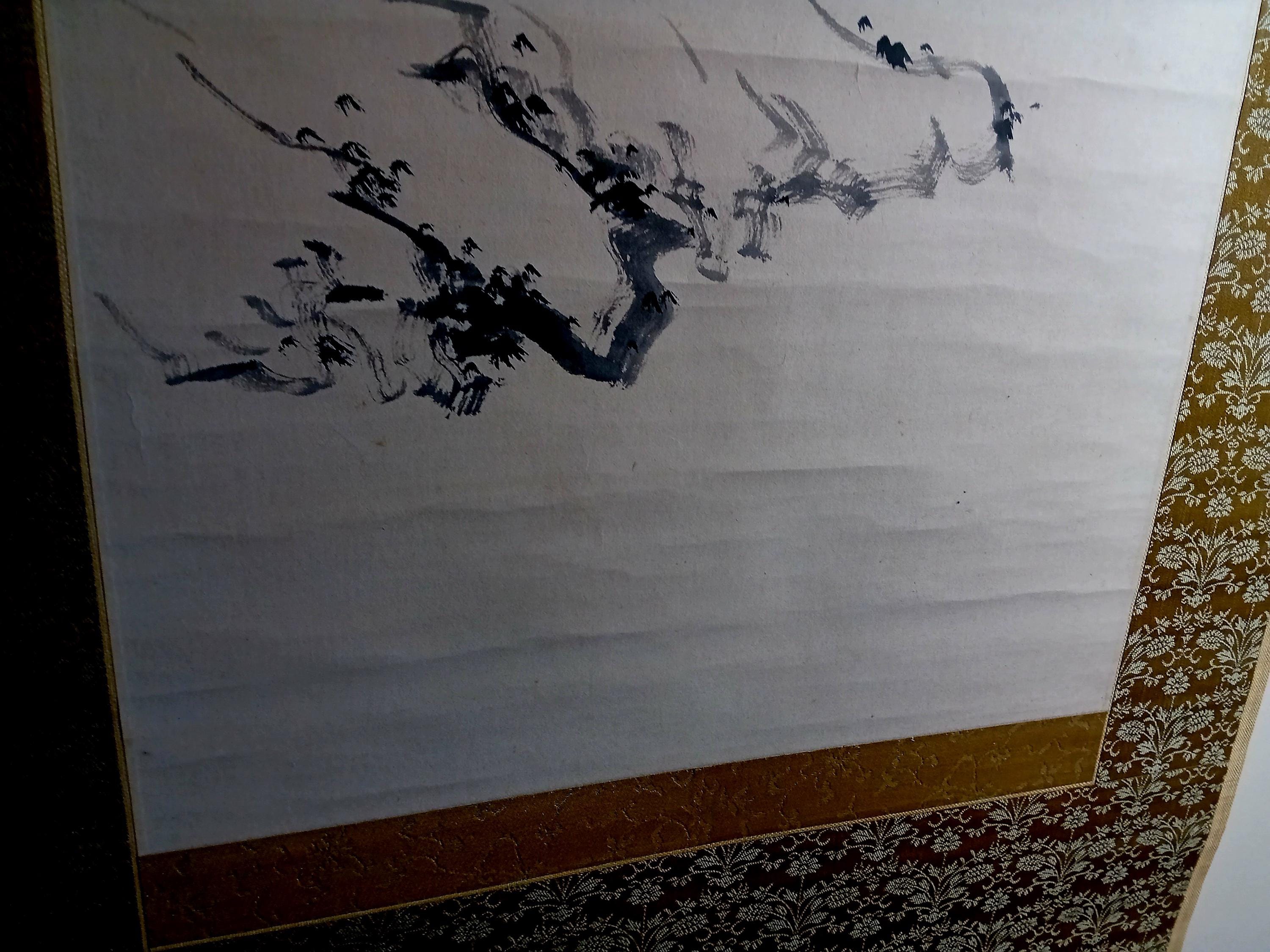 Ink on paper scroll, created in the mid-Shōwa period. A composition built on quiet space and restrained brushwork: a solitary fisherman and a winter branch suggest a moment of stillness and seasonal calm. Minimal detail, soft ink gradation, and a focus on breath, line, and silence.