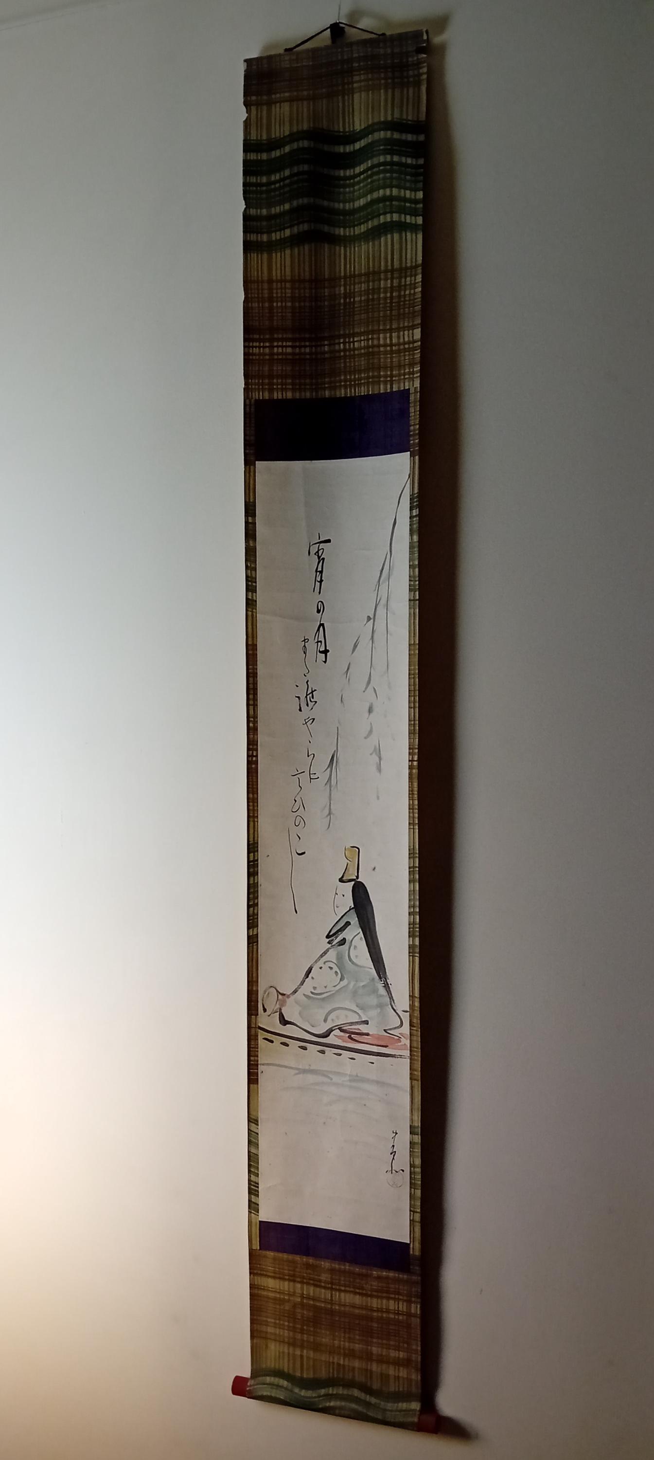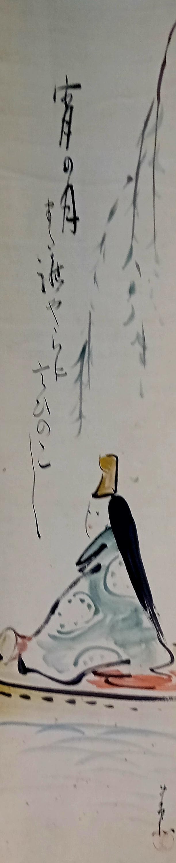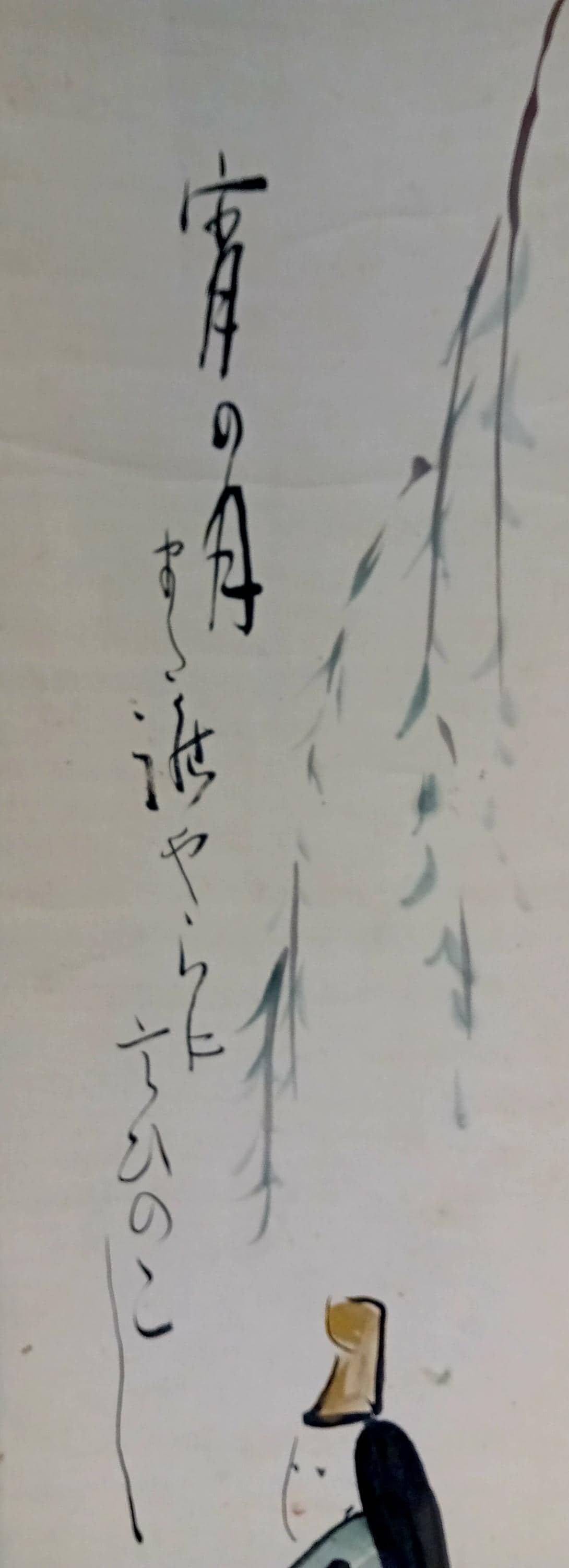 Japanese ink and light color on paper depicting a seated Heian-style poet under a willow tree with an accompanying poem about the evening moon: