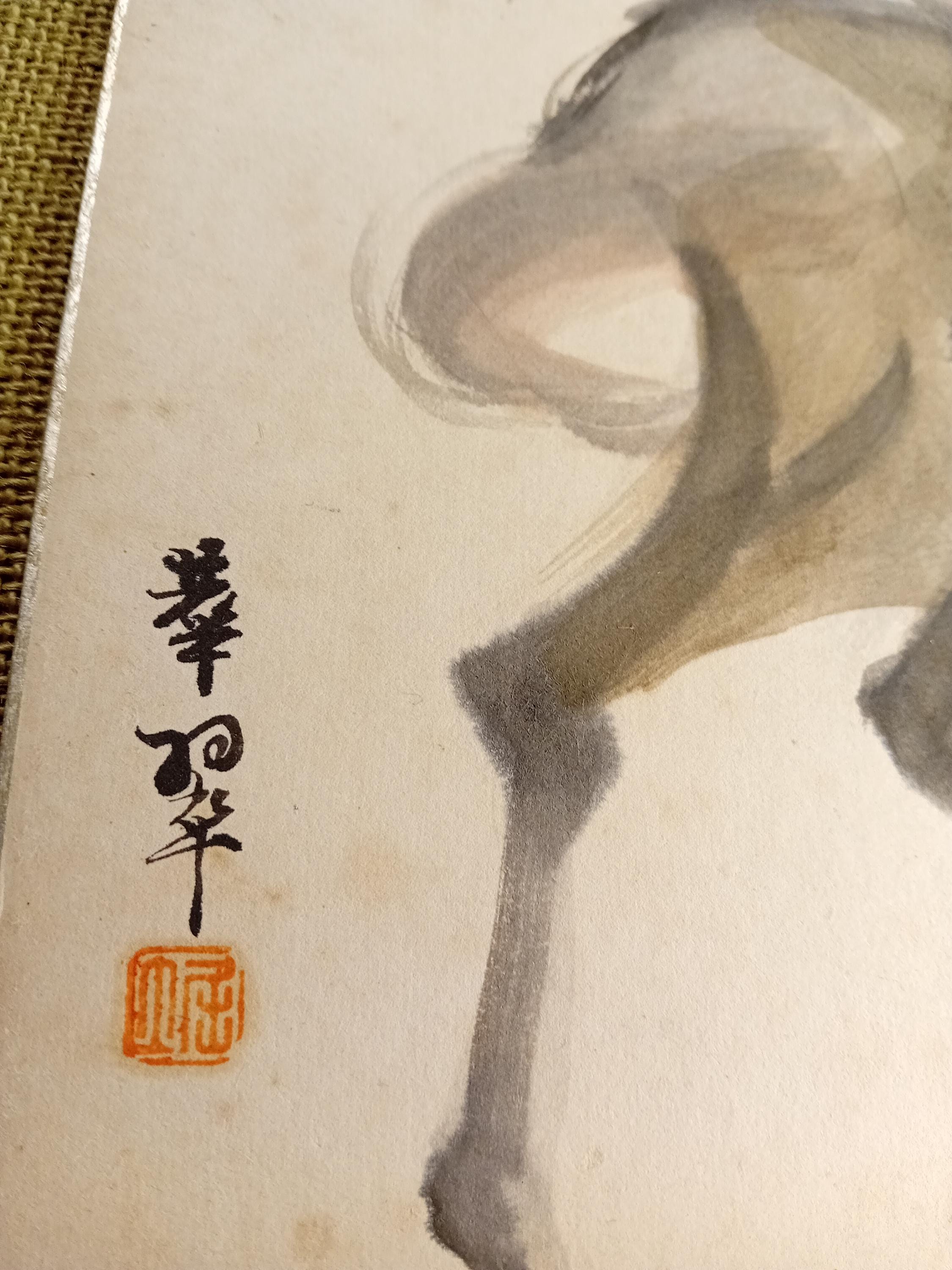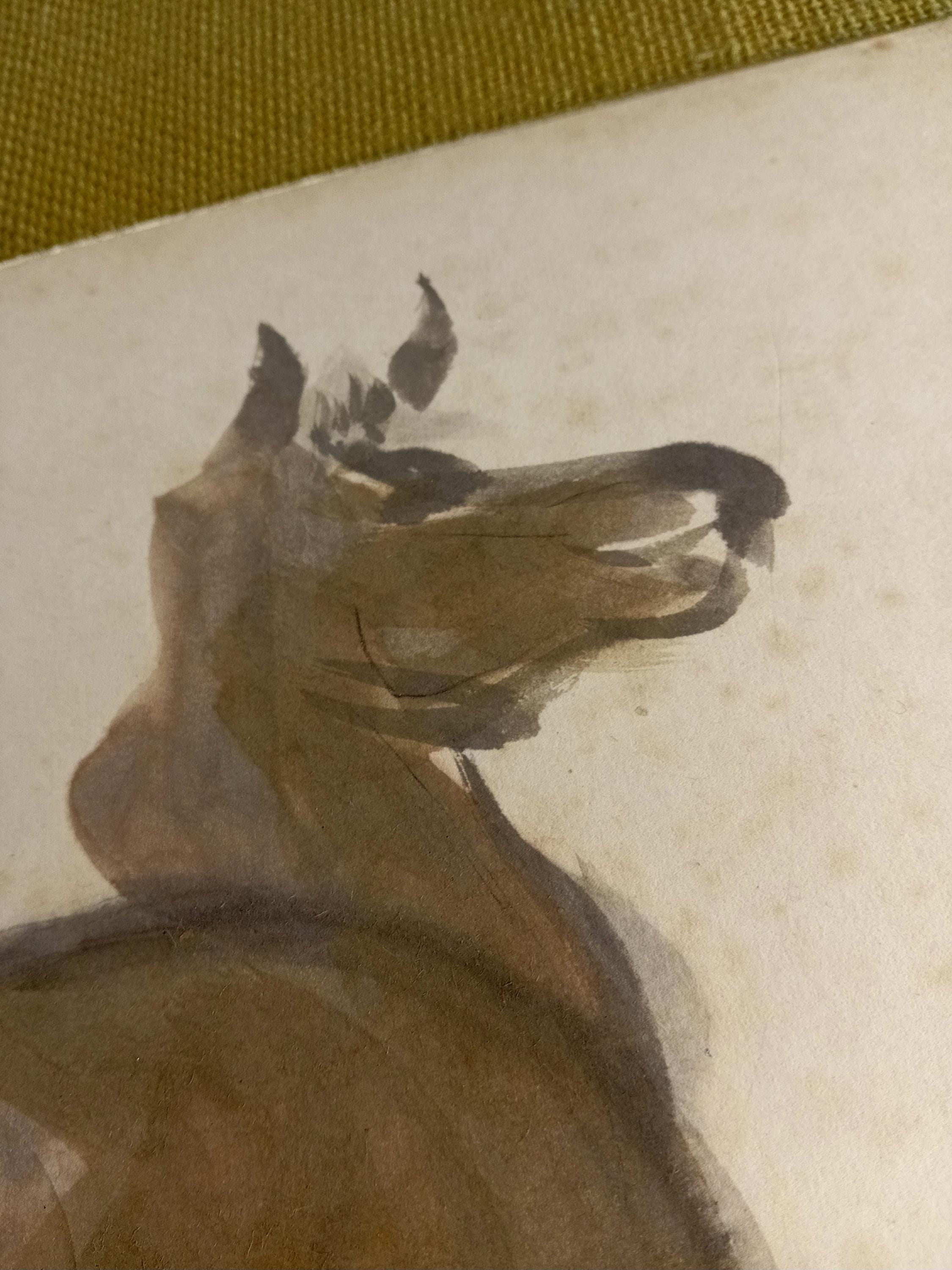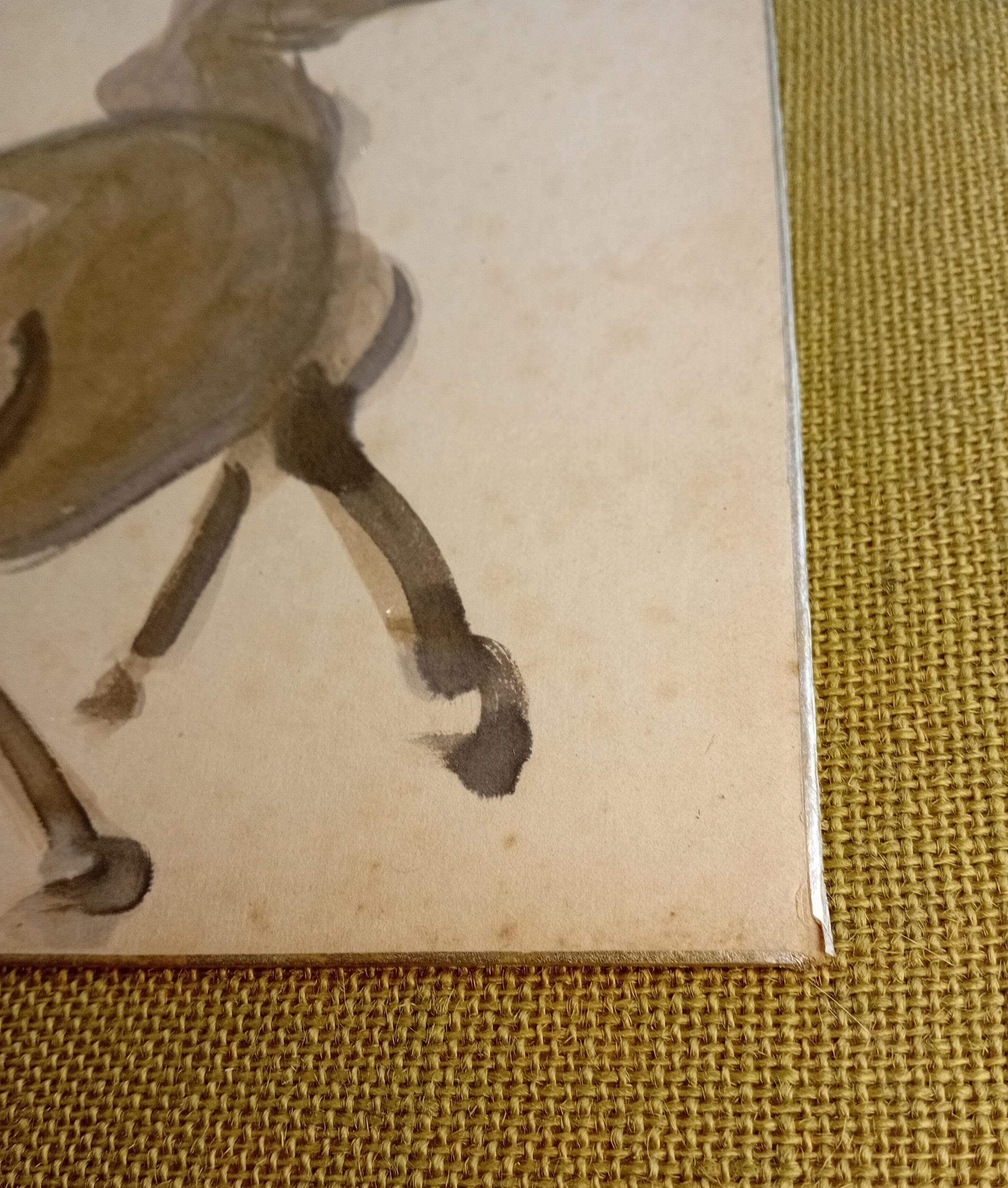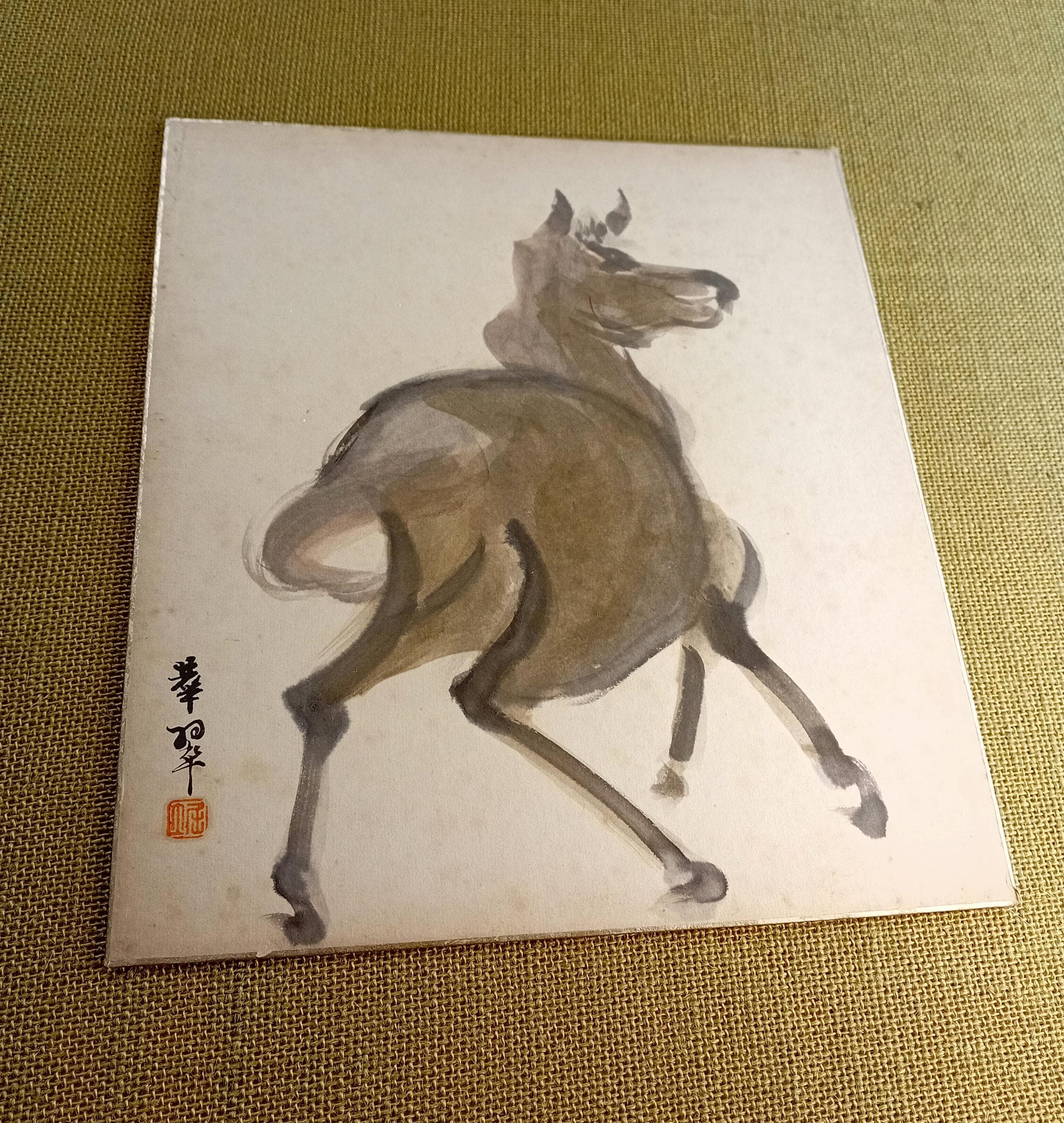 Vintage Japanese shikishi with an ink-and-wash study of a horse, created in the early–mid Shōwa period.