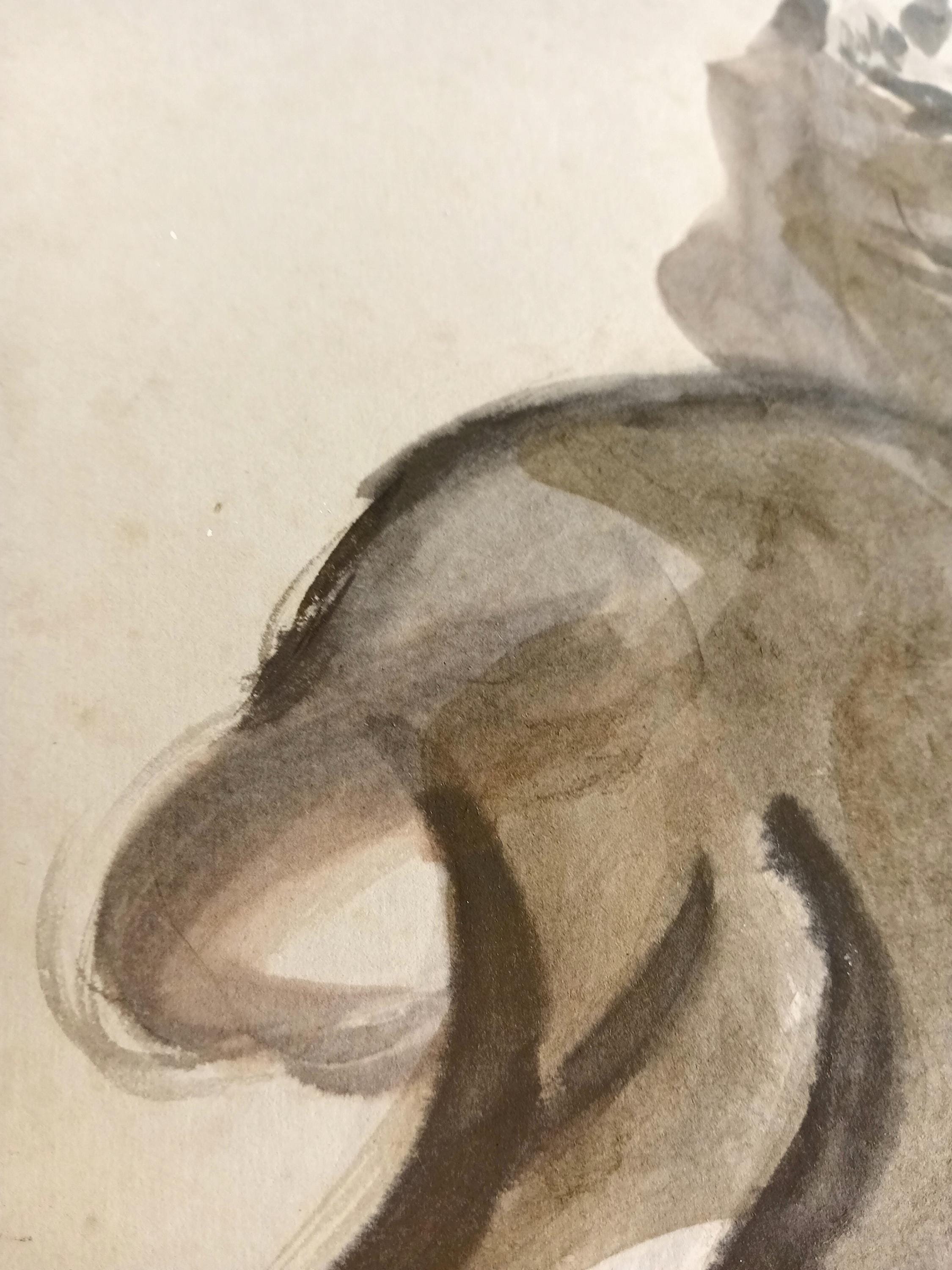The composition focuses on movement: a dynamic turn of the body, elongated legs, and a direct gestural brushstroke typical of training studio work of this era. The line is economical and expressive, with tonal washes shaping the volume.