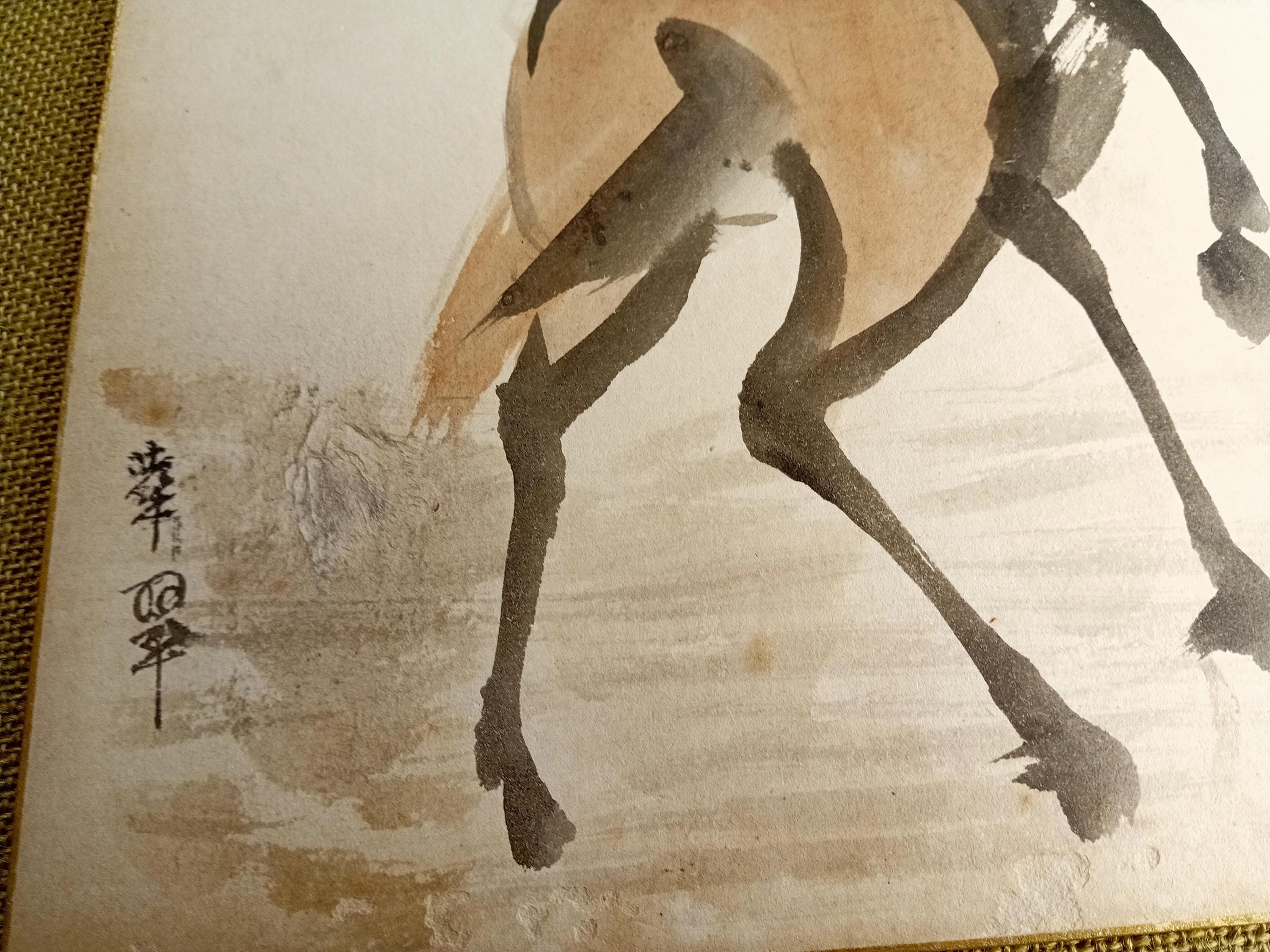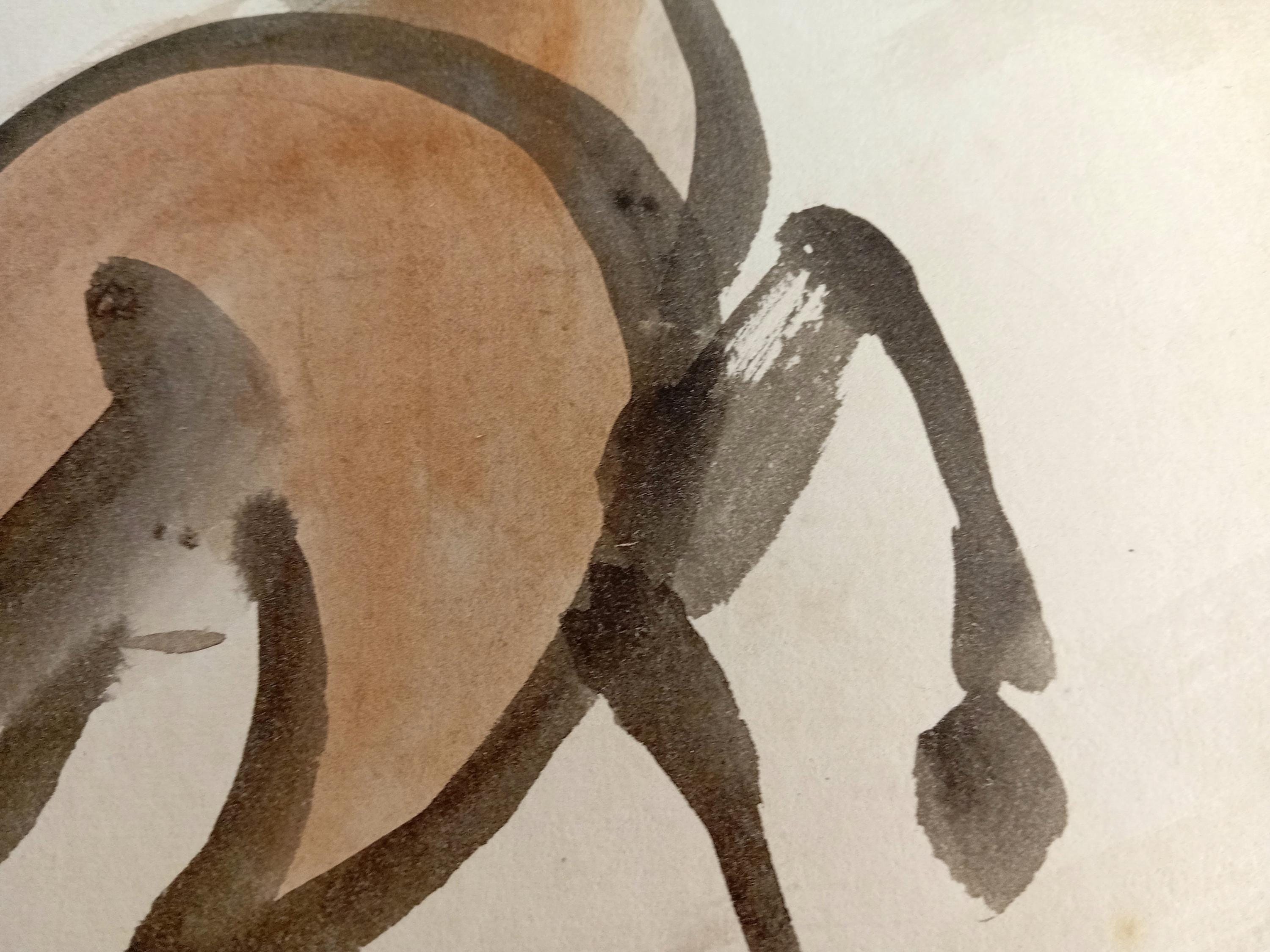 The composition focuses on upward movement: lifted front legs, arched neck, and a strong contour drawn in one continuous gesture. Layered washes and confident sumi lines reflect training-studio practice typical for Shōwa-era academic ink work.