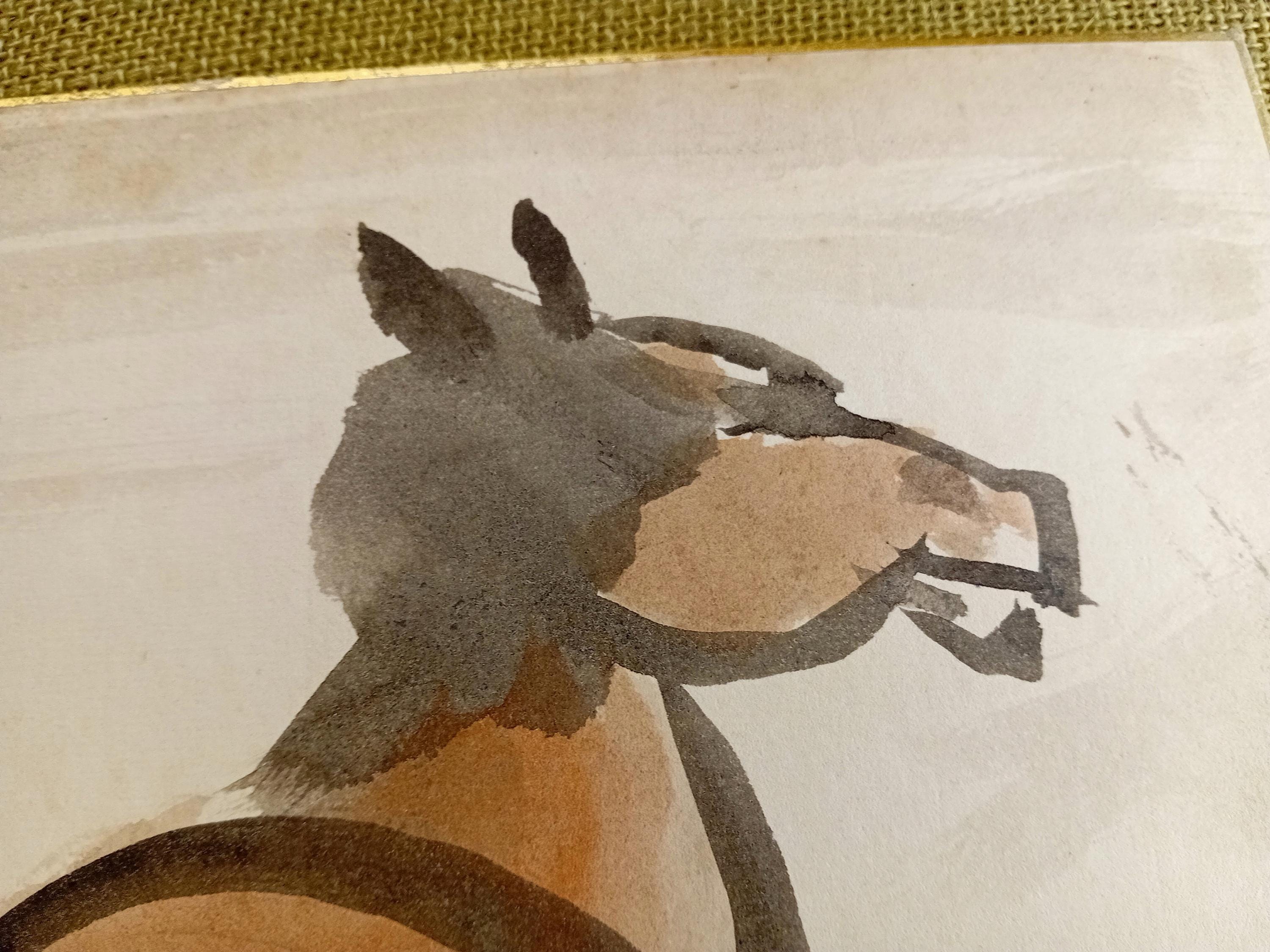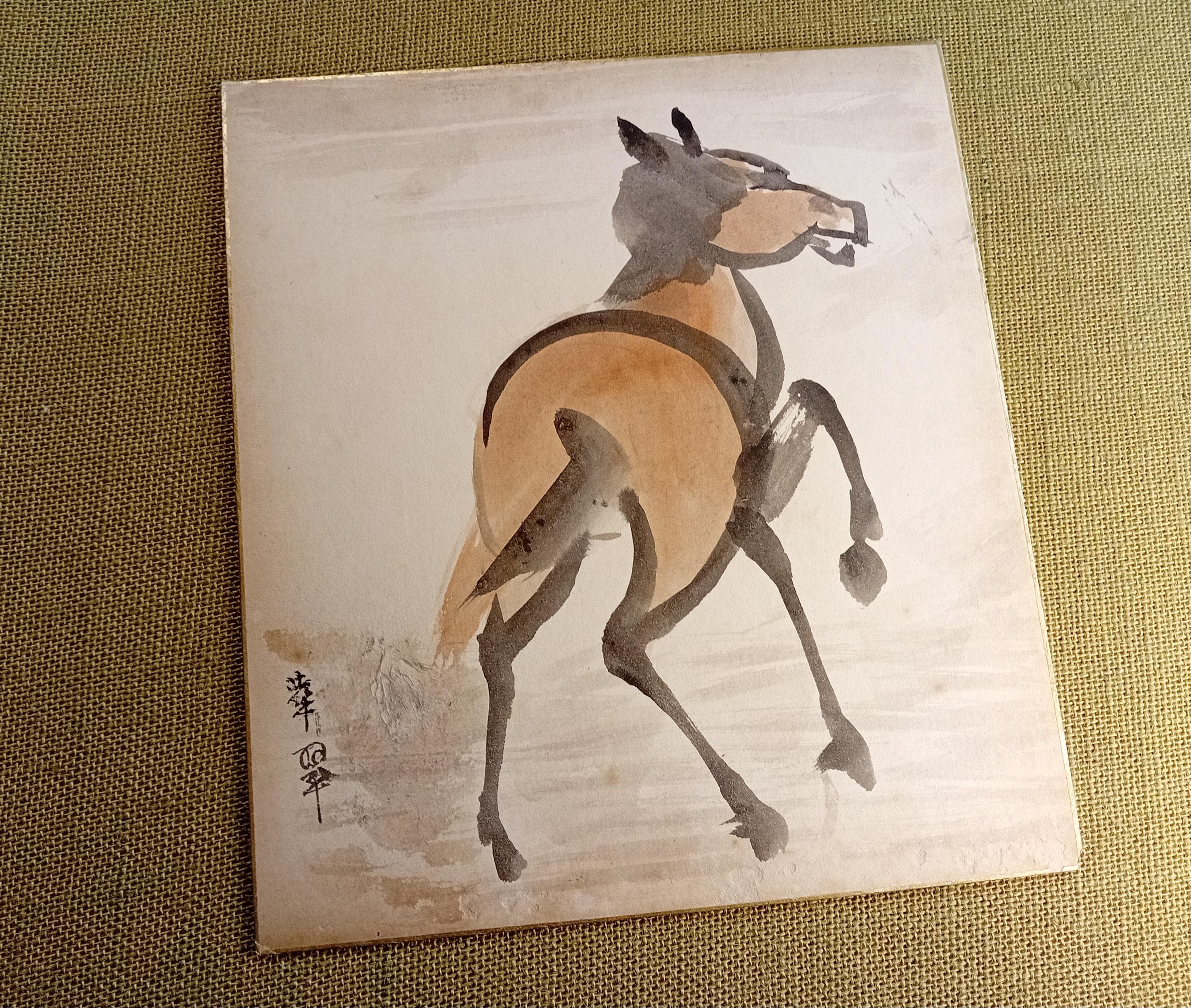 Vintage Japanese shikishi with an ink-and-wash study of a rearing horse, created in the early–mid Shōwa period.