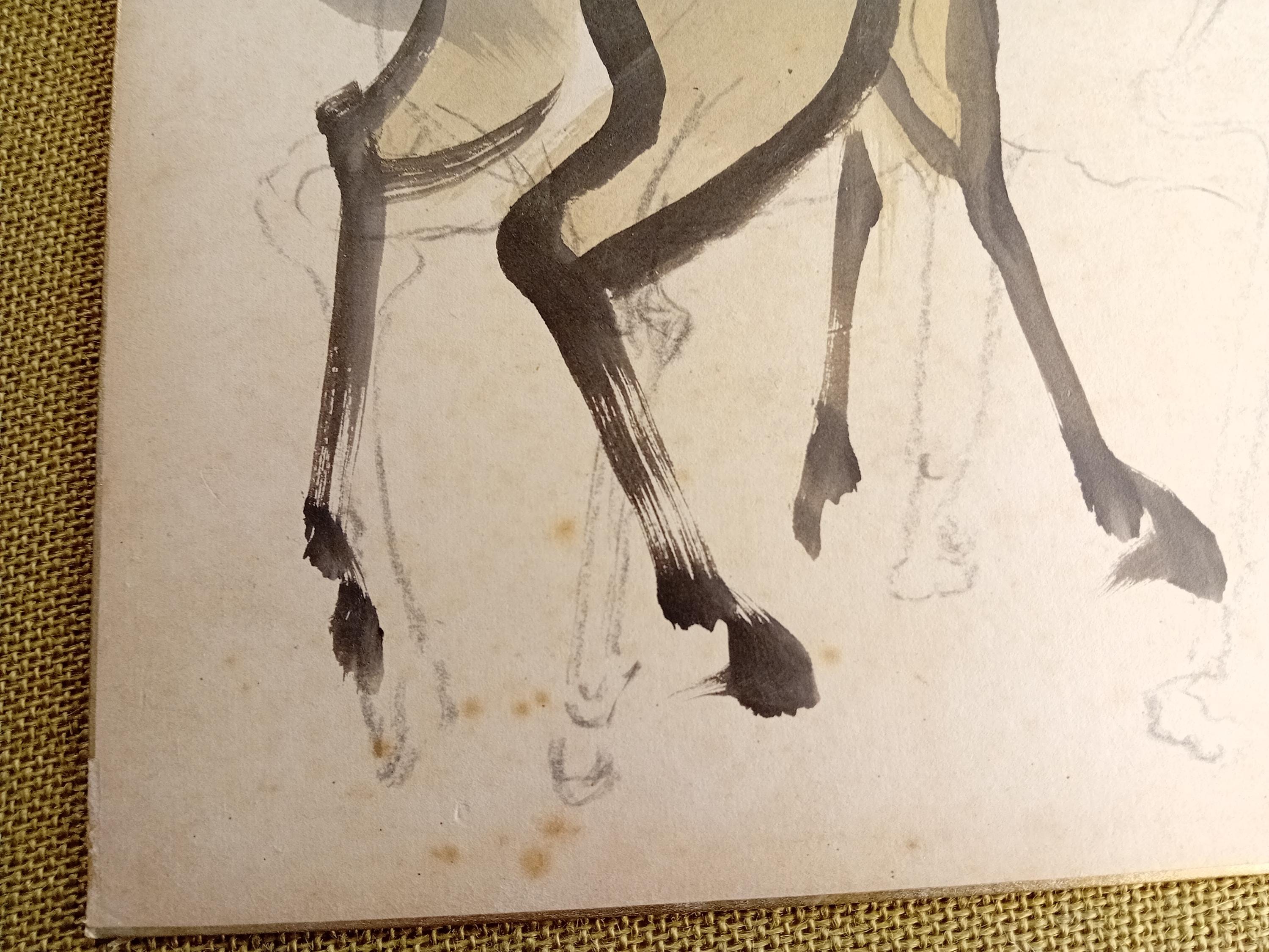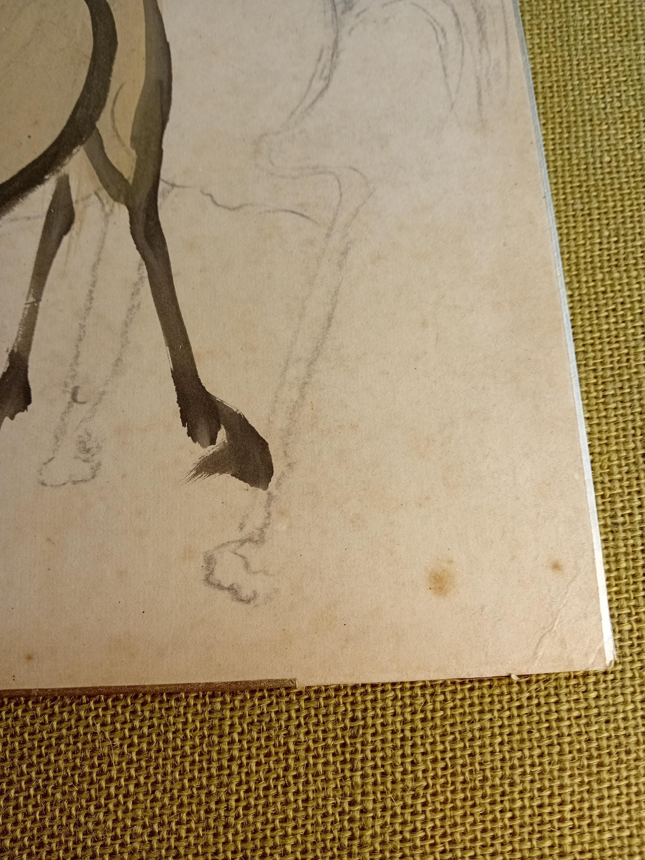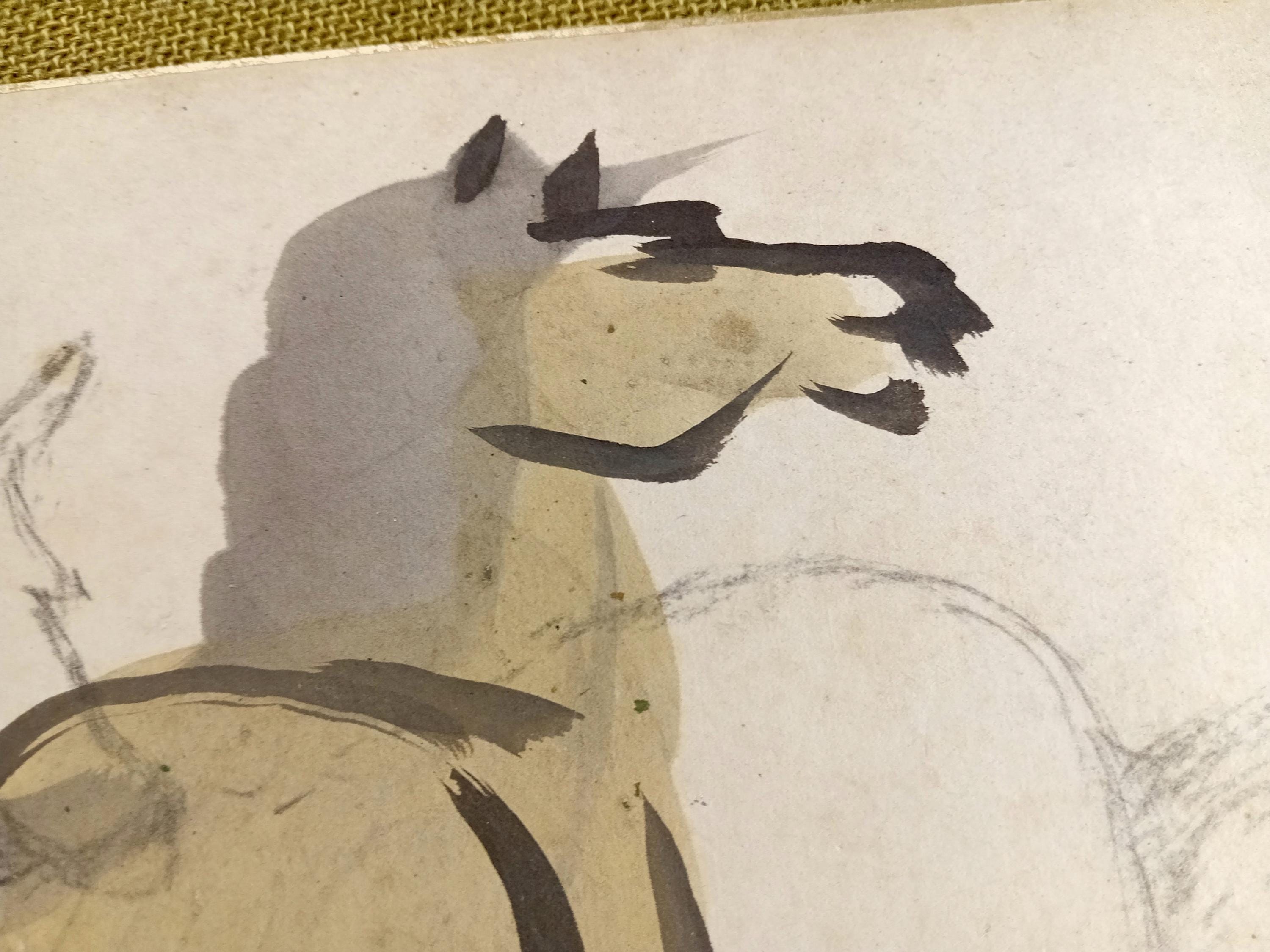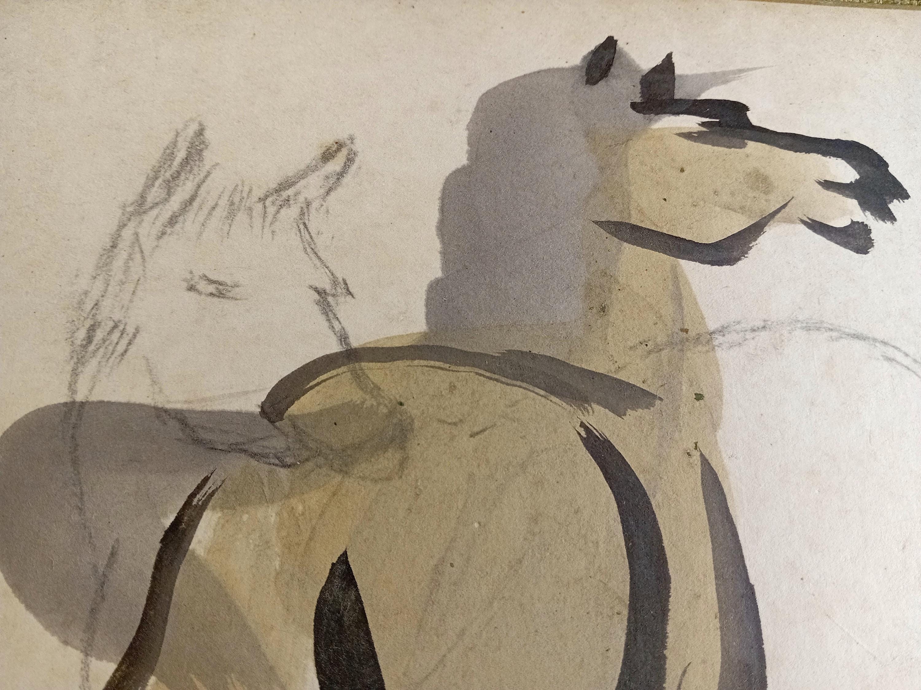 A single-side shikishi board showing a working horse study: an initial graphite sketch and a finished ink figure placed over it. This type of layered practice is typical of studio studies, where composition is first established in pencil and then resolved with sumi and light color.