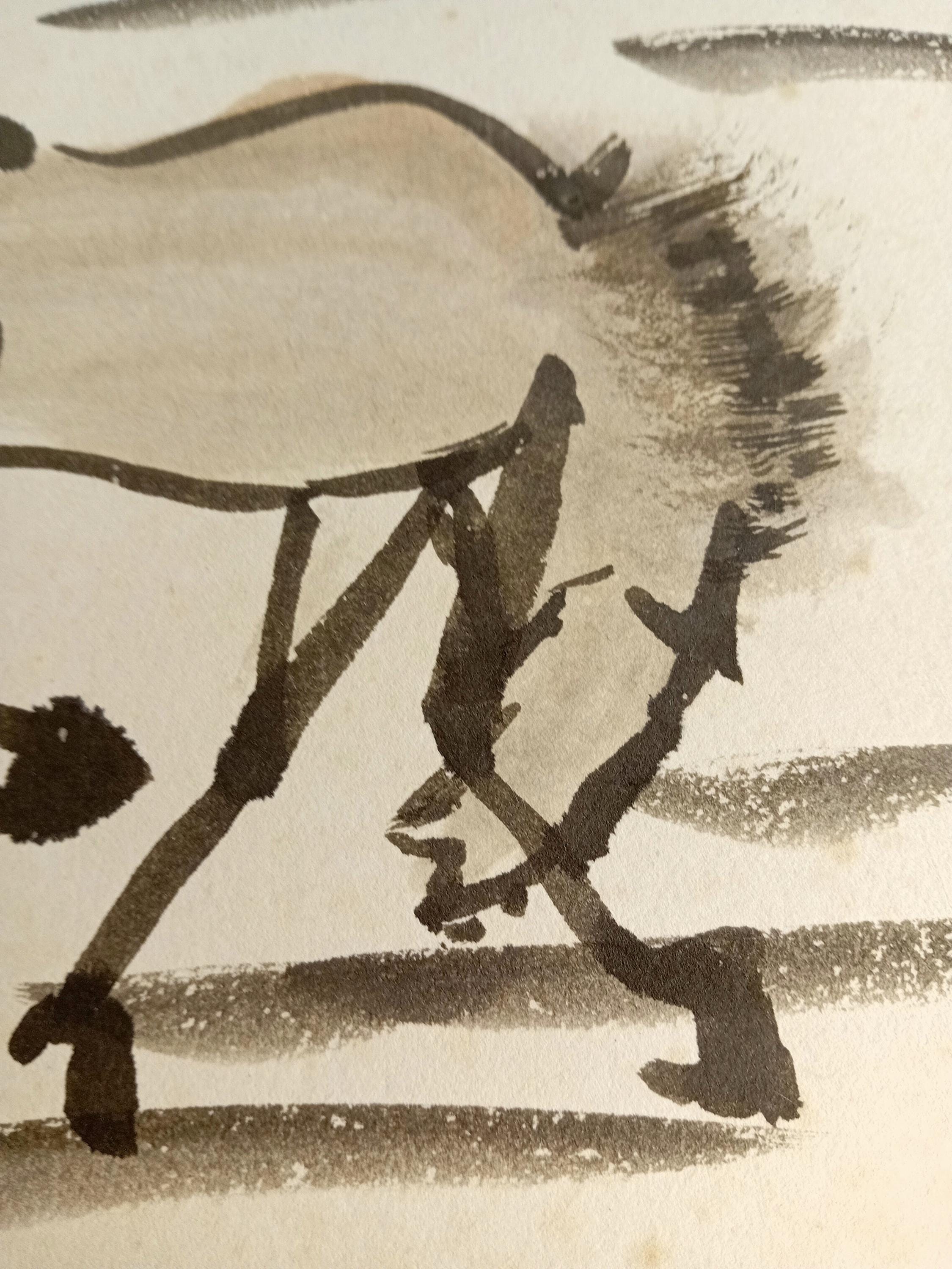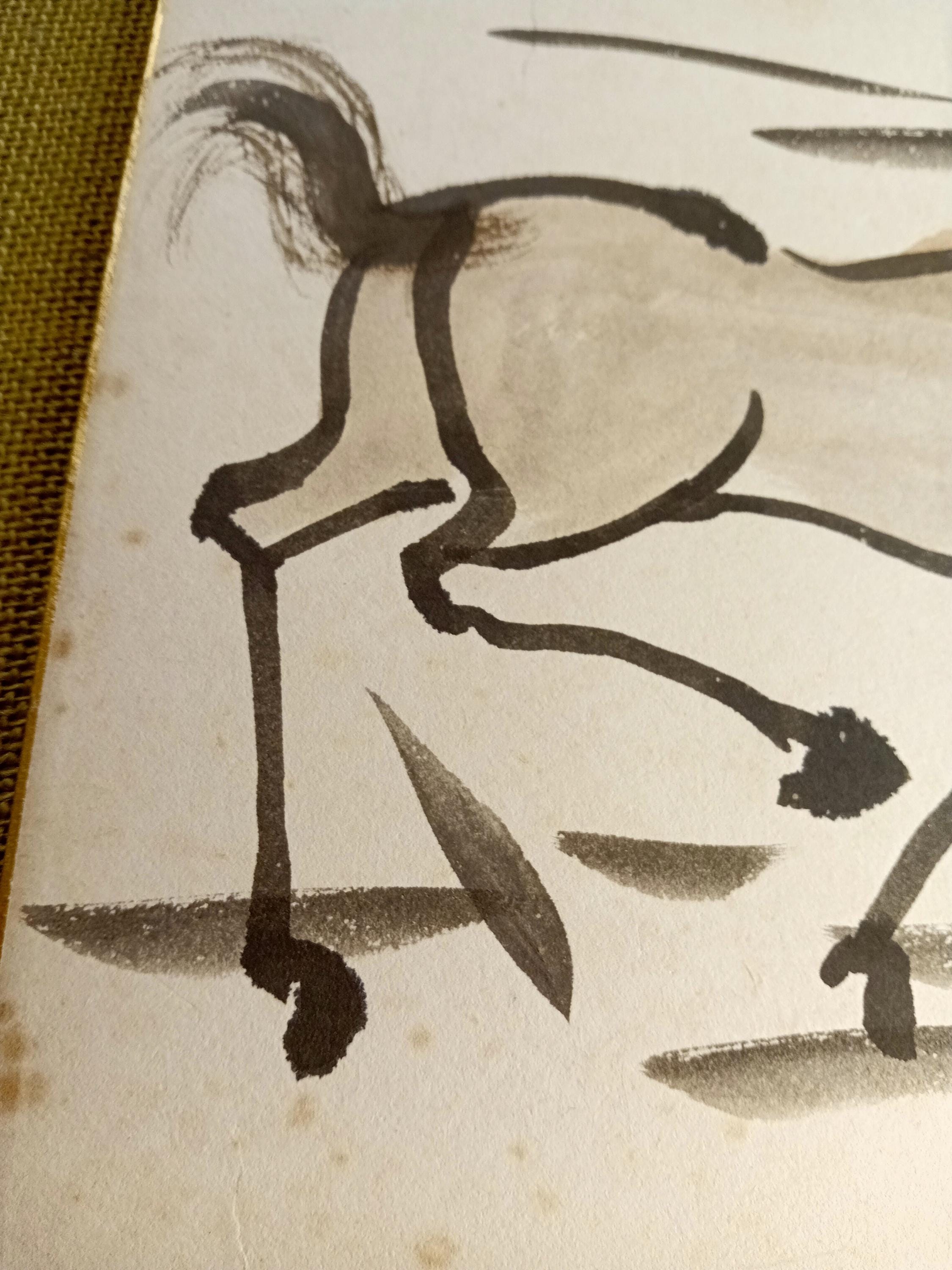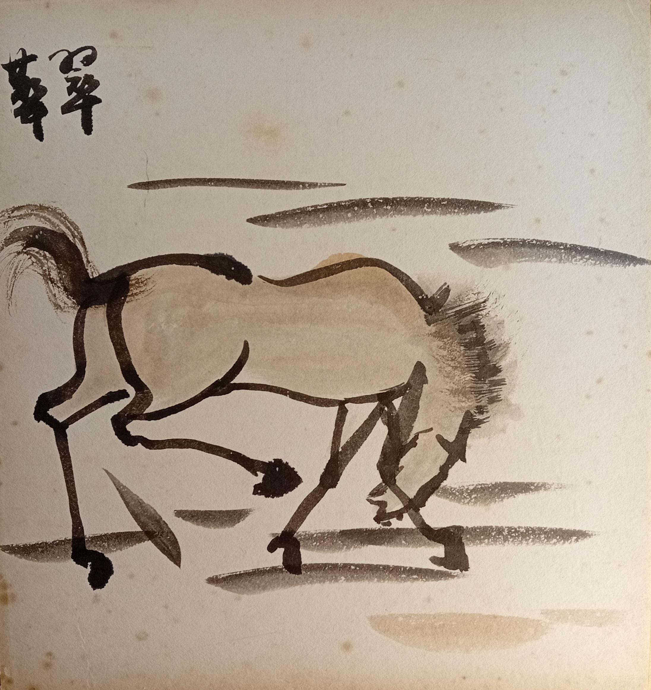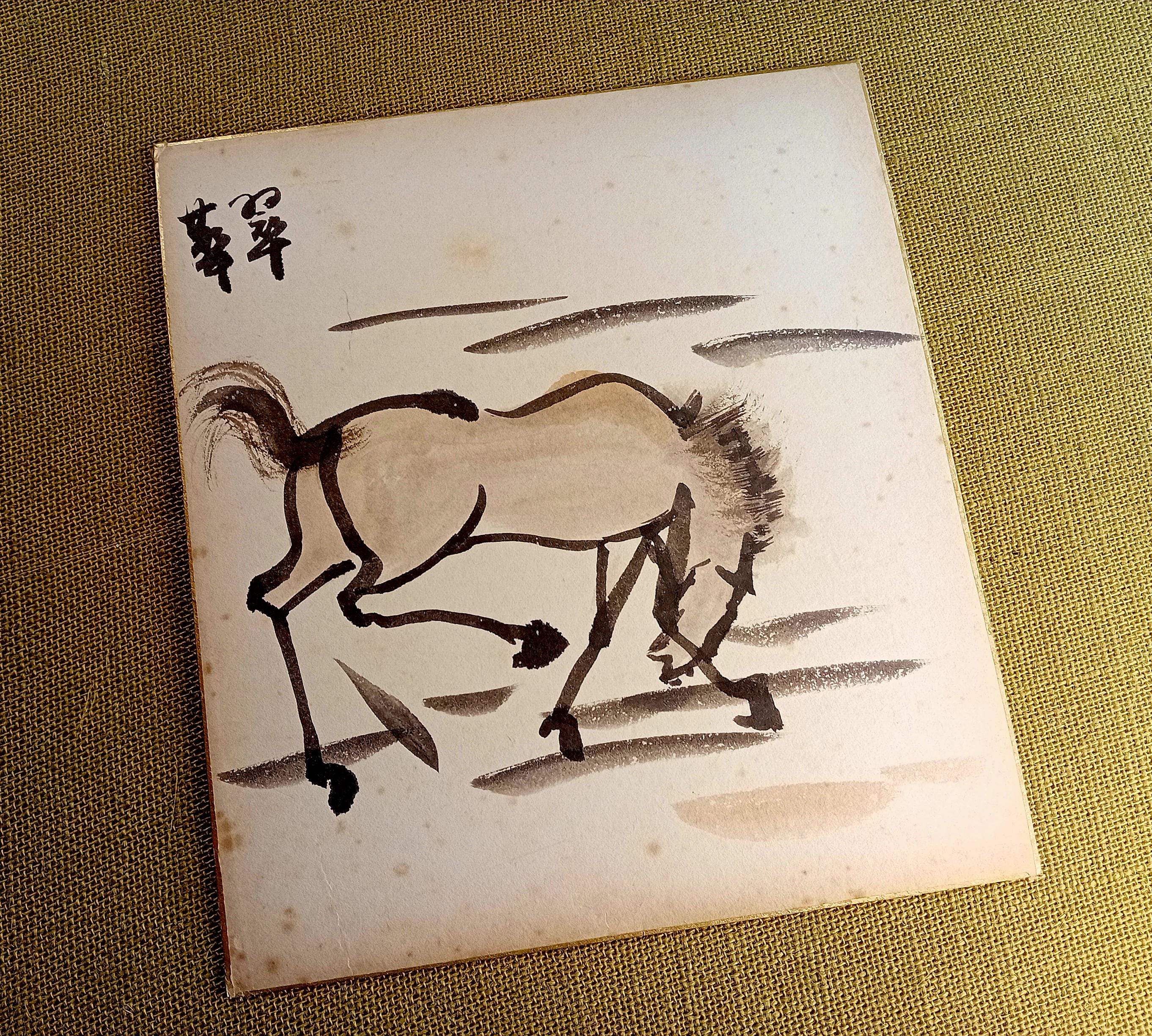 Vintage Japanese shikishi with an ink study of a horse, dated to the early–mid Shōwa period.
