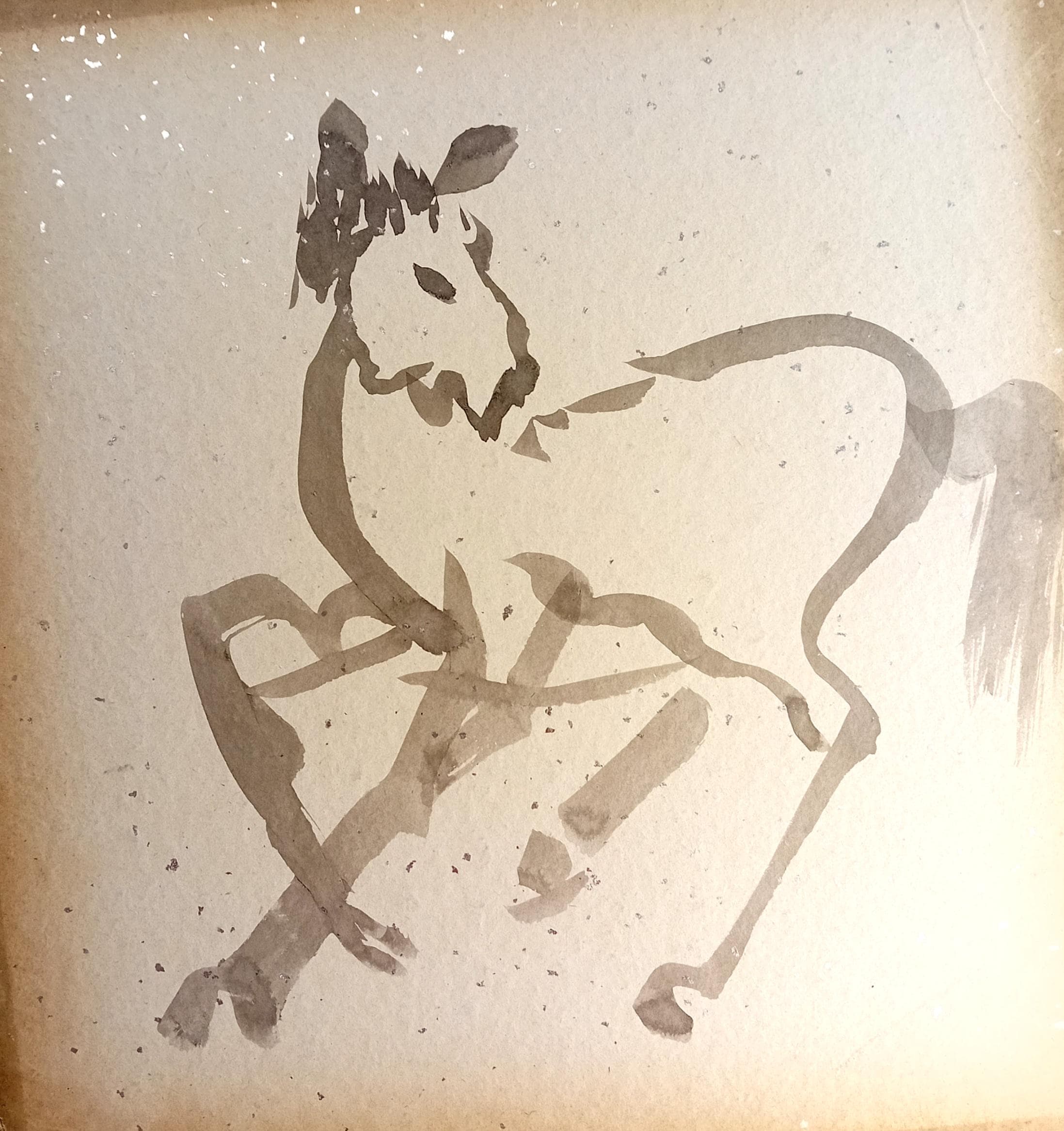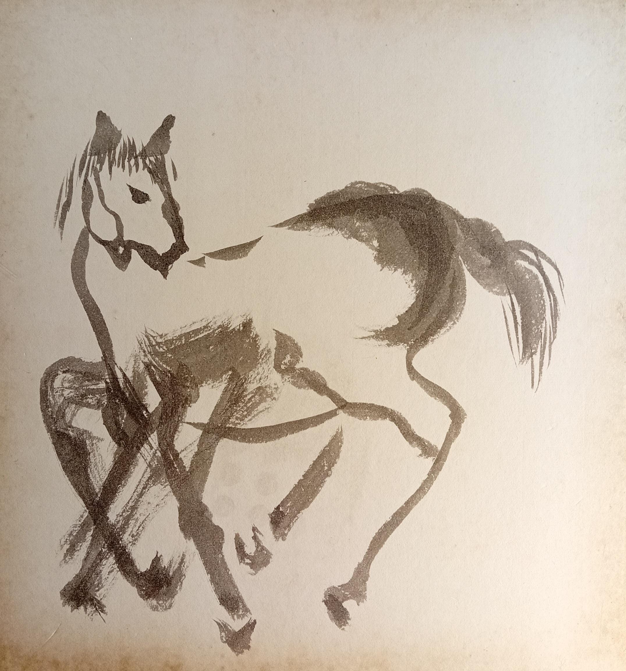 The front shows a horse with slightly turned head, painted in a minimal suibokuga manner — broad ink strokes forming the torso, dry-brush texture on the mane and tail, and calligraphic lines shaping the legs.