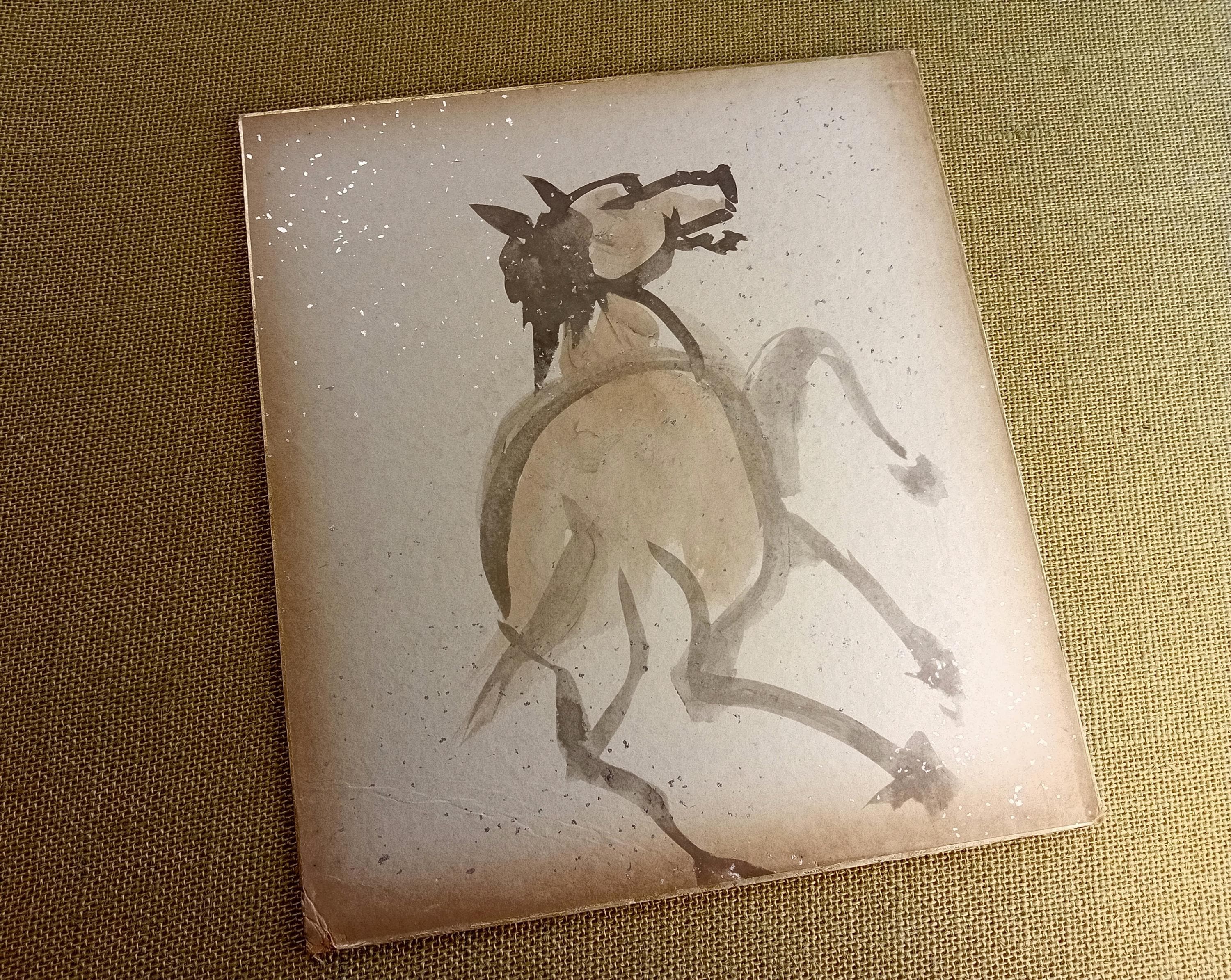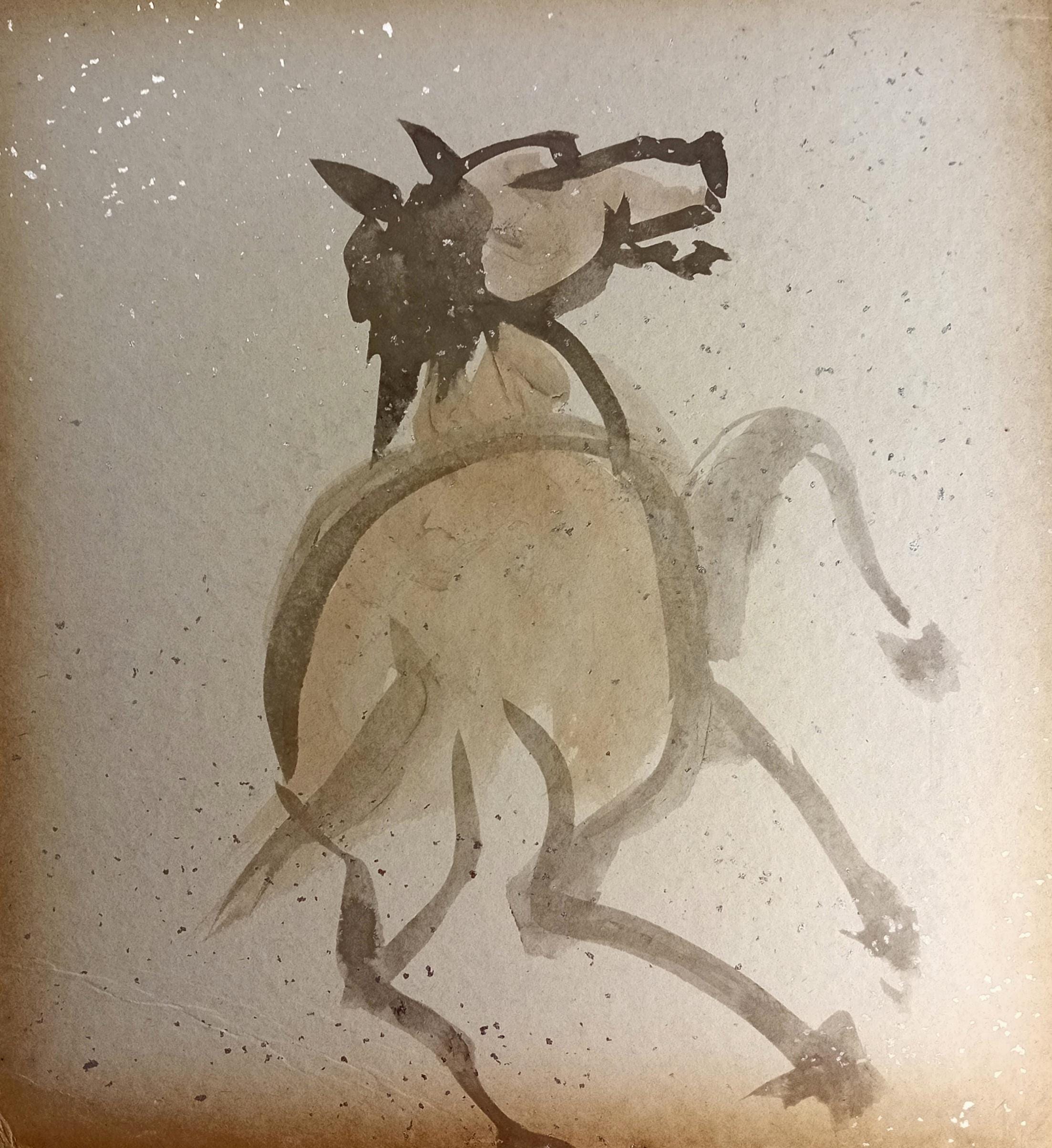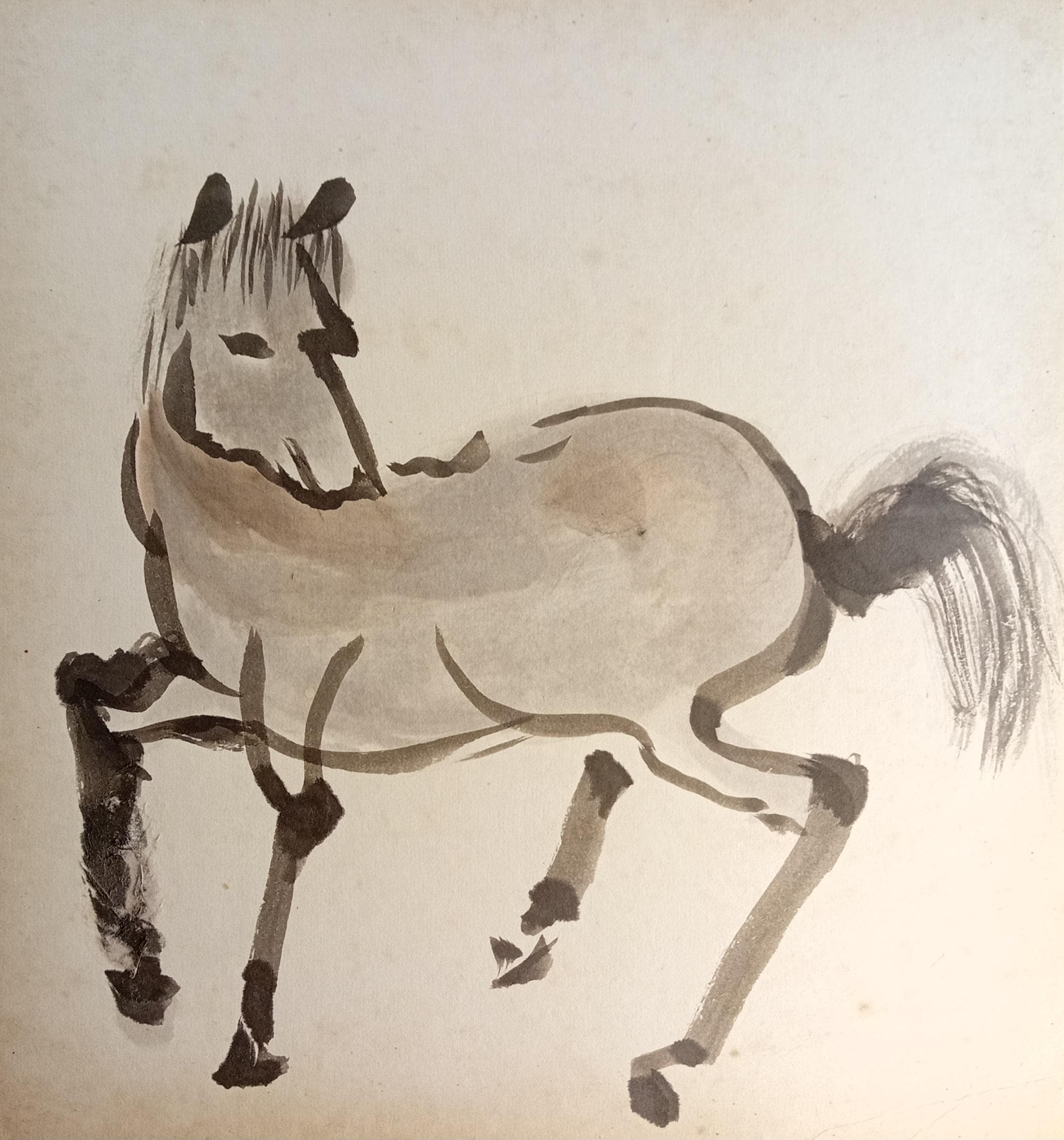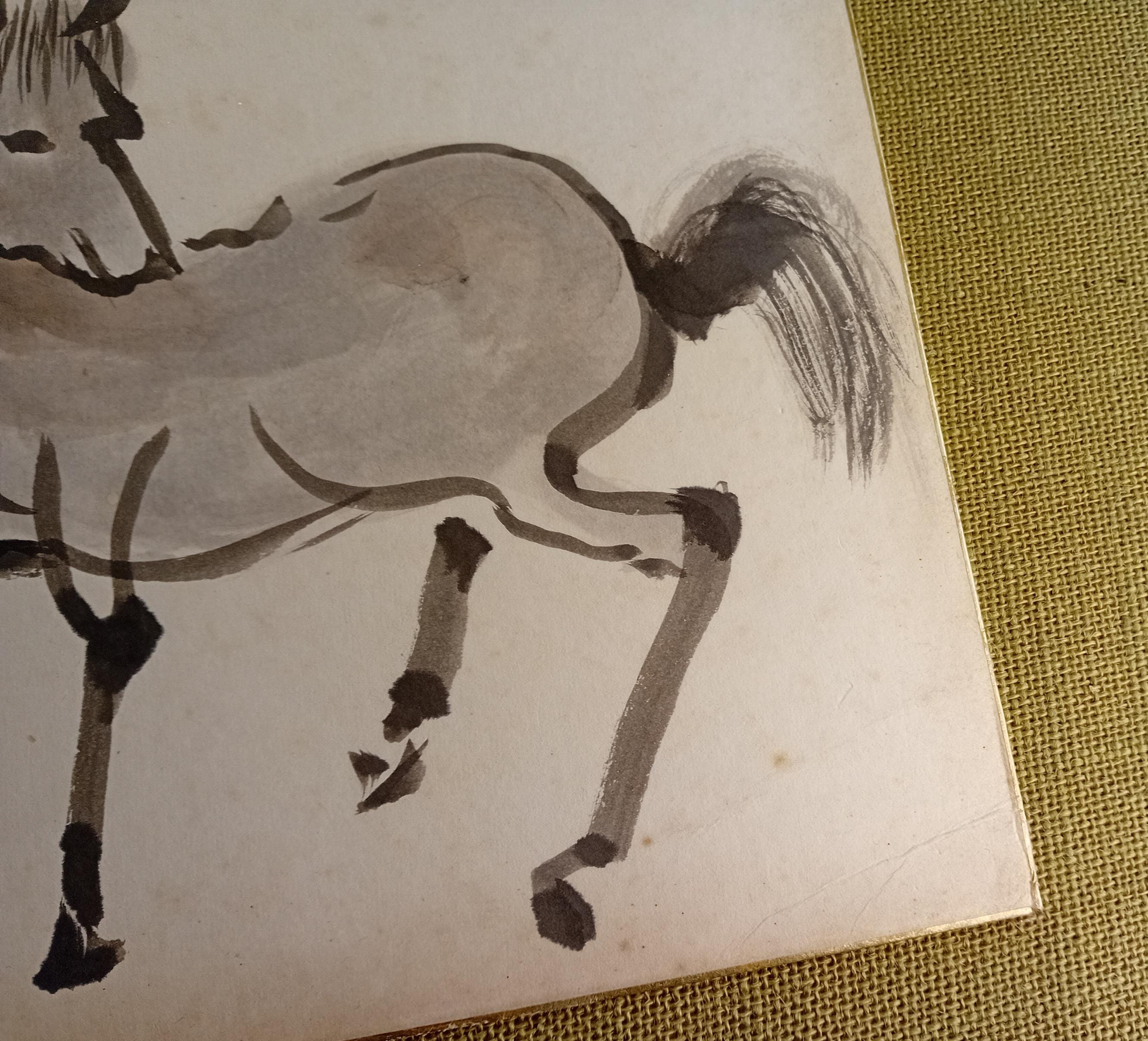 The front side shows a lively study of a horse raising its foreleg, with soft washes shaping the body and brisk sumi lines defining motion and posture.