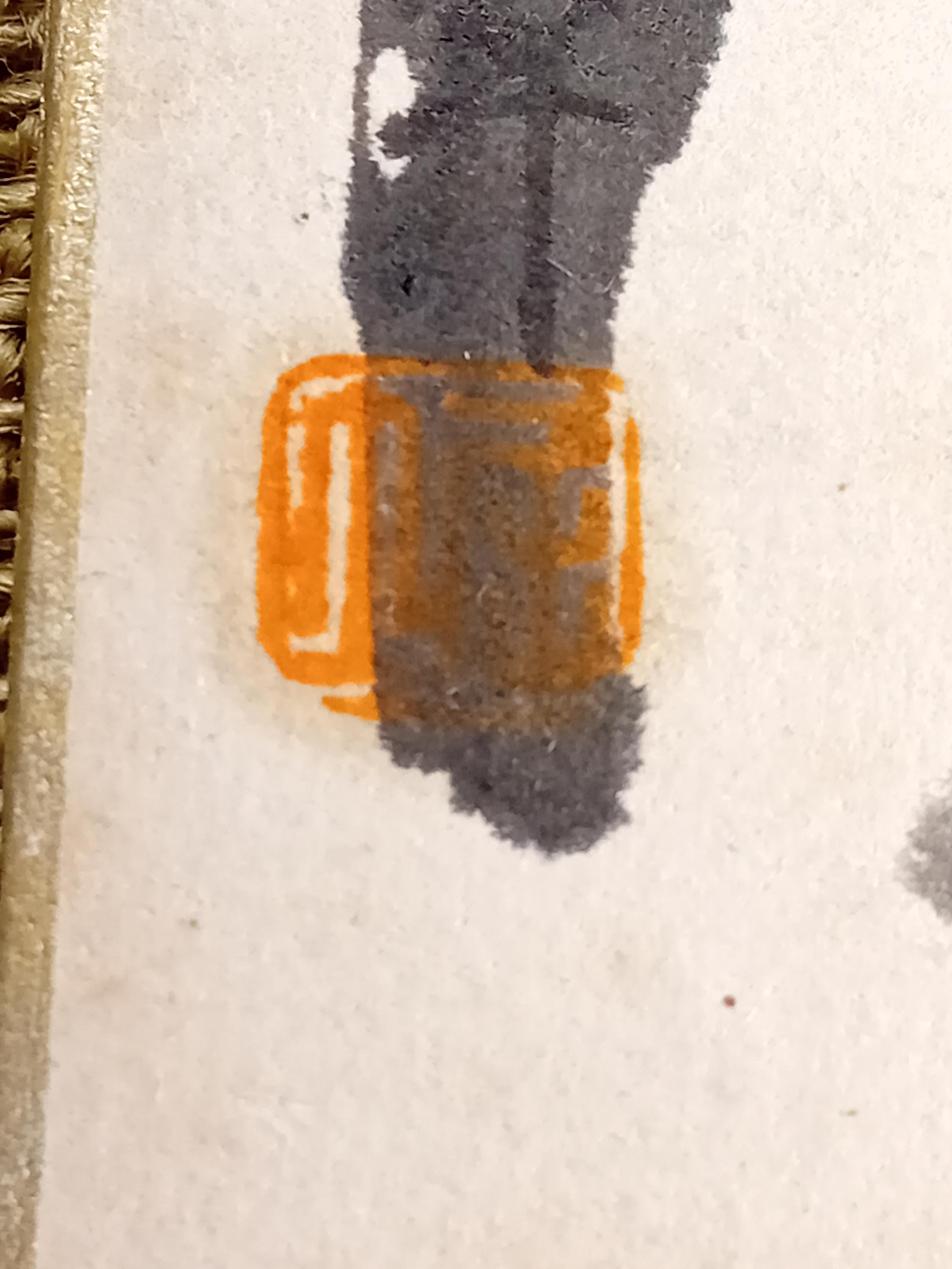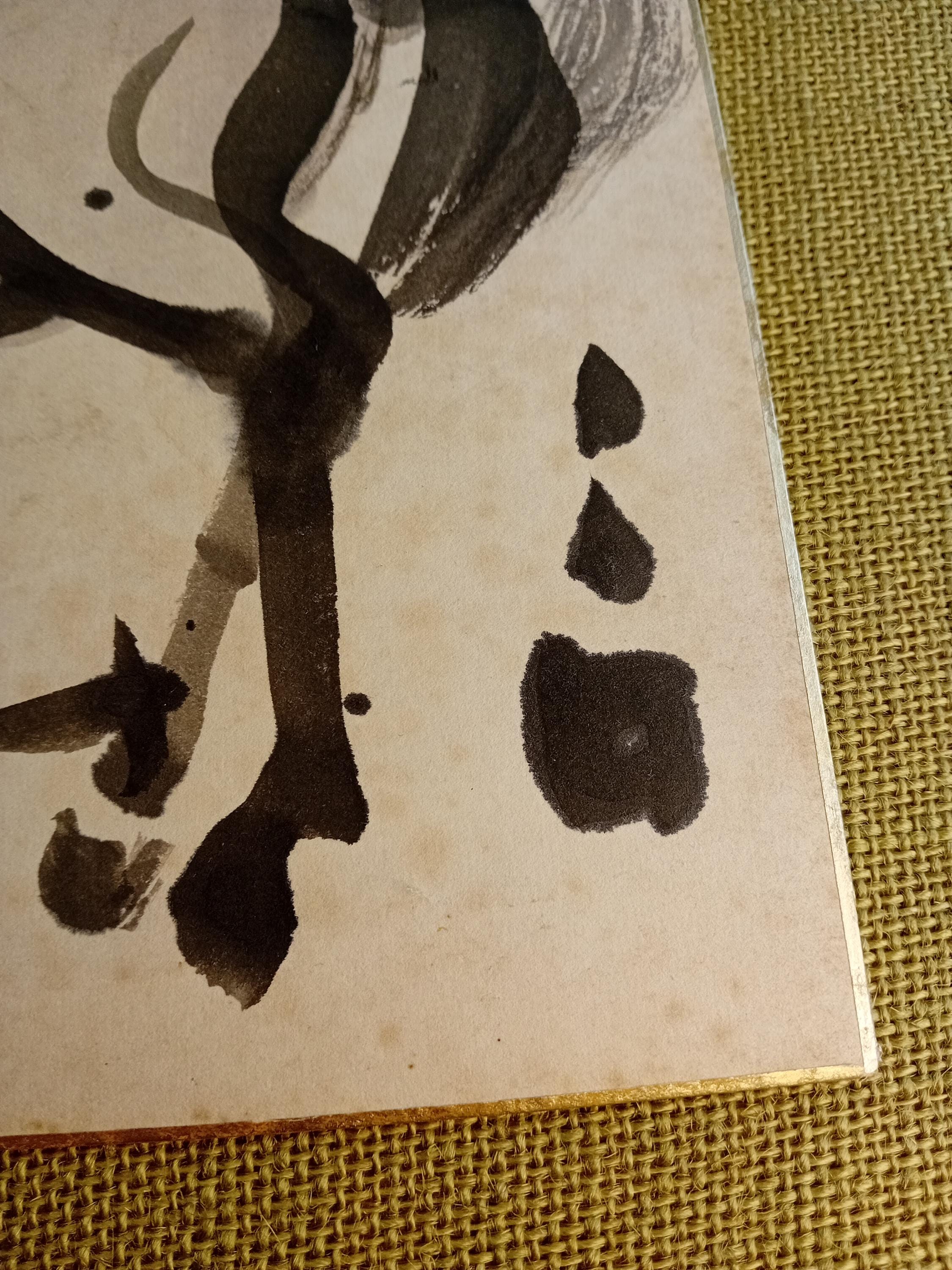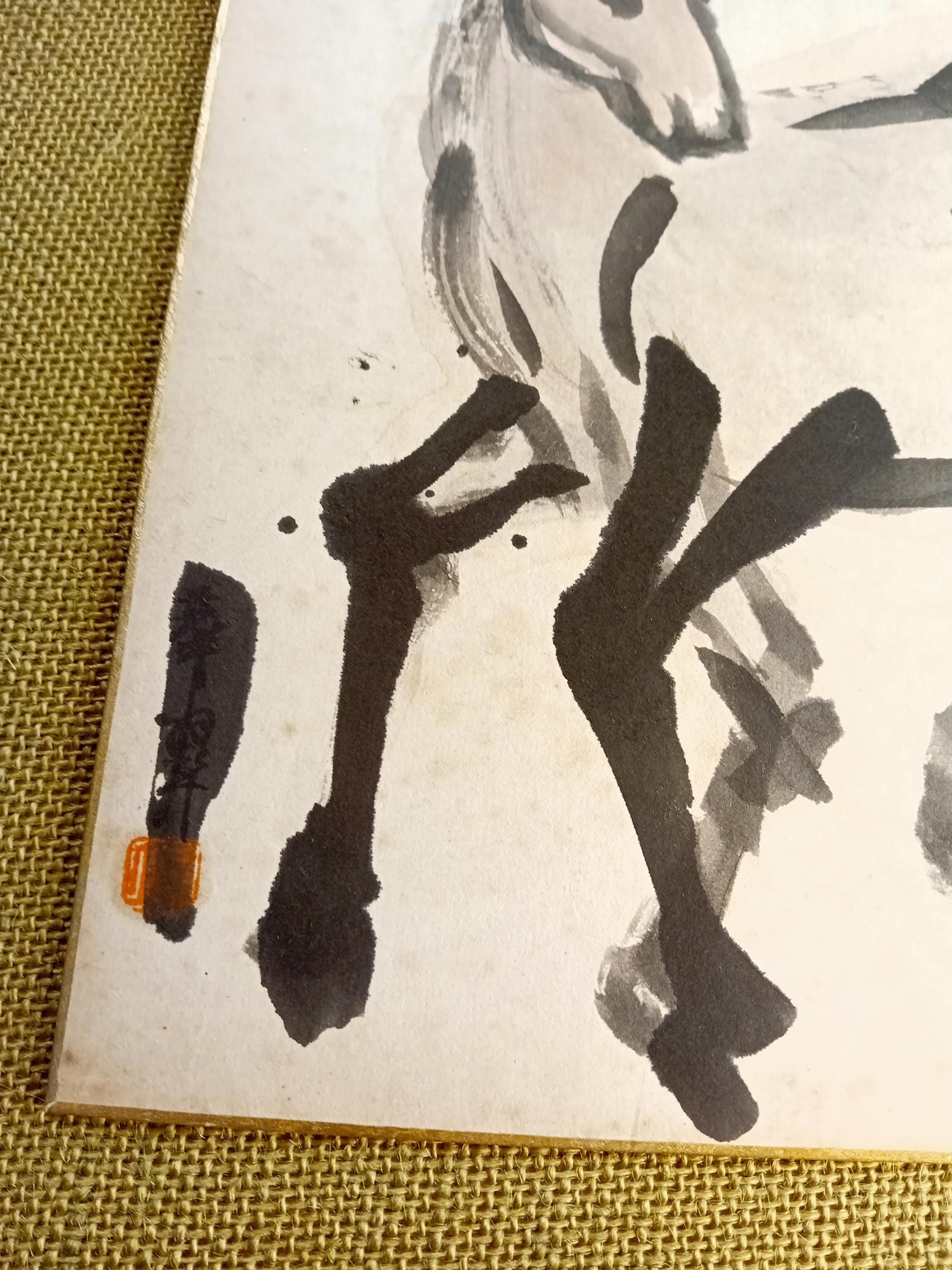 In the lower left corner the work bears an artist’s signature and a small orange seal, consistent with Shōwa-period studio production and gesture-based sumi-e studies.
