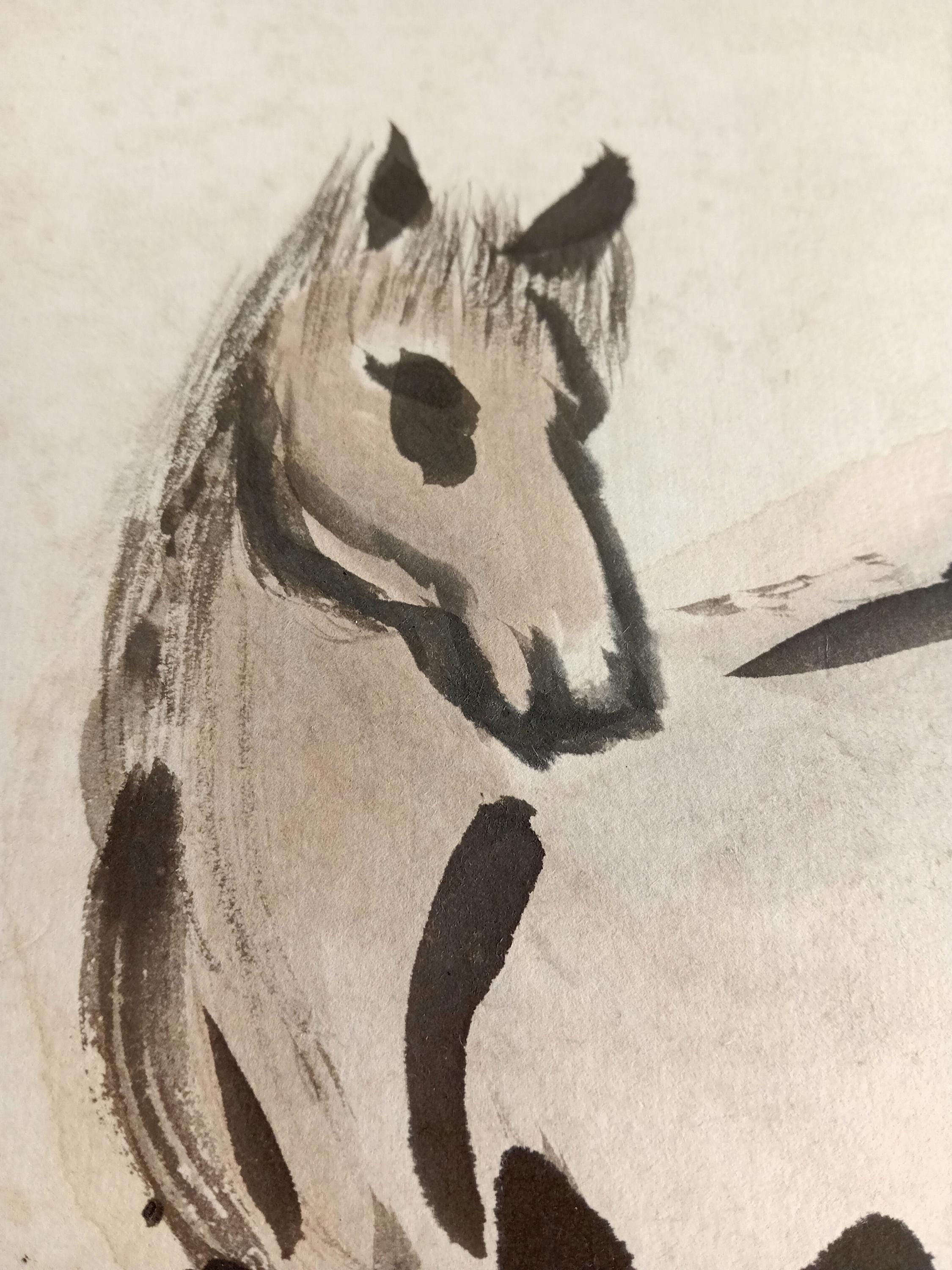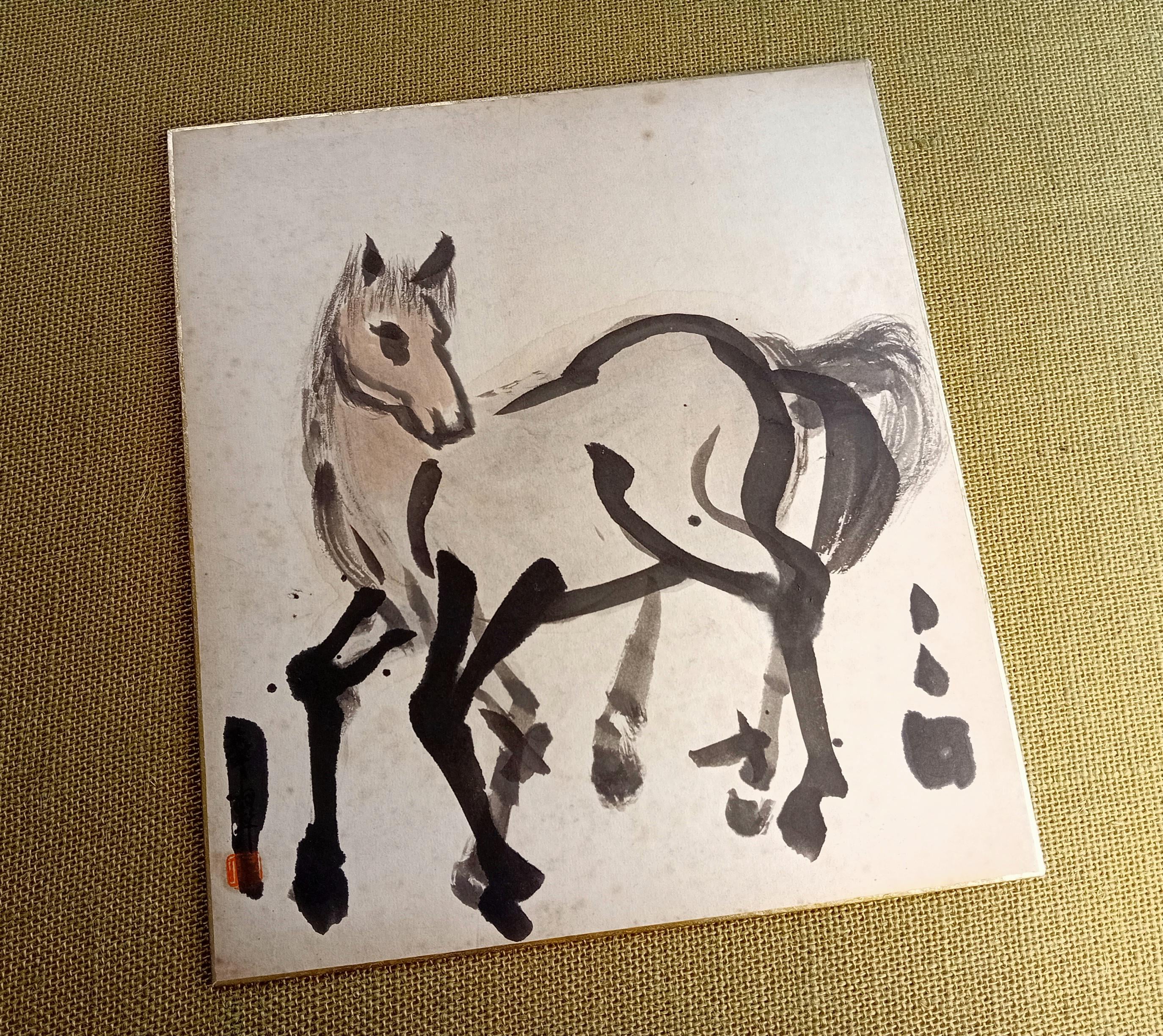 Vintage Japanese shikishi featuring a single ink-and-wash study of a turning horse. The animal is shown in a poised, slightly rotated stance, rendered with soft grey washes and confident sumi lines. Additional calligraphic strokes at the lower part belong to the artist’s compositional practice and studio training.