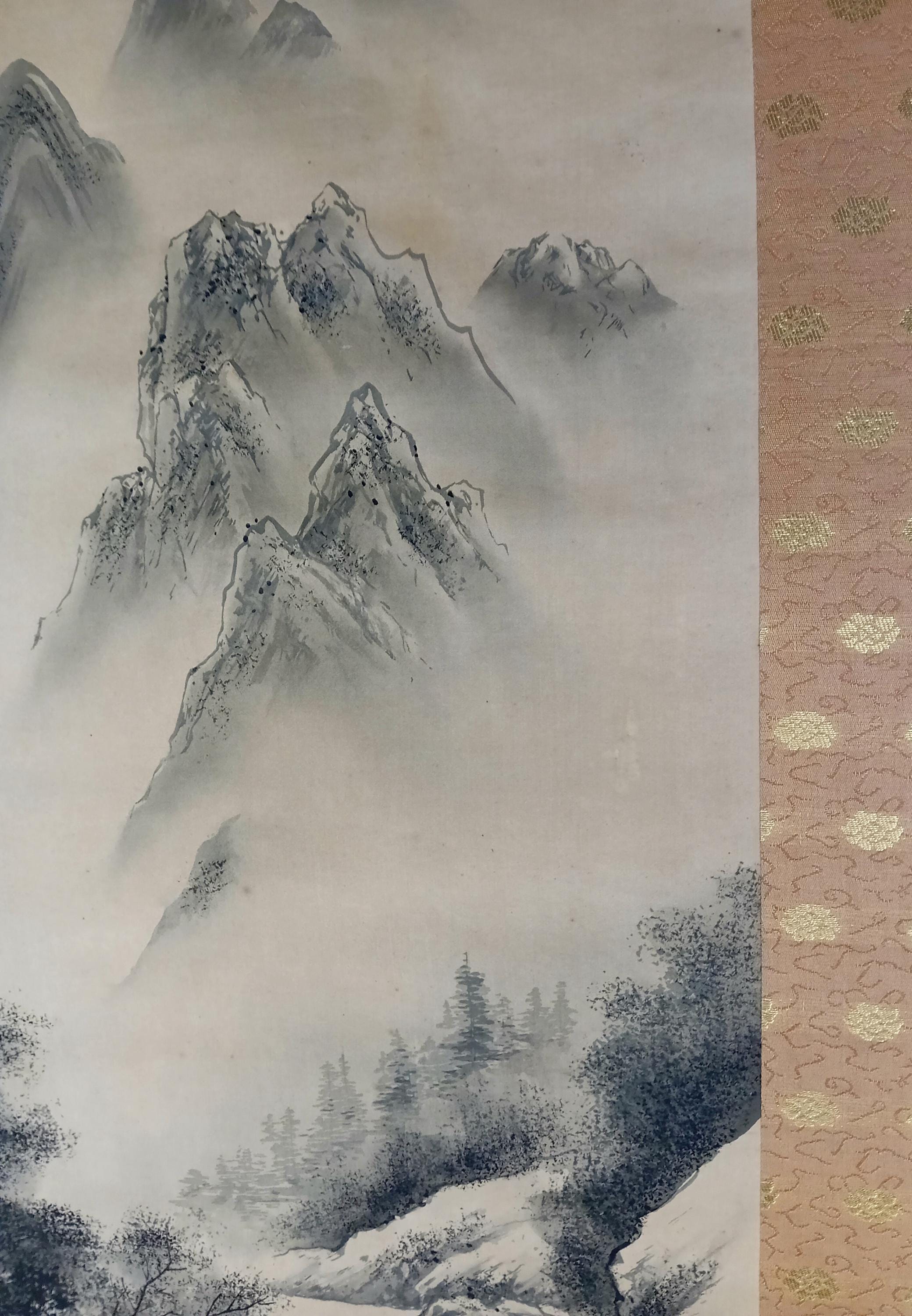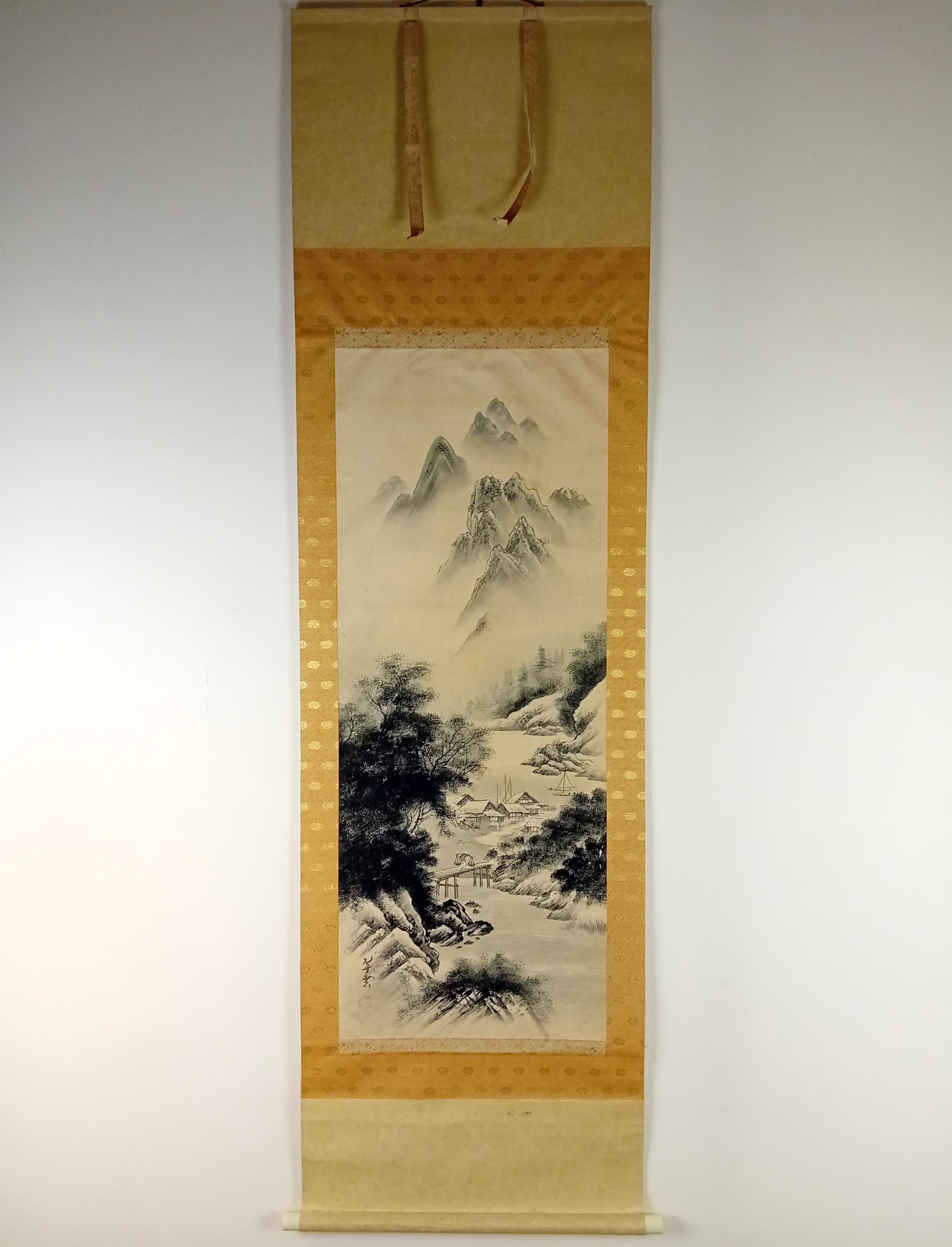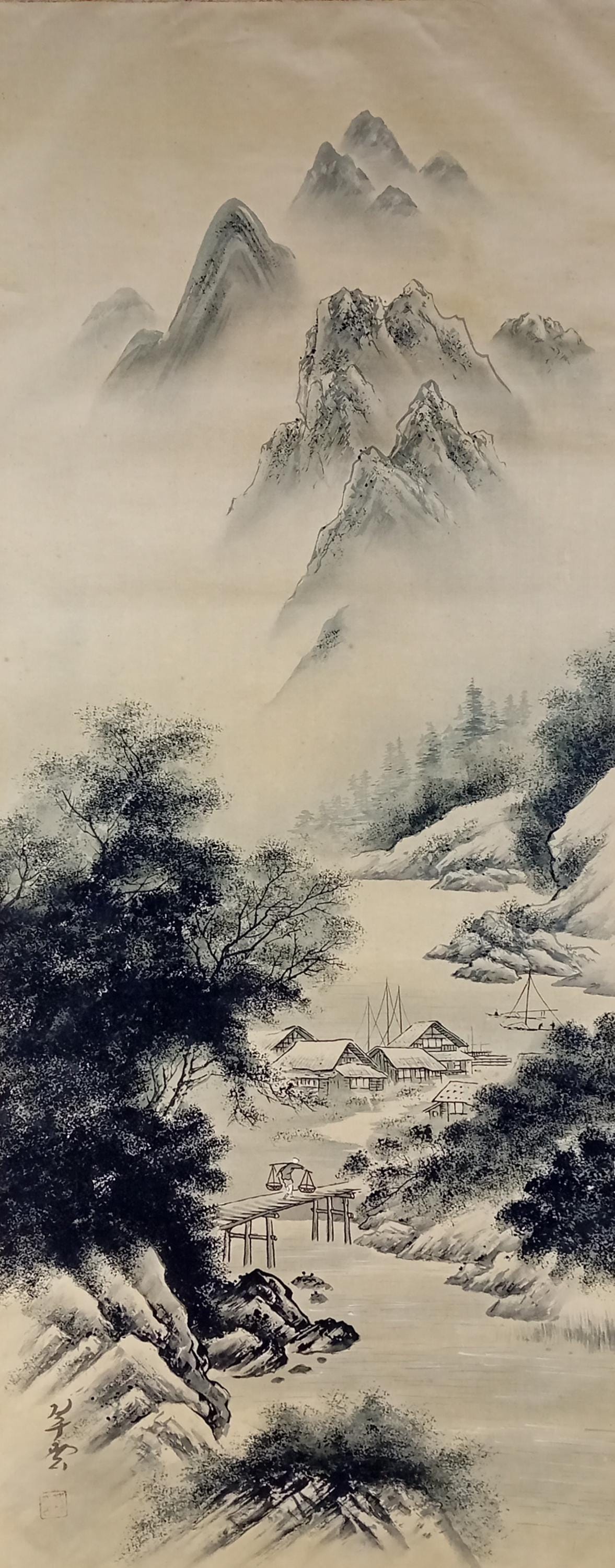 Japanese hanging scroll depicting a monochrome mountain landscape. In the foreground are trees and riverside houses; in the distance, layered peaks rise through mist. Painted in ink on silk with refined tonal gradation and depth of perspective. The artist’s signature and red seal appear in the lower left corner.