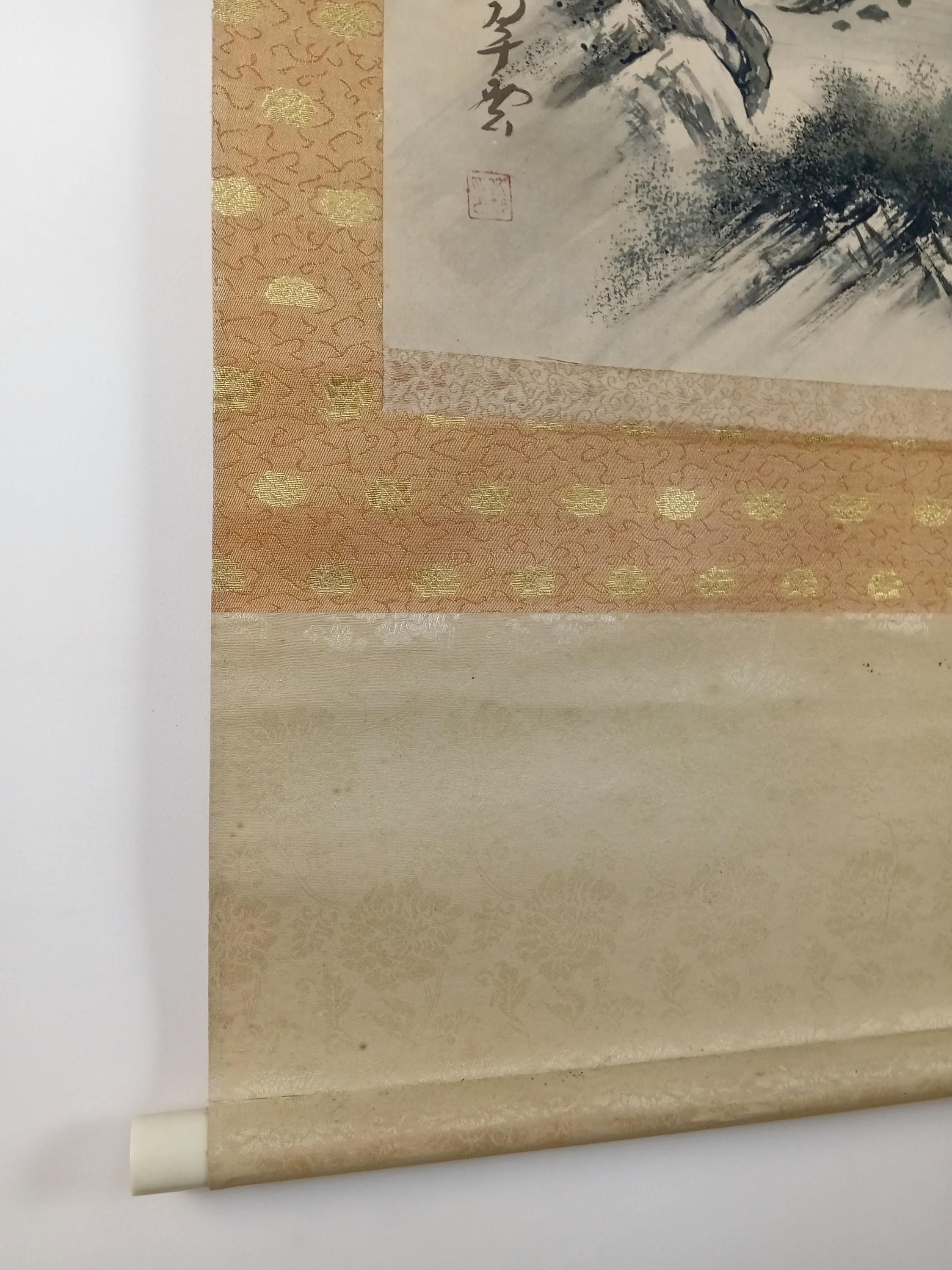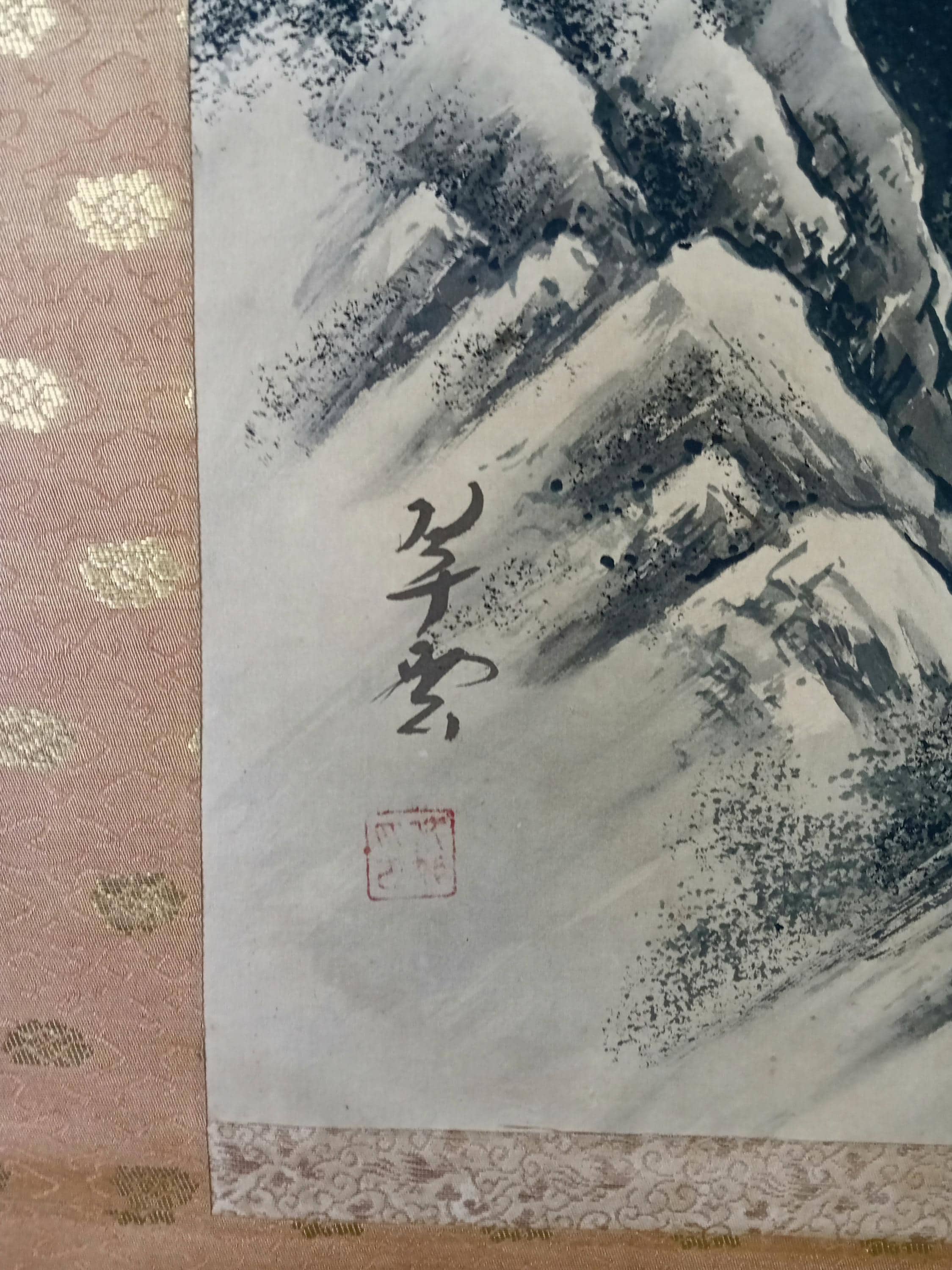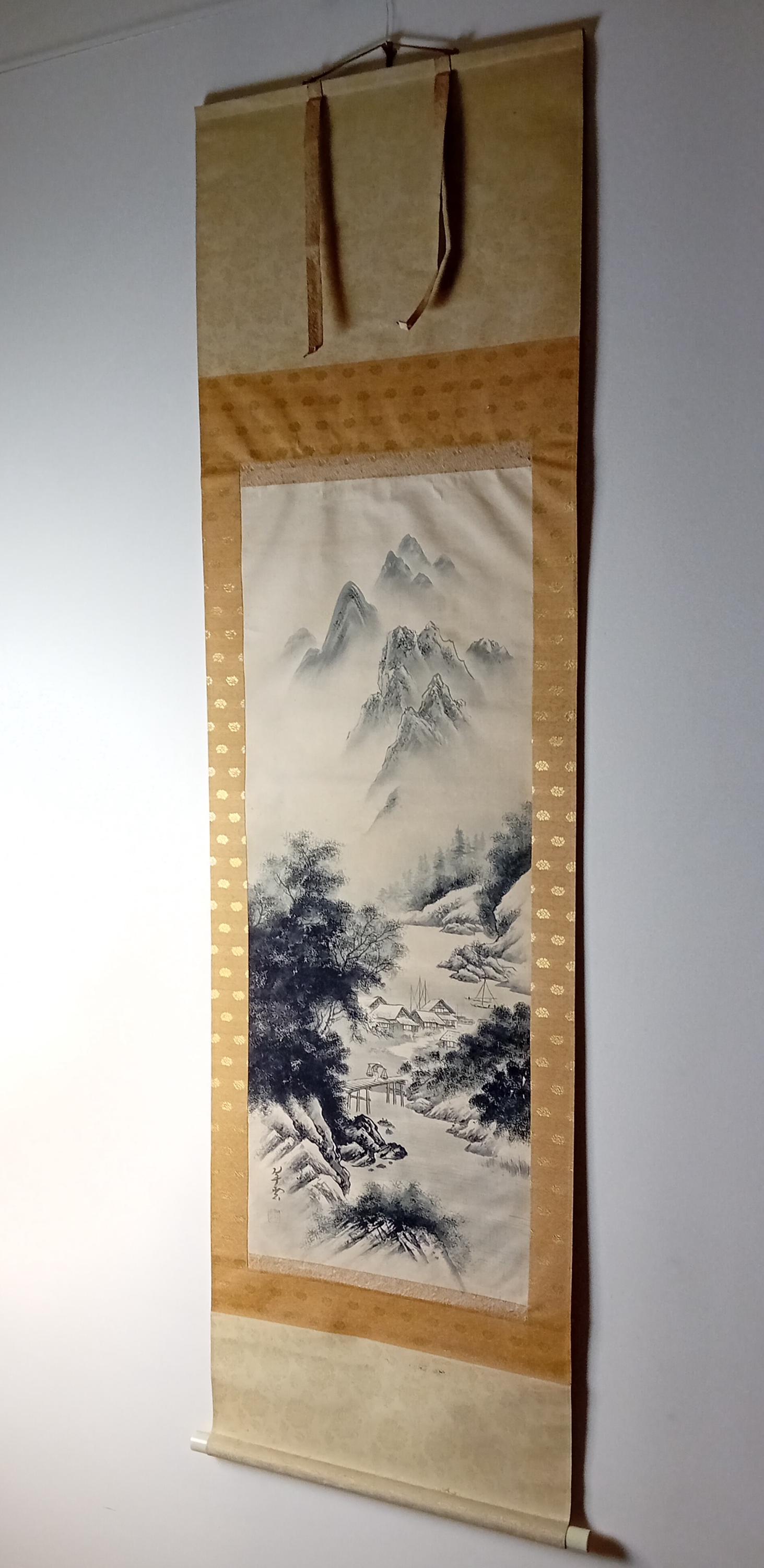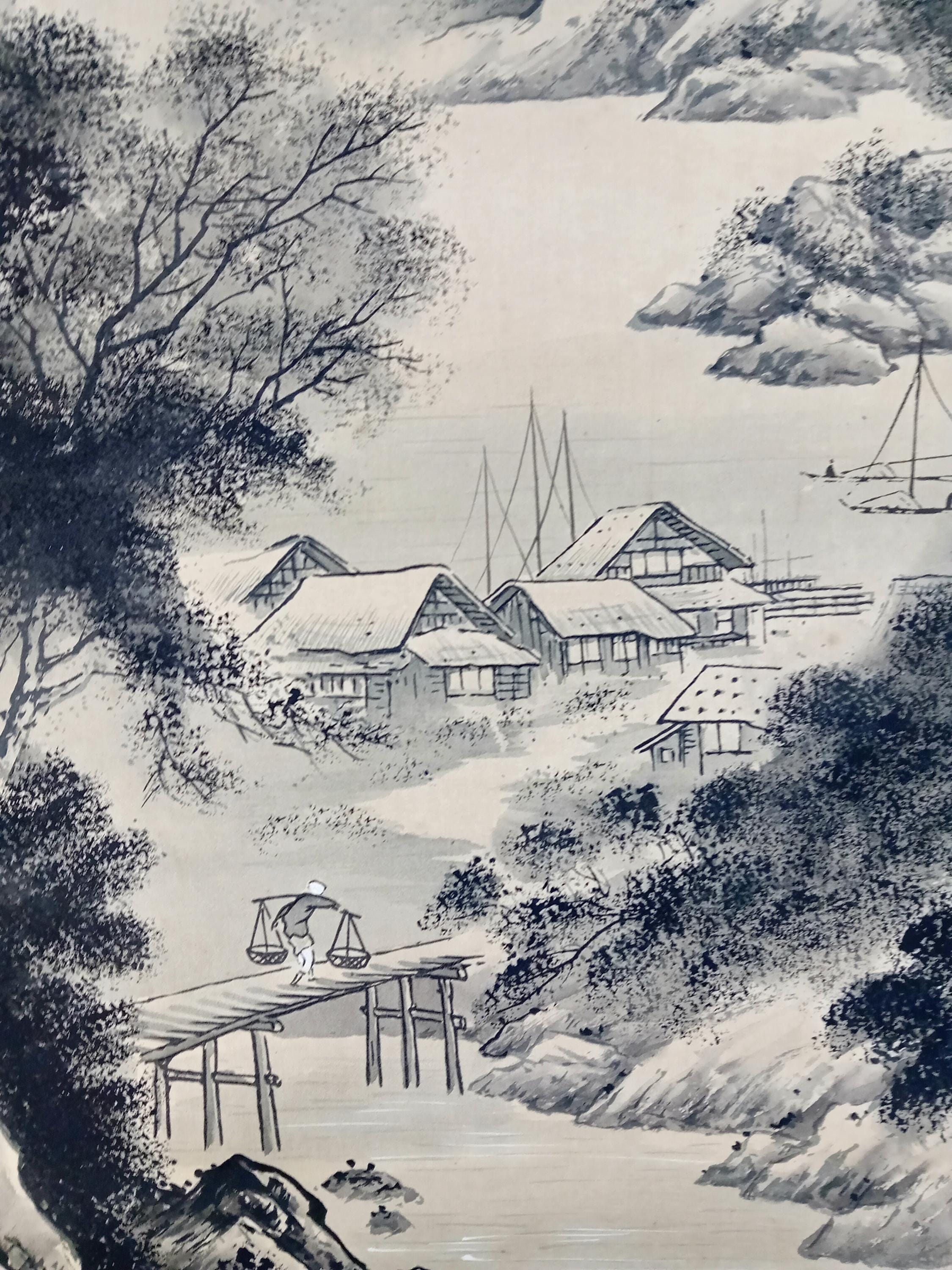 Japanese hanging scroll depicting a monochrome mountain landscape. In the foreground are trees and riverside houses; in the distance, layered peaks rise through mist. Painted in ink on silk with refined tonal gradation and depth of perspective. The artist’s signature and red seal appear in the lower left corner.
