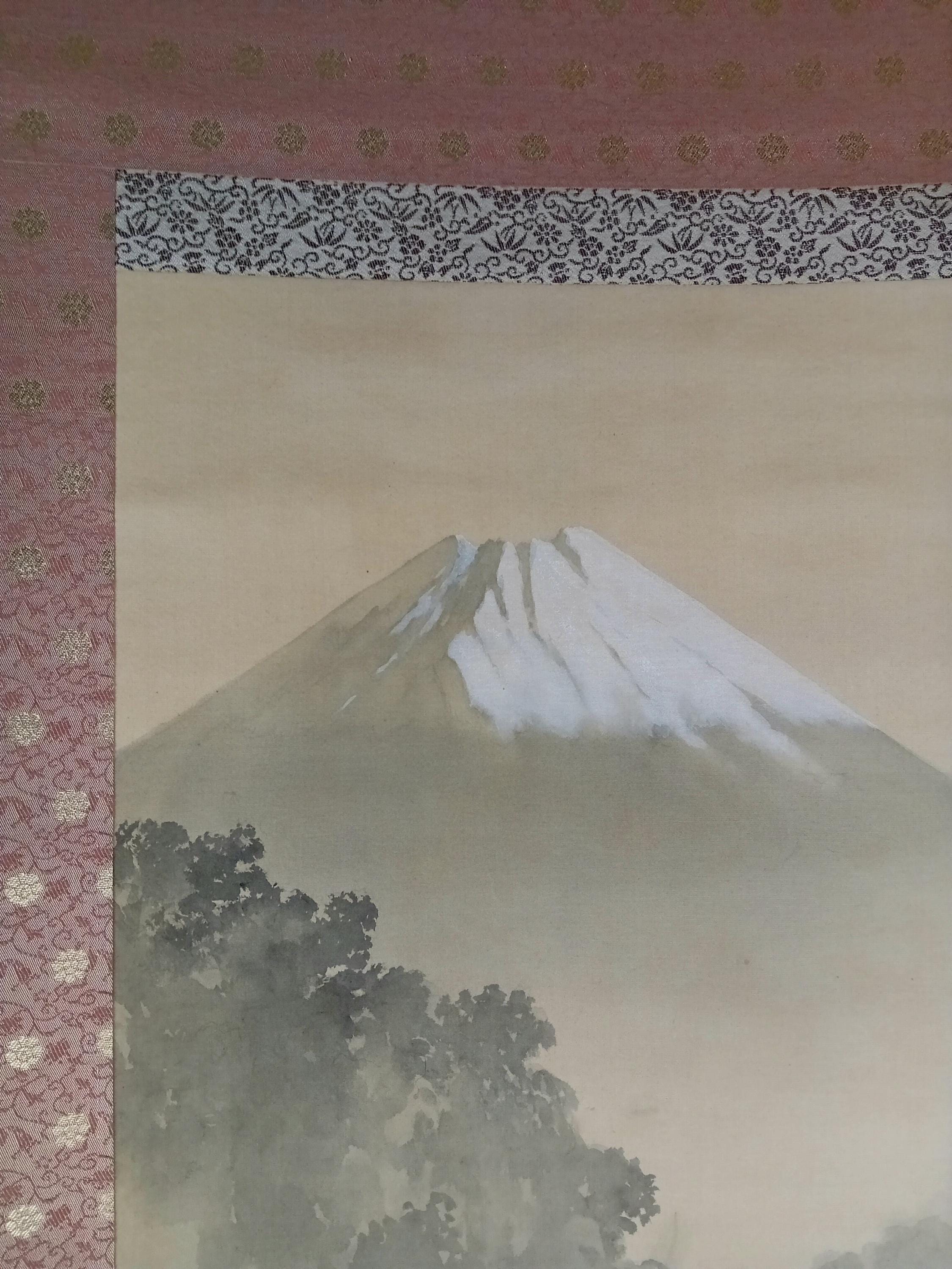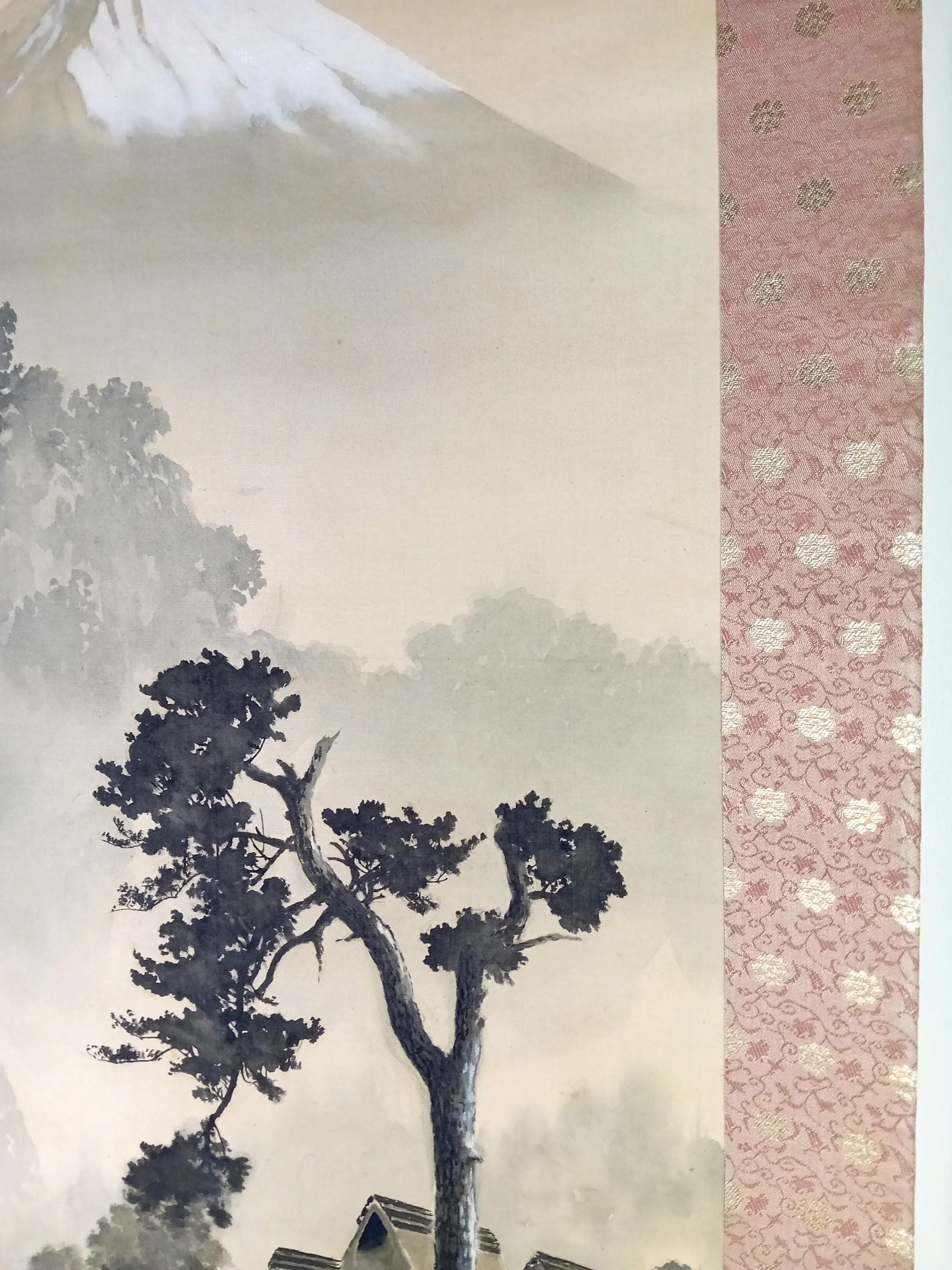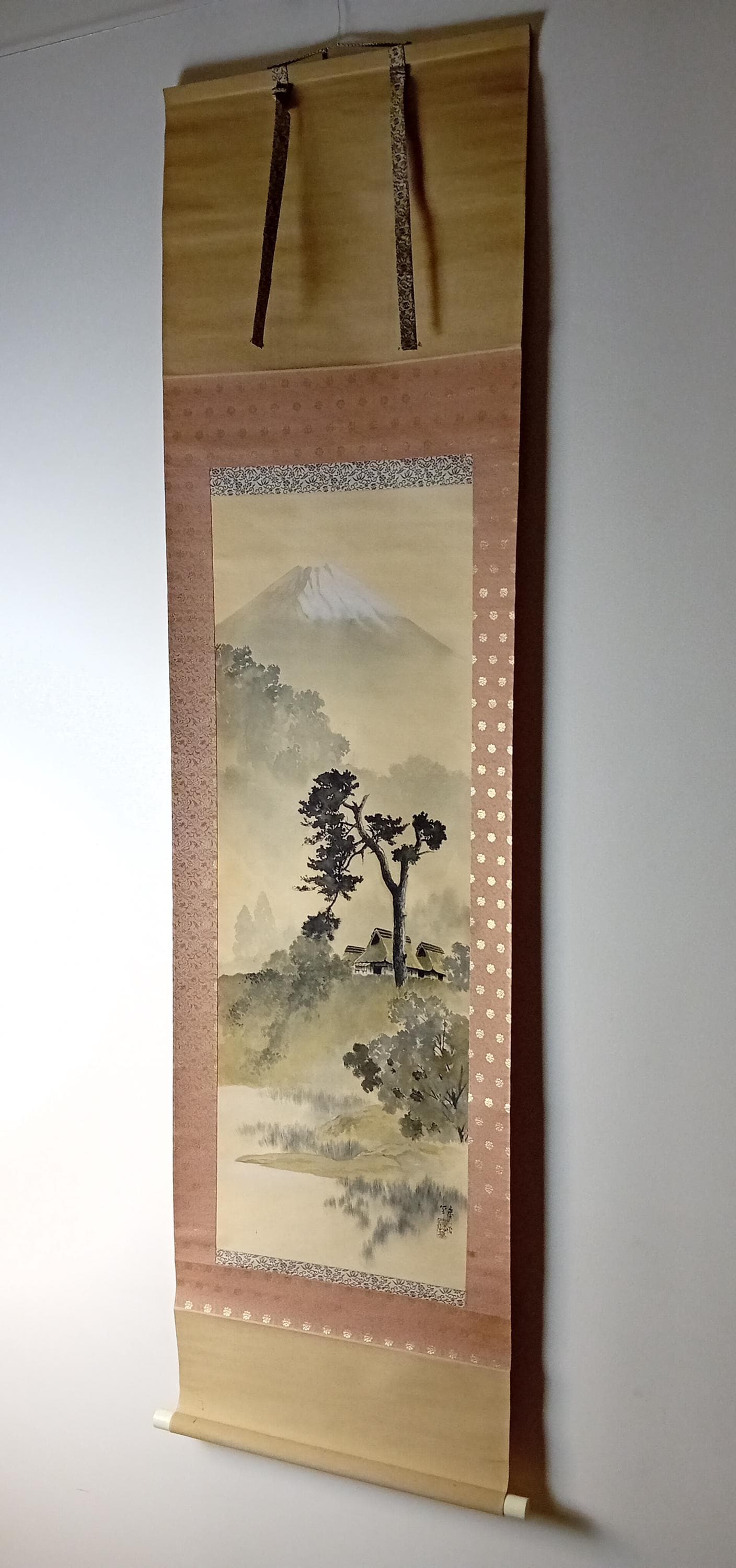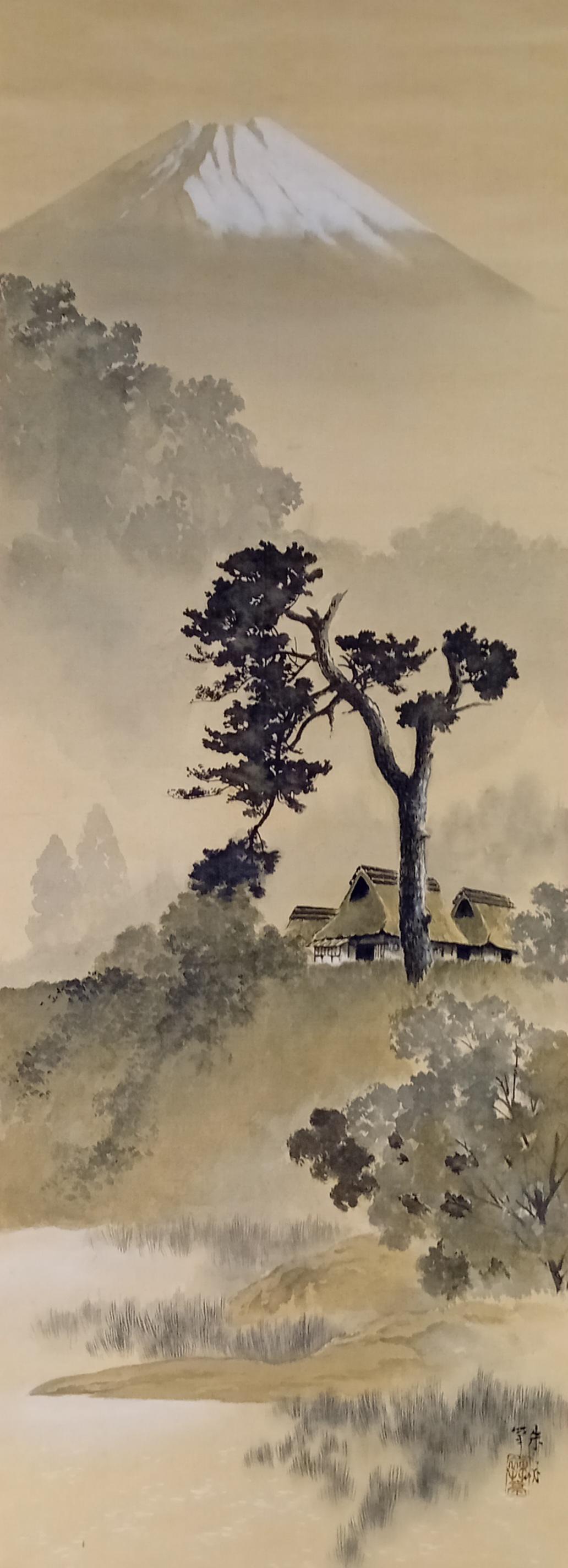 A serene Japanese hanging scroll painted on silk, depicting a peaceful countryside scene with thatched houses beneath Mount Fuji. Executed in soft ink and light mineral colors typical of late Shōwa nihonga style. The vertical composition leads the eye from the reflective water to trees and misty slopes, ending with the snow-covered peak of Fuji — a classic symbol of harmony and endurance in Japanese art.