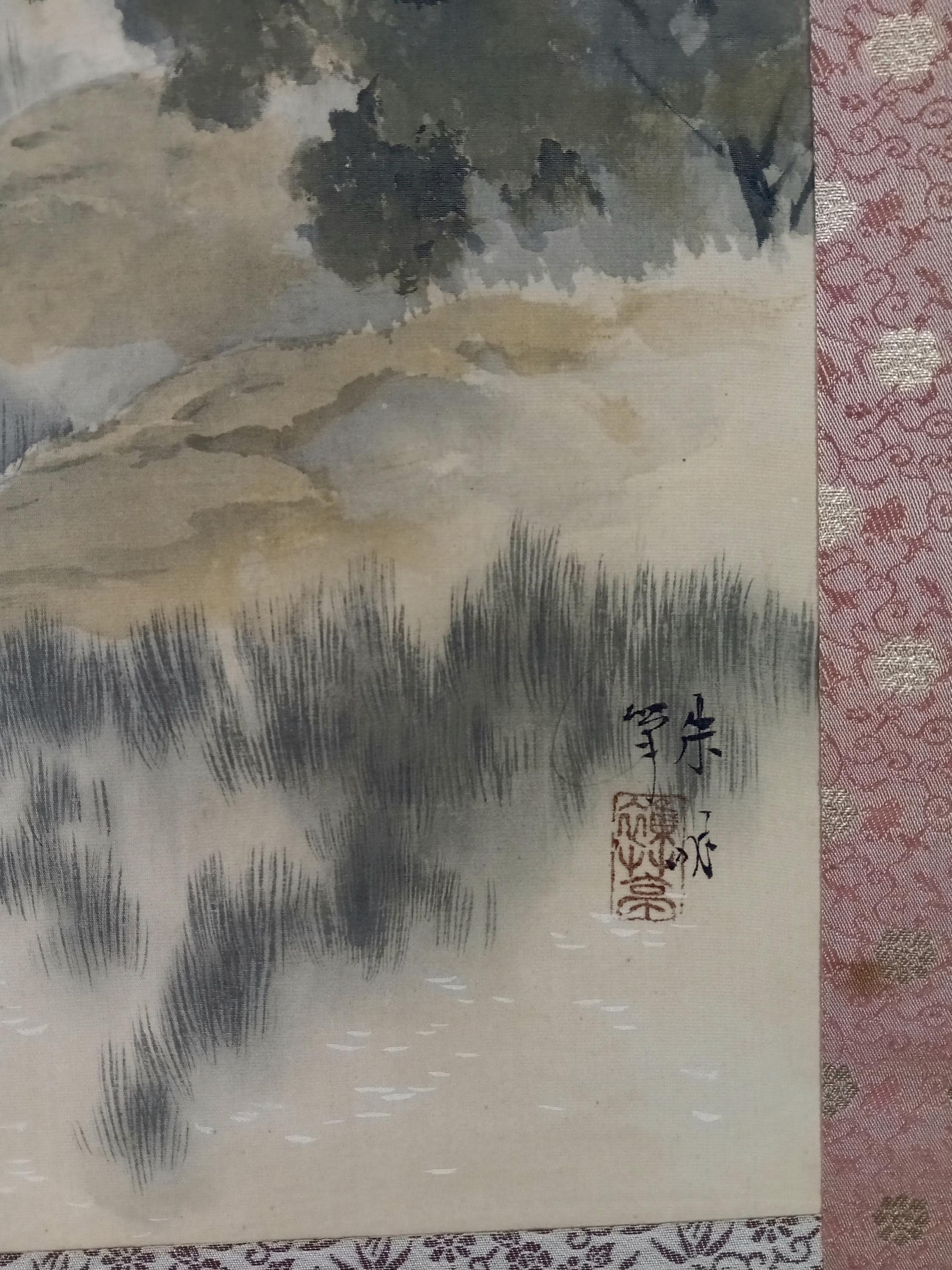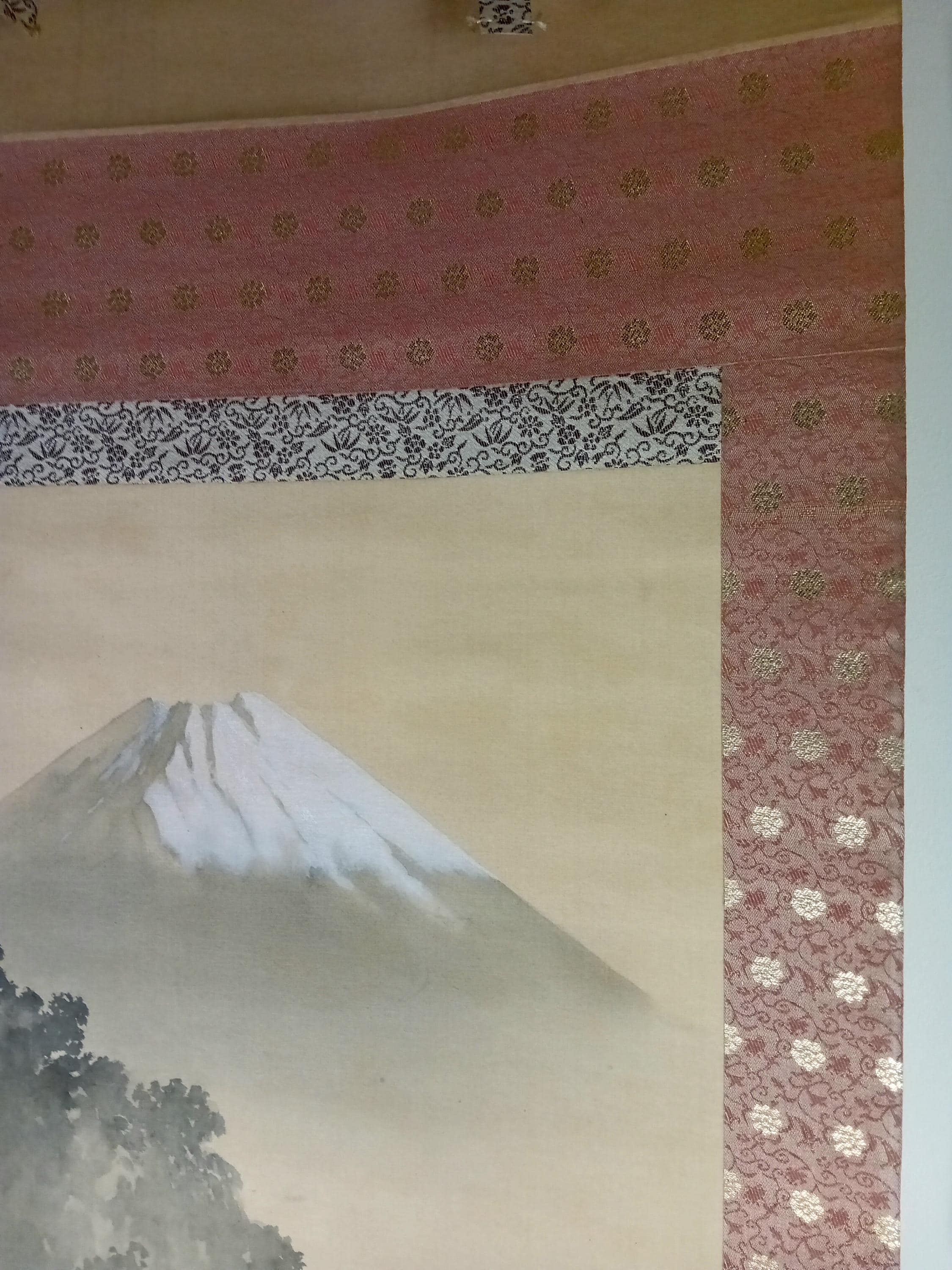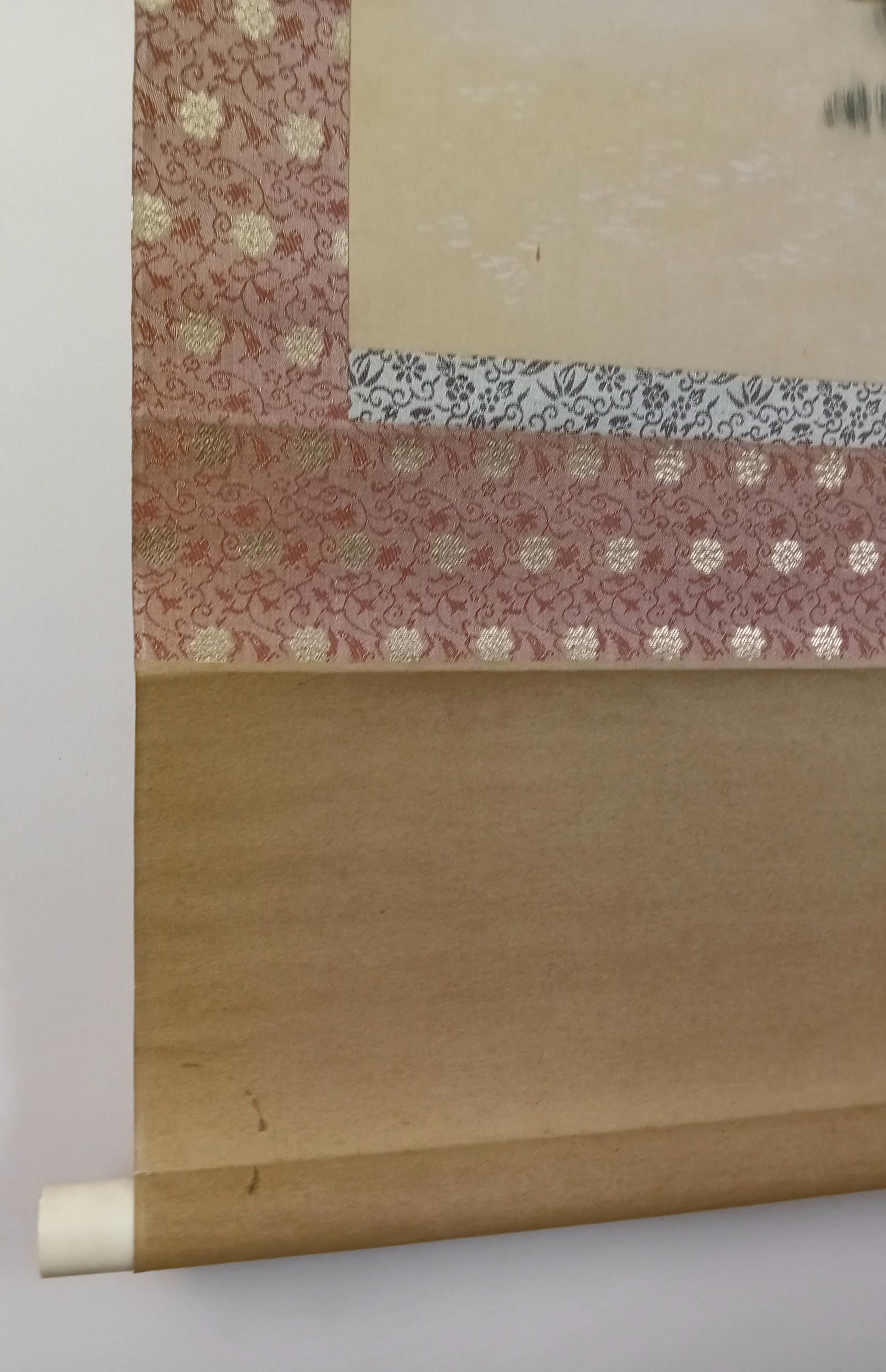 Mounted in traditional fabric borders with patterned brocade and golden top section, preserving the warm tone balance between painting and mounting.